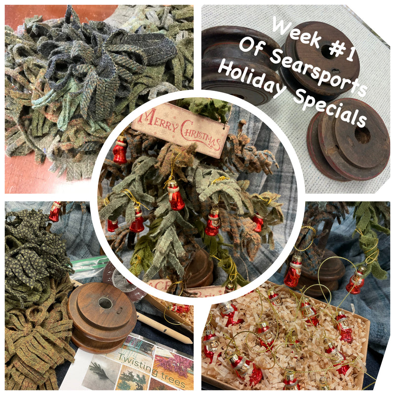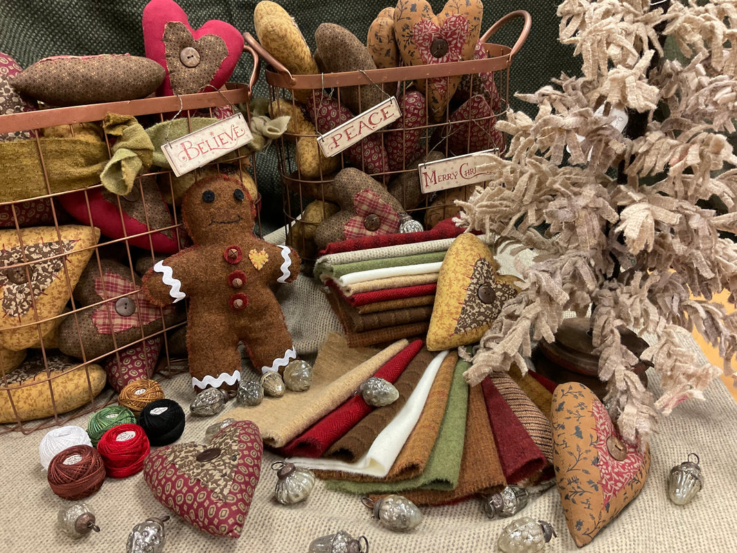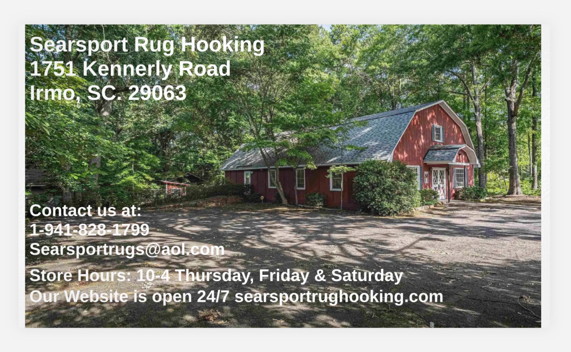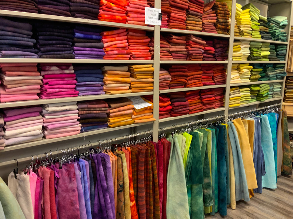 We stock hundreds of bolts of 100% wool for rug hooking, appliqué, sewing and stitching. Yes, right here in Irmo, South Carolina! We carry both as is bolt wool and beautiful hand dyed wool that we dye right here in our special dye kitchen! The whole rainbow is available at Searsport! Color planning is a breeze when you come with your patterns to look at colors. We are always happy to help at no charge if you need it also.