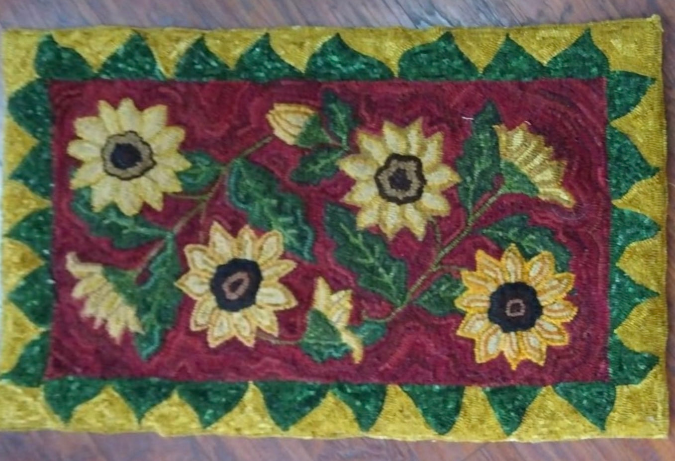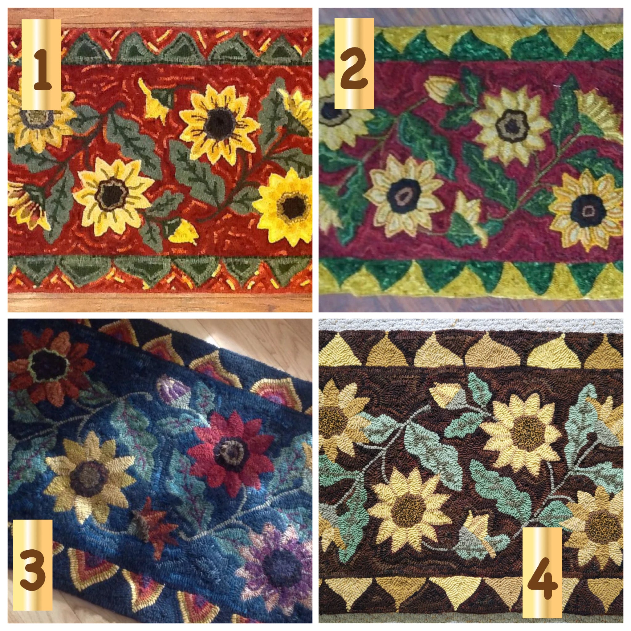 We love seeing this with a red/orange back ground and the rich blues set off the sun flowers too! If you order an uncut kit, that is the pattern and wool, please let us know what color combo you would like. Finished size is 24x40