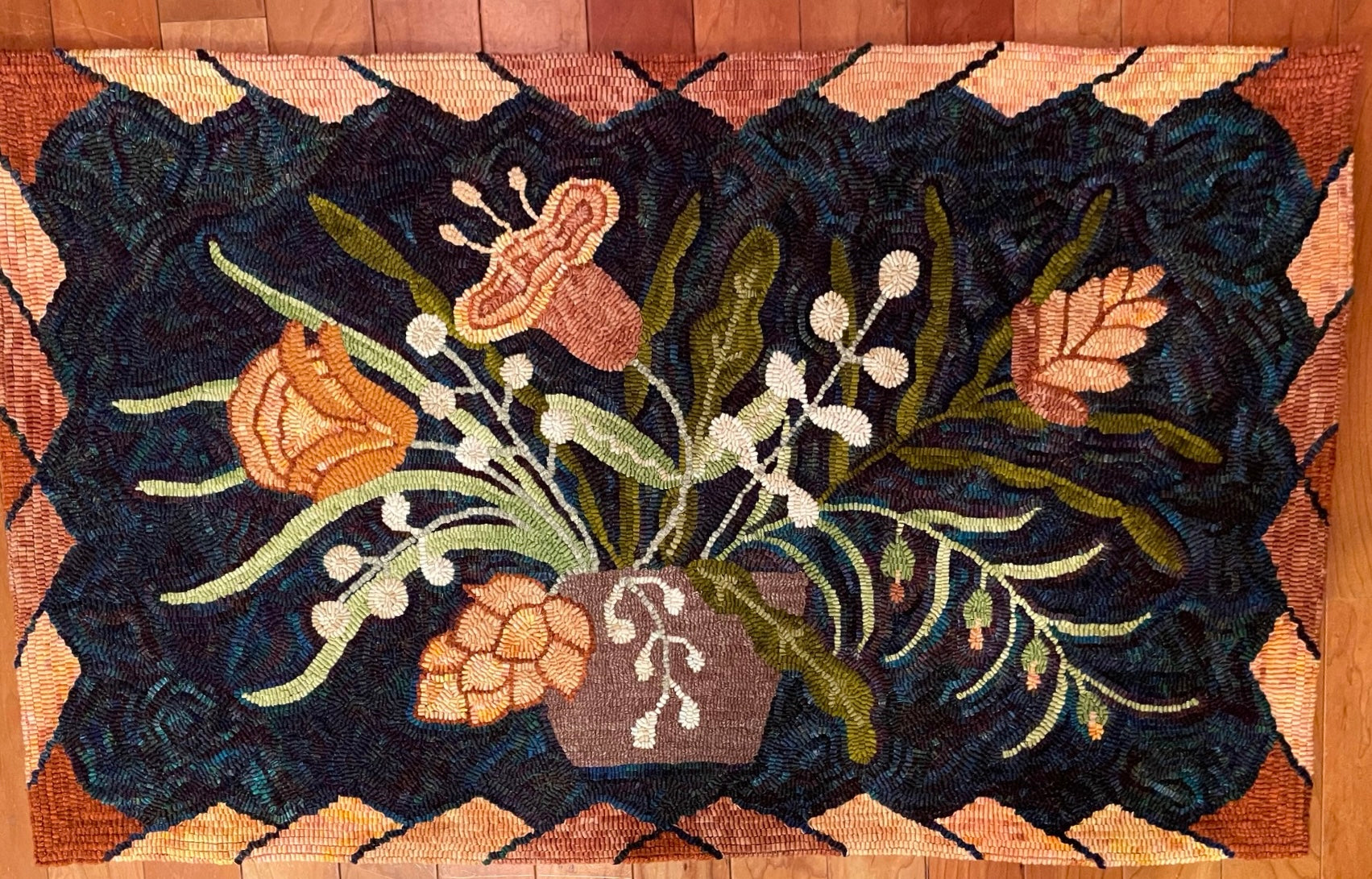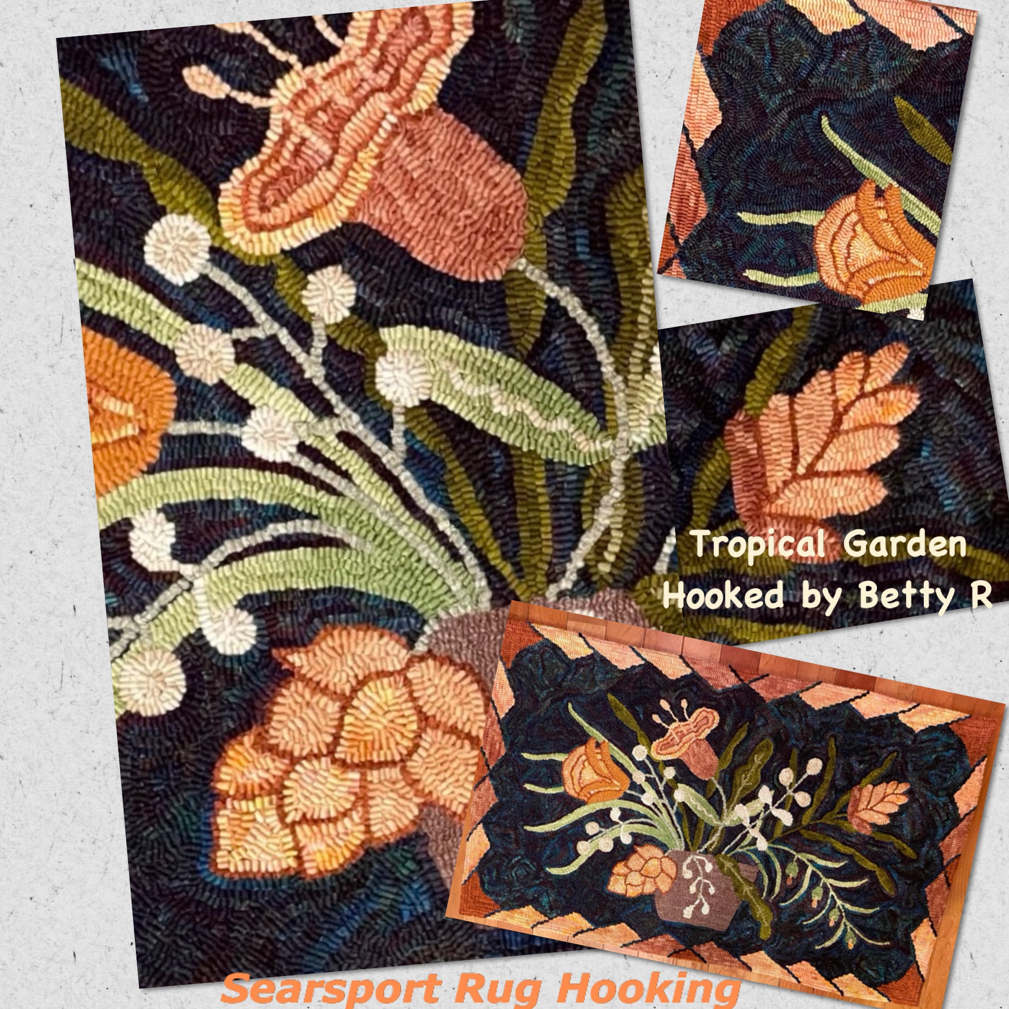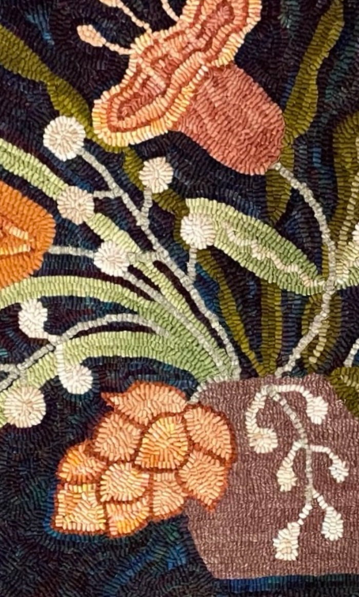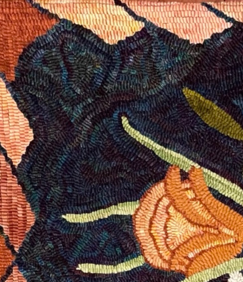 The teal back ground rug was hooked by Chris S. The white spot dyed background was hooked by Jean L. And the blue one was hooked by Martha H. Thank you everyone for sharing! Hand drawn on linen 24x40 finished size