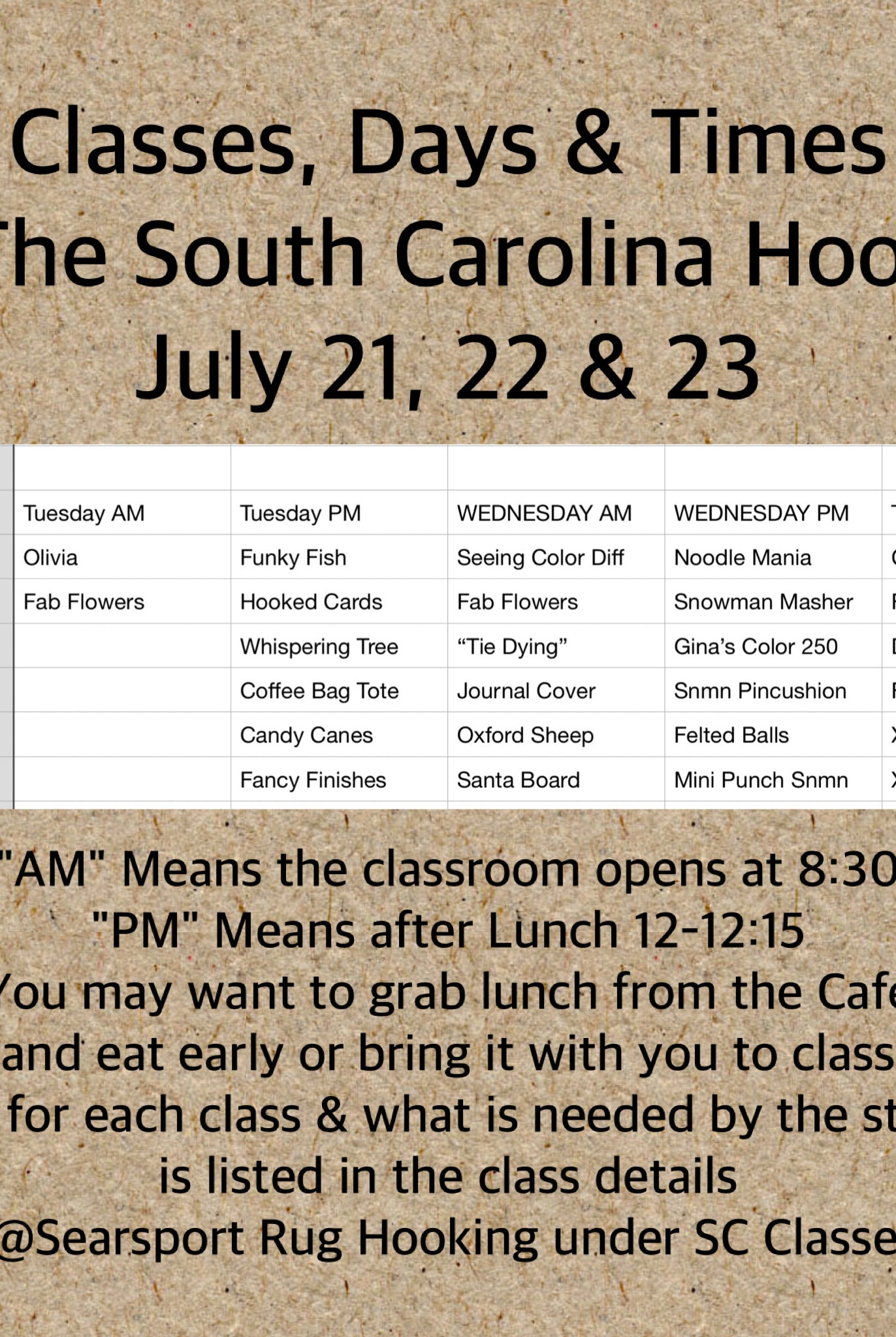 Projects have been created by the teachers and submitted for selection for the limited classroom space. These are all mini work shops and only 3-3.5 hours long. They are geared to leaning a technique or style or something fun. They are to teach and inspire you to expand your hooking or stitching boundaries. They are not large, costly, overwhelming or something to hide in the closet because you never finished them!! We wanted fun, different, all skill levels, all styles. Color theory basics, proddy, dying, finishing, color planning, we were open to suggestions! So please enjoy the line up and what do you want to learn?