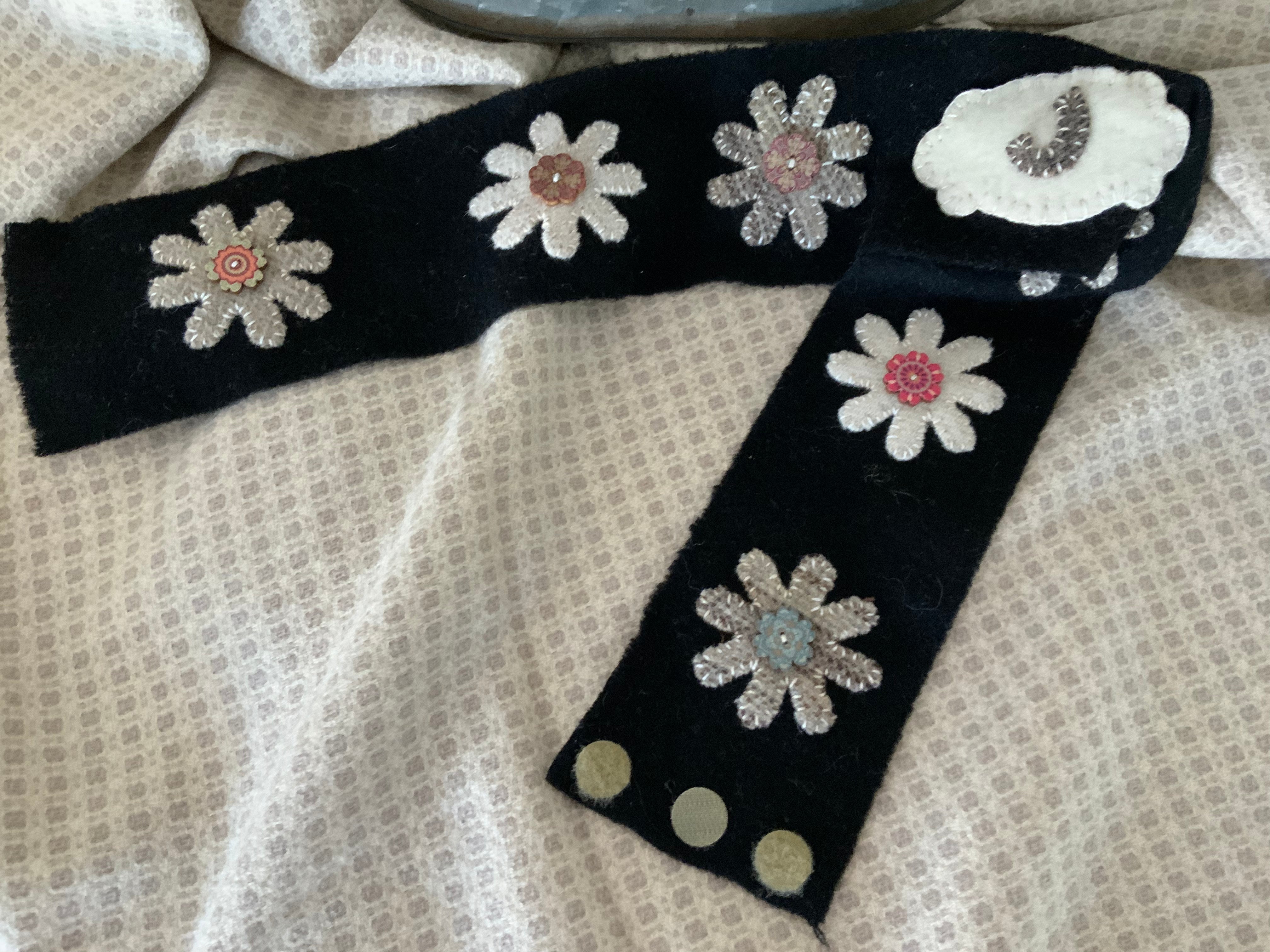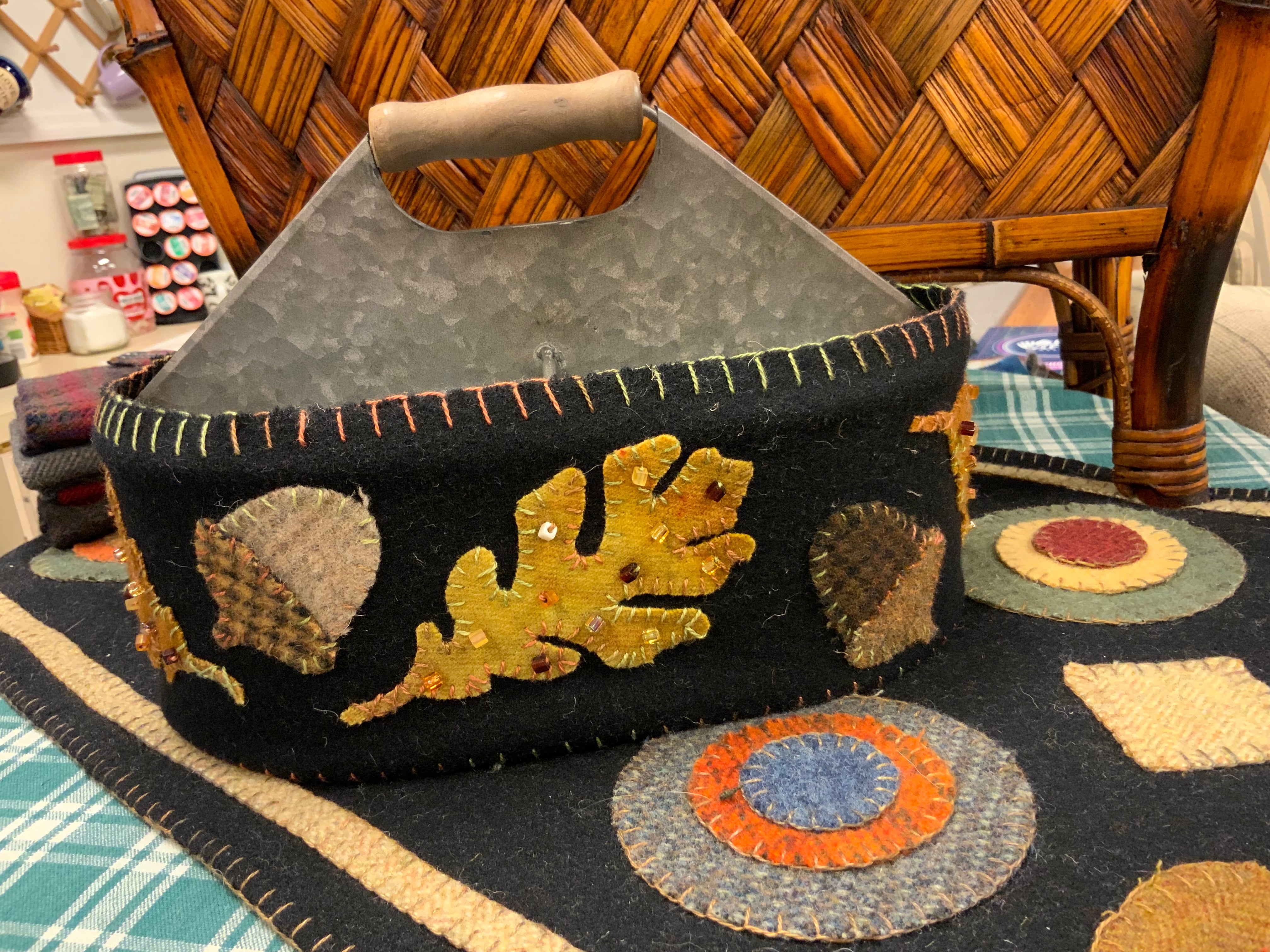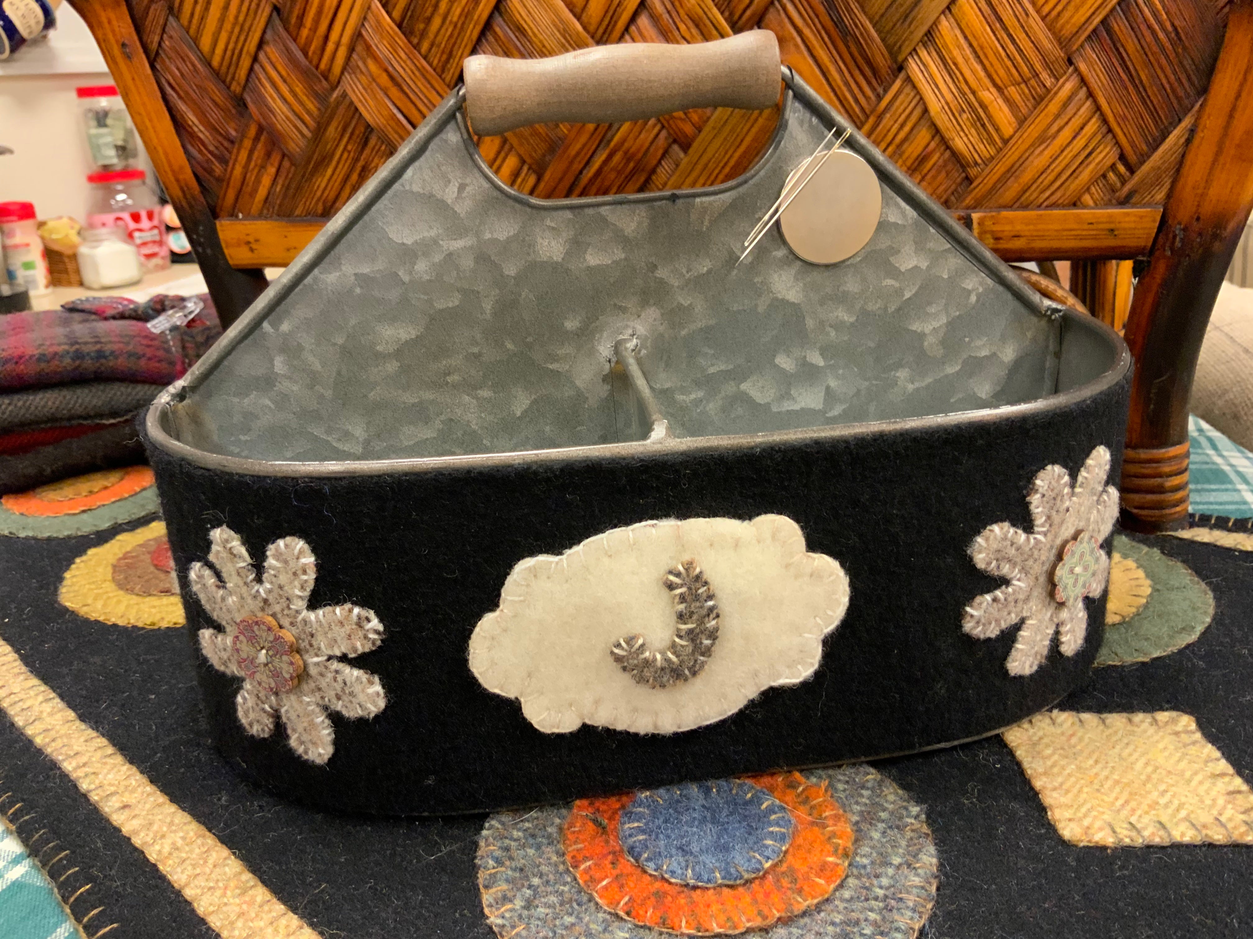 We have put together everything you need to make a fun band to go around the caddy! The kit includes the caddy, the band of special weight appliqué wool in black that you will appliqué on, The velcro dots to make it removable and then we added a strong magnet to hold your scissors up out of your stitching and our favorite 6 inch wooden ruler to help with spacing on small projects! The basic kit is the same as above, but without precuts.