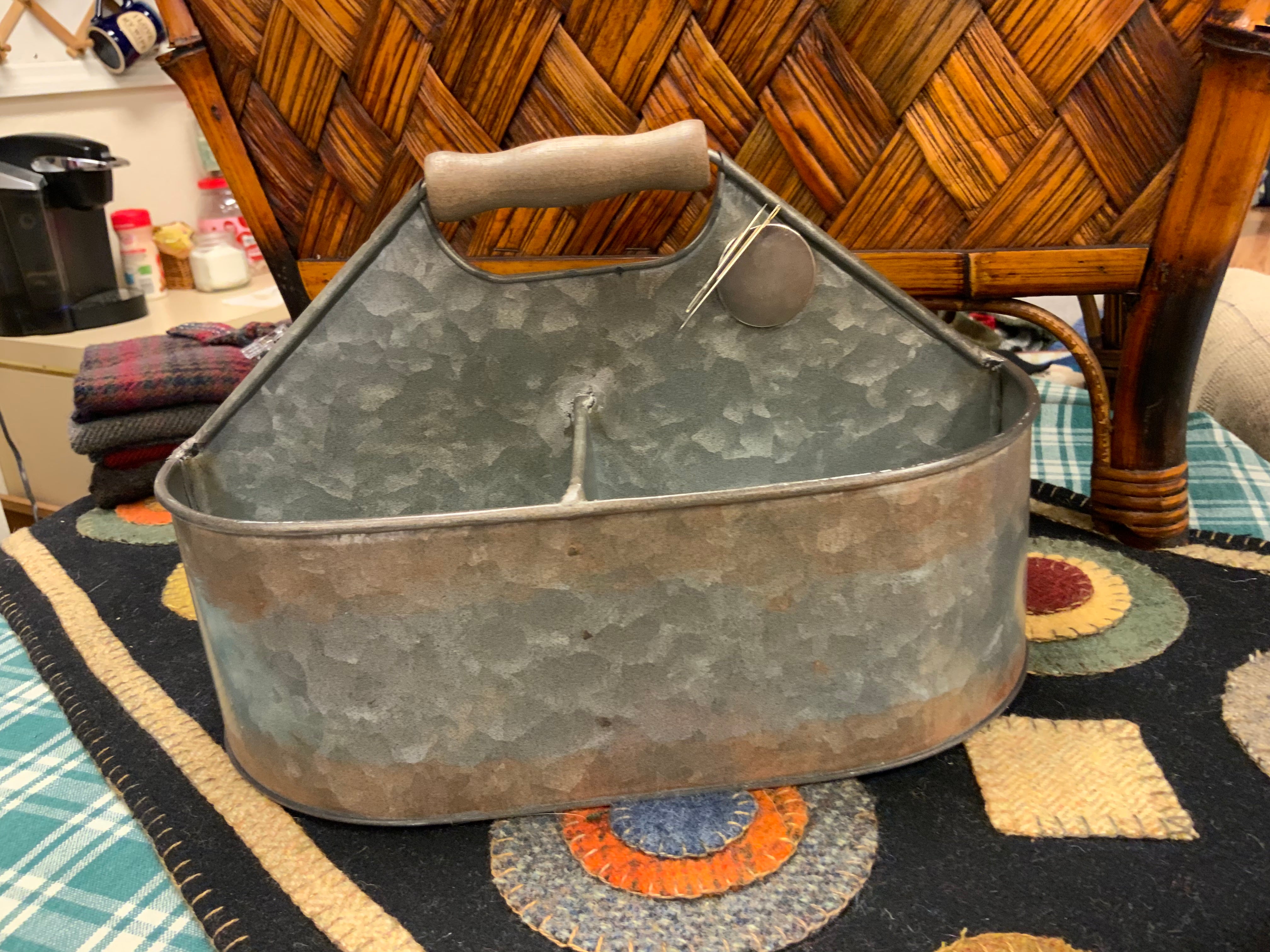 The caddy measures 6½" x 10½" x 7". The distressed metal bucket features a wood handle. This vintage-inspired caddy is divided in four sections.