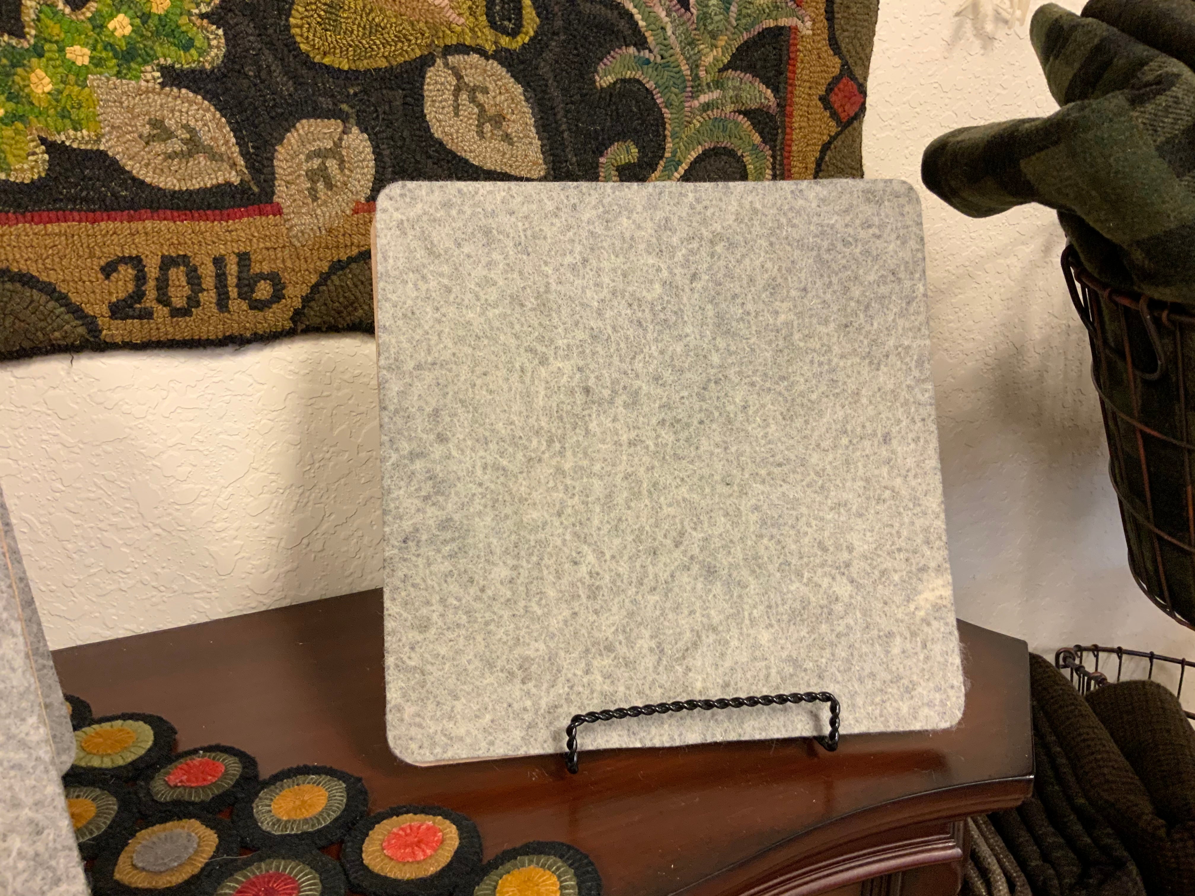 These mats are 100% wool and they create a perfect lay out surface for you wool appliqué and penny rugs.  Birch backing adds stability and the nice twisted wire easel hold it slightly slanted to lay out and work from. Due to the adhesive and the wood backing these are NOT intended to be ironed on.