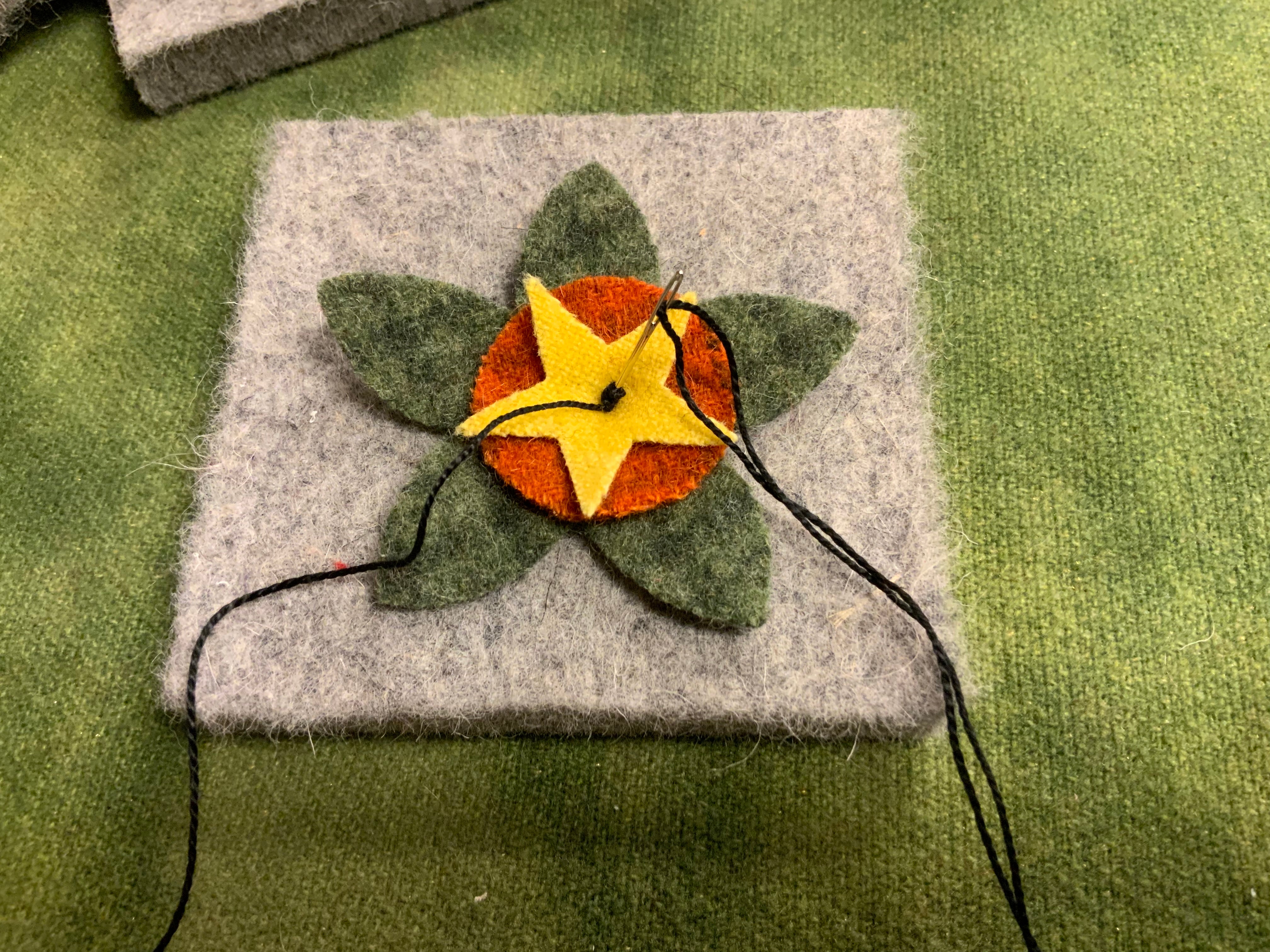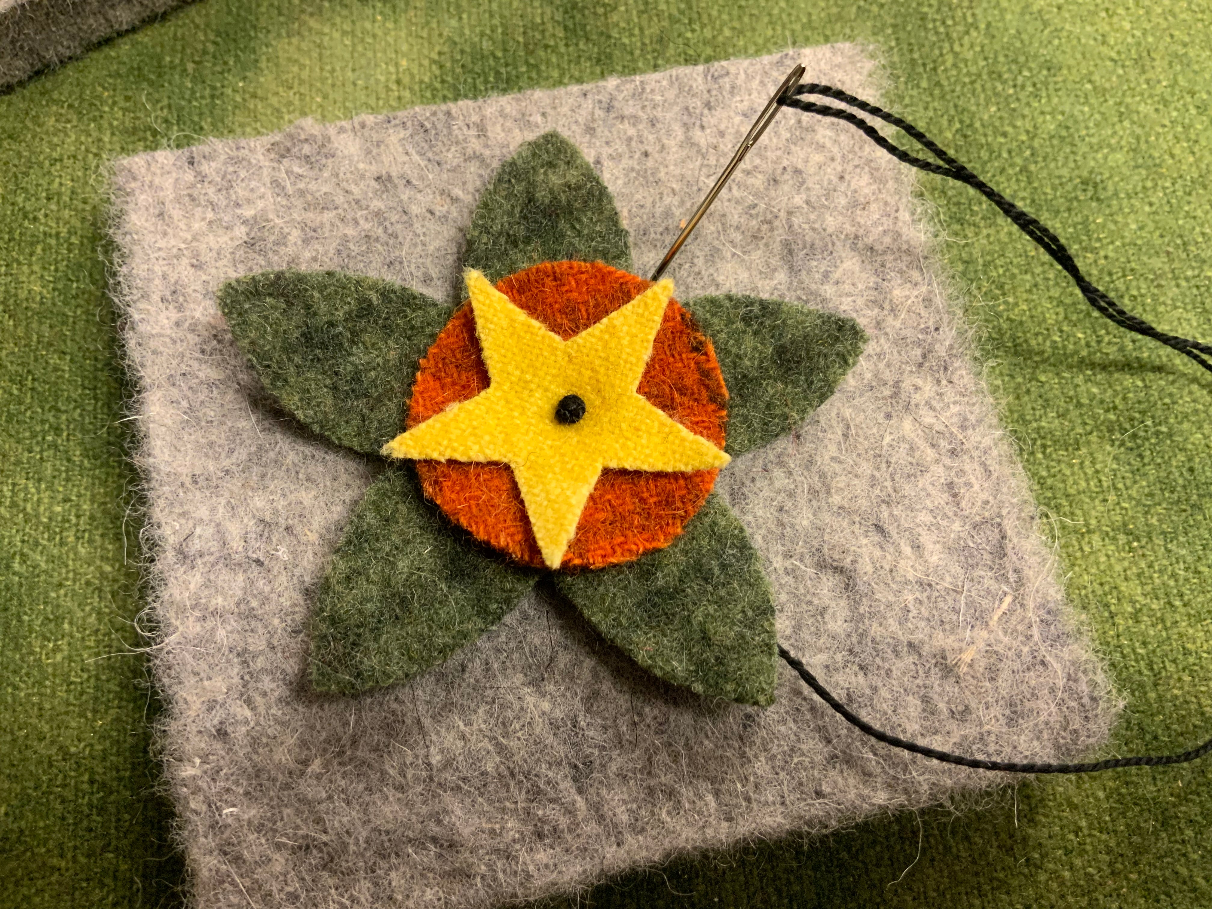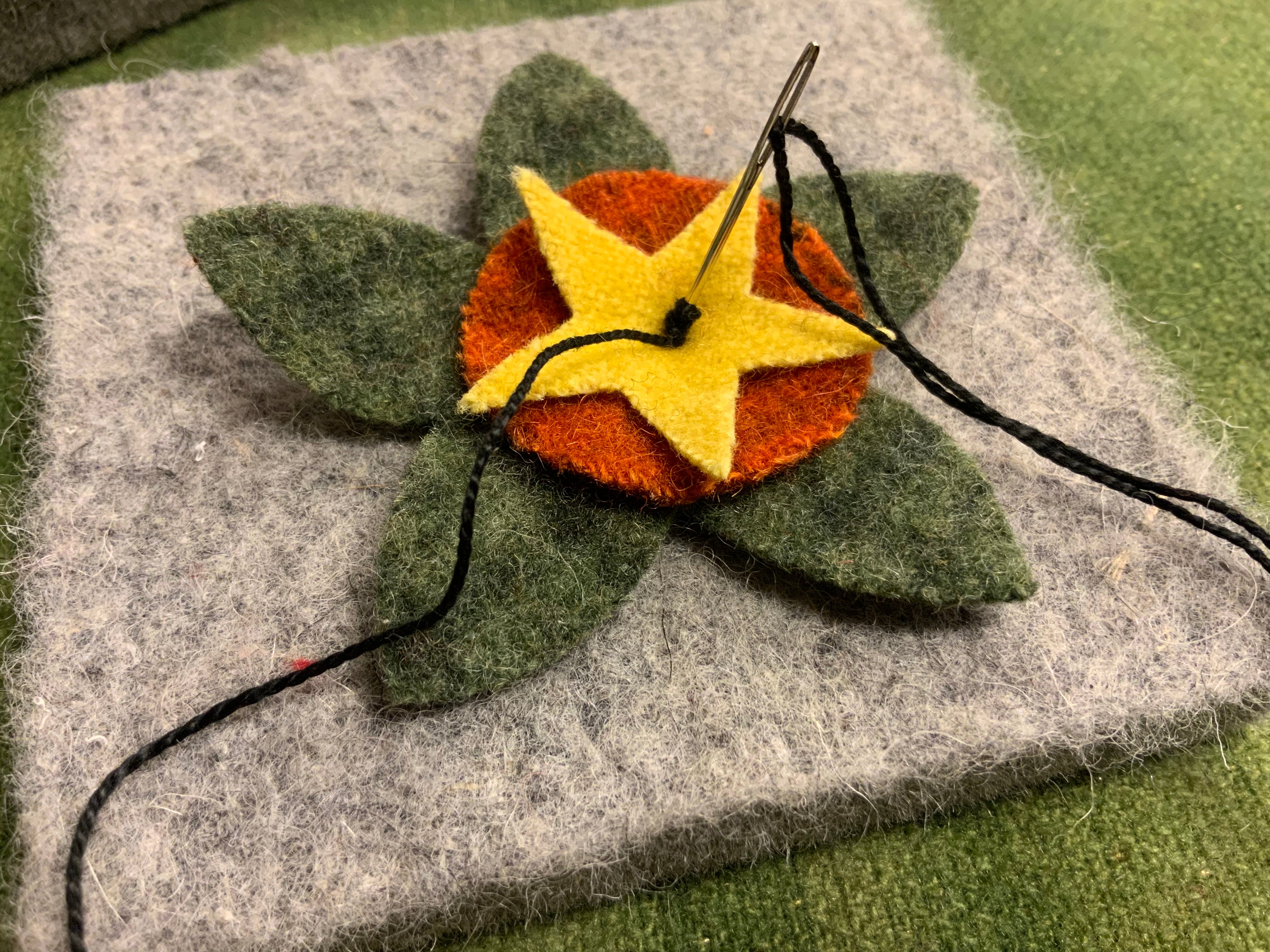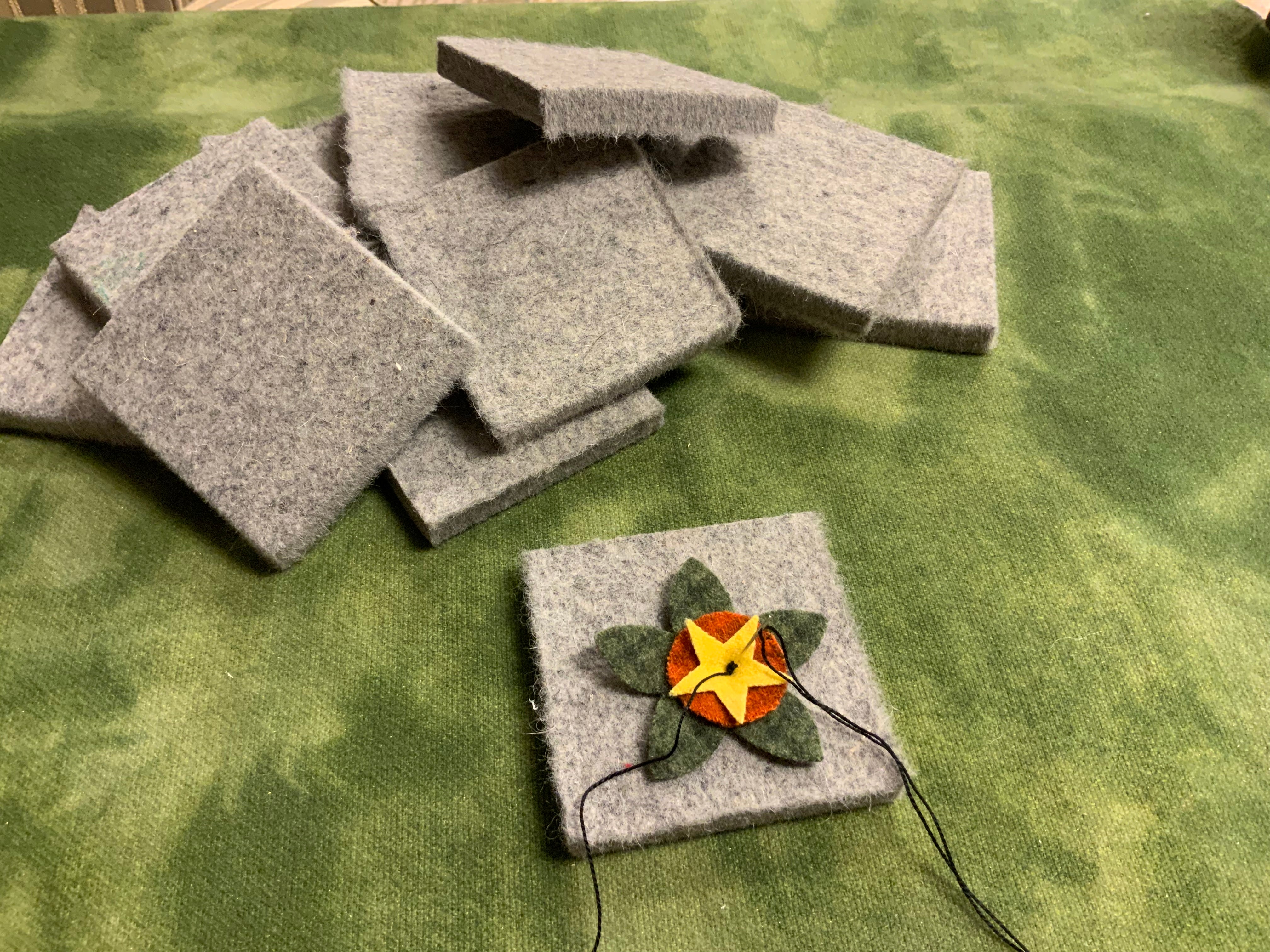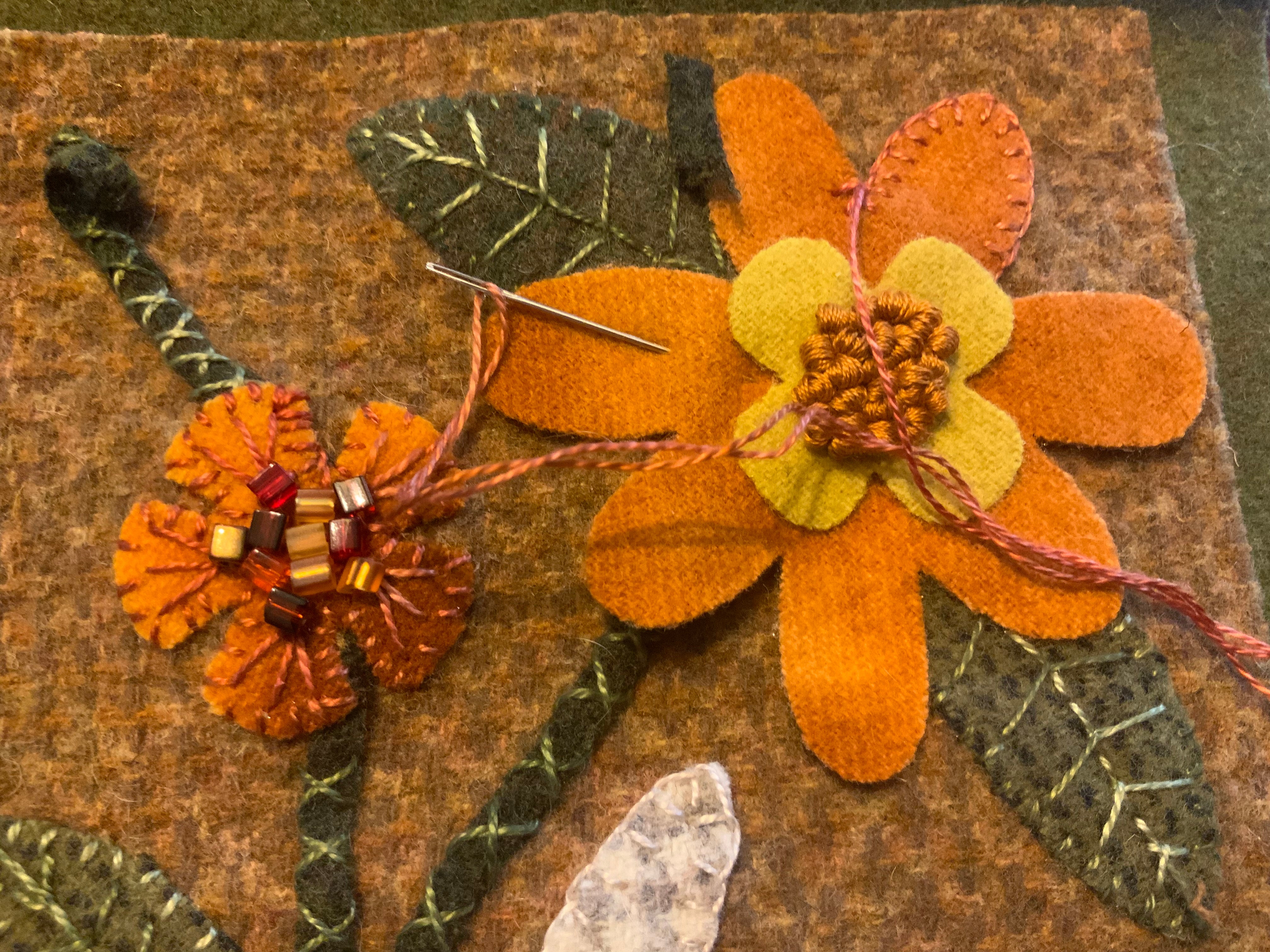 Knotty pads are just the perfect size to keep on the arm of your chair as your doing fancy knot work. This is what I use to do French knots or drizzle stitches or any time you need to wrap your needle with your thread and secure it to create special effects. It was much easier to do the big cluster of French knots in the center of the flower on our newest banner I’m working on now. Roughly 4x4x1/2 in heavy felt square. They also make great pin cushions!