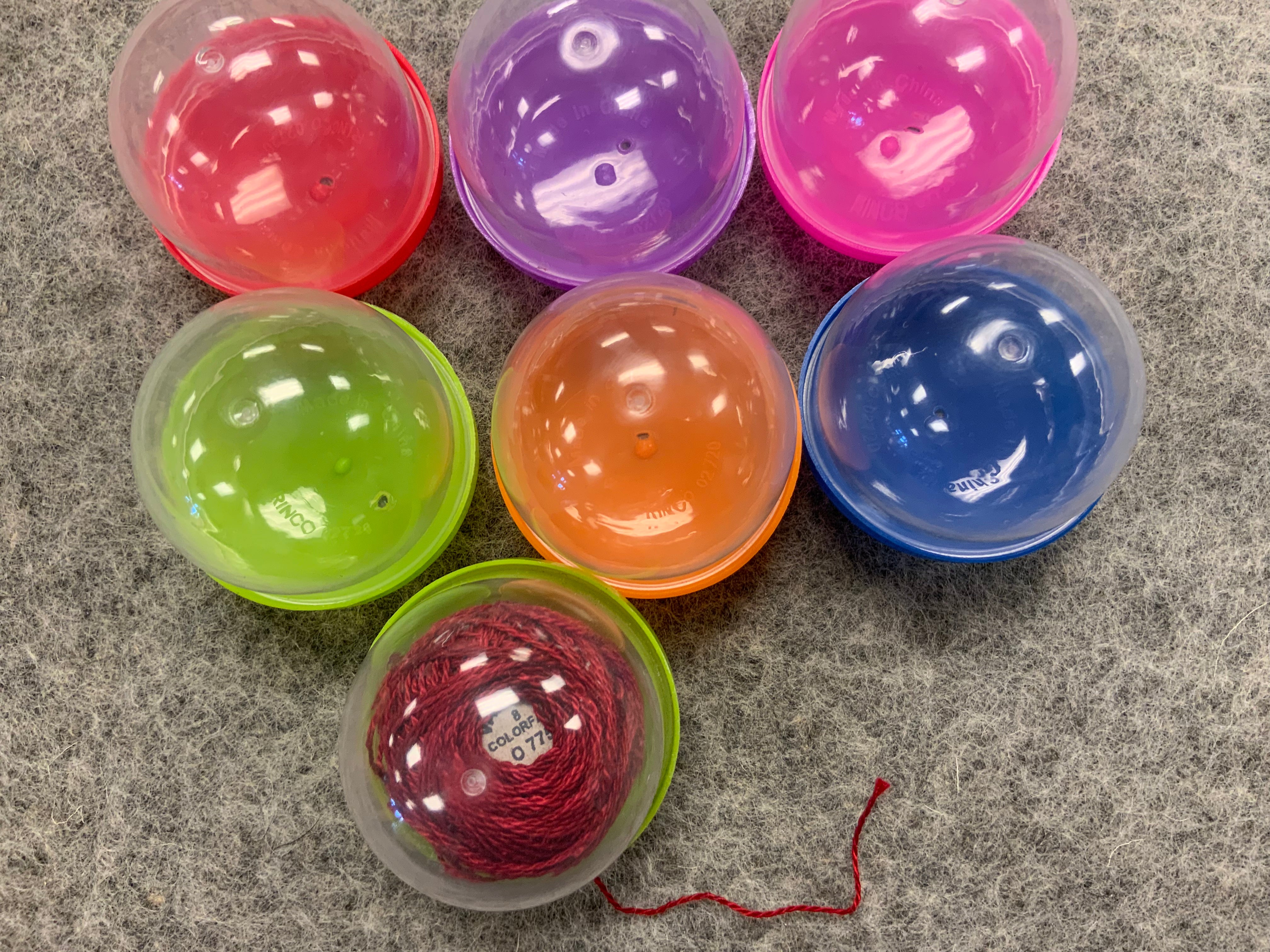 These little cups are perfect to pack a full ball of Valdani or any other similar sized ball of thread. The small hole in the top allows you to feed the end out and punch or pull out what you need to stitch with. By feeding from the center, bottom of your ball your able to read the tag on the bottom for the size and color! Yes, they are toy prize cups ;) but they have many other uses.