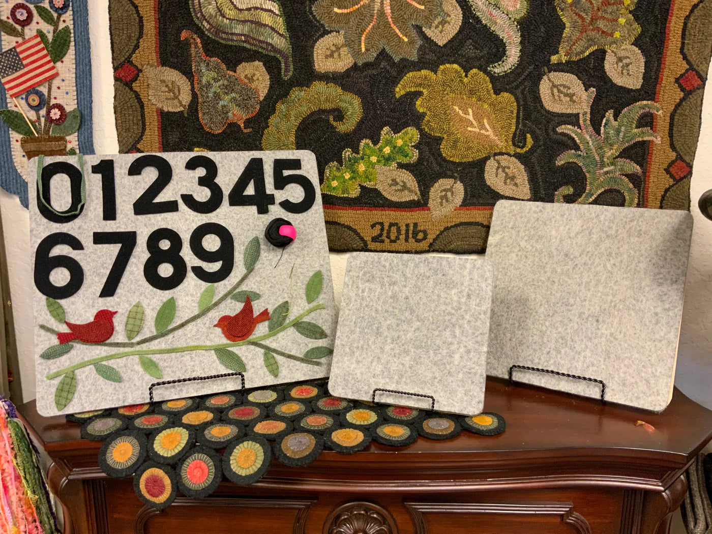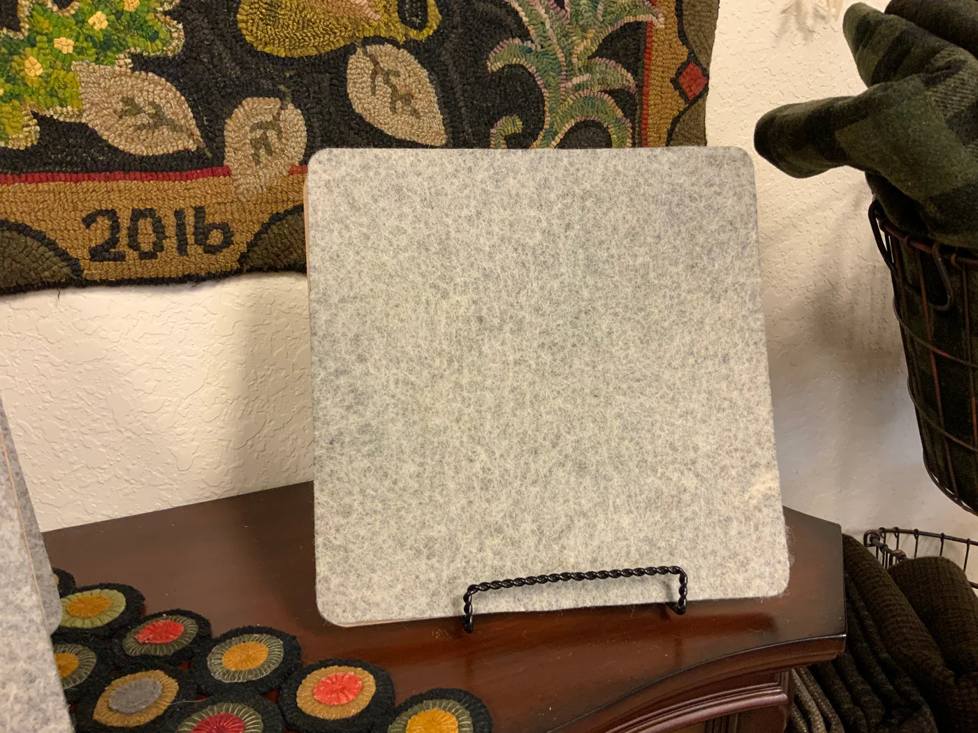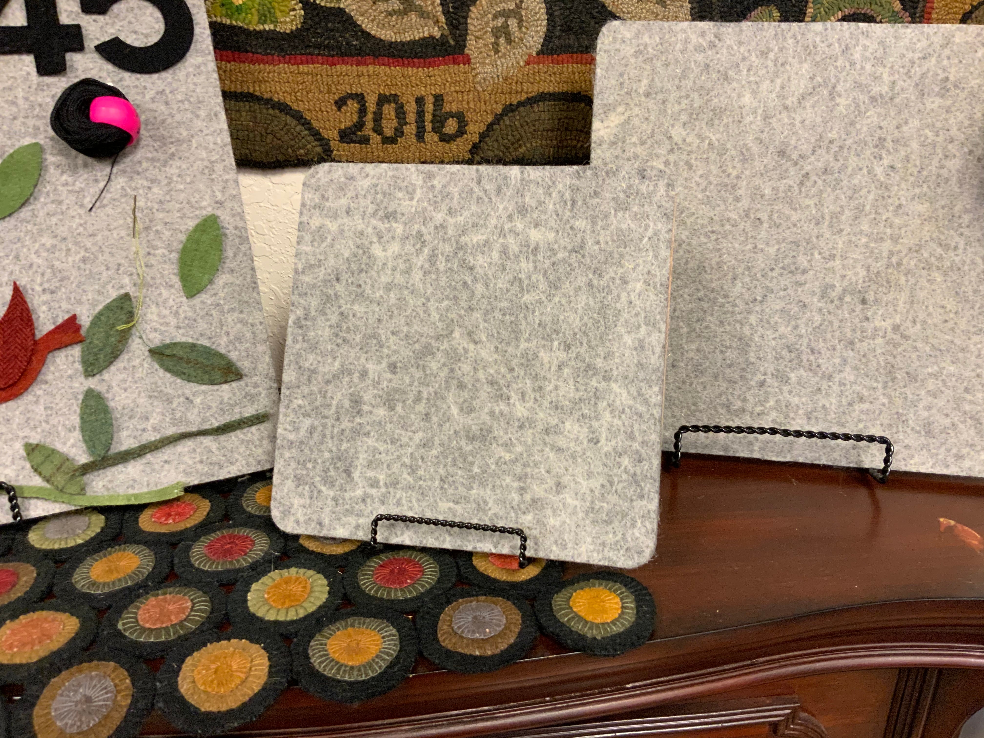 These mats are 100% wool and they create a perfect lay out surface for you wool appliqué and penny rugs. Because the wool pieces and the felt pads kind of stick with the frication your pieces stay put as you work. Birch backing adds stability and stays light weight.