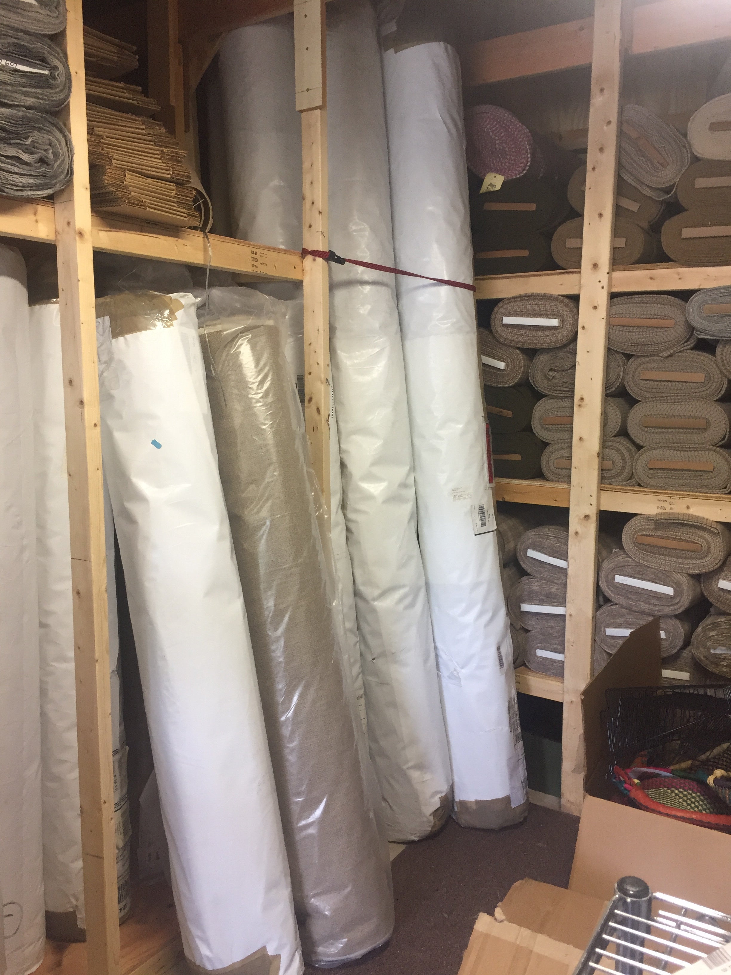 The tall rolls standing in the back are the rolls of 102 in wide linen. This gives you a visual of how wide it is.