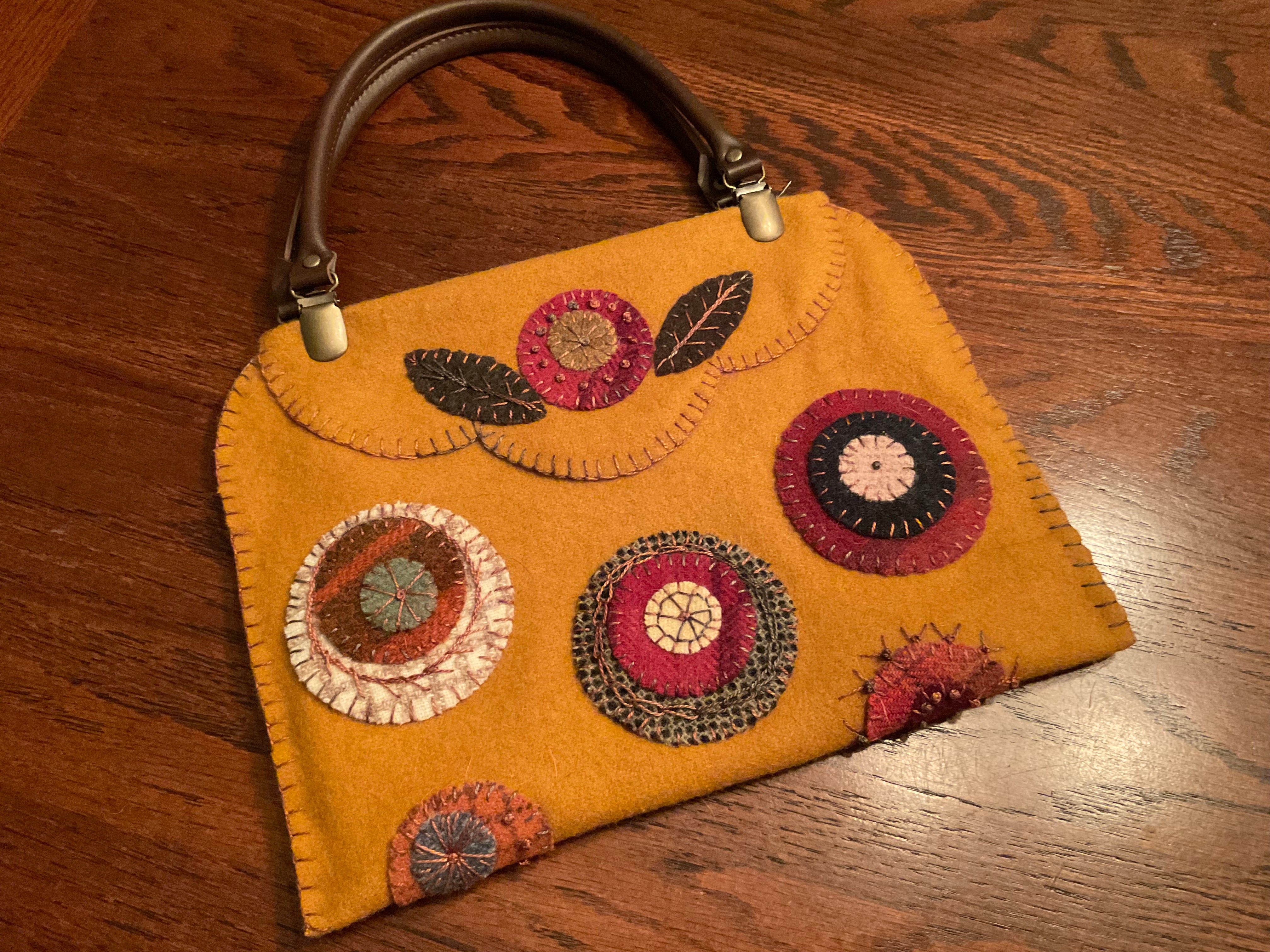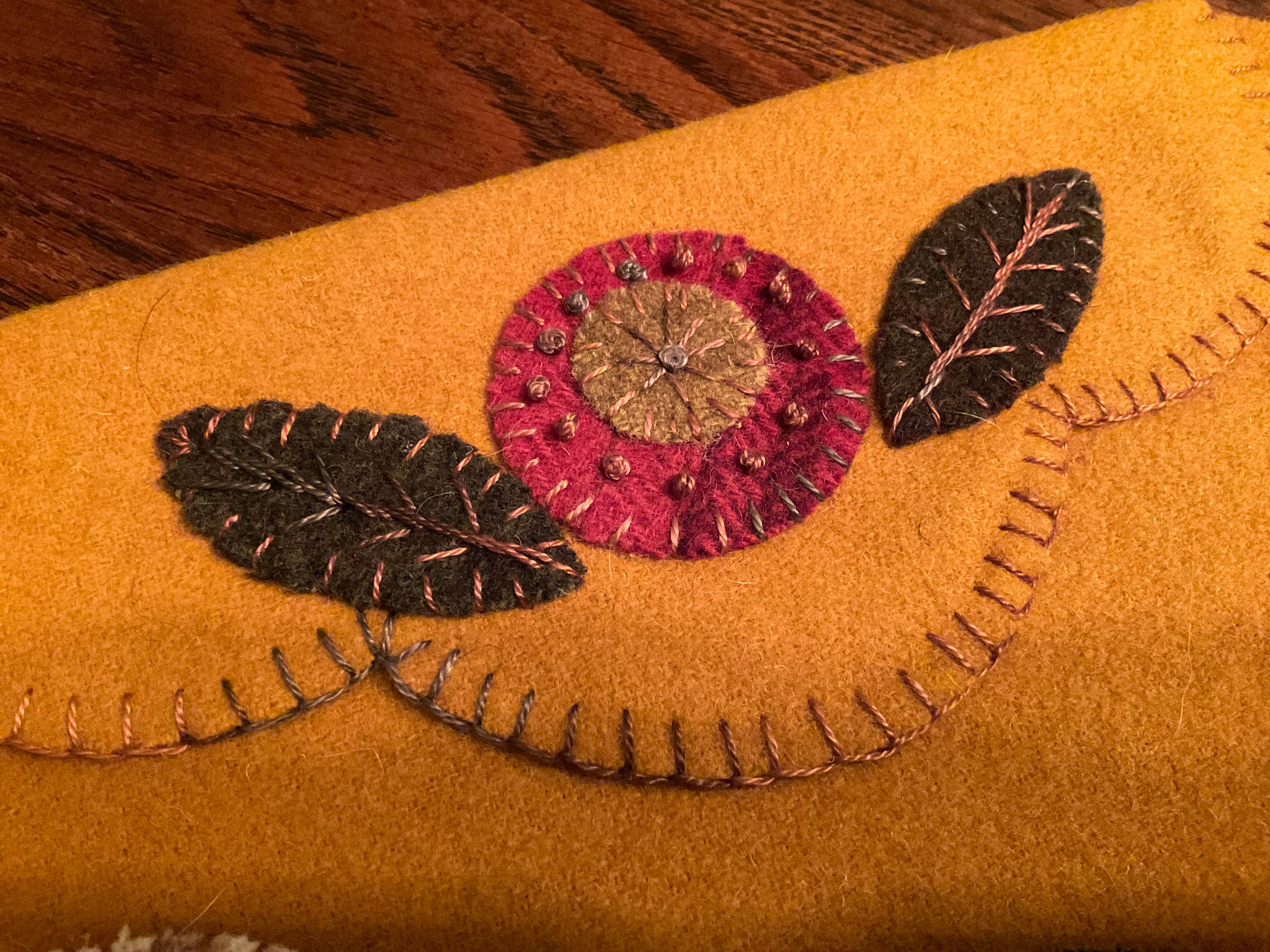 This was one of the most fun kits I’ve done in awhile! I loved stacking the Pennie’s and deciding on their order and how to stitch them and their placement. You will receive the pre cut wool outer piece, the cotton lining, pre cut leaves, Pennie’s in assorted colors, in the 3 sizes I used and a set of sew in snaps if you want to secure the top opening. I have found I do not need them as it’s a small opening and stays closed fine.
