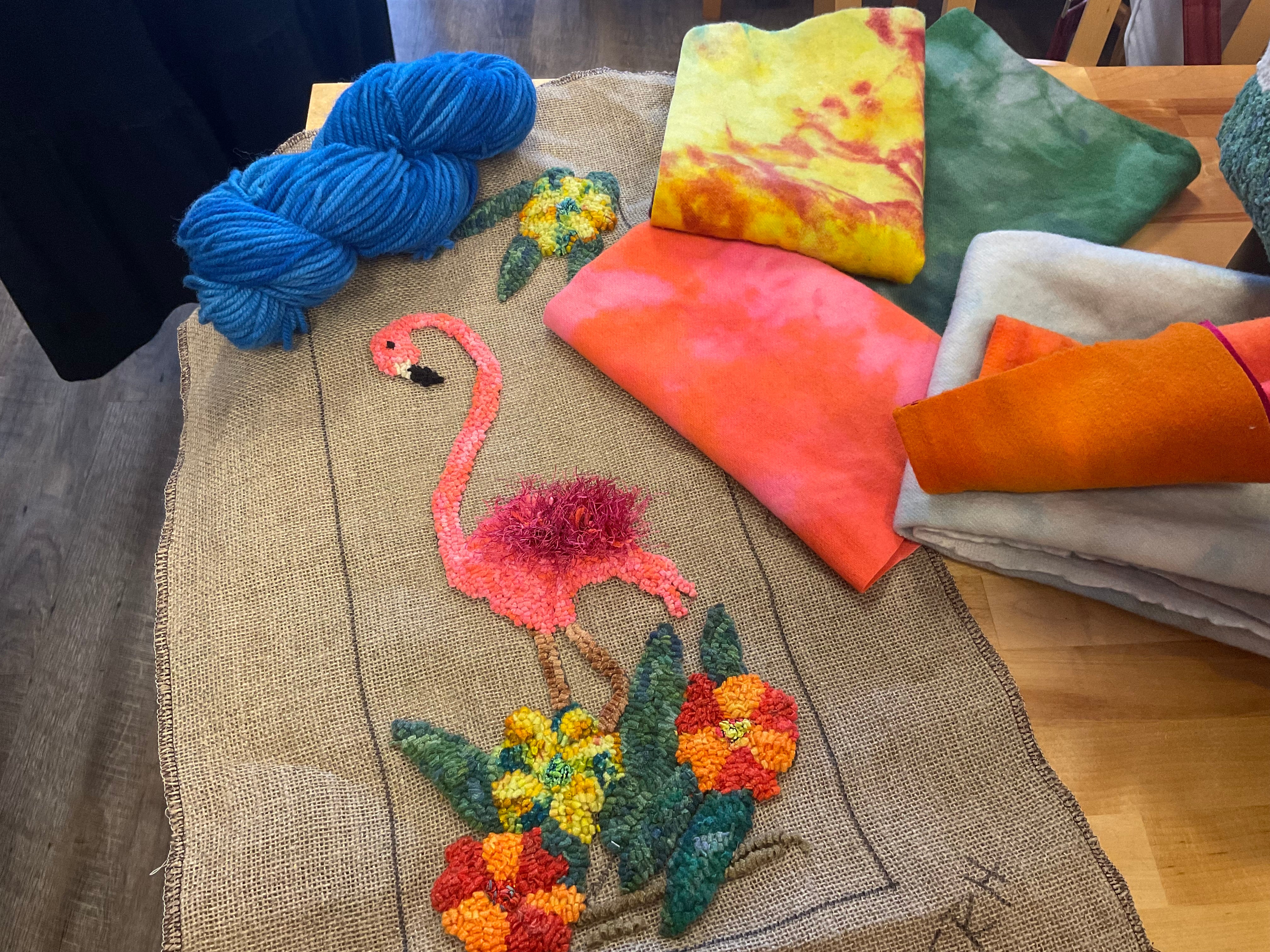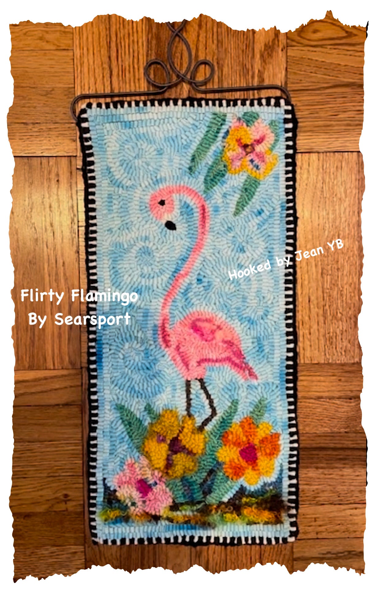 Flirty is our newest 8x18 pattern that offers so many style of hooking, punching or proddy! Keep it simple and just hook her or add yarns or proddy for her wings or do a combo like Jenny is doing with the background being punched with the blue yarn shown !