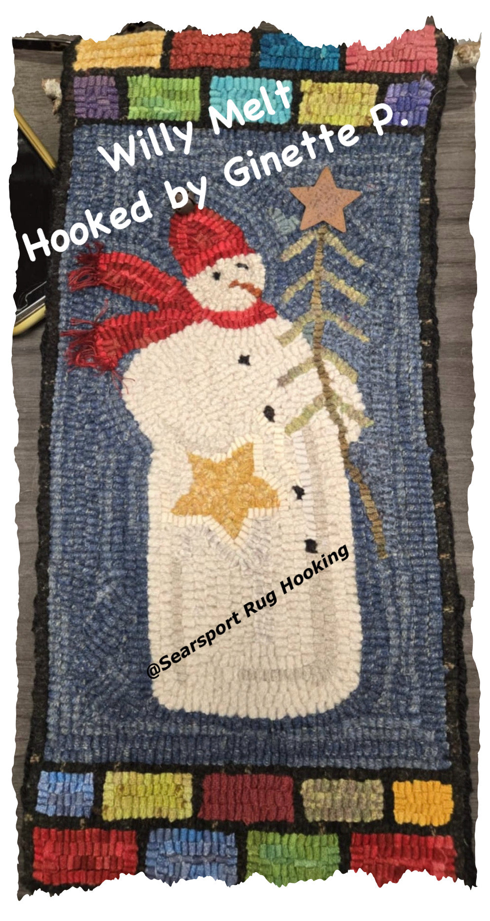 He is perfect for the new rug hooker or anyone looking for a little filler project. He will make a cute wall hangings or pillow or displayed on a small table. Check out Ginnettes P’s cute snowman and great fun color planning!