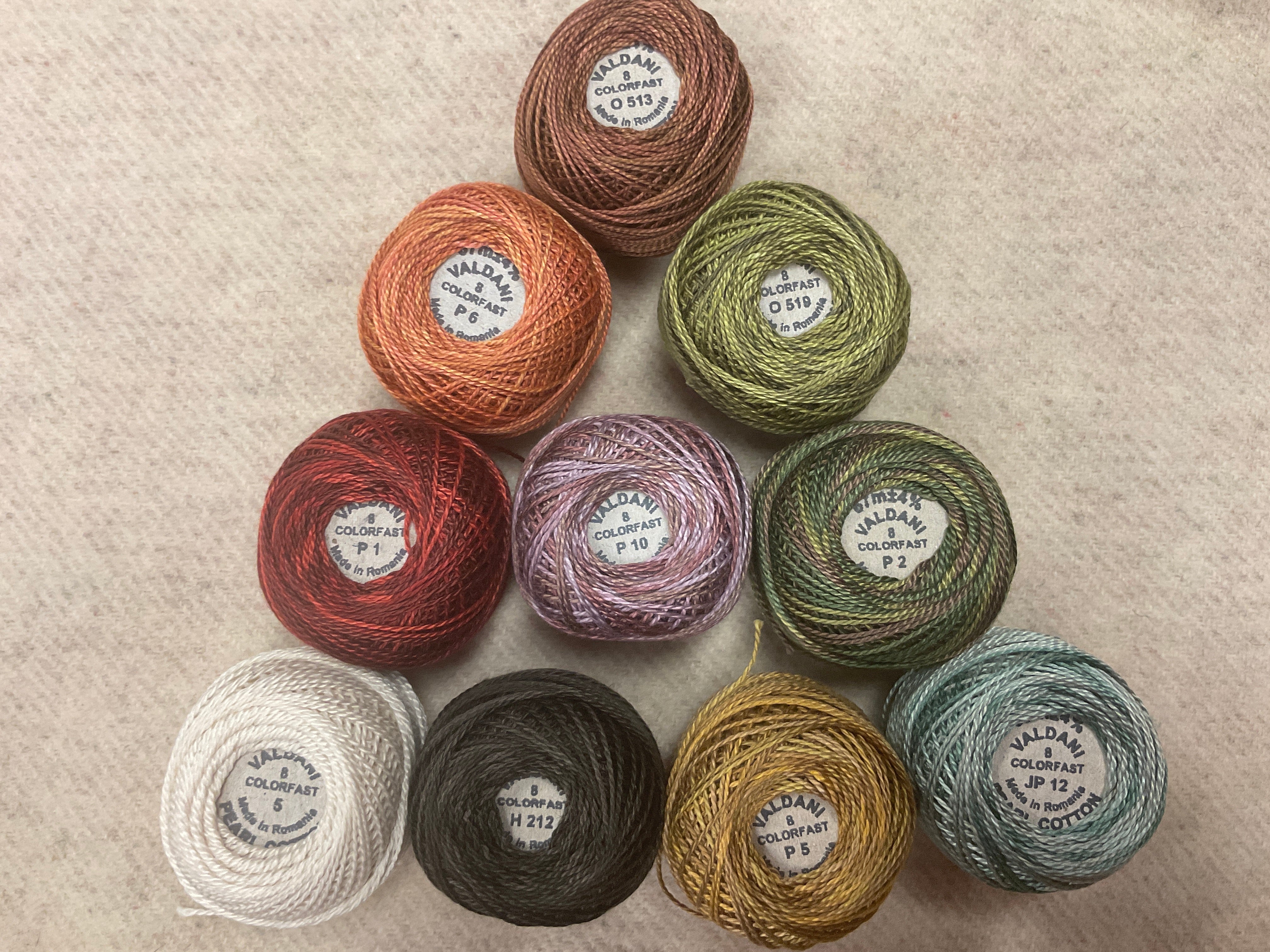 These are the 10 threads used in the book Buttermolds by Bonnie Sullivan. Choose either #8 that’s perfect for a more rustic stitching effect and for mini punch or #12 for a finer stitching effect.