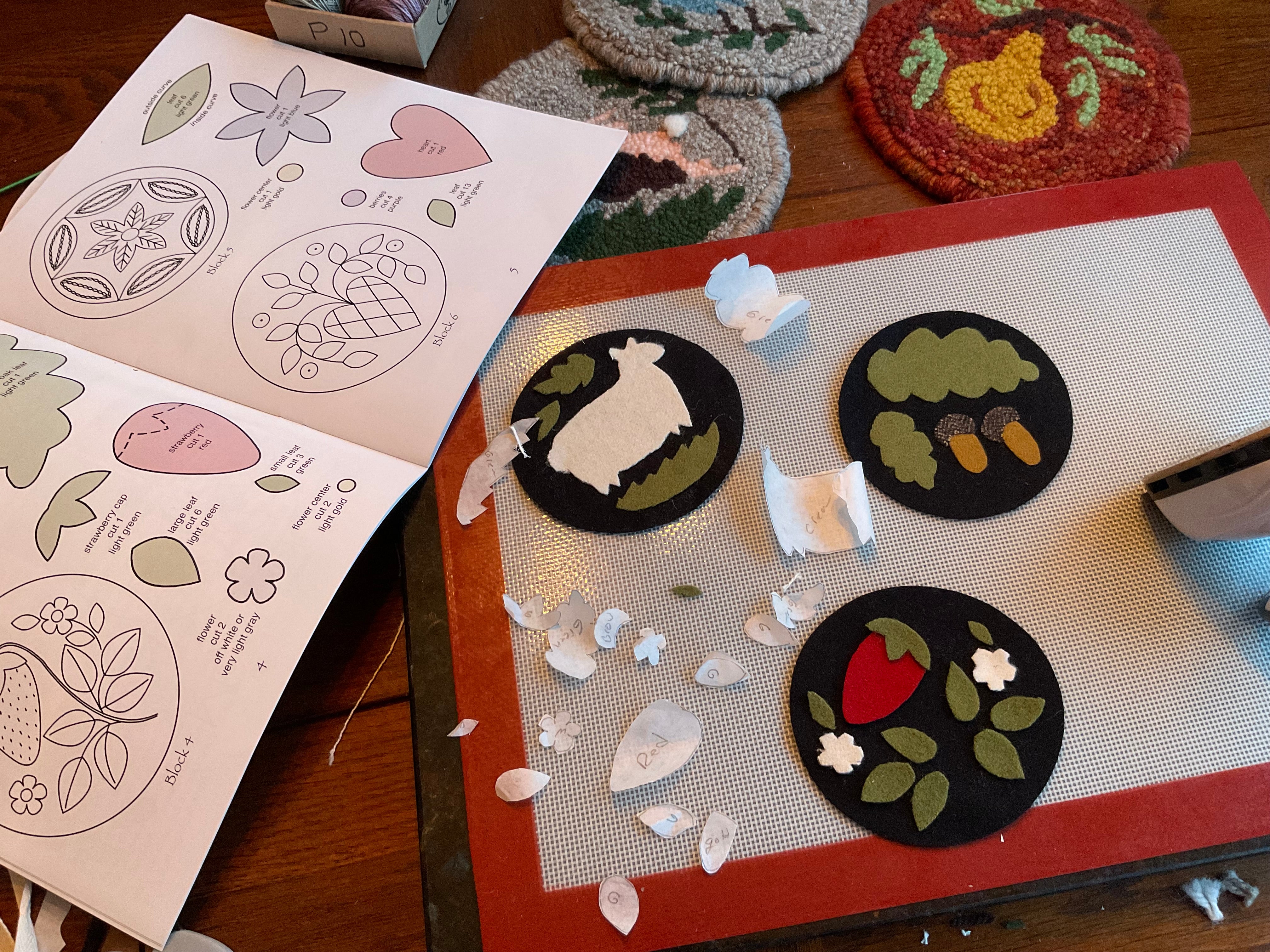 These are a generous size of assorted colors from the book. The main colors are 8x10, the two small brown accent colors are 6x5 and 5x5 and the main green is 7x36. More then enough to do all the blocks plus some. We did nice size squares to give you plenty to make any color changes you might want to do for your designs. The main green is a nice big piece for all the little leaves in the patterns.