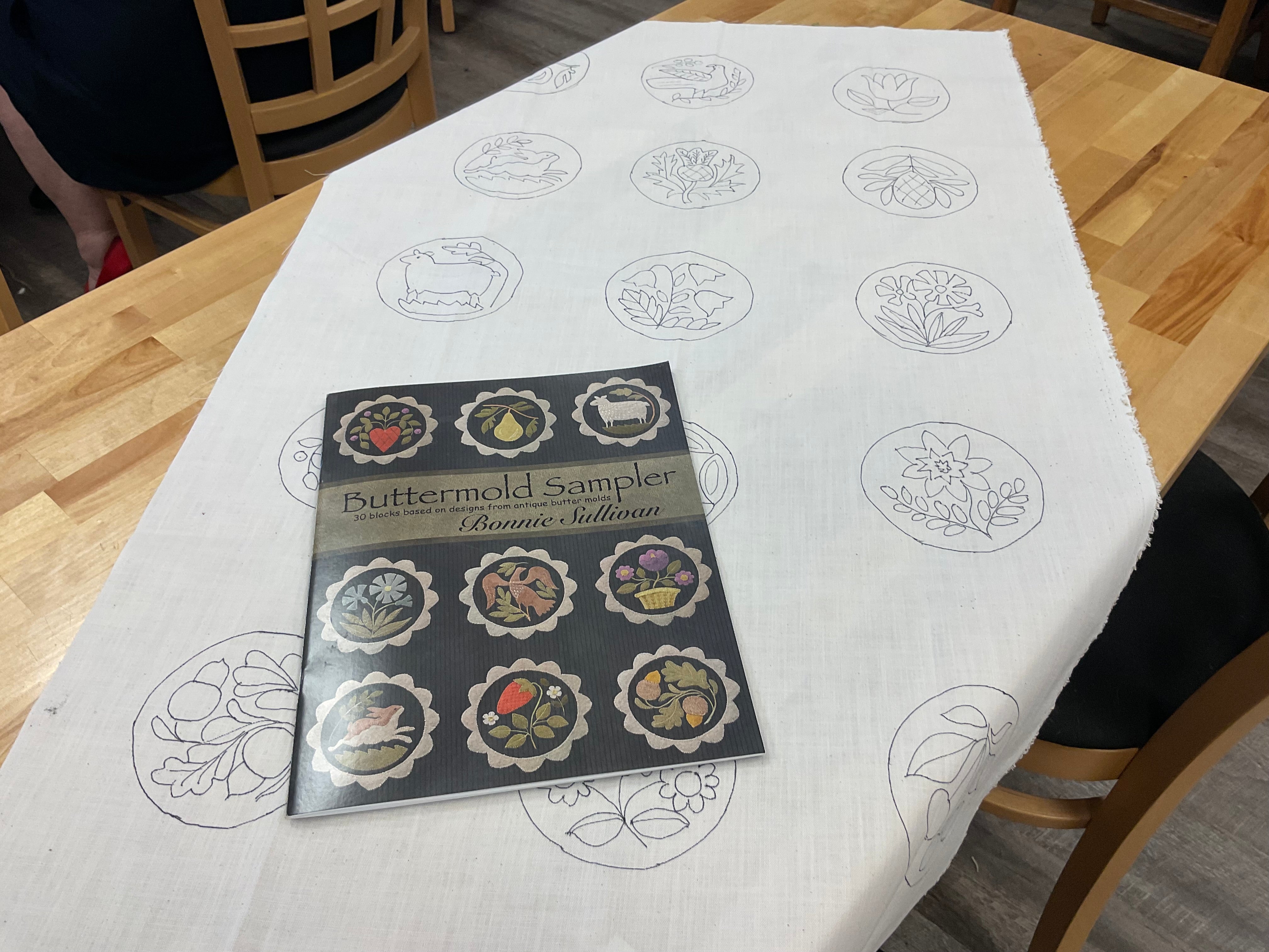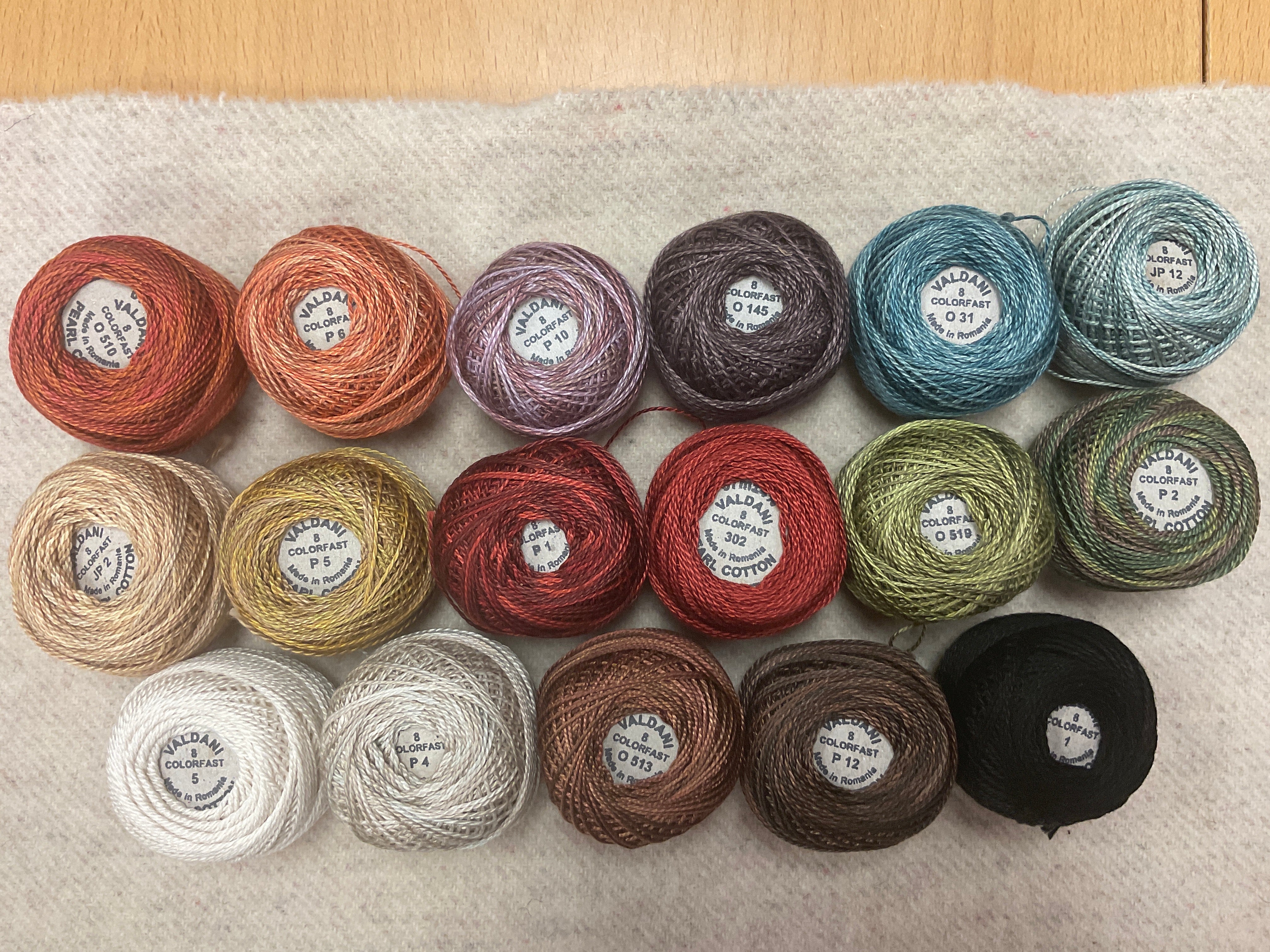 These are the 17 threads Julie used punching the samples in the store. We started with the base colors from the book and then added a darker or lighter color to give more definition for punching. Then we added black and cream. The Patterns are available in the book Buttermolds by Bonnie Sullivan. #8 that’s perfect for a more rustic stitching effect and for mini punch