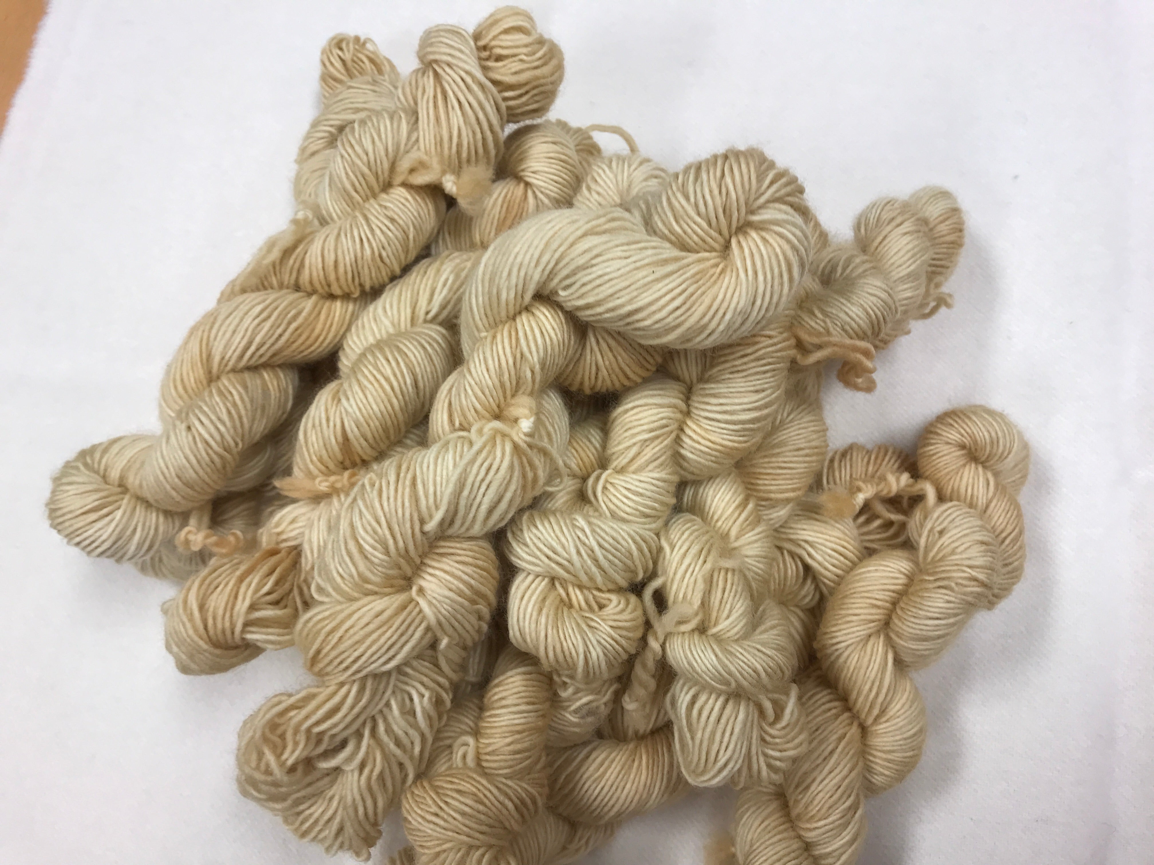 Hand dyed merino yarns by us! Supplies are limited for each color and will change by dye lots. Please make sure you order enough as matching these are very difficult. More gold than tan. Picture is to tan.