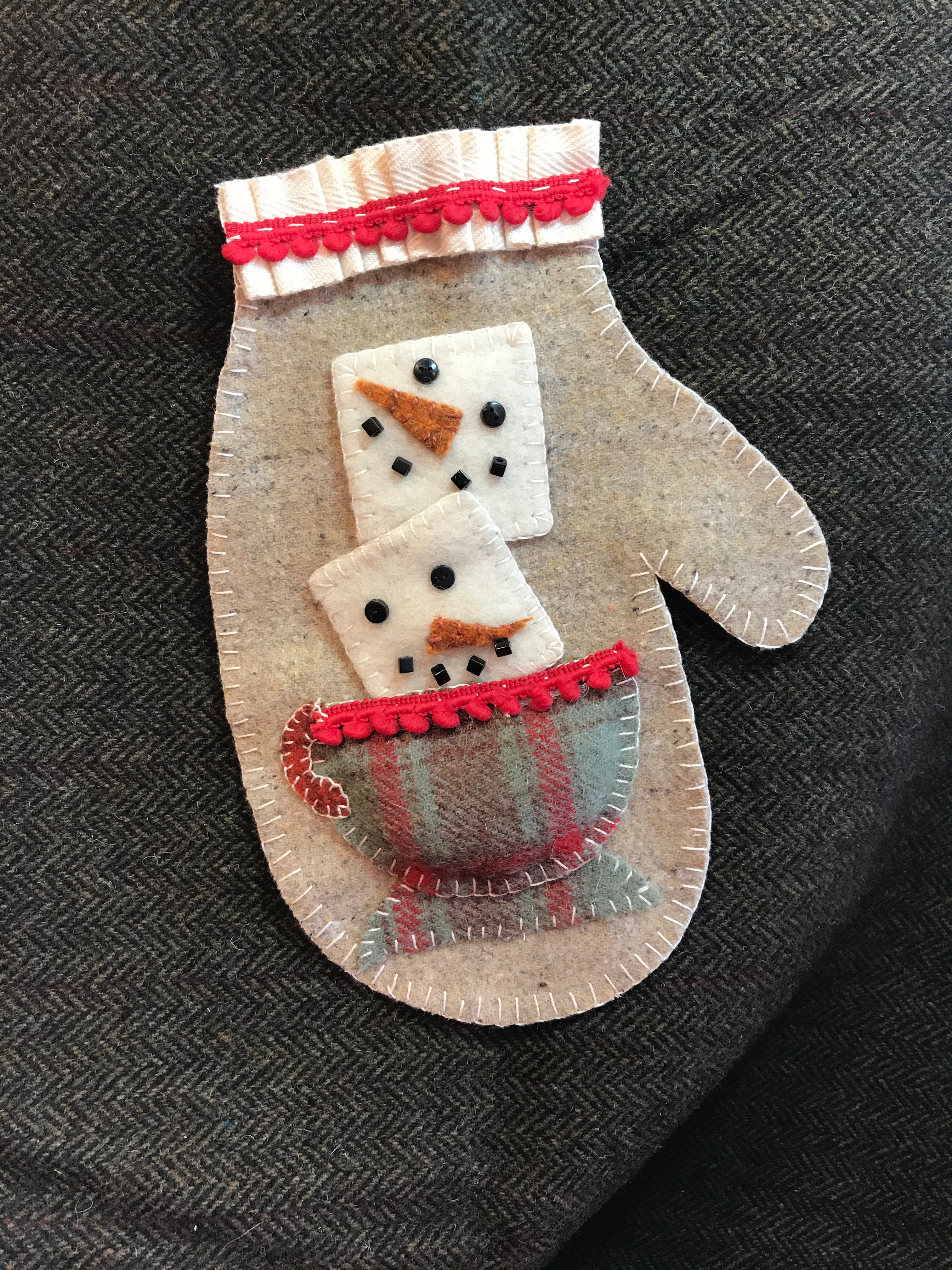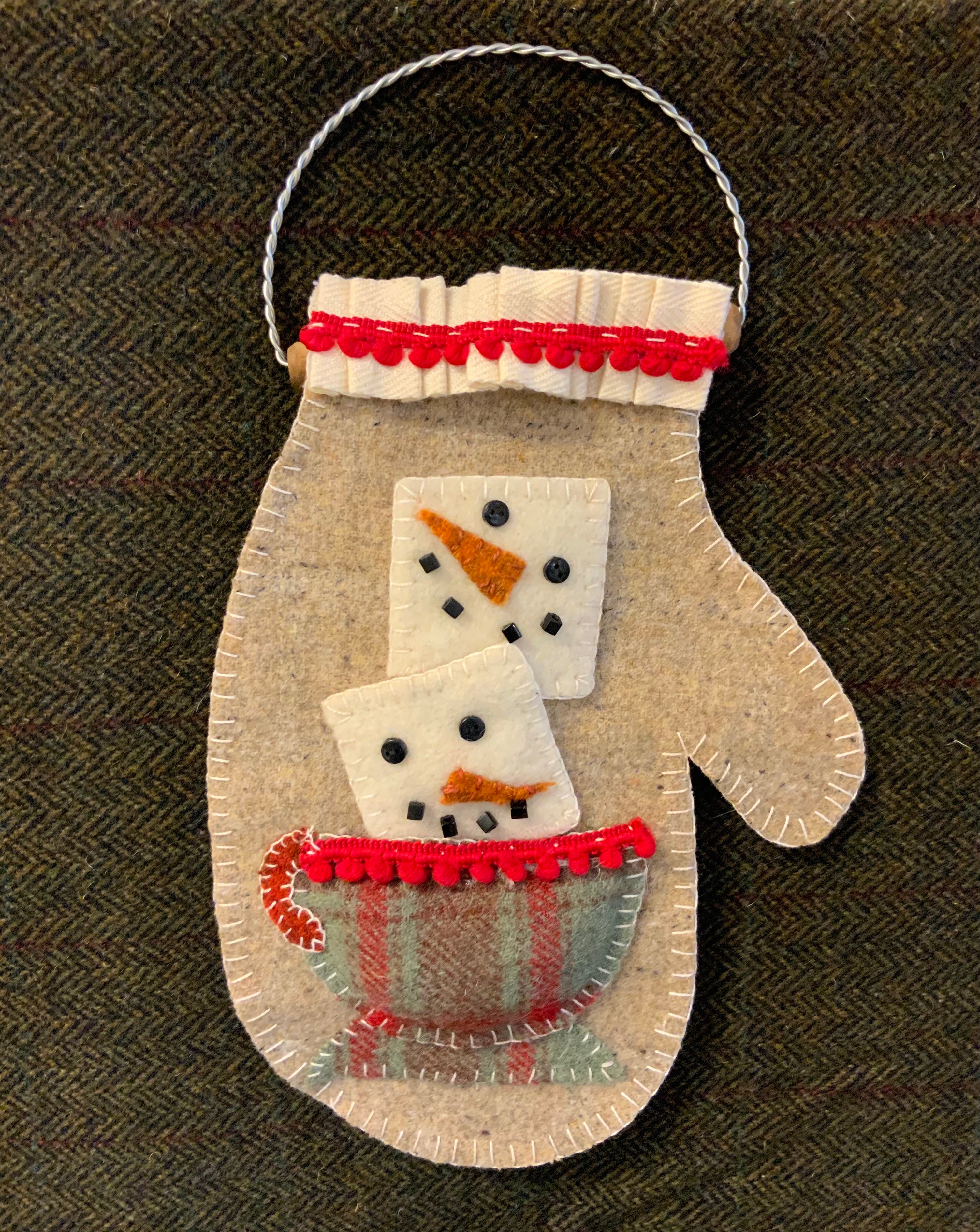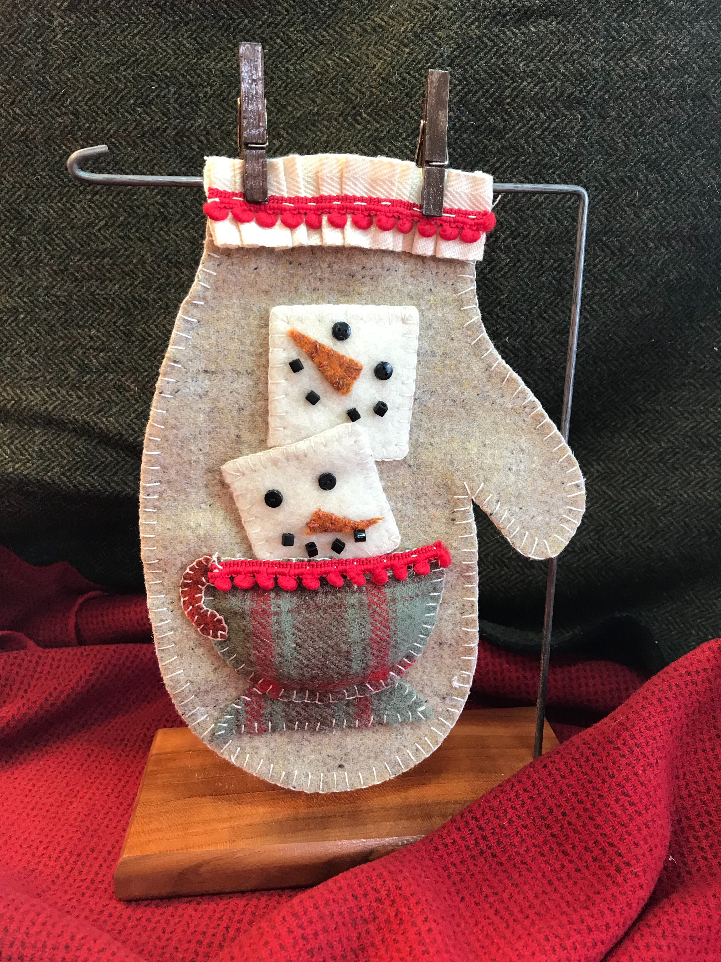 The cold winters air or the holidays or just a special treat all are better with a cup of hot cocoa! Now that we are in Florida full time I will just turn the air conditioner on high and enjoy a cup! Or you can stitch up a cute mitten to warm your heart. The kit includes all the pre cut wool pieces, ruffled cotton, red trim, beads, thread and stuffing to puff the cup out. You can add hangers if you need them