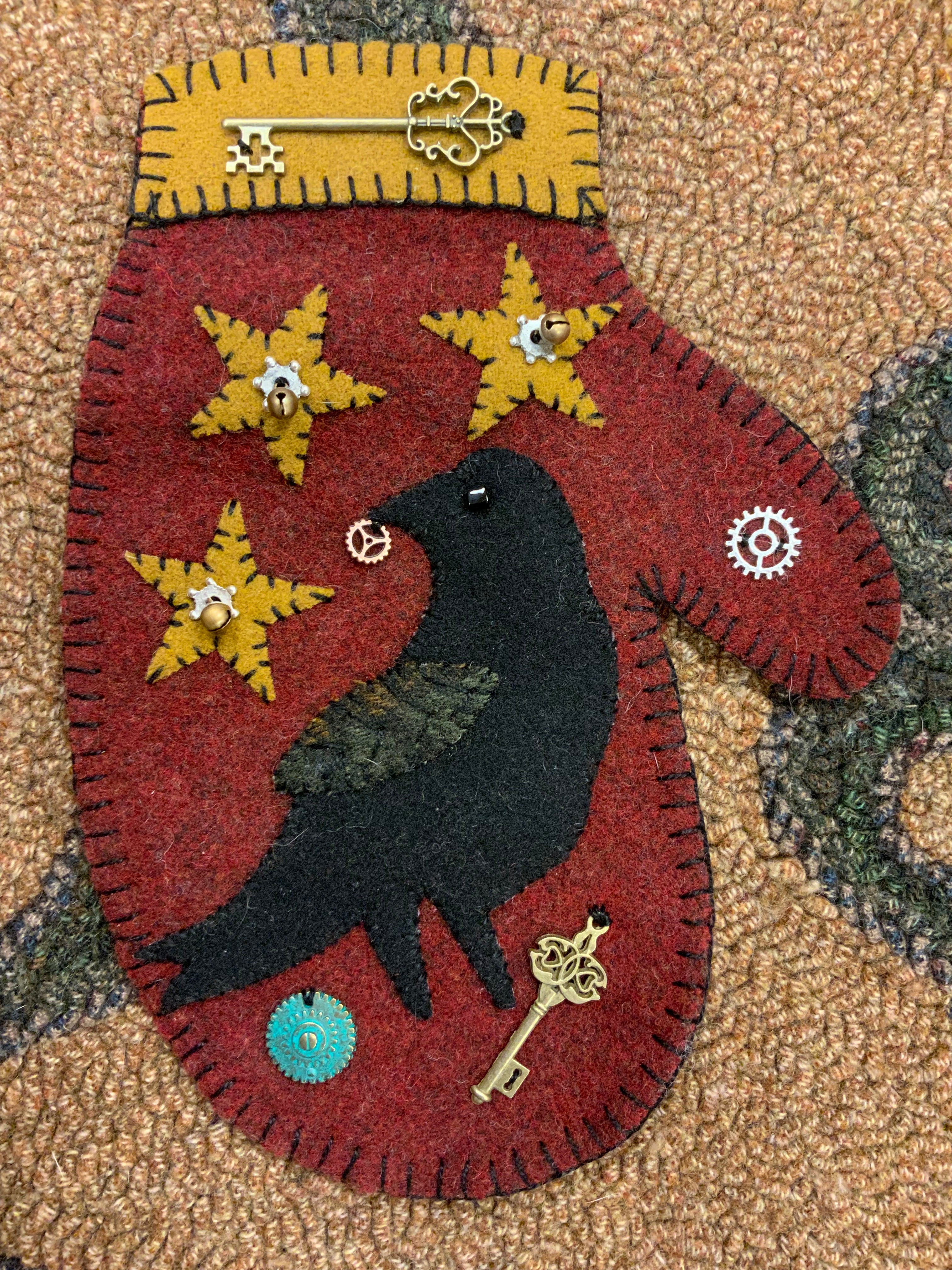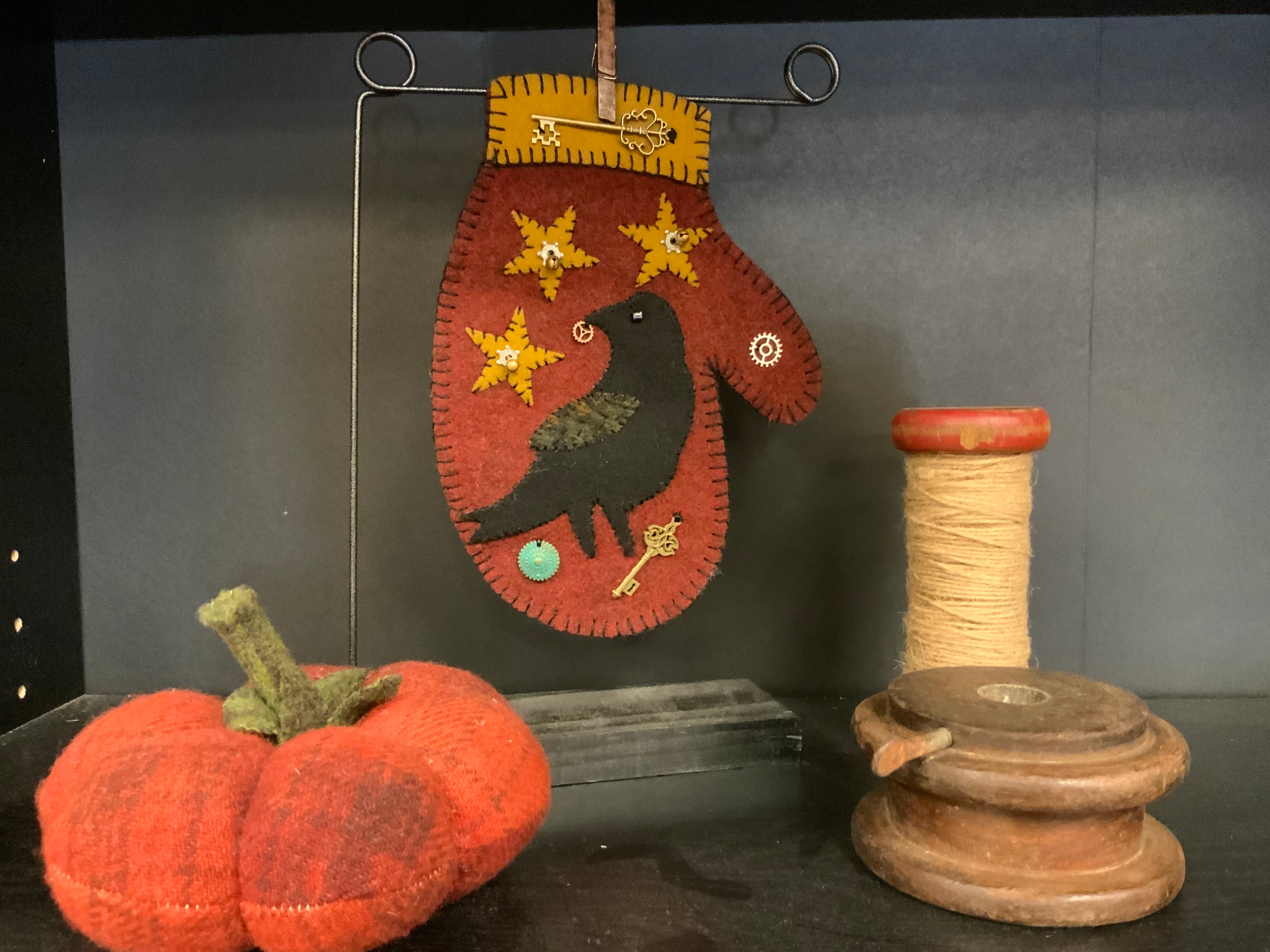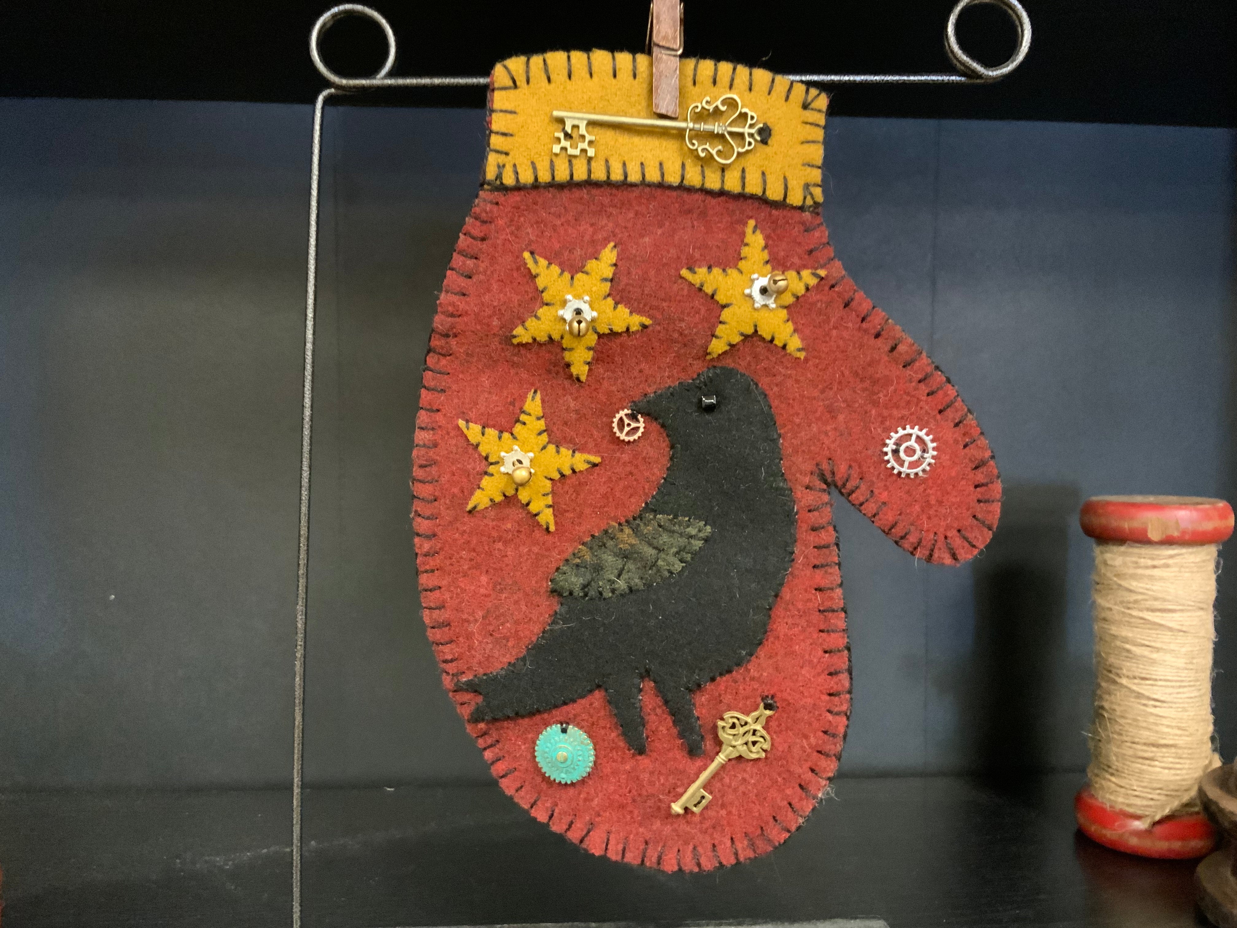 Another cute mitten to add to your collection! This sneaky crow has gathered up some sparkly treasure and horsing them all for himself! You can add dowel hangers or a stand if you need them. Kit includes everything you need to stitch it as shown. All the pre cut wool, mitten back, stars, crow, wing, black thread, glass bead for the eye, bells and sparkly treasures!