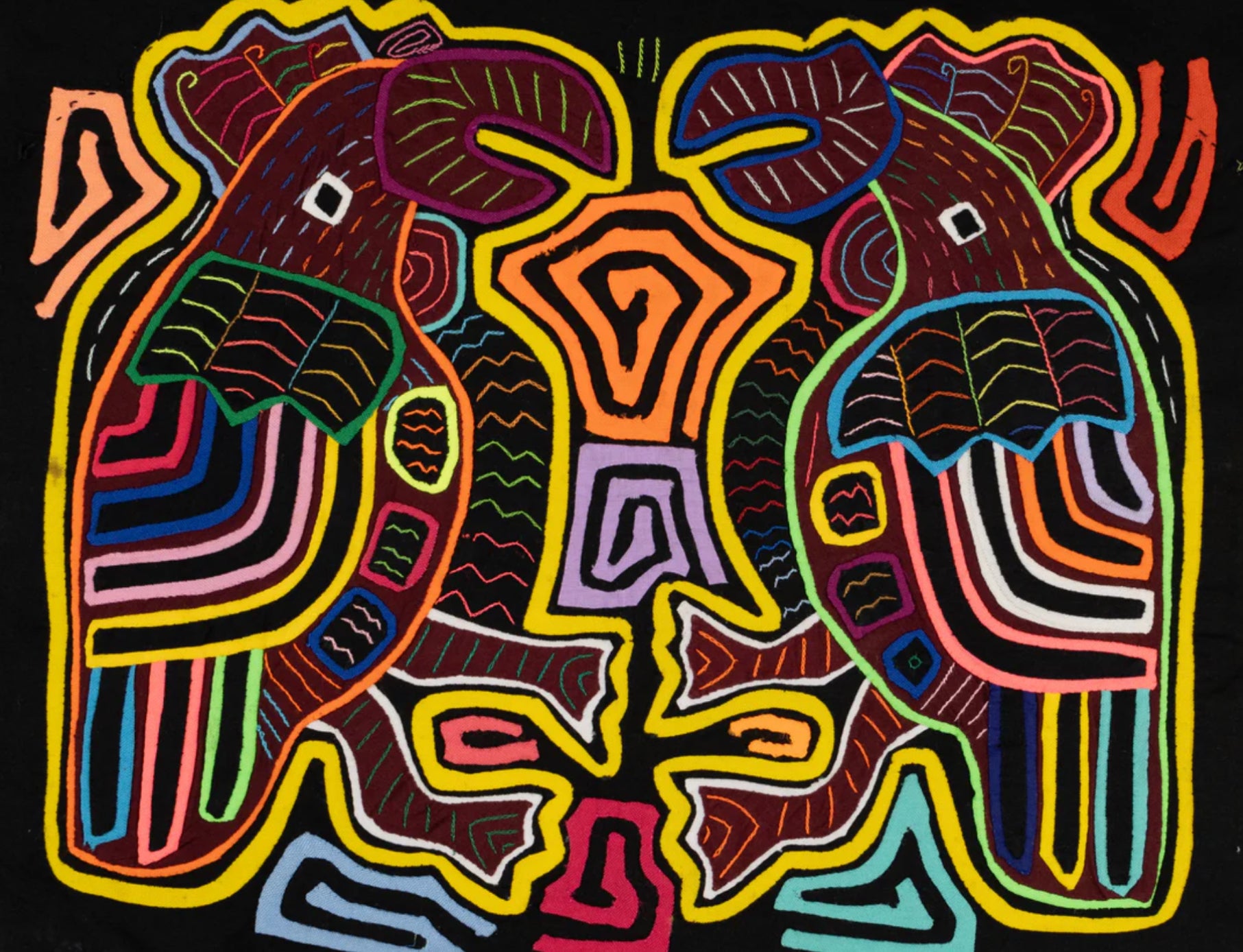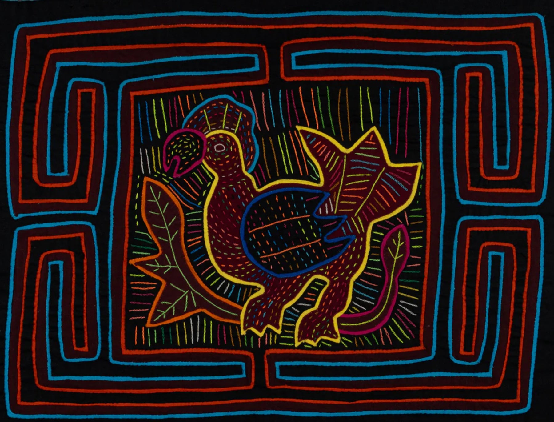 But the Mola or Molas is a hand-made textile that forms part of the traditional women's clothing of the indigenous Guna people from Panama. Hmmm. Interesting. Want to learn more? Come to class with us! Feb 20-22 or March 6-8 Michele Micarelli will be teaching with us again and the class will focus on Mola’s. The class size will be small, only 12 students for each class session She is designing the patterns along traditional lines and will help you color plan a wild vibrant piece of art that will make a great small table mat, pillow, wall hanging or rug. Or help you create one with your color palette, to work in your home, but with the Molas design theme!
