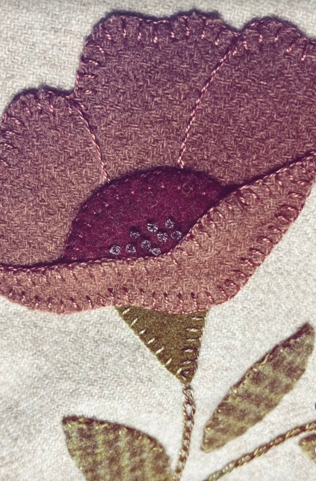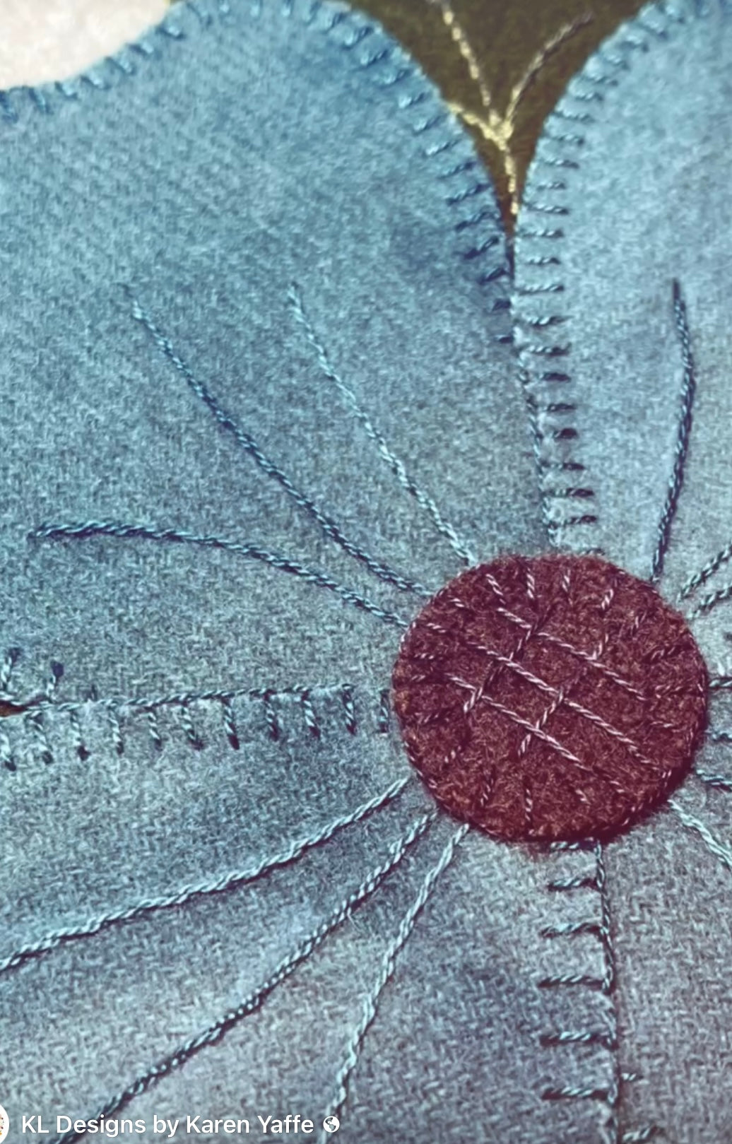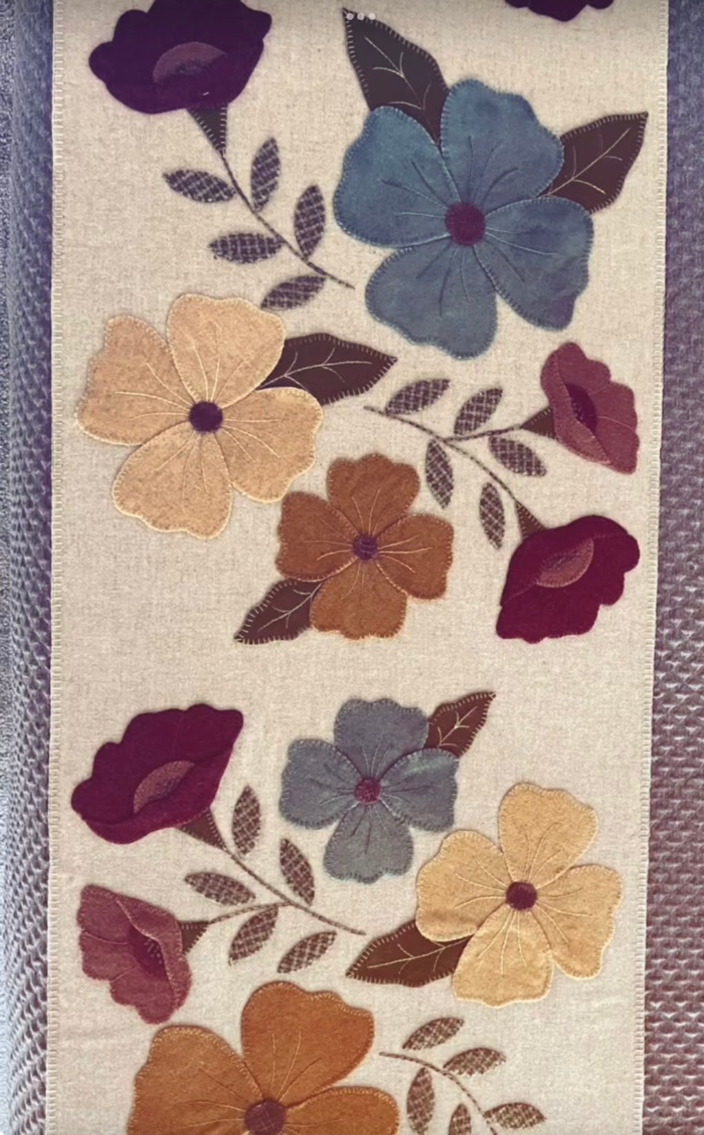 So many uses for this big bold design and so many sizes and color combos to play with! Karen says she loves a beautiful bed scarf! Who doesn’t! And she’s been wanting to make one for a while and finally got around to it. Most of the wools she used are hand-dyed wools, so it’s just gorgeous!! And the background is wool! This is a king size scarf, but in the pattern she provides measurements to make a runner, twin and queen size.