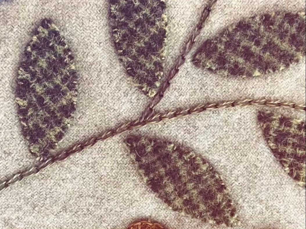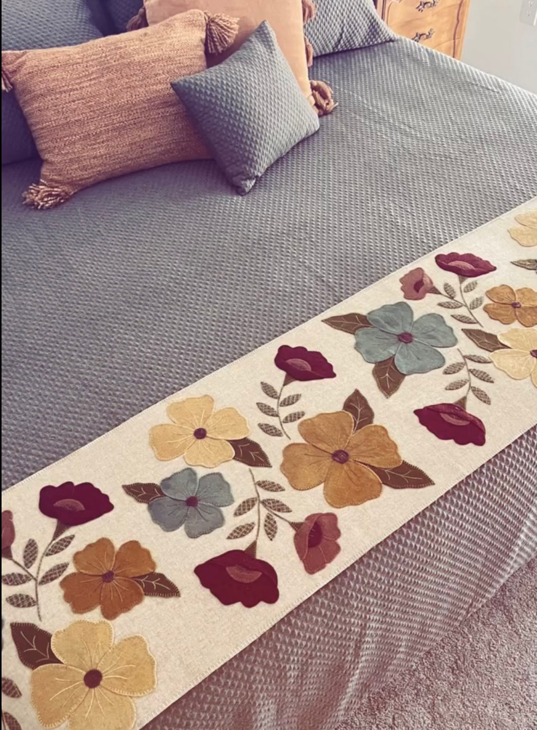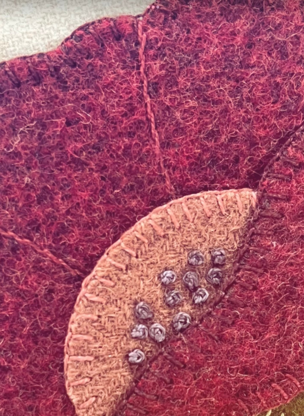 So many uses for this big bold design and so many sizes and color combos to play with! Karen says she loves a beautiful bed scarf! Who doesn’t! And she’s been wanting to make one for a while and finally got around to it. Most of the wools she used are hand-dyed wools, so it’s just gorgeous!! And the background is wool! This is a king size scarf, but in the pattern she provides measurements to make a runner, twin and queen size.