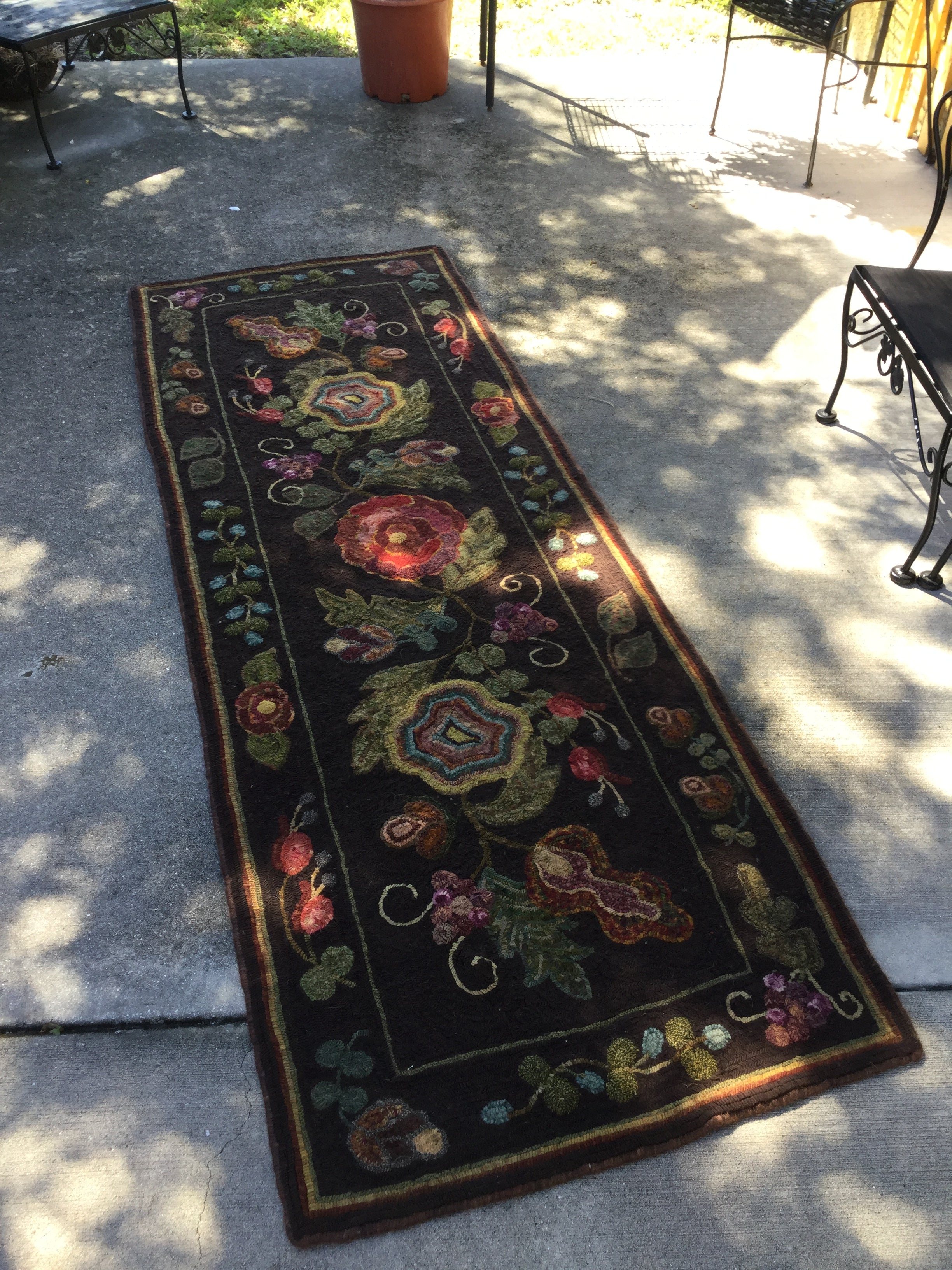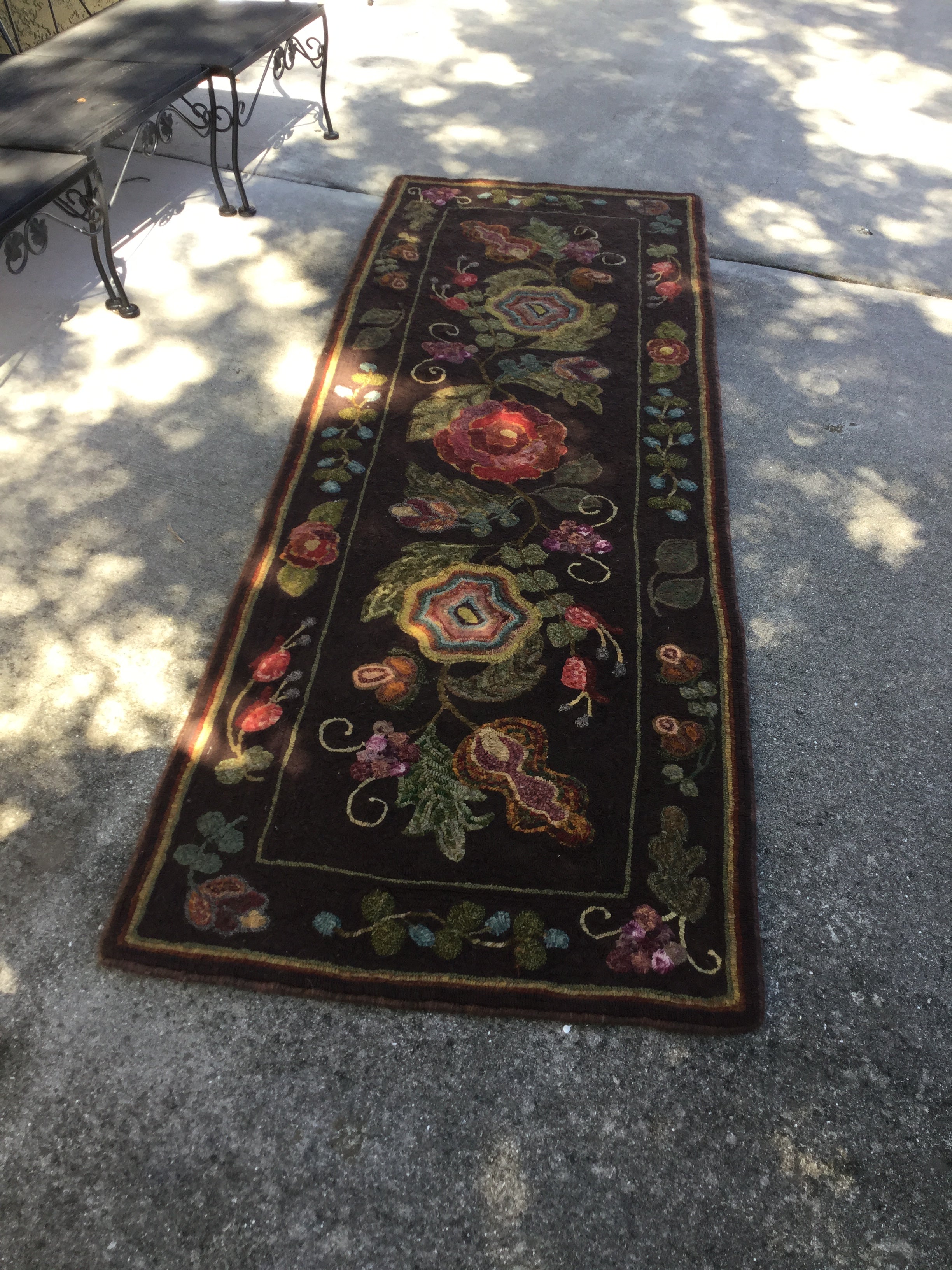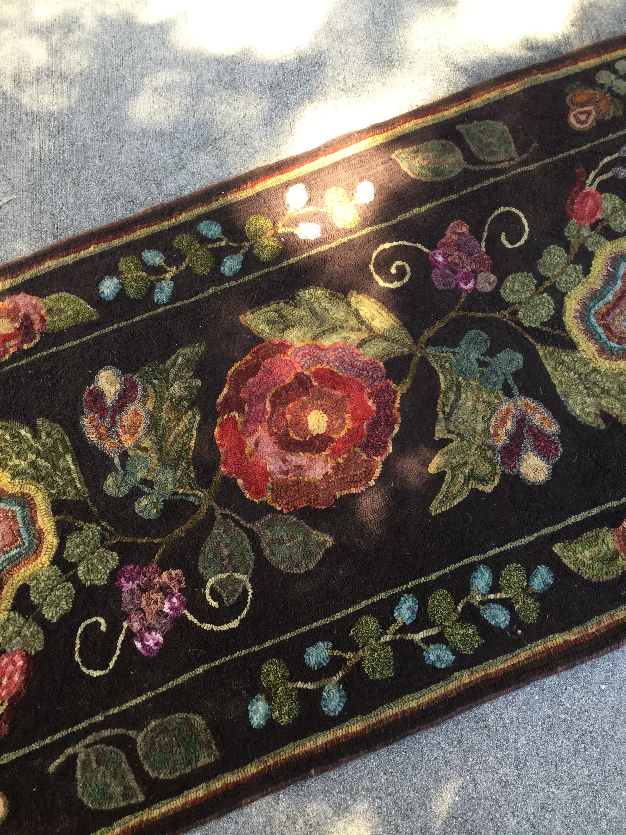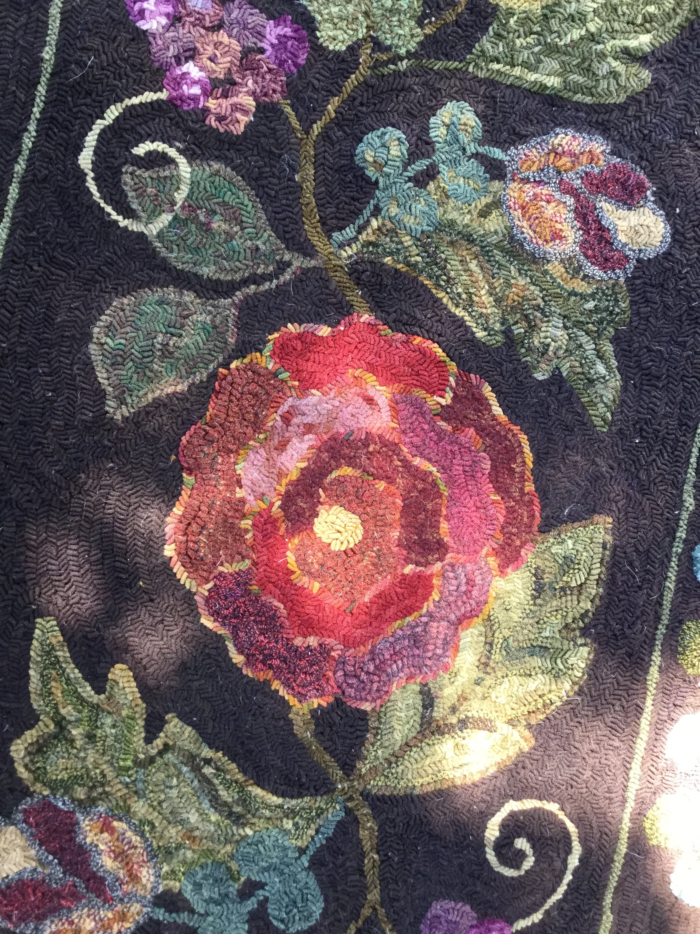 This is a huge beautiful rug that will last for generations as a treasured heirloom once you hook it. We used our favorite background for it that is even called Gabbie’s background! it’s a chocolate/purple that let you work with the many colors needed in this design. It was originally design for Gabi W who ran our dye kitchen with an iron fist! We have also shown her version which is a thick, lush, hand torn monster of a rug! The pattern size is 30x90 with larger and smaller versions available! Also remember any purchase over $125 ships free in the USA. This design, along with all our others, are hand drawn on the straight of the grain on linen.