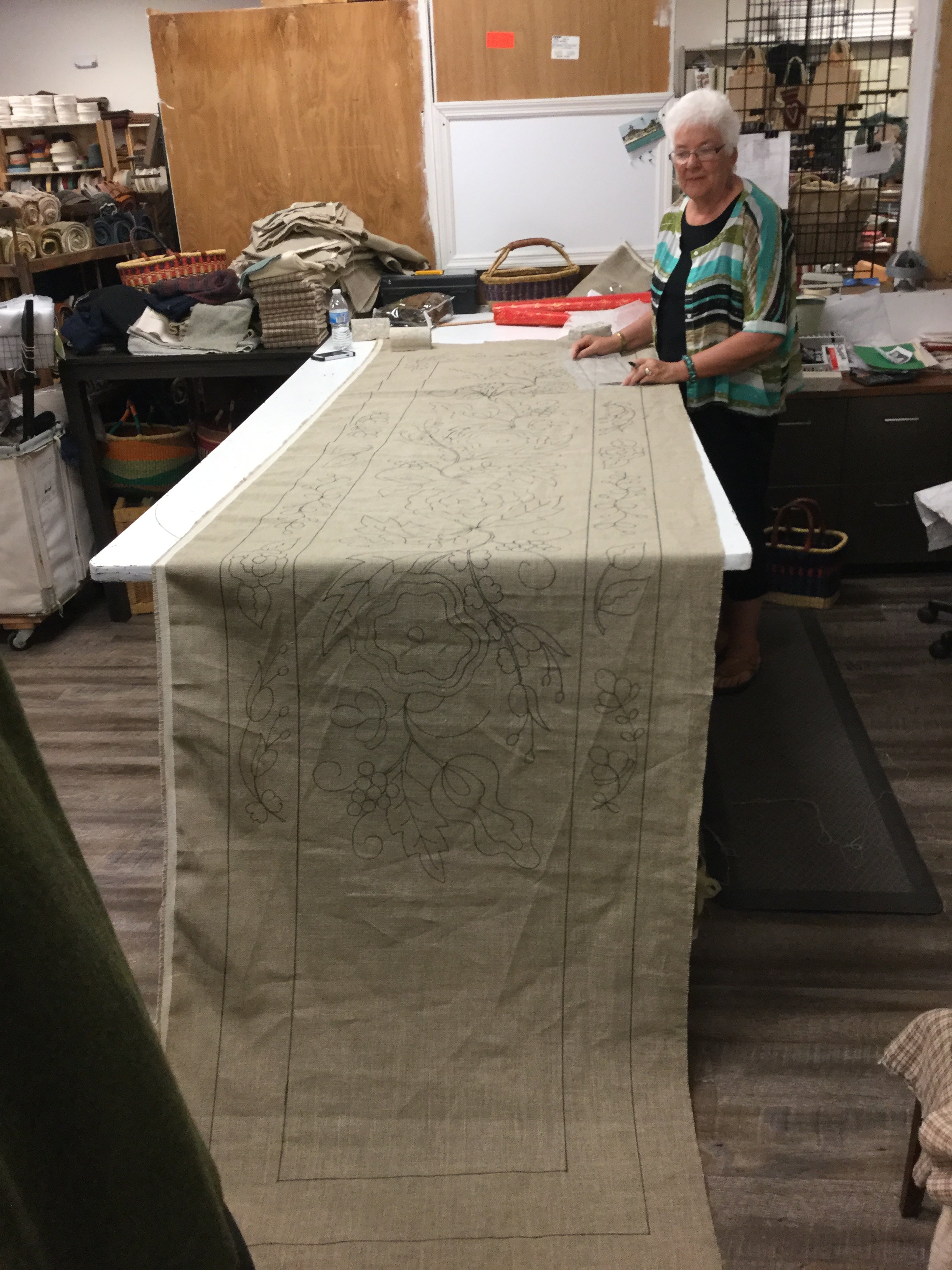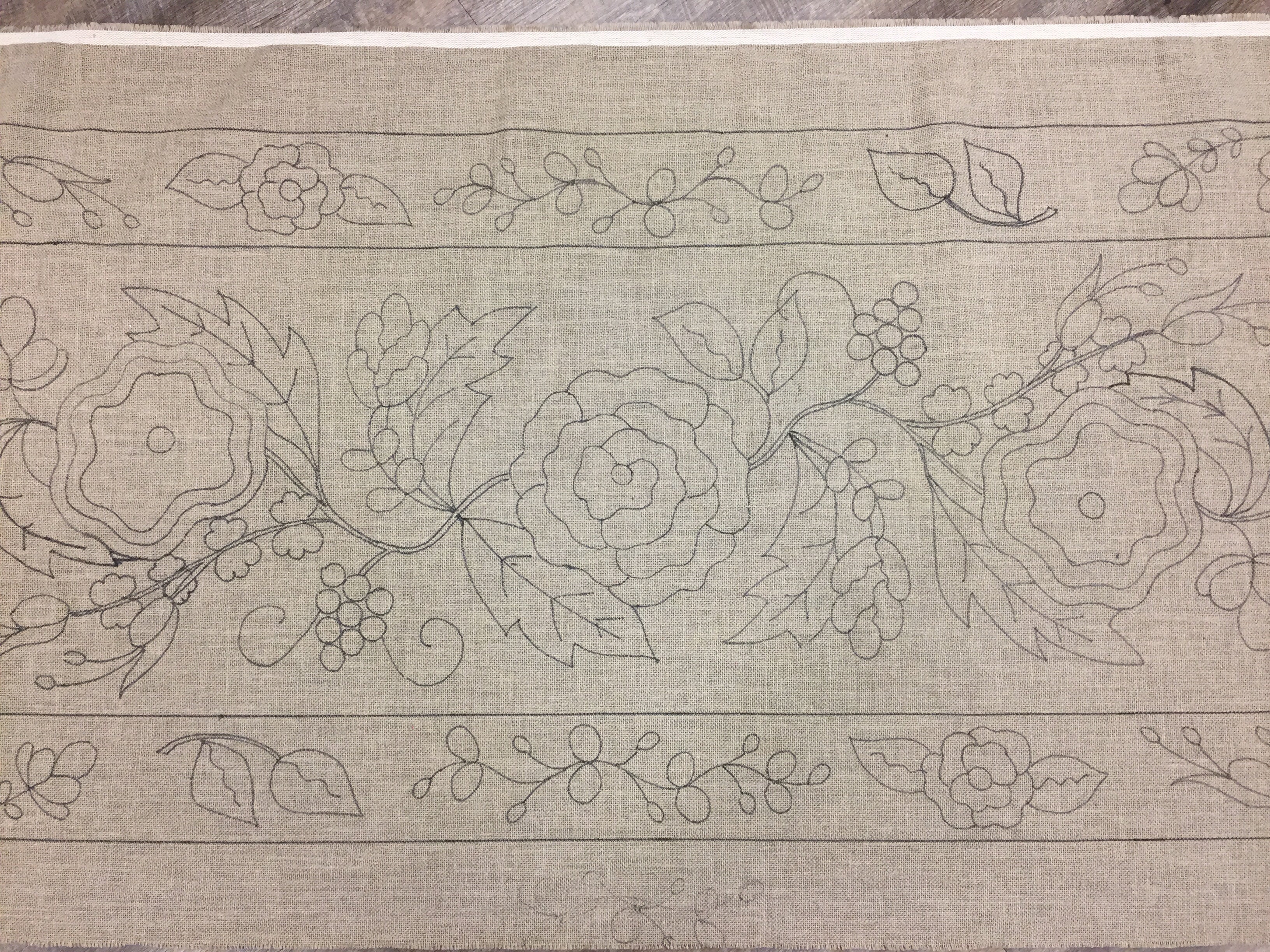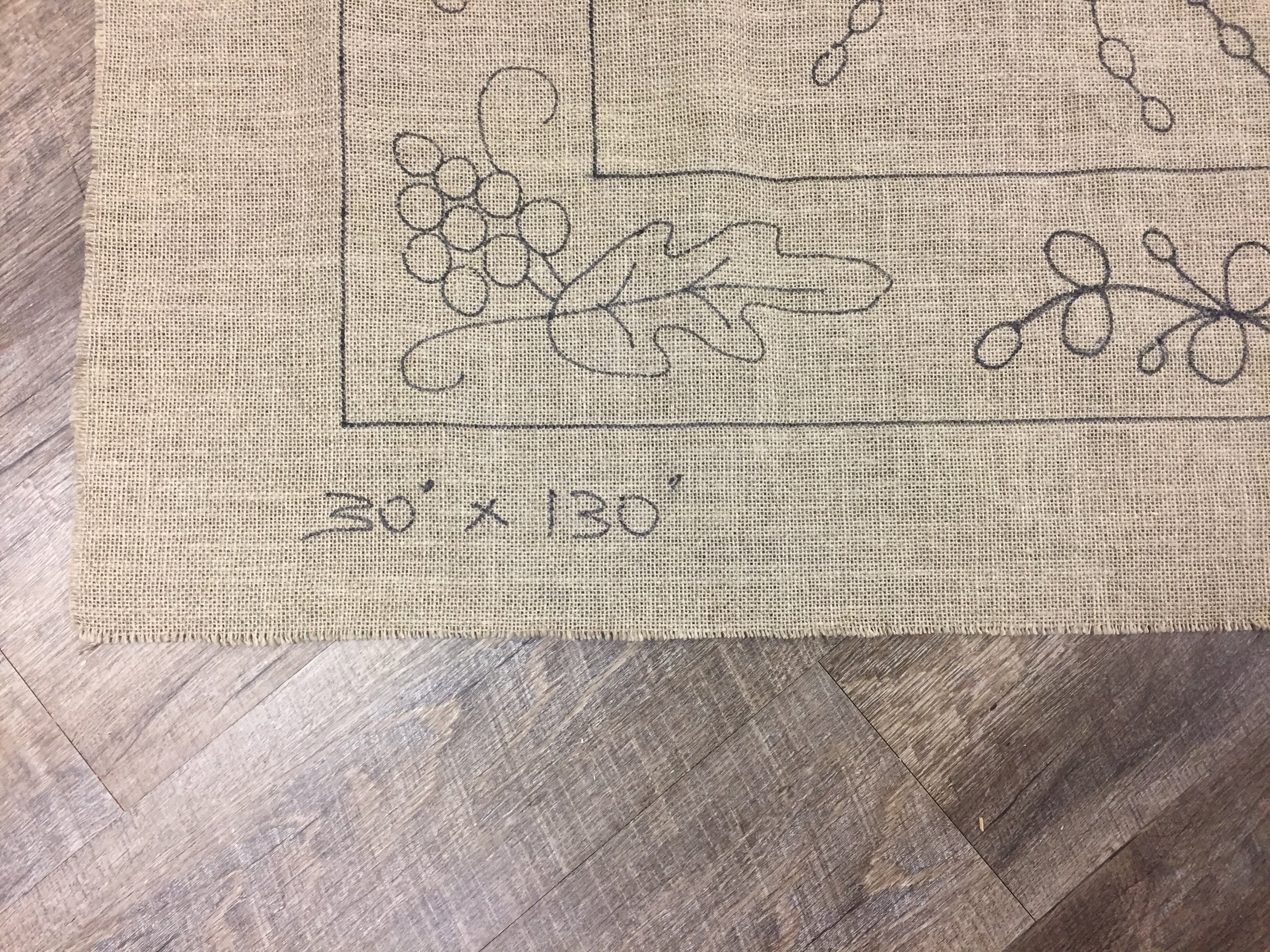 This is a BIG rug! At 30x130 it’s almost 11 feet long! The background alone will take 9 yards of fabric! That will do the center and the boarder background. While most of the rug can be hooked from your stash we recommend getting three or four different, very close related fabrics to mix for your background. Because of the time involved Hooking a larg Rug like this if you run out you might not be able to match it down the road. But if you mix wools at the start adding in a bit of another one is not so noticeable :) we are happy to help with the background wool. If you choose to order it with your pattern please call to discus your colors.