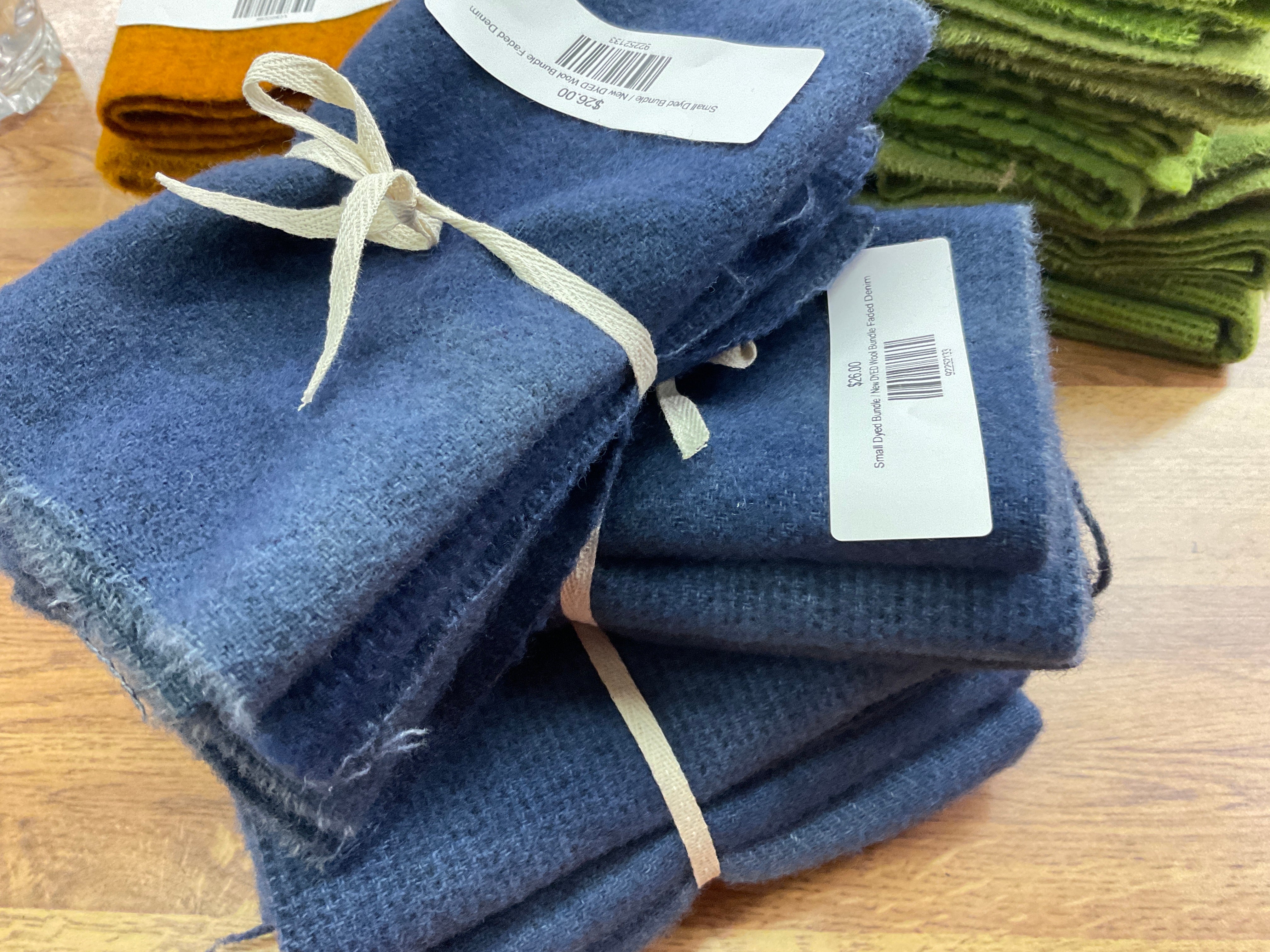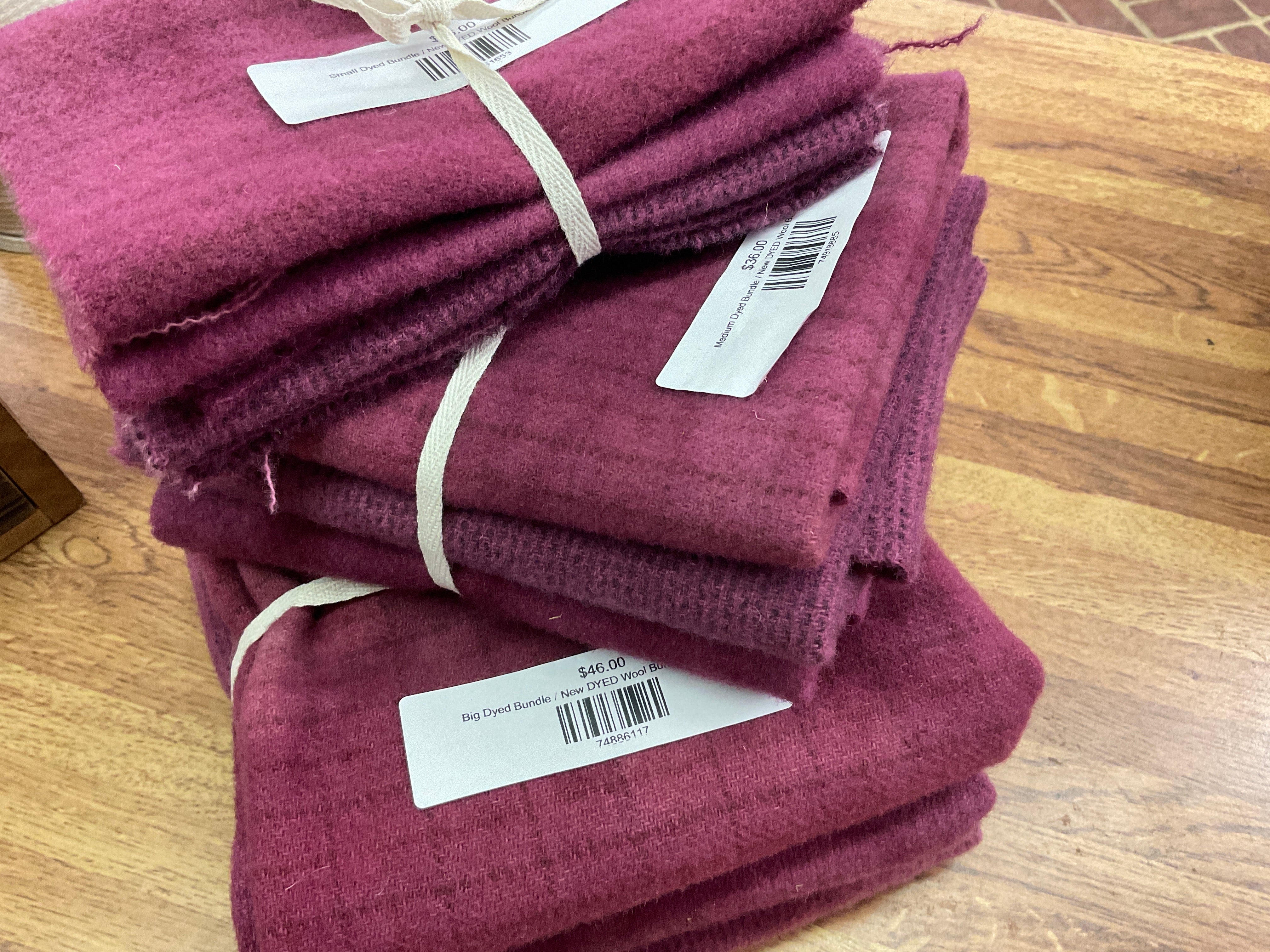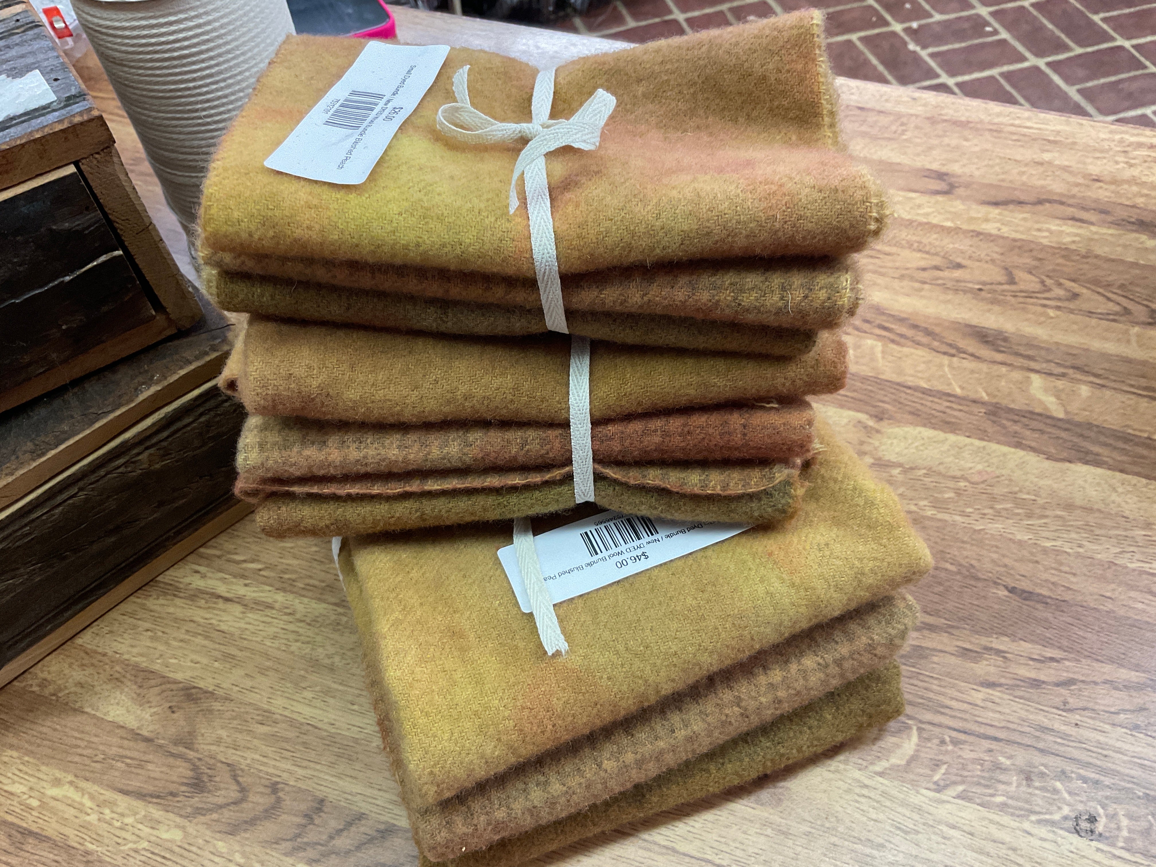 These bundles are all washed and either 3 fat quarters, 3 fat 1/8’s or 3 fat 1/16 of wool. They are great for applique projects and rug hookers to build a well-stocked stash or try a color combo! We have many ways to buy our wonderful wool. Small pieces or large we can fill your needs for rug hooking, quilting, appliqué or penny rug work. Our bundles are our most popular item for wool! Don't see what you need? Just ask! We probably have it!