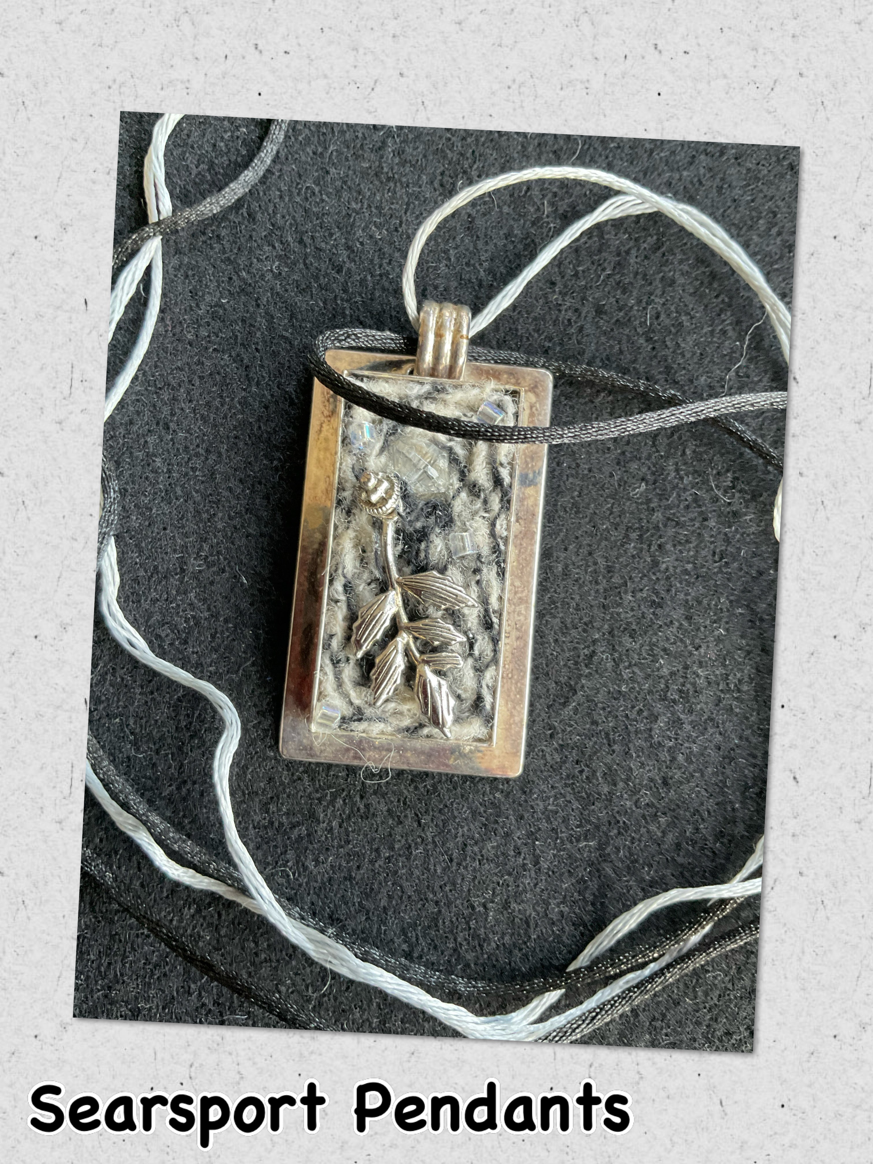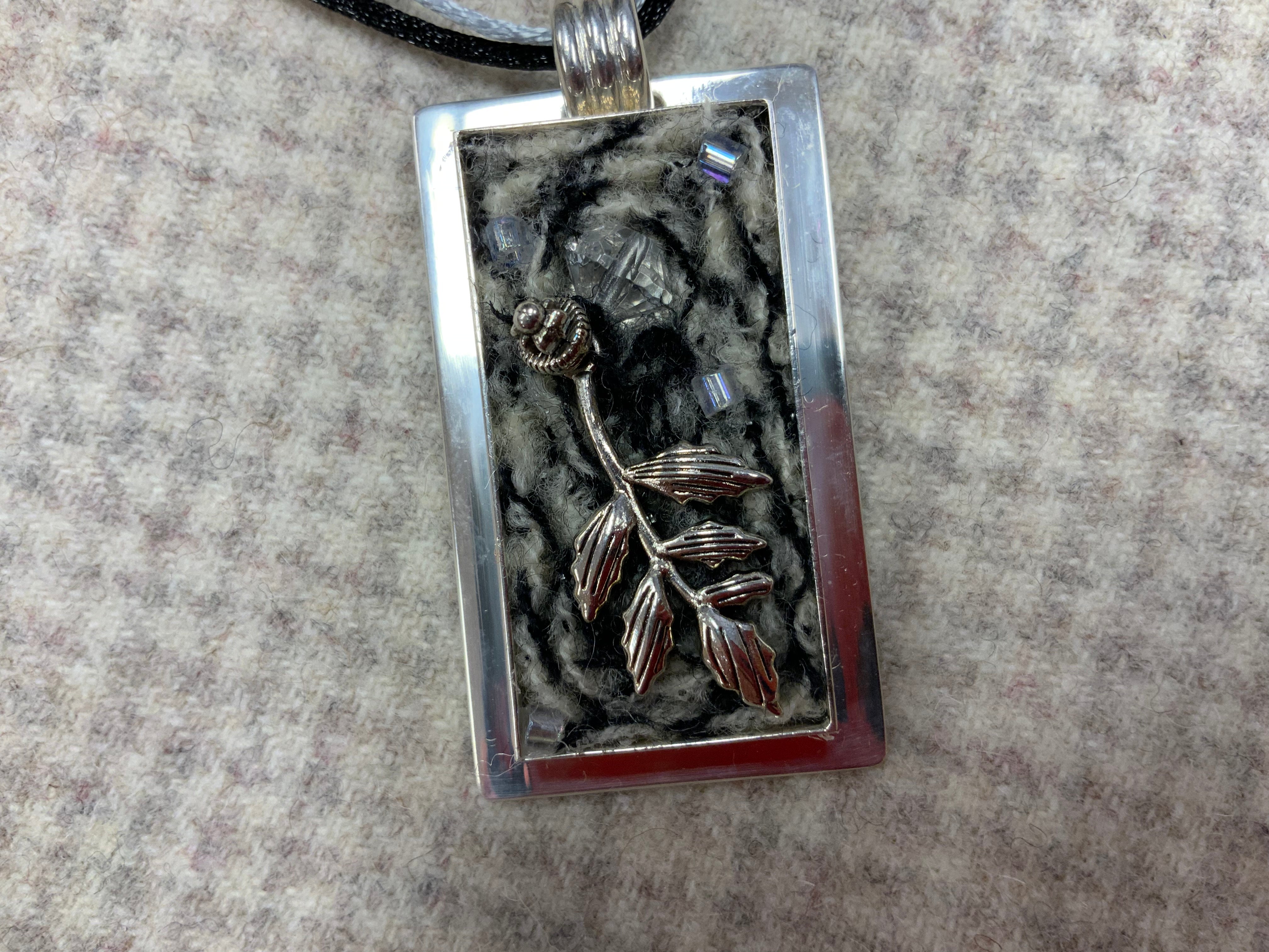 This pendent is fun! And again no two of these kits will ever be the same. We include instructions, pre cut wool in black and white, a polishing cloth, an assortment of beautiful glass beads, a leaf charm, 3- 1 yard threads in assorted sparkle and variegated thread to do your stitching. Some are six strand and I split those into 3 or 2 strands to stitch with. There will be plenty for you to choose from on your kit and your will have threads, embellishments and beads left over. You will need scissors, super tacky glue and a necklace to hang it from.