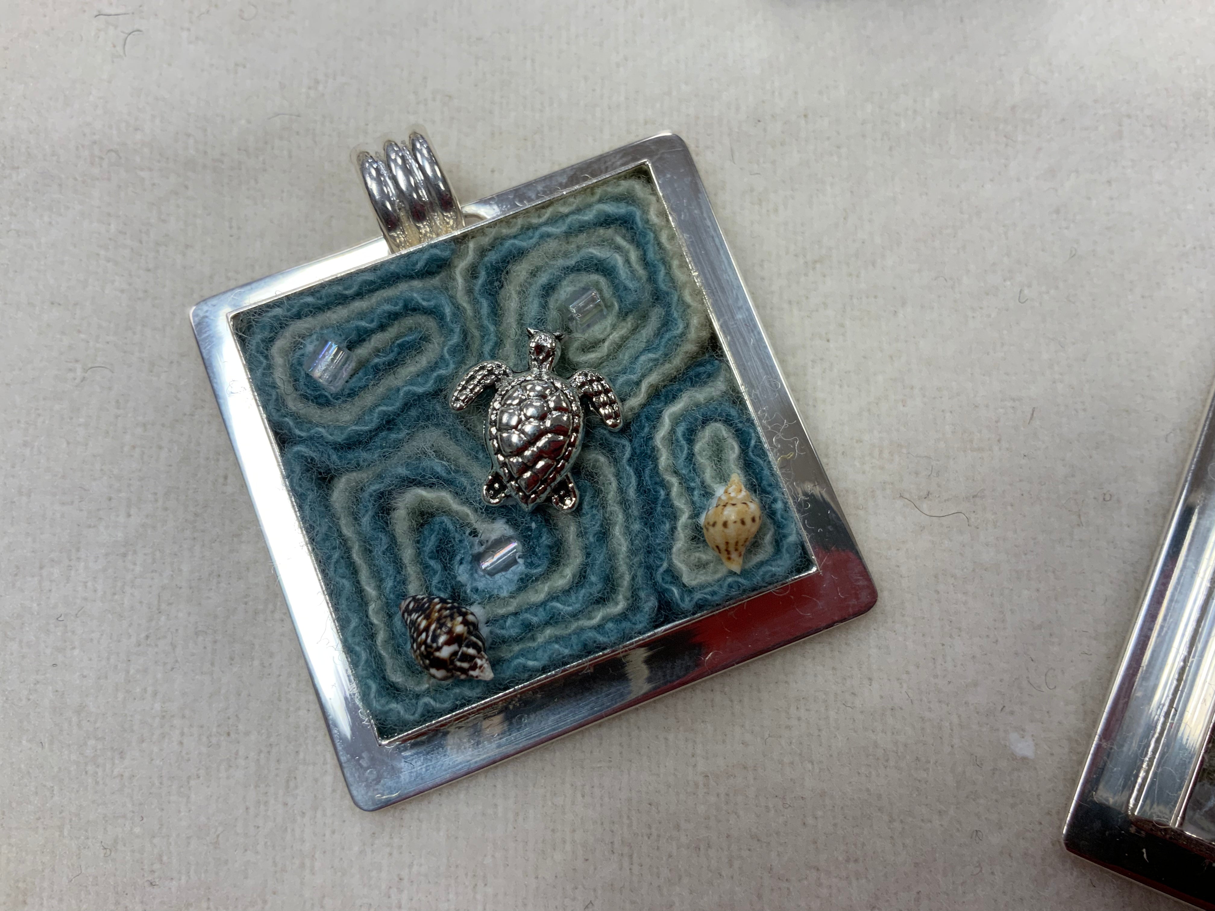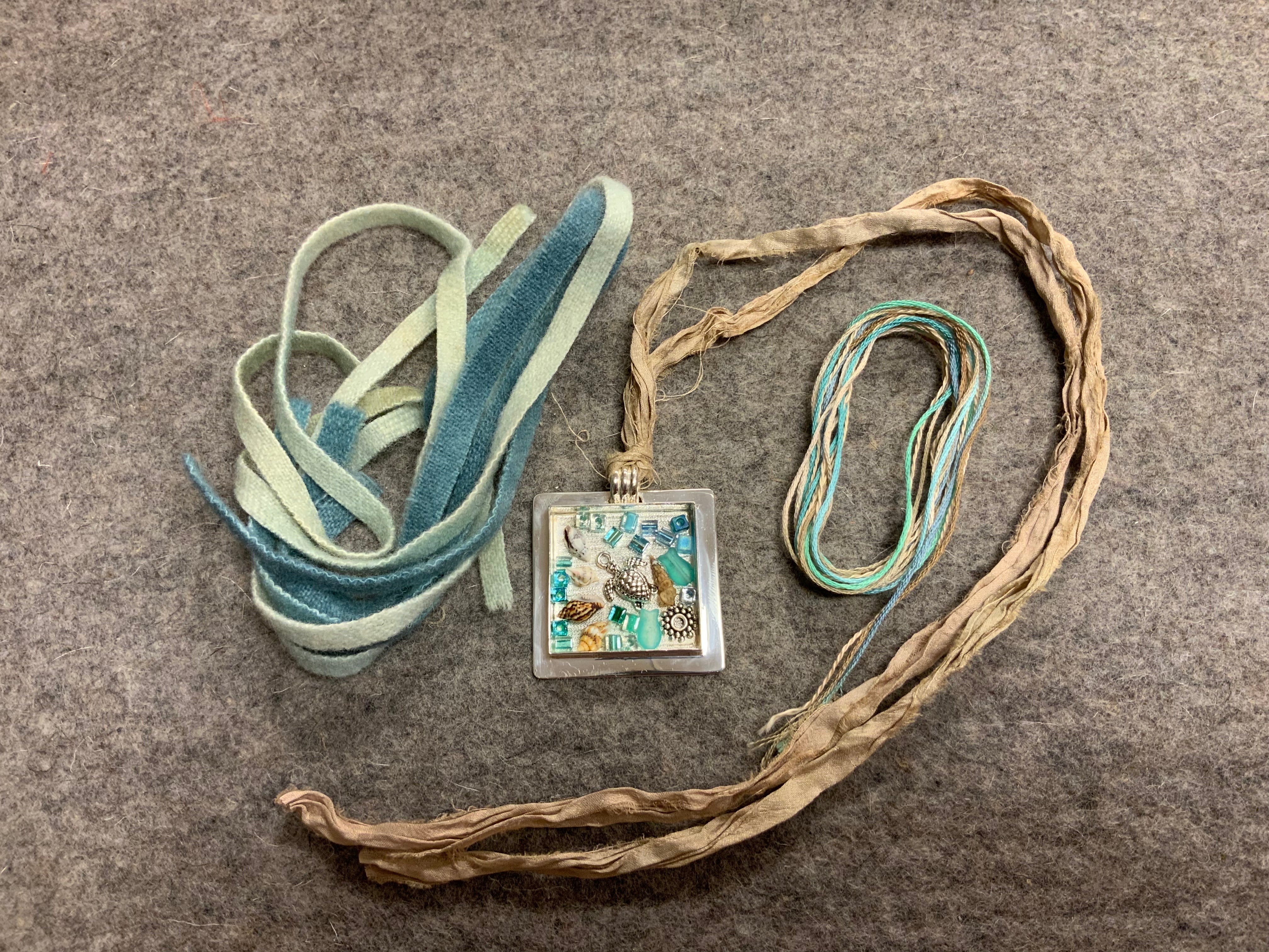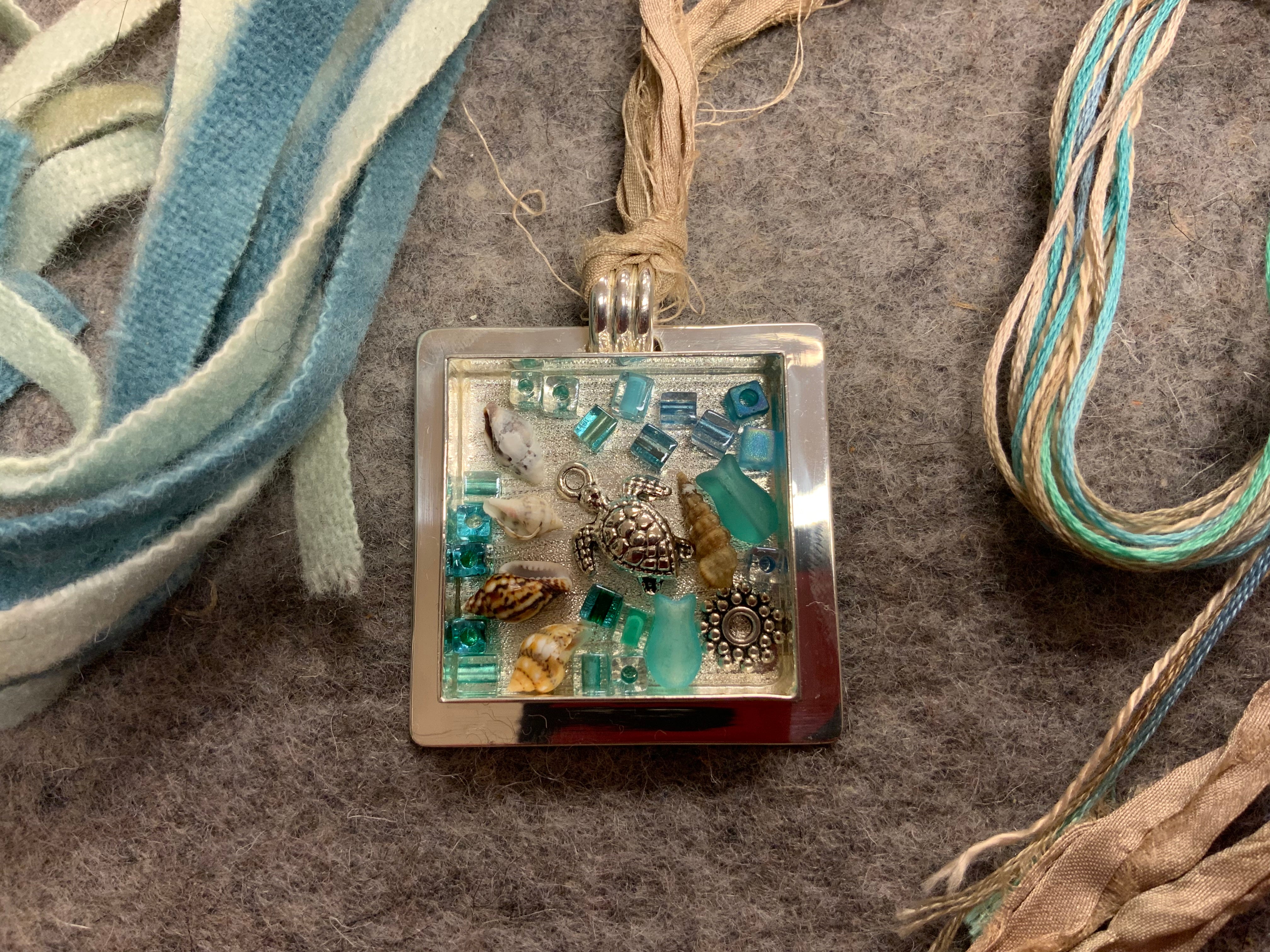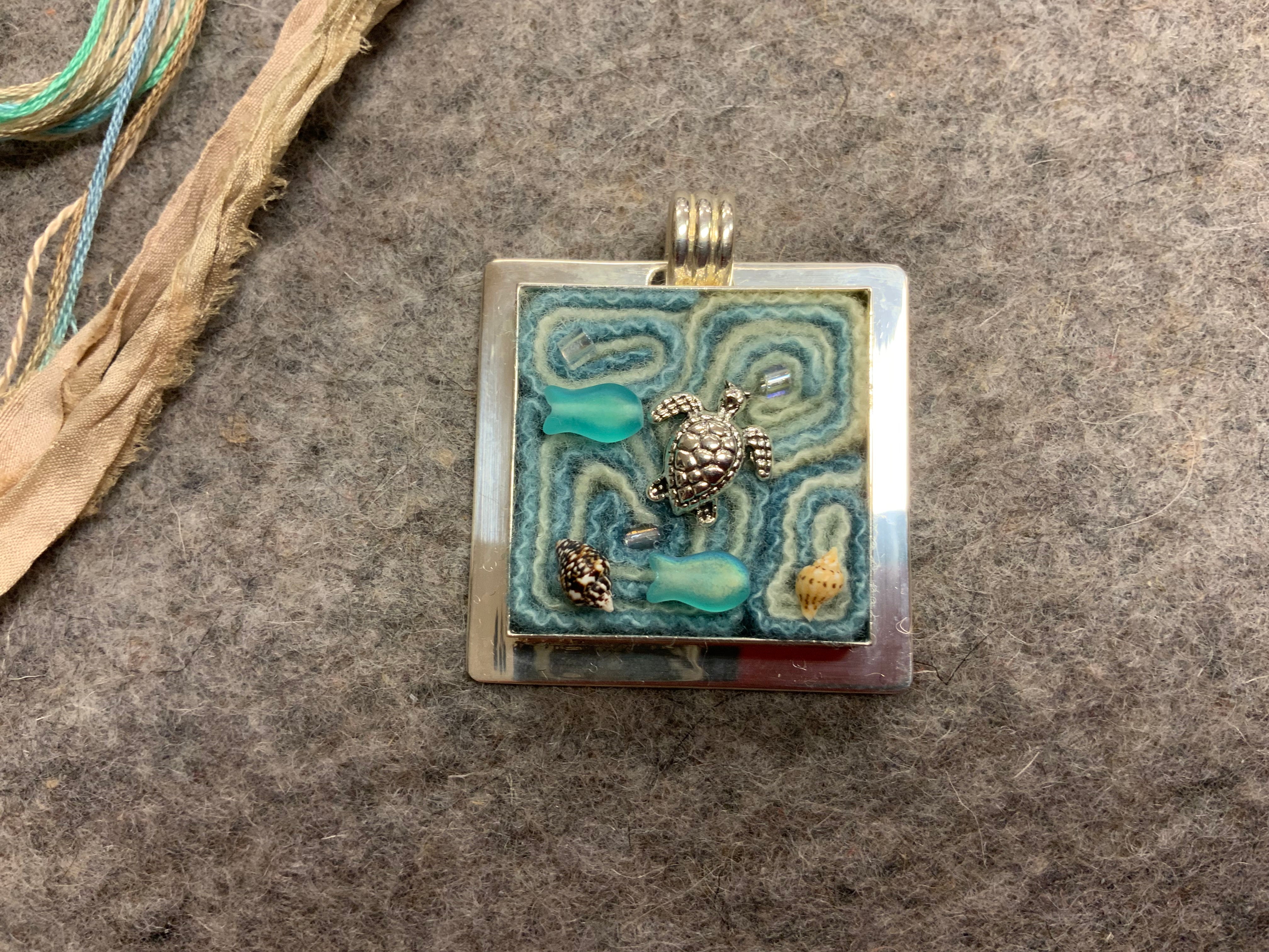 Just like the turtles in the sea, no two of these kits will ever be the same! We include instructions, pre cut wool in ocean colors, an assortment of beautiful glass beads, shells, a silver finished sea turtle charm, a polishing cloth, rat tail for hanging it from, 3- 1 yard threads in assorted sparkle and variegated thread to do your stitching. Some are six strand and I split those into 3 or 2 strands to stitch with. There will be plenty for you to choose from on your kit and your will have threads, embellishments and beads left over. You will need scissors, super tacky glue.