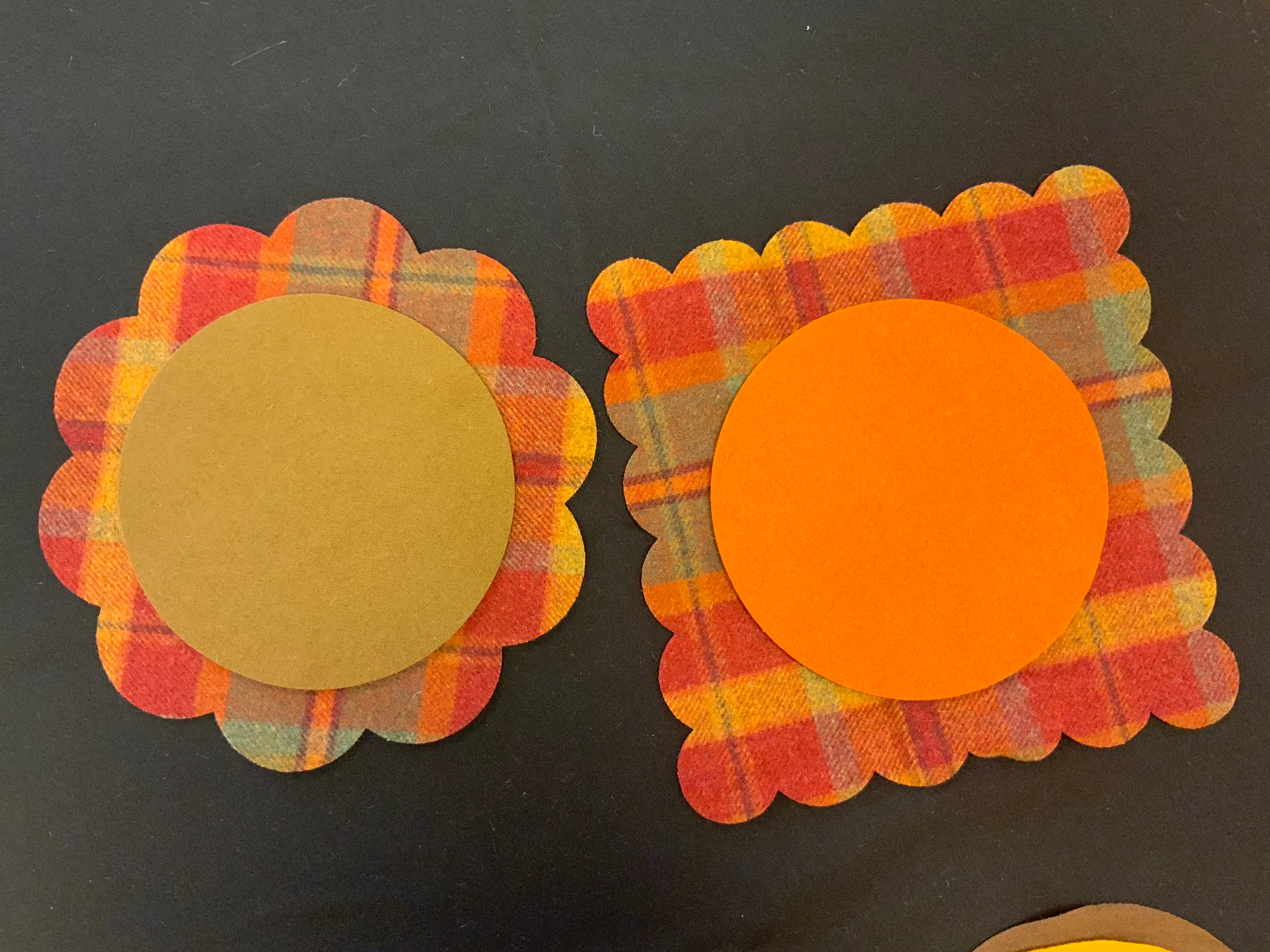 We are now offering our pre cut scalloped bases in a beautiful fall plaid.This is for our appliqué round scalloped and square scalloped and they are 11.5 inches on the plaid base and the optional solid insert is 8 inches.
