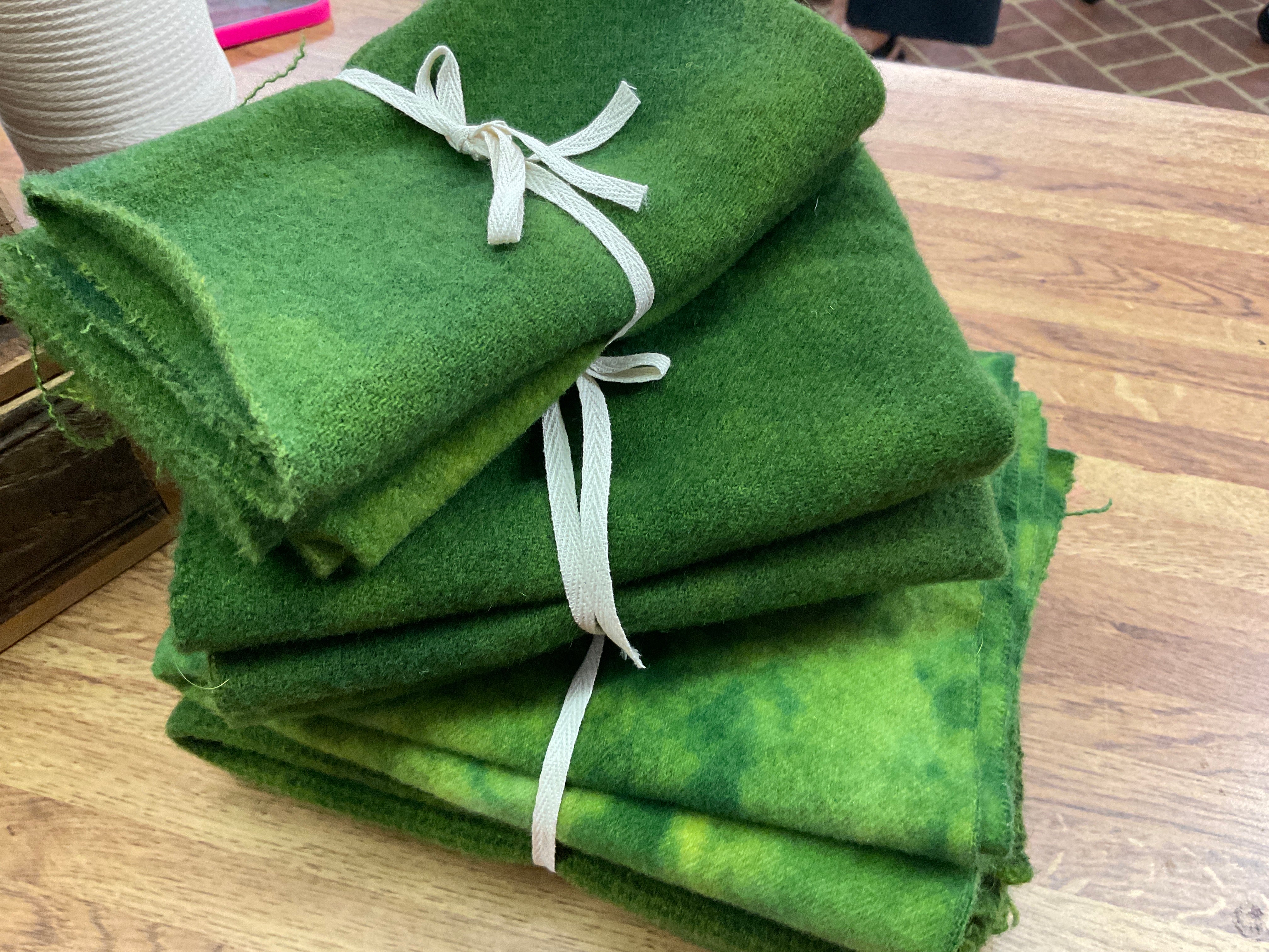 These bundles are fat, warm, 100% wool, washed and fulled and ready to create with! Perfect for any rug hooking, appliqué, stitching or any kind of sewing, that you want to use the very best wool, this is it! We have grouped three of our top selling textures by color, washed them to full and soften them, then into the dryer so they are ready for you to create with!