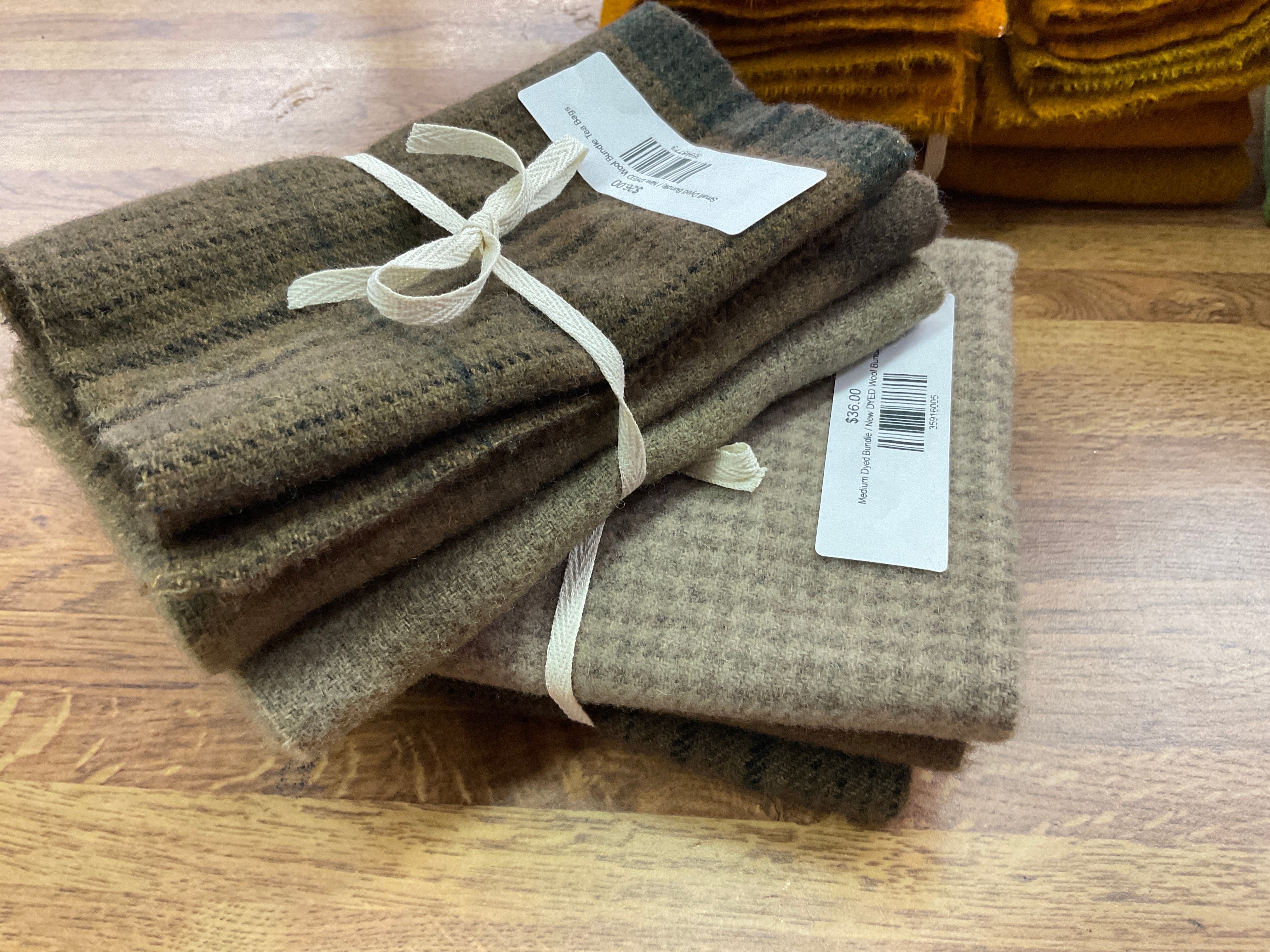 These bundles are fat, warm, 100% wool, washed and fulled and ready to create with! Perfect for any rug hooking, appliqué, stitching or any kind of sewing, that you want to use the very best wool, this is it! We have grouped three of our top selling textures by color, washed them to full and soften them, then into the dryer so they are ready for you to create with!