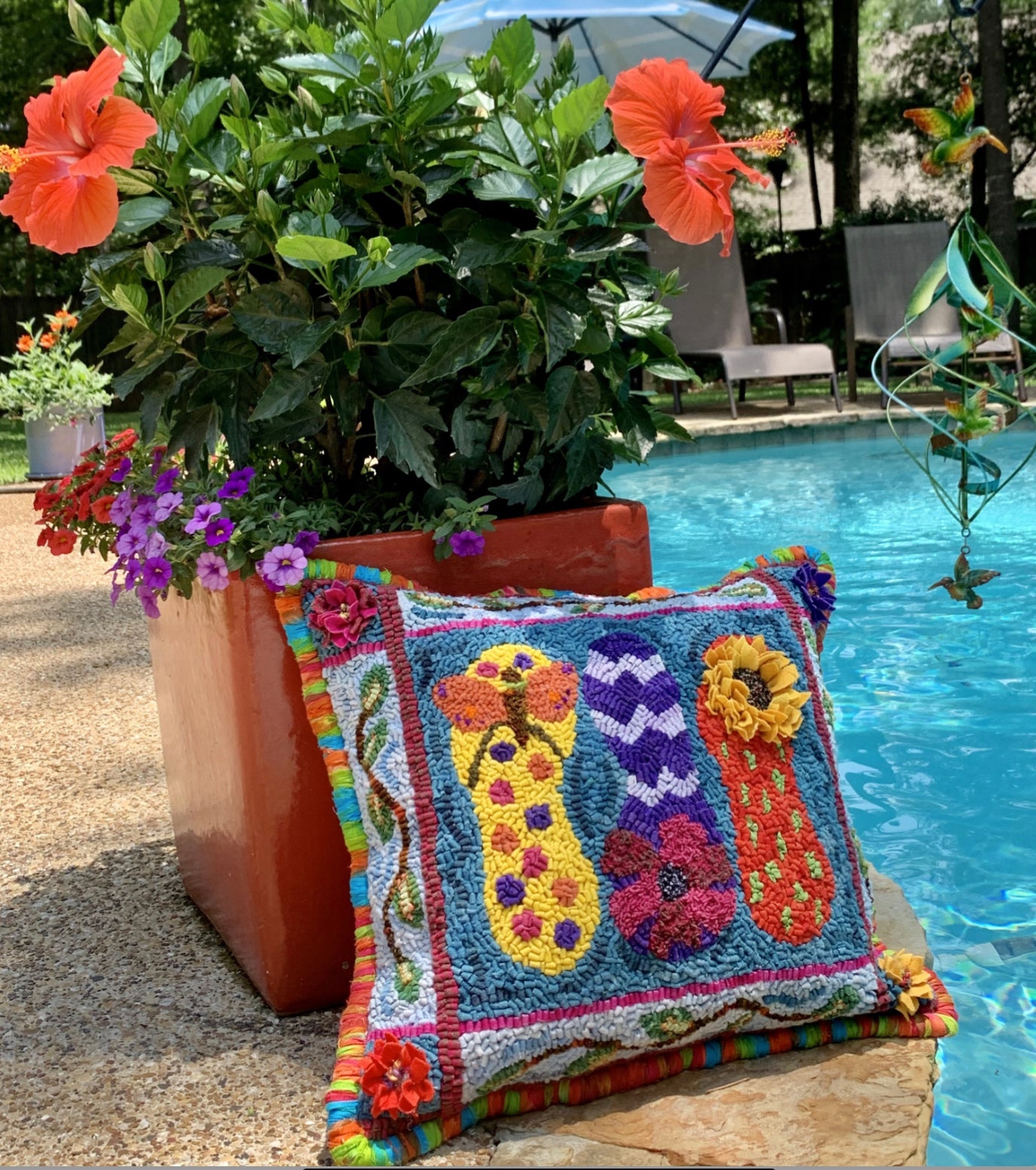 Flip flops! It’s a fun, scrappy small rug or big pillow! 18x20 hand drawn on linen. Thank you Linda S for the cute sample! Pattern only. Thank you Kerry C for the cute pool side pillow shot!