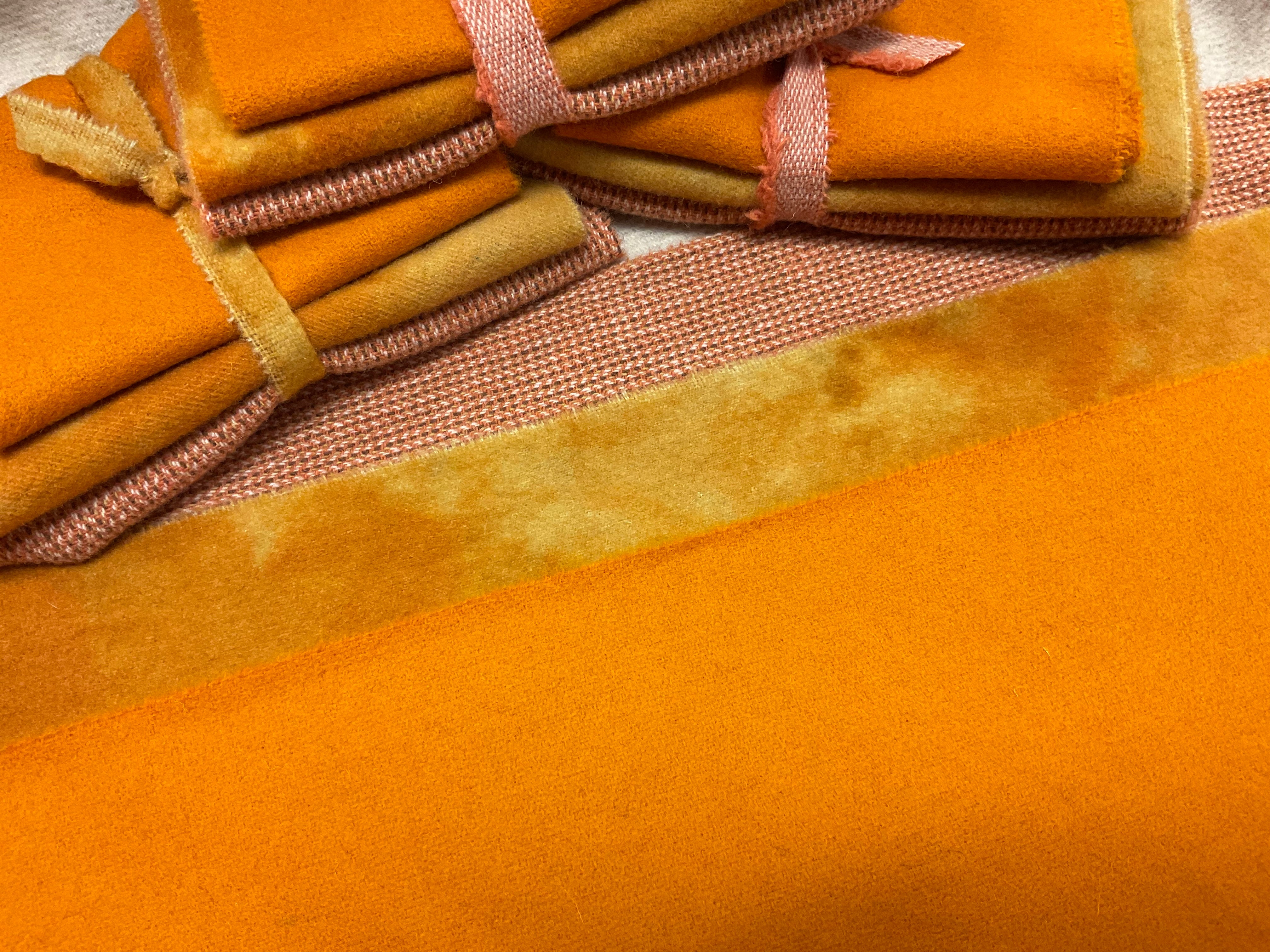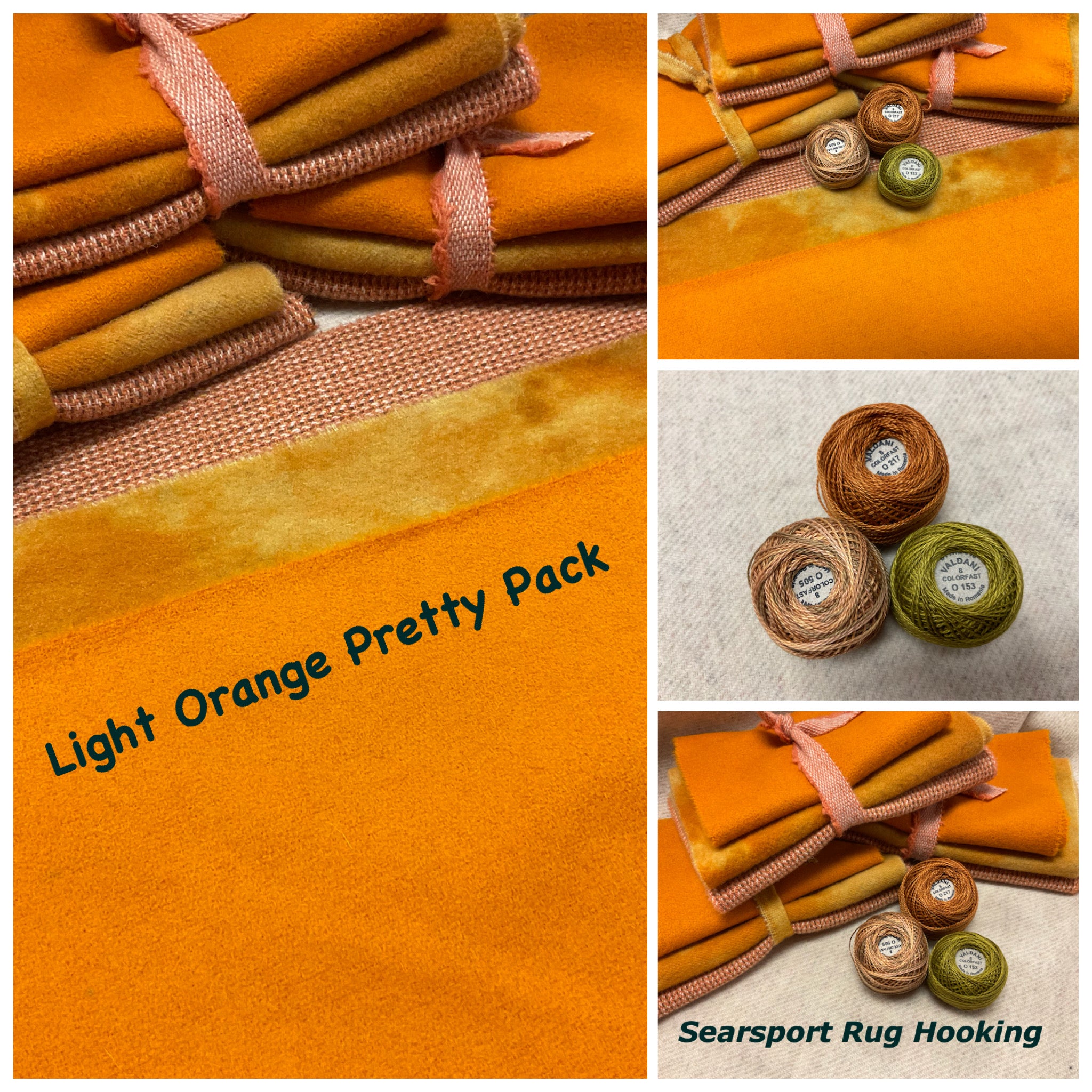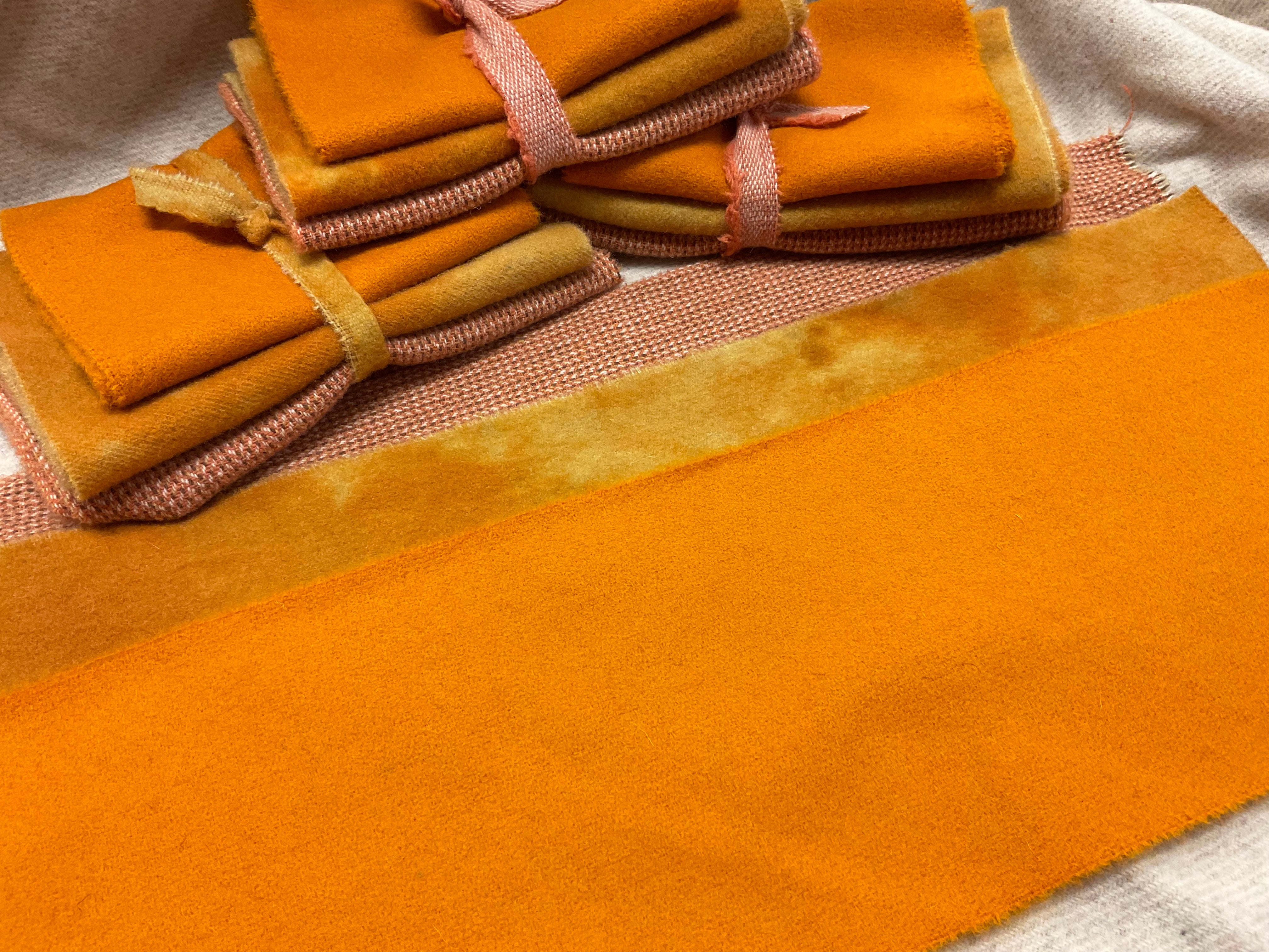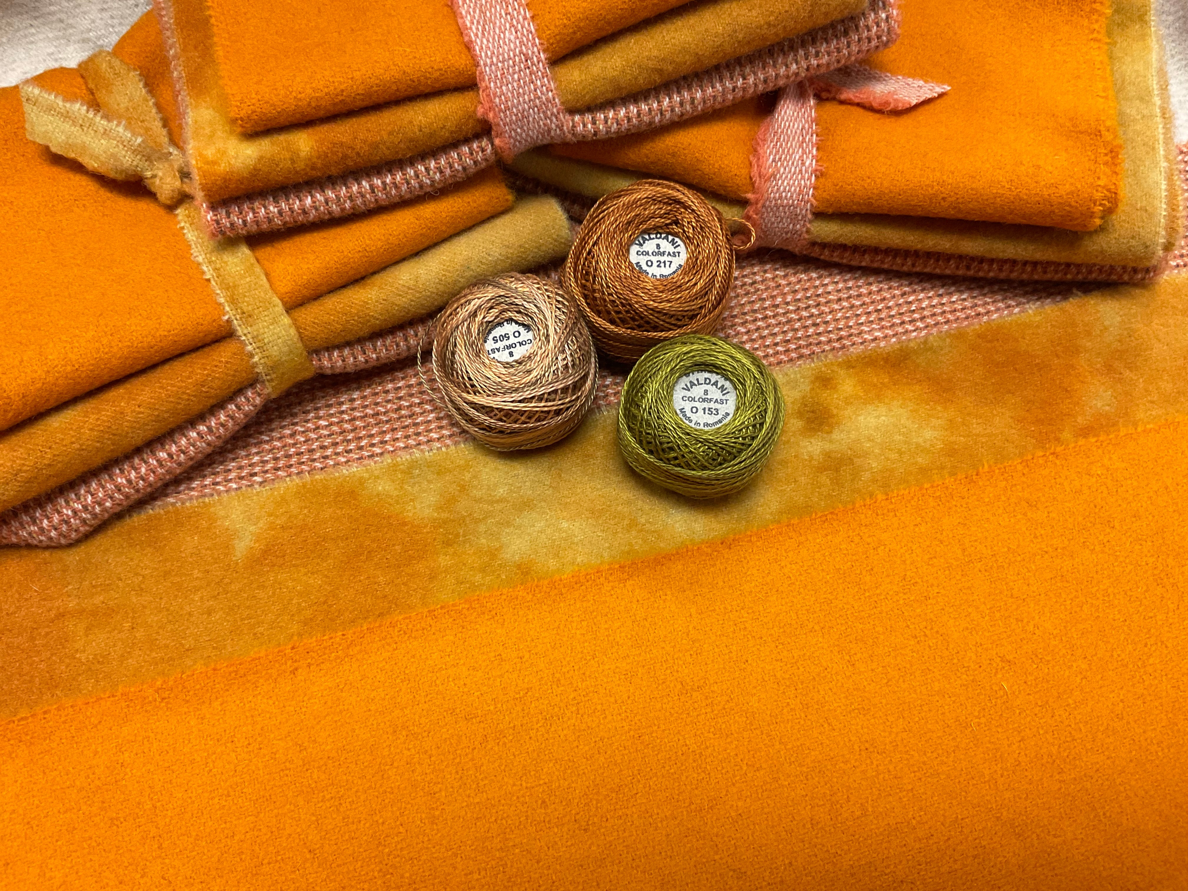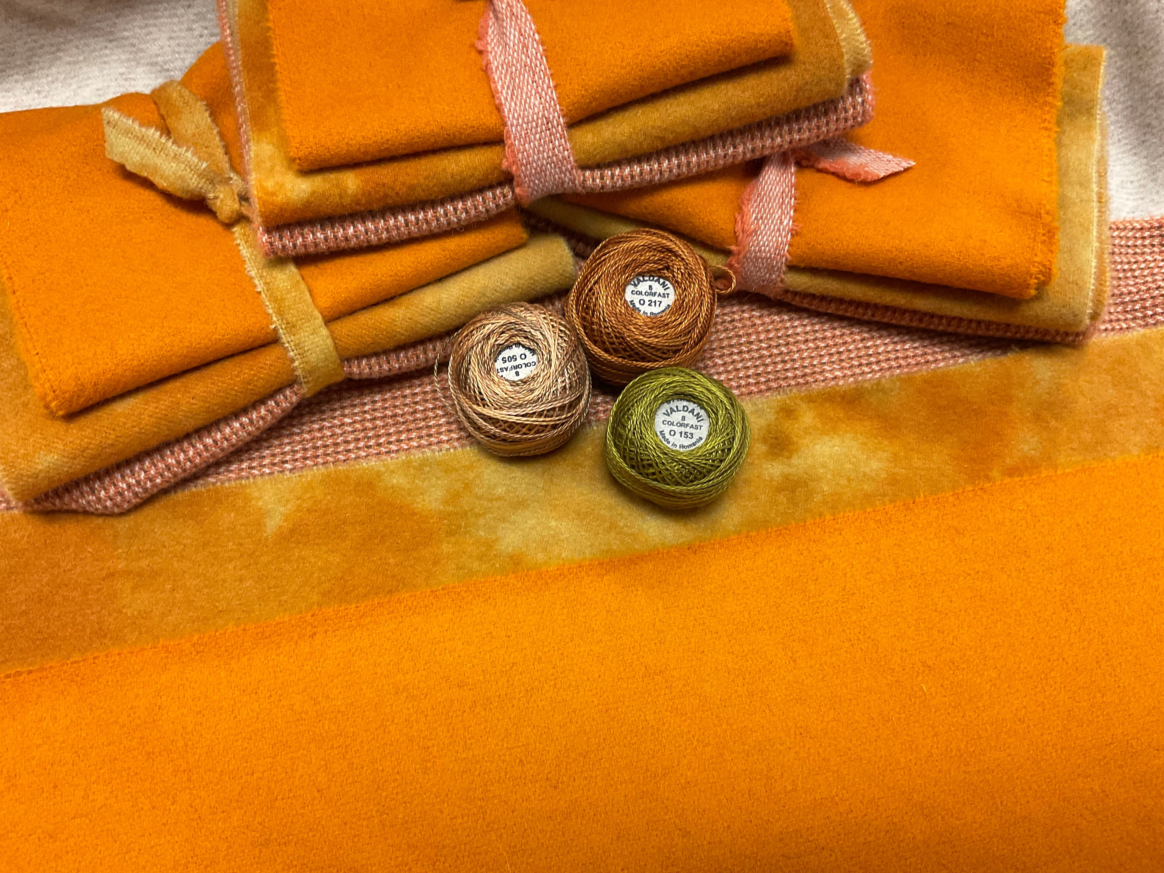 Our newest Bundle of washed wools ready to work with! These are fat 1/16 of a washed as is wool 7.5x17, an over dyed wool roughly 7.5x17 and a solid 5.5x17 from the Rebekah Smith wools. We have picked 3 coordinating valdani threads in #8 to go with your stitching if you like.