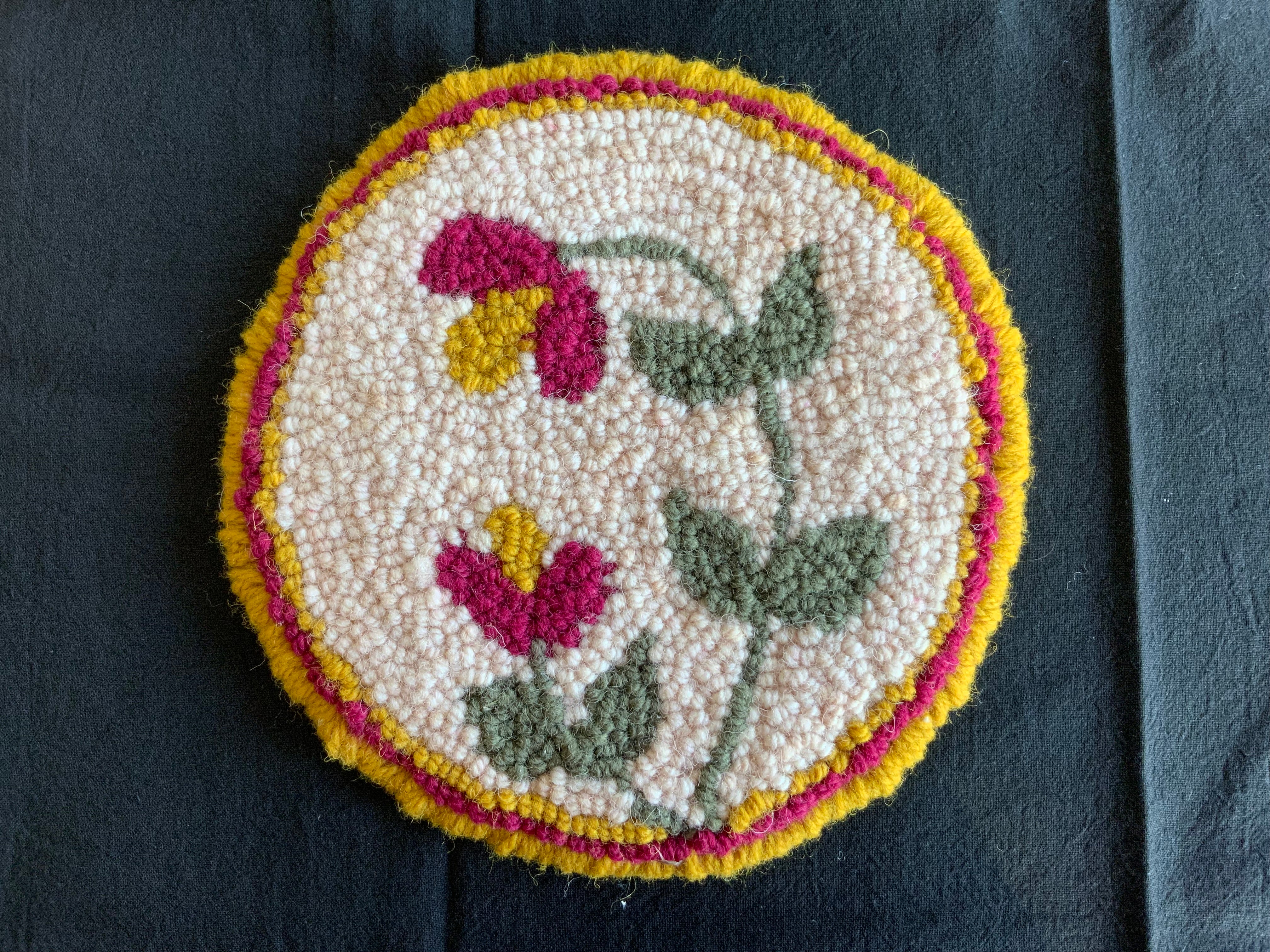 These sweet beginner kits are perfect to lean how to use the Oxford punch needle. It is a hand drawn pattern in a 7 inch circle on our monks cloth and you can order just the pattern to use your own yarns or wool strips or order the full kit with the yarn.