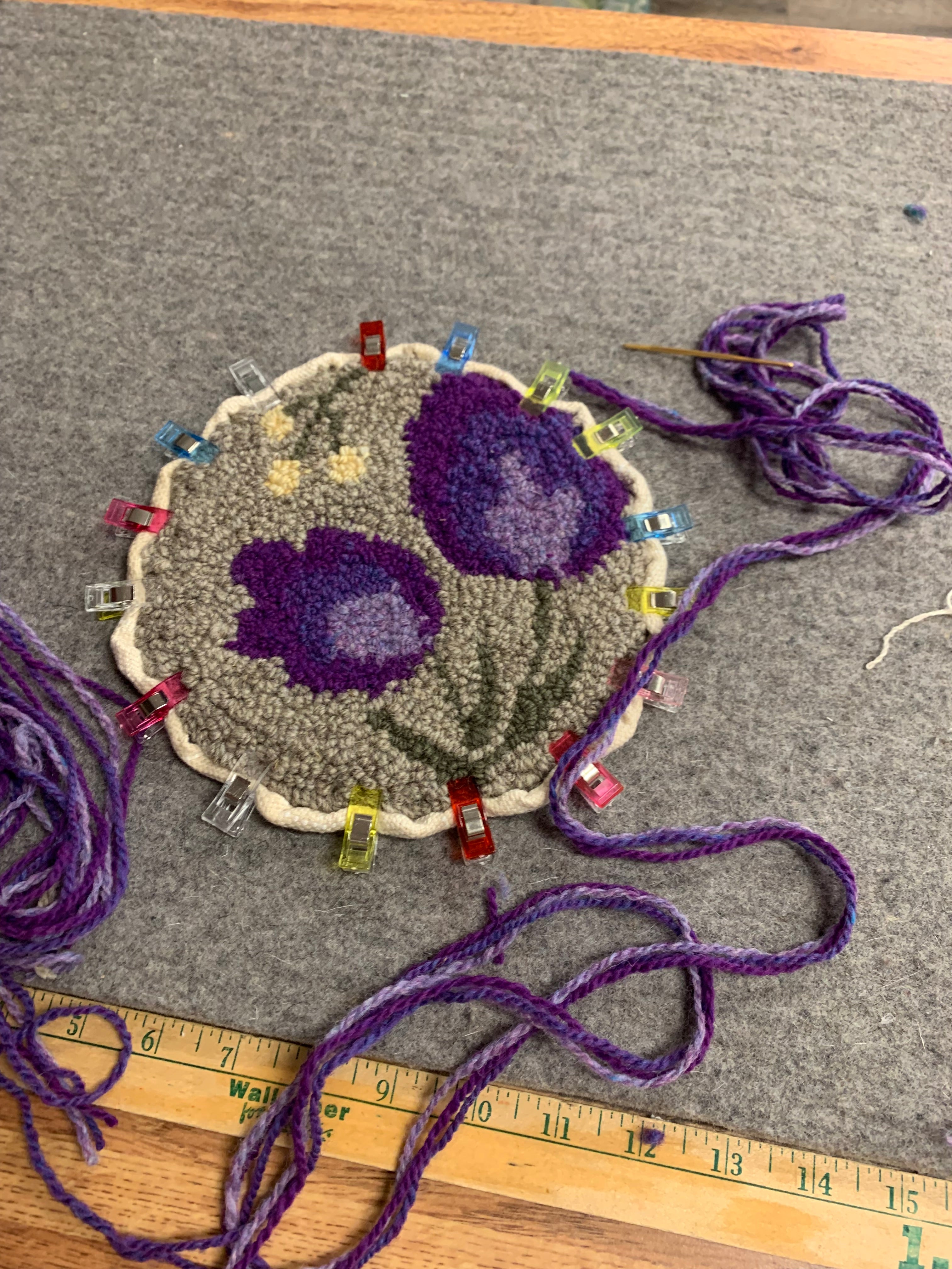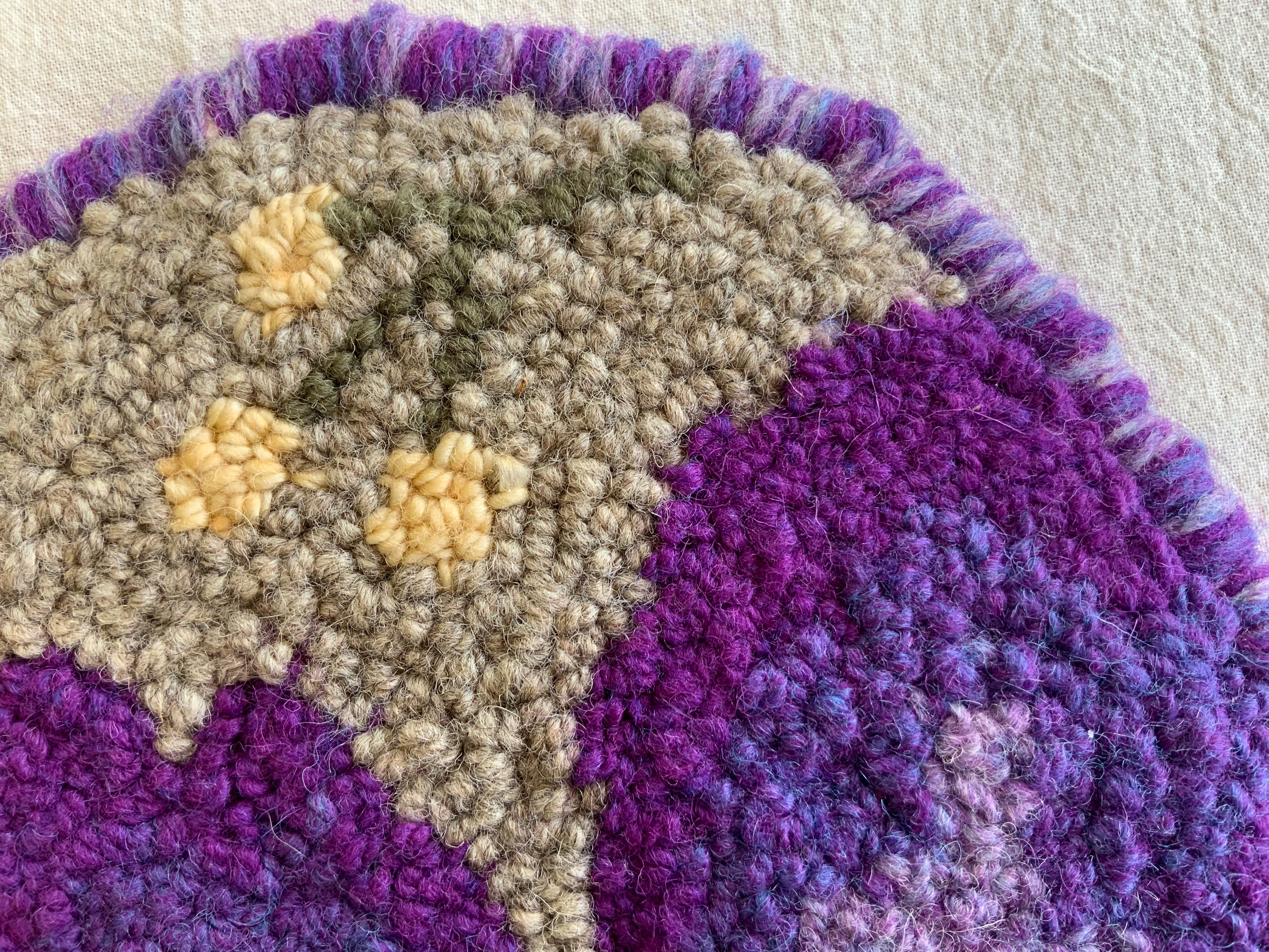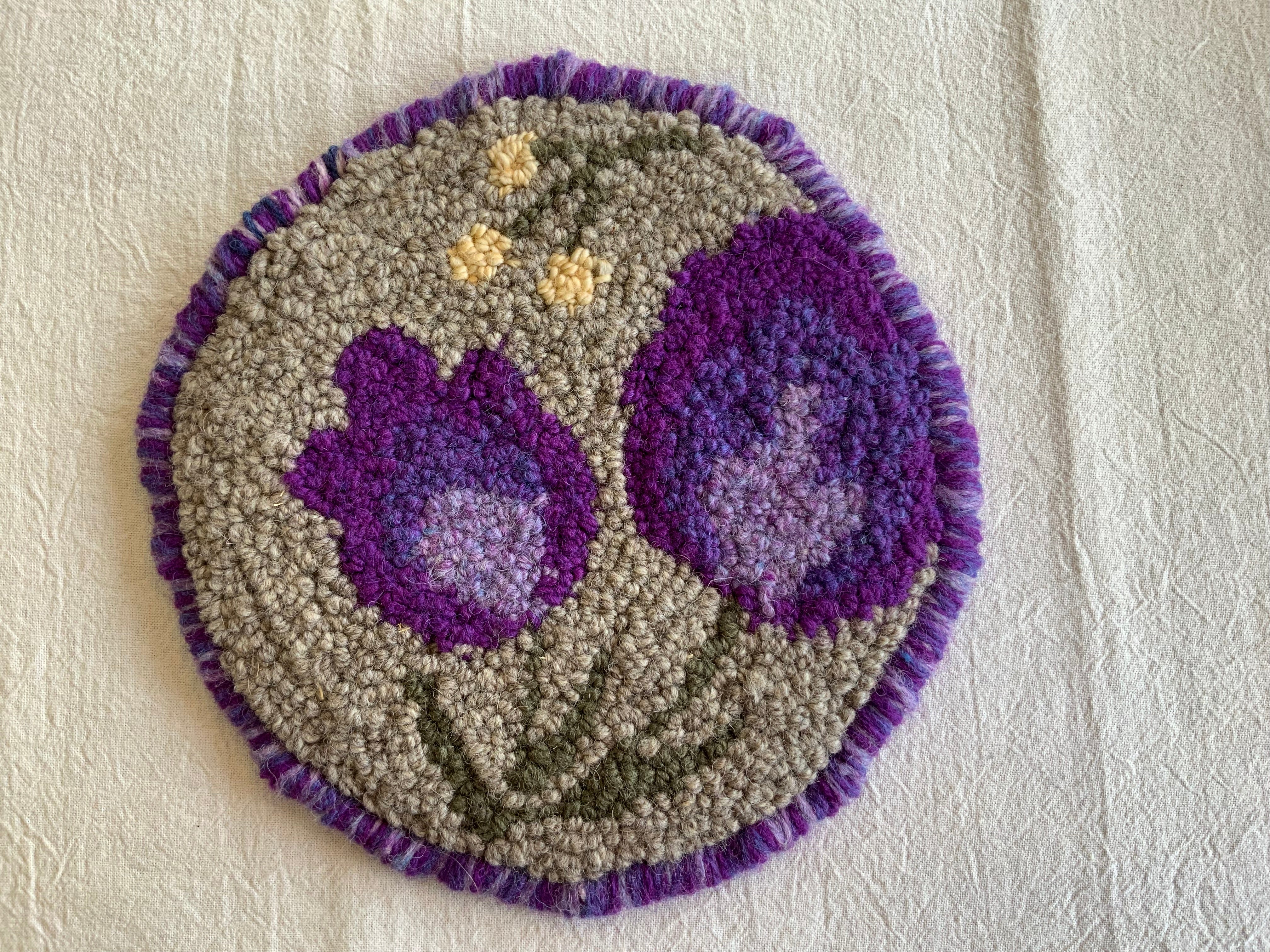 These sweet beginner kits are perfect to learn how to use the Oxford punch needle. It is a hand drawn pattern in a 7 inch circle on our monks cloth and you can order just the pattern to use your own yarns or wool strips or order the full kit with the yarns