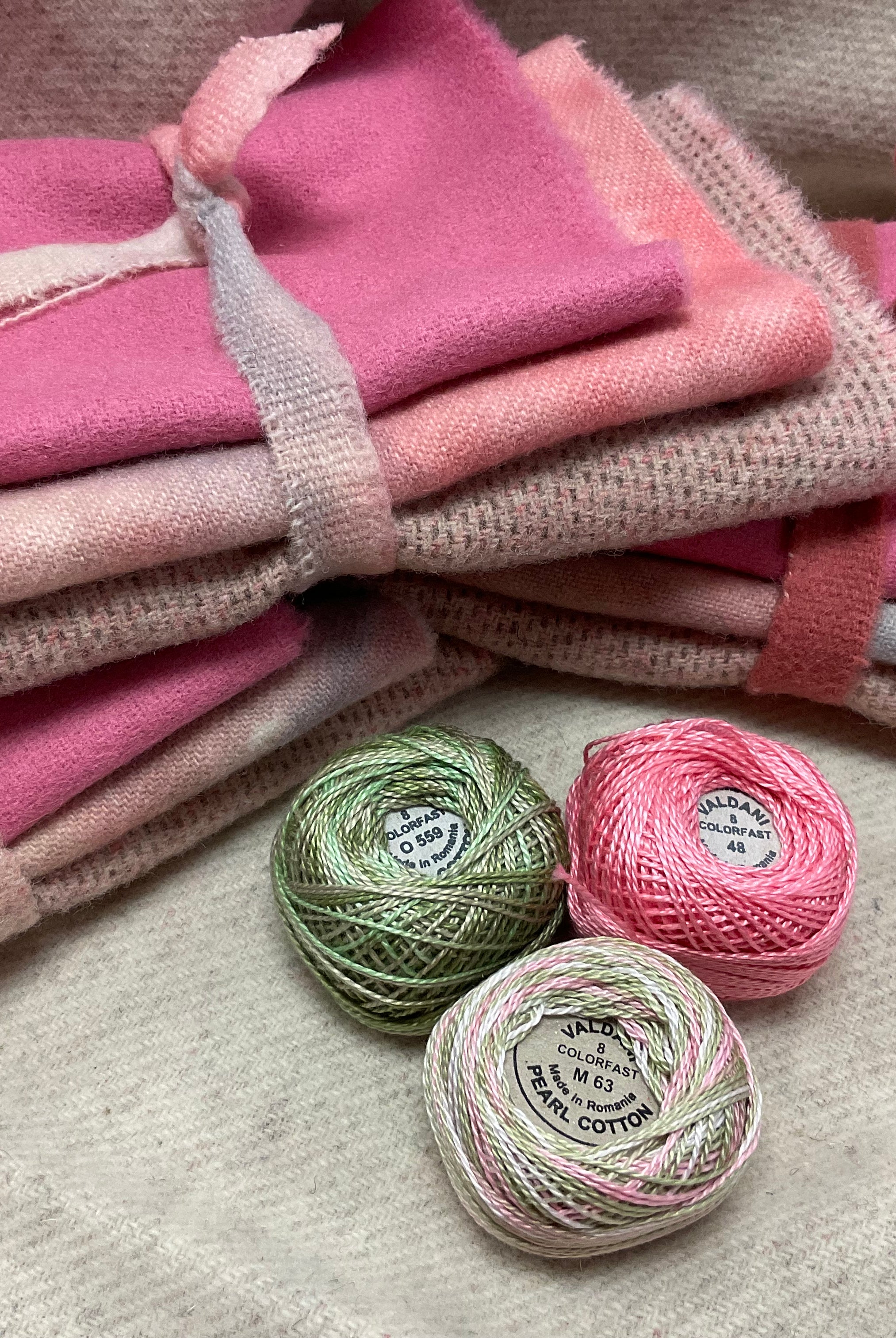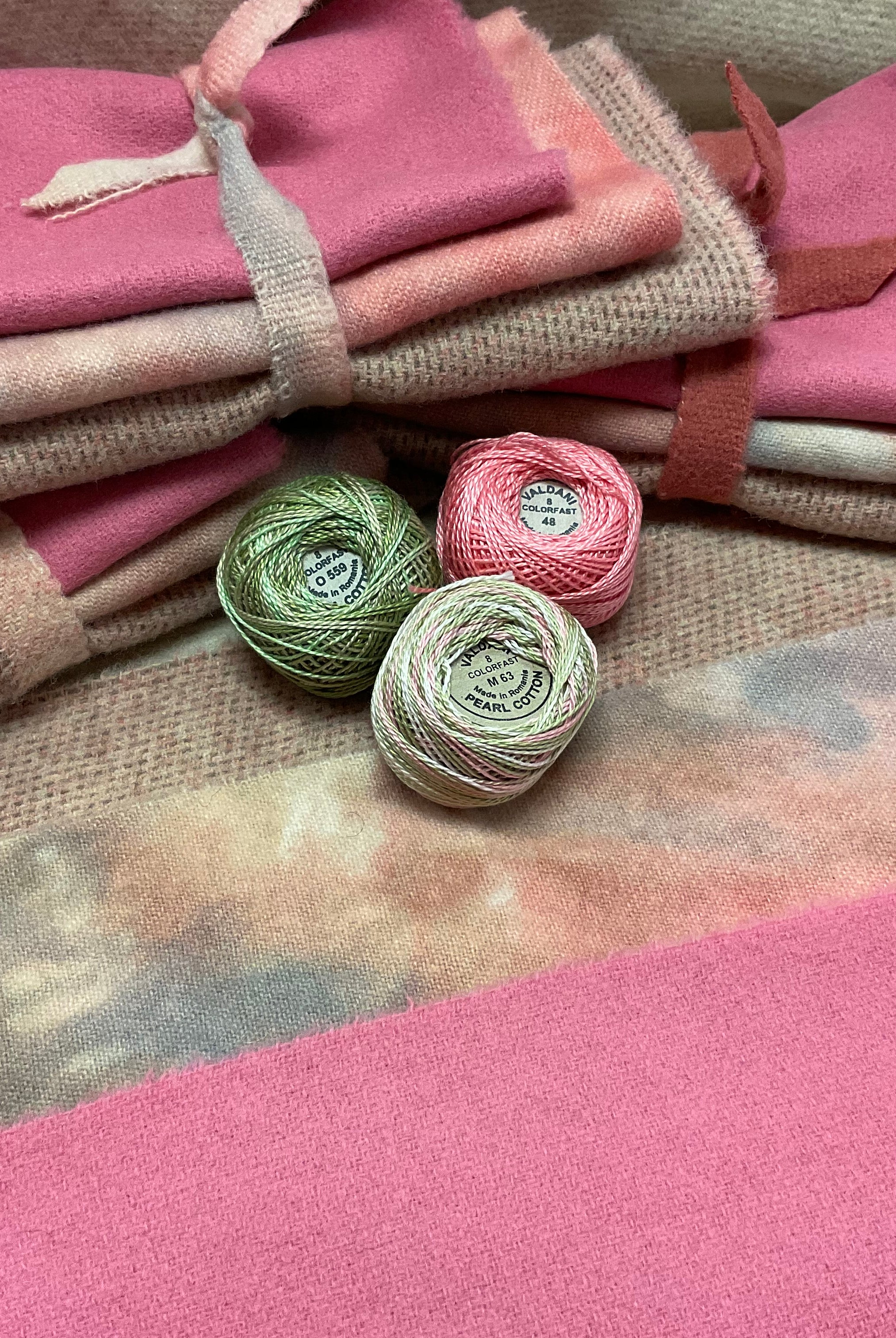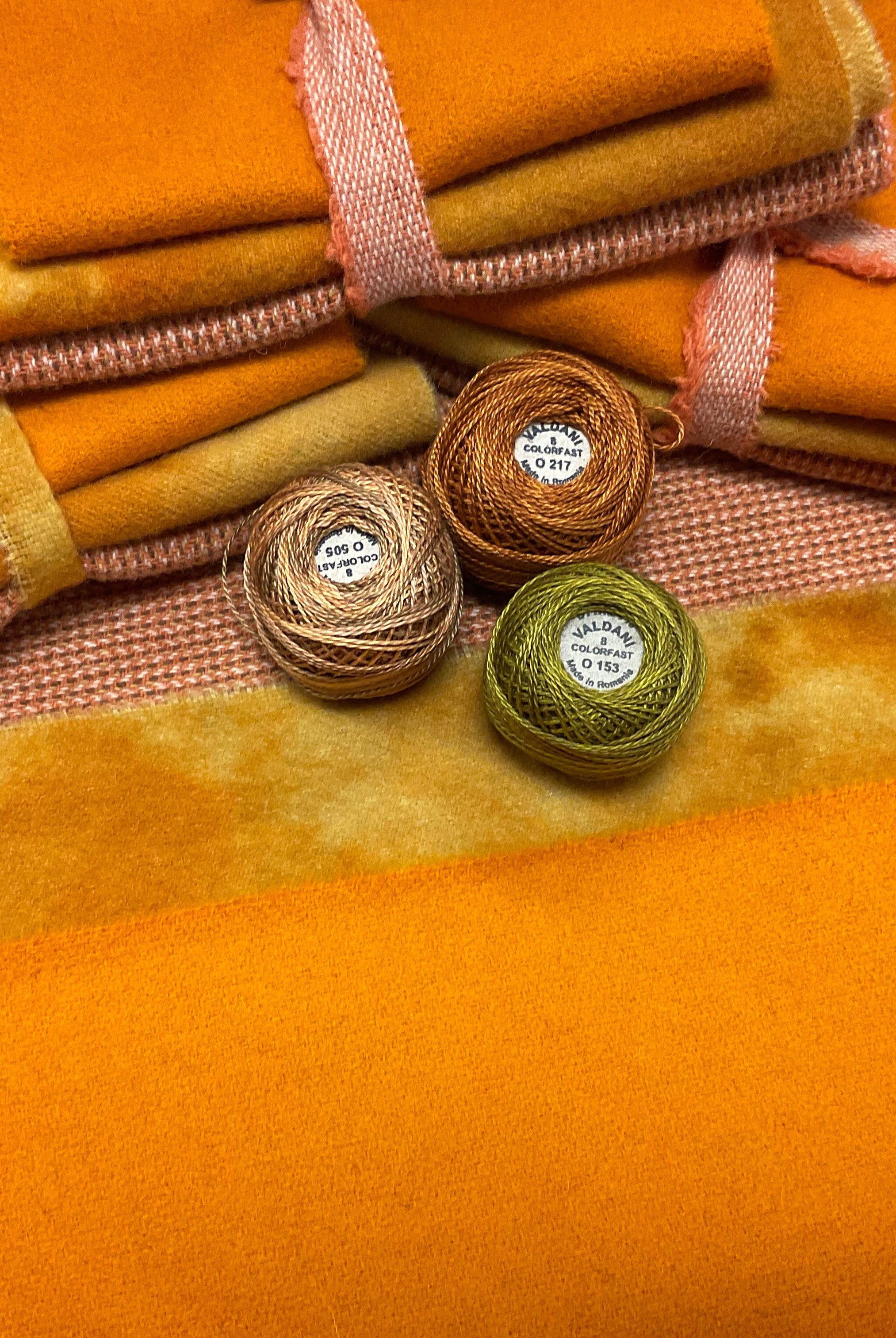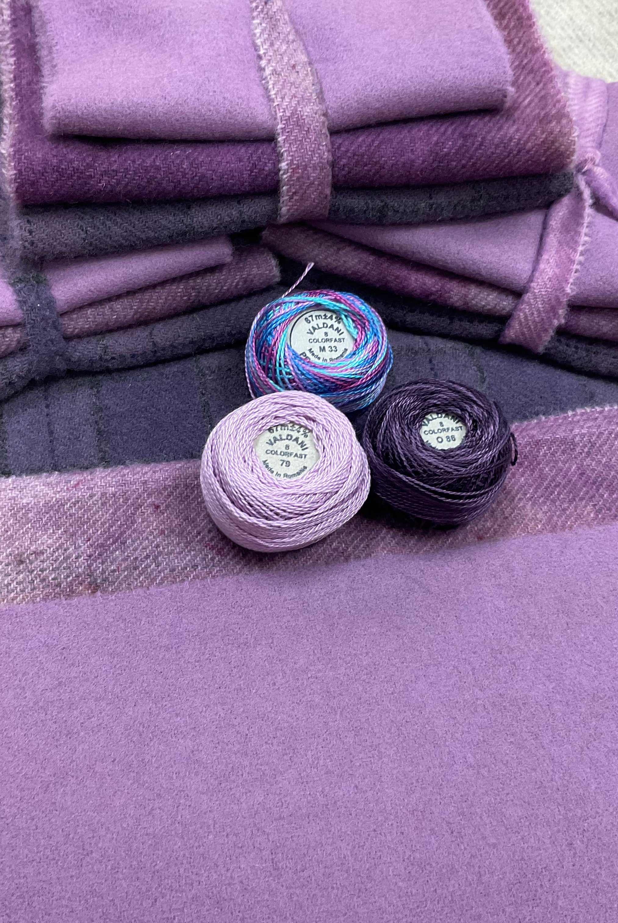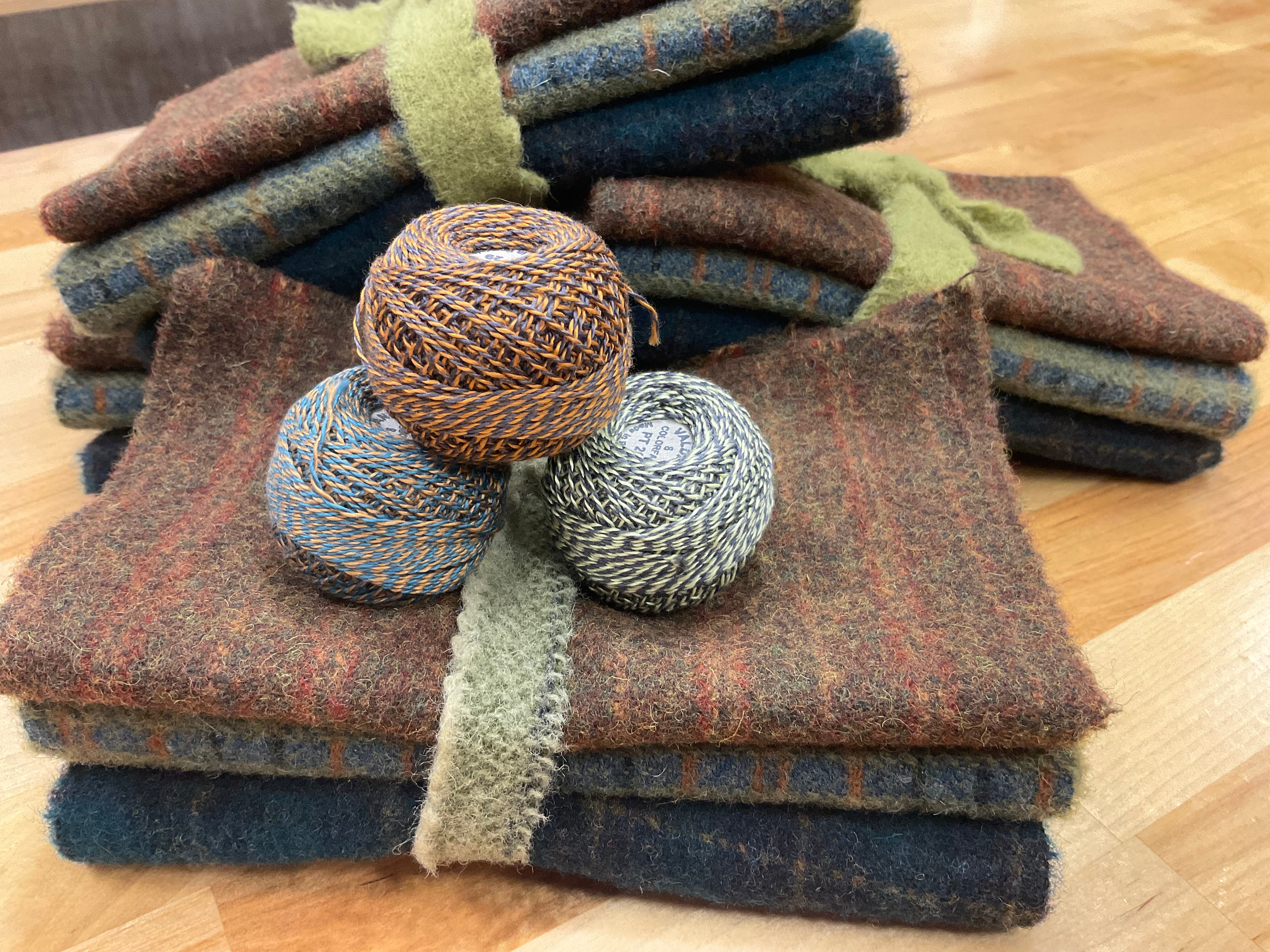 These fun bundles are all washed and ready to work with, they are a fat 1/16 of a washed as is wool 7.5x17, an over dyed wool roughly 7.5x17 and a solid 5.5x17 from the Rebekah Smith wools. We have picked 3 coordinating Vadani threads in #8 to go with your stitching if you like. Threads will be chosen to coordinate with the wools in the bundles.