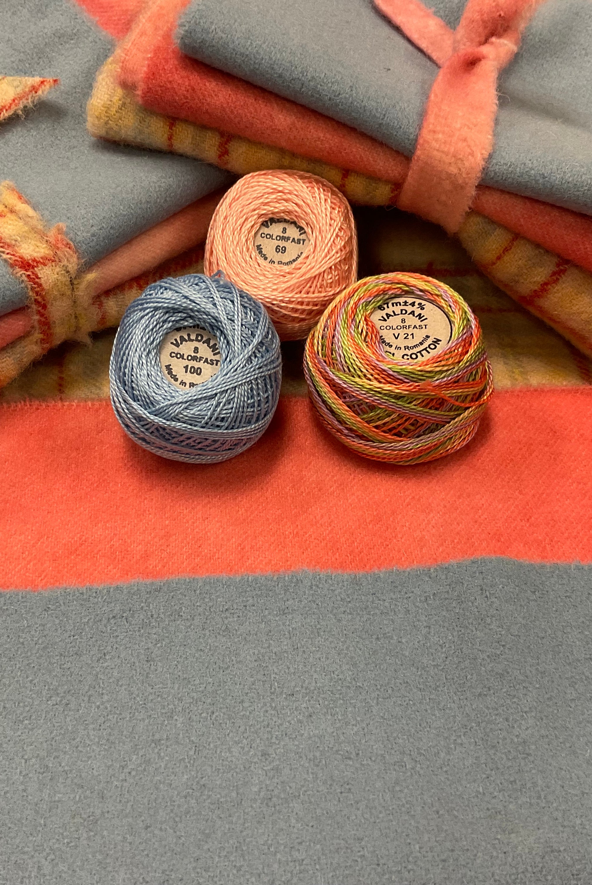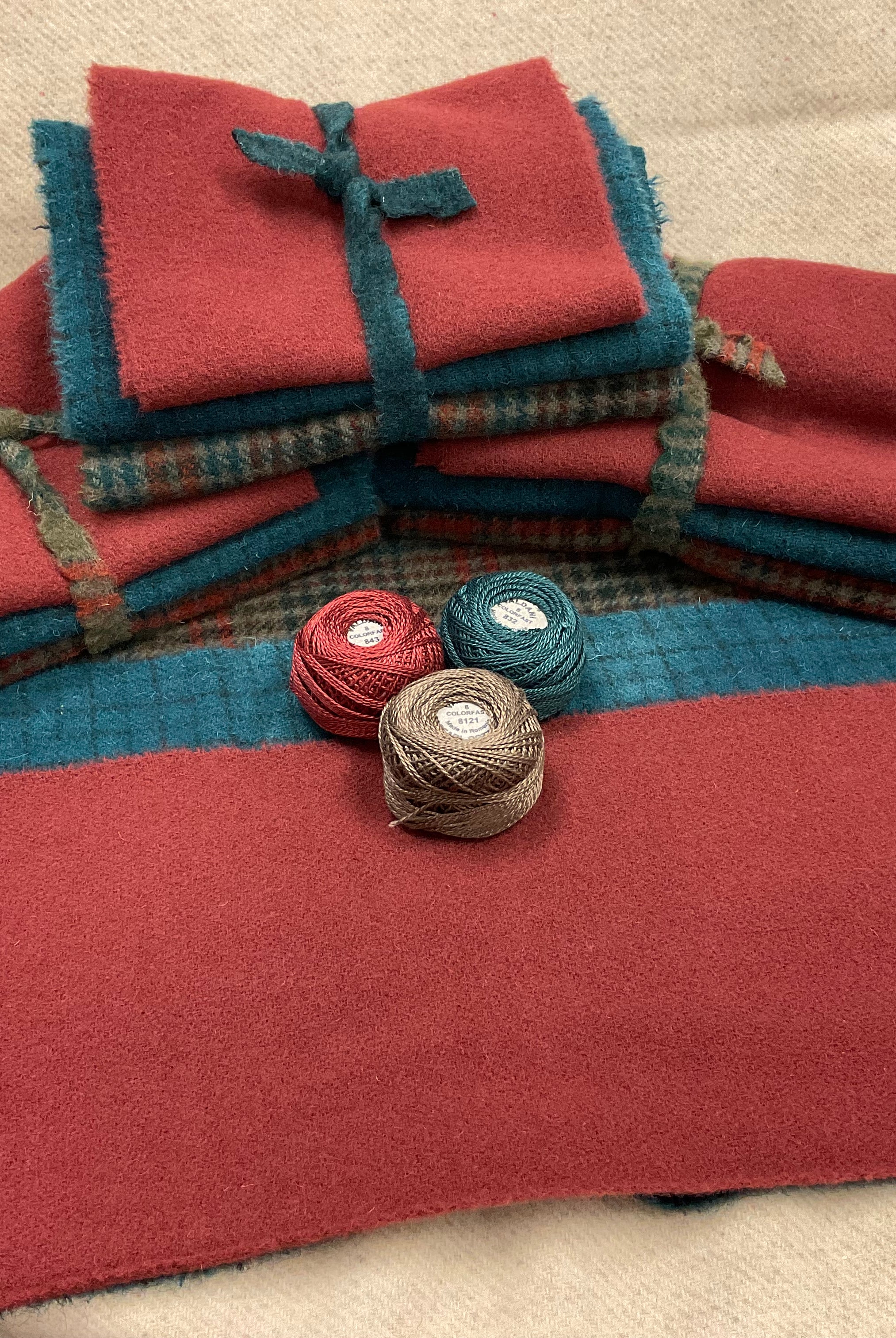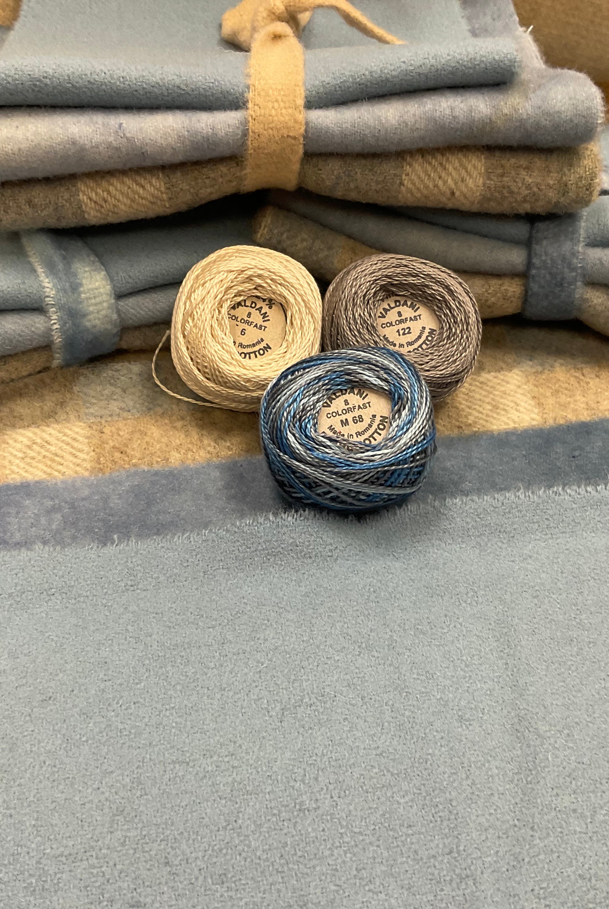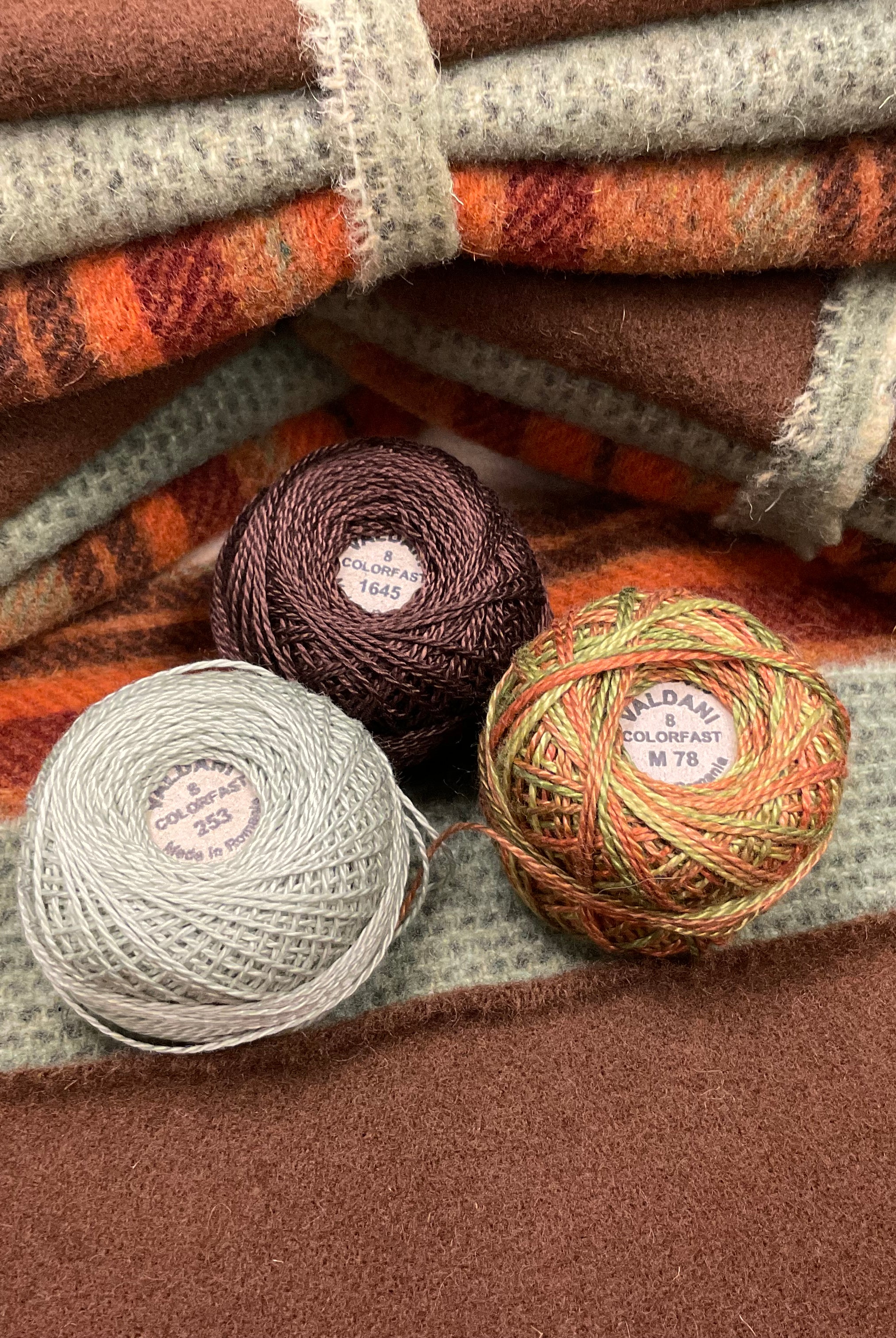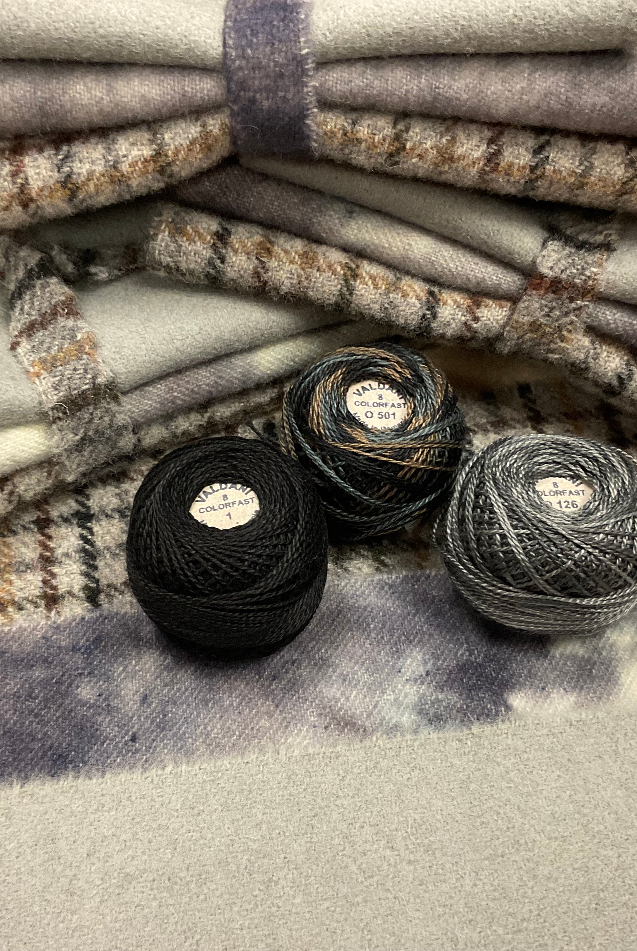 These fun bundles are all washed and ready to work with, they are a fat 1/16 of a washed as is wool 7.5x17, an over dyed wool roughly 7.5x17 and a solid 5.5x17 from the Rebekah Smith wools. We have picked 3 coordinating Vadani threads in #8 to go with your stitching if you like. Threads will be chosen to coordinate with the wools in the bundles.