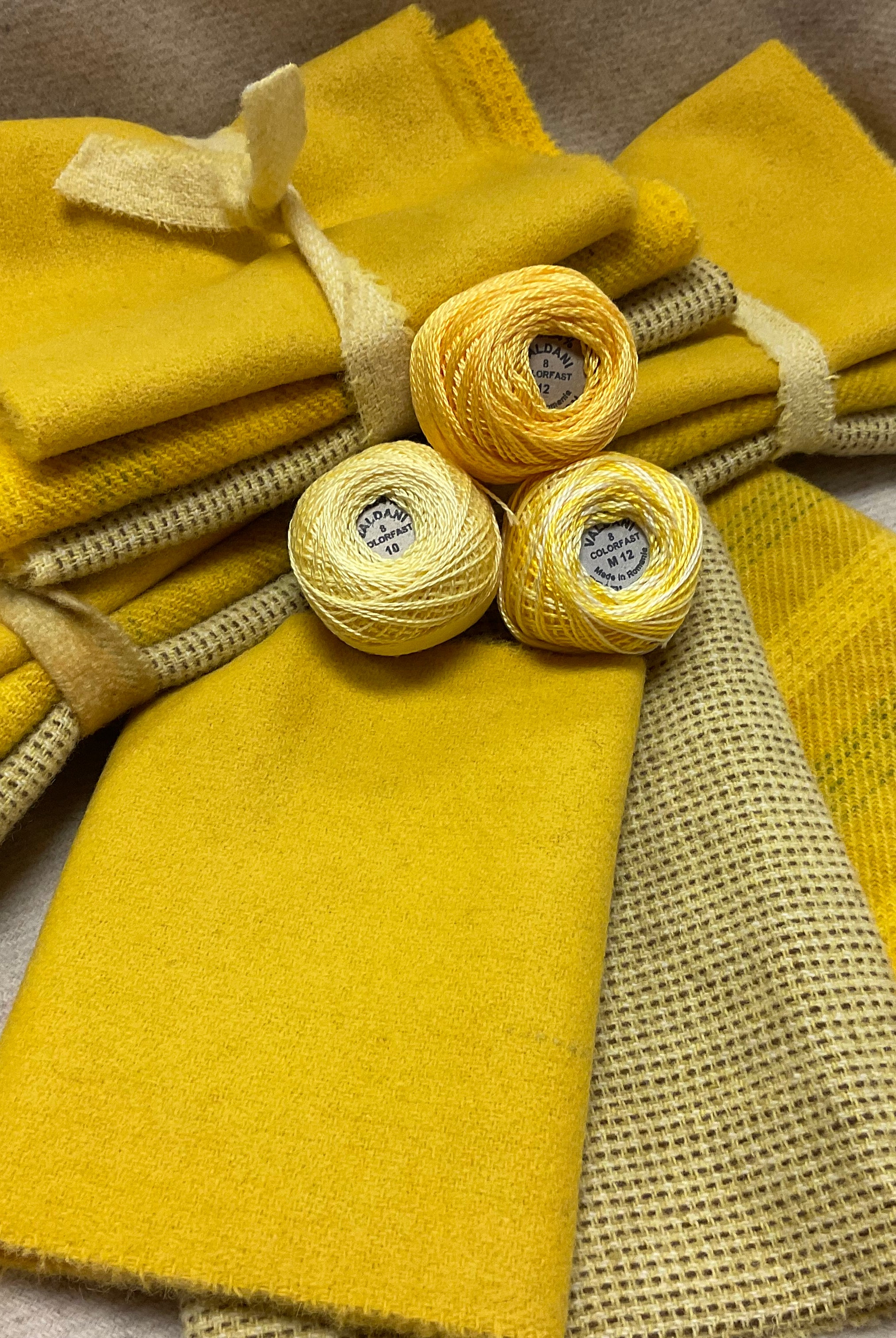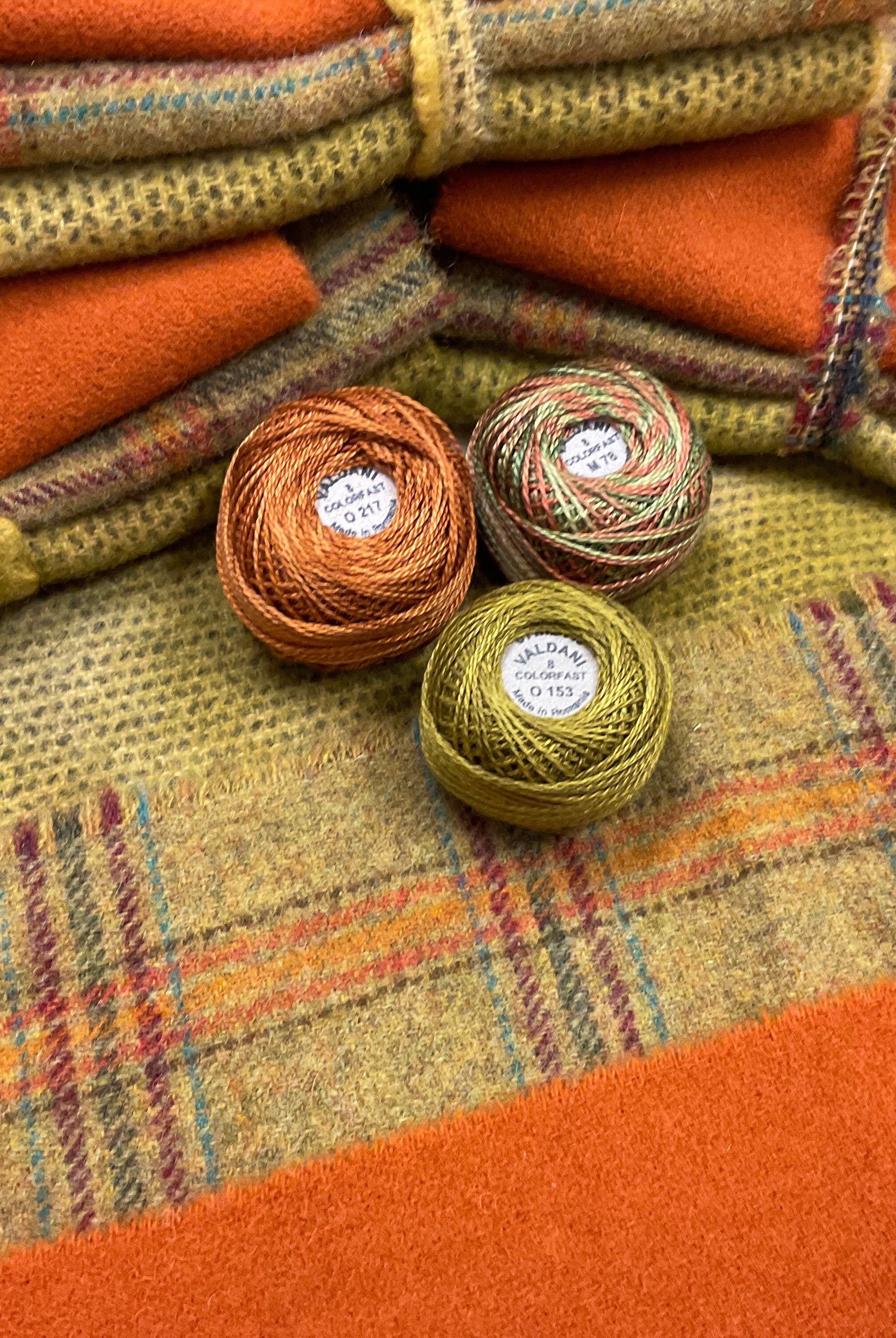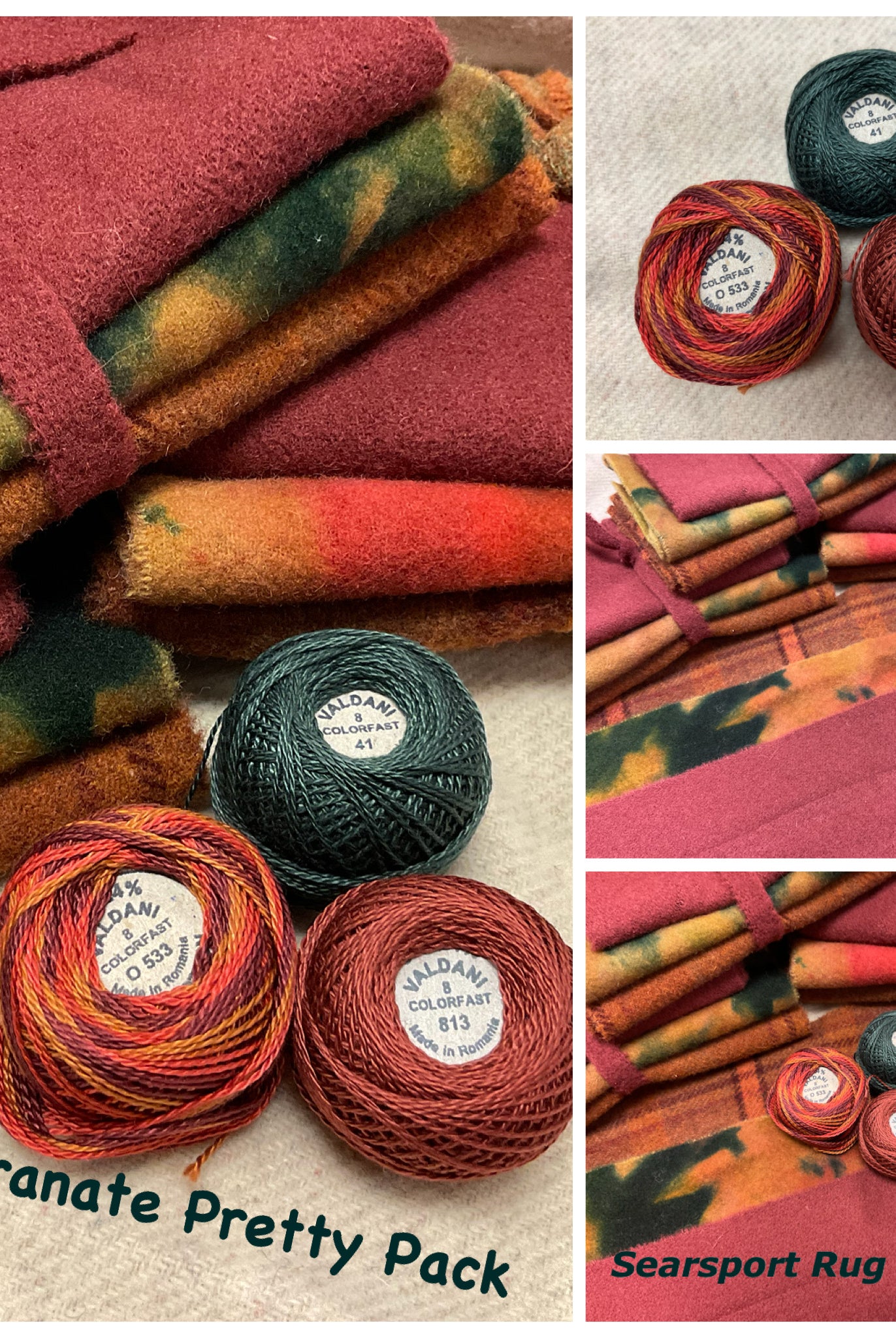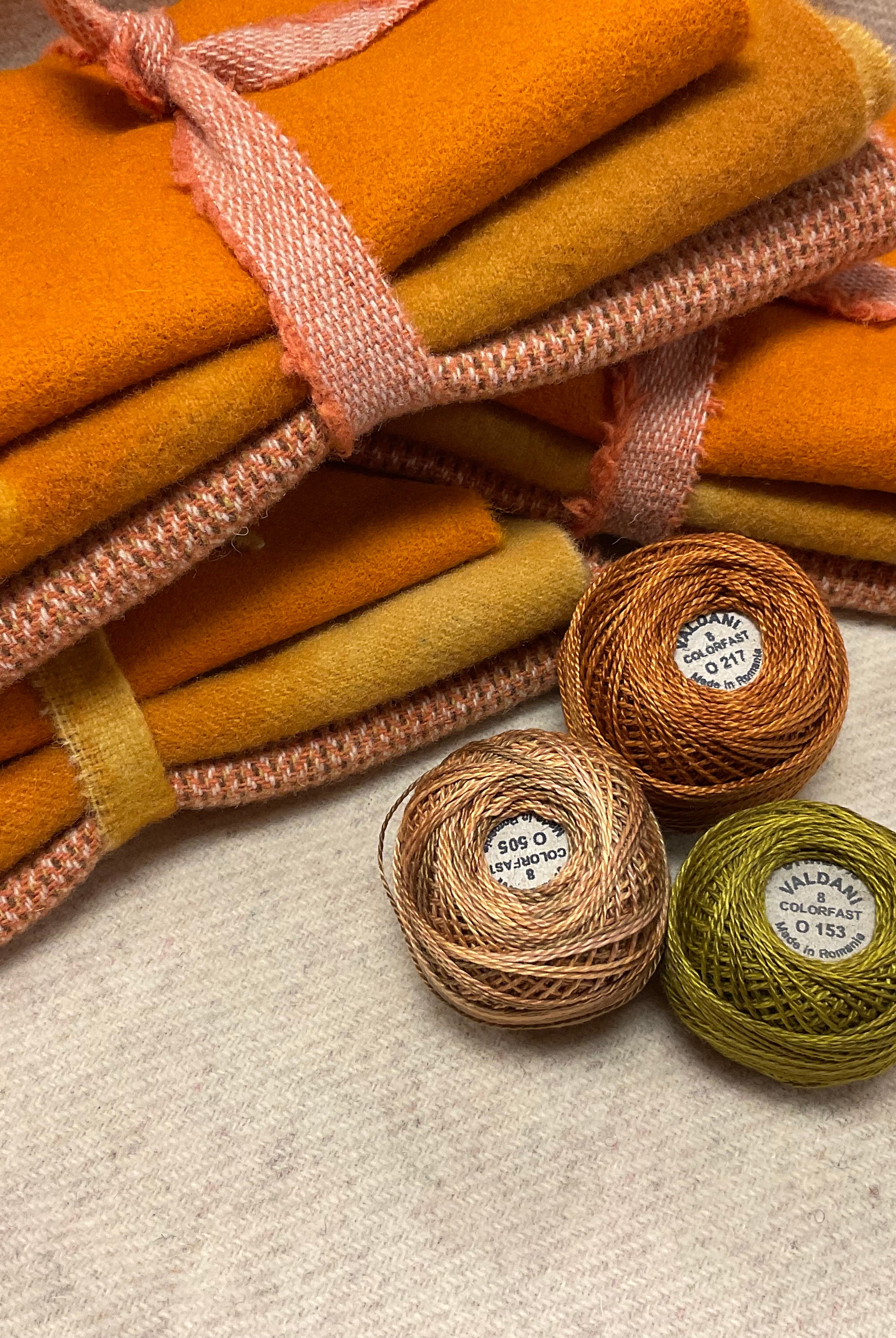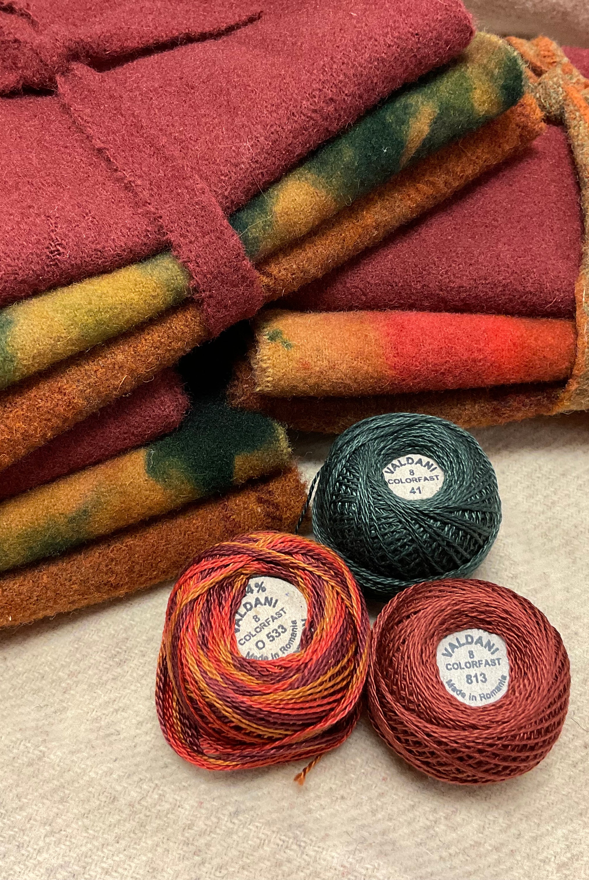 These fun bundles are all washed and ready to work with, they are a fat 1/16 of a washed as is wool 7.5x17, an over dyed wool roughly 7.5x17 and a solid 5.5x17 from the Rebekah Smith wools. We have picked 3 coordinating Vadani threads in #8 to go with your stitching if you like. Threads will be chosen to coordinate with the wools in the bundles.