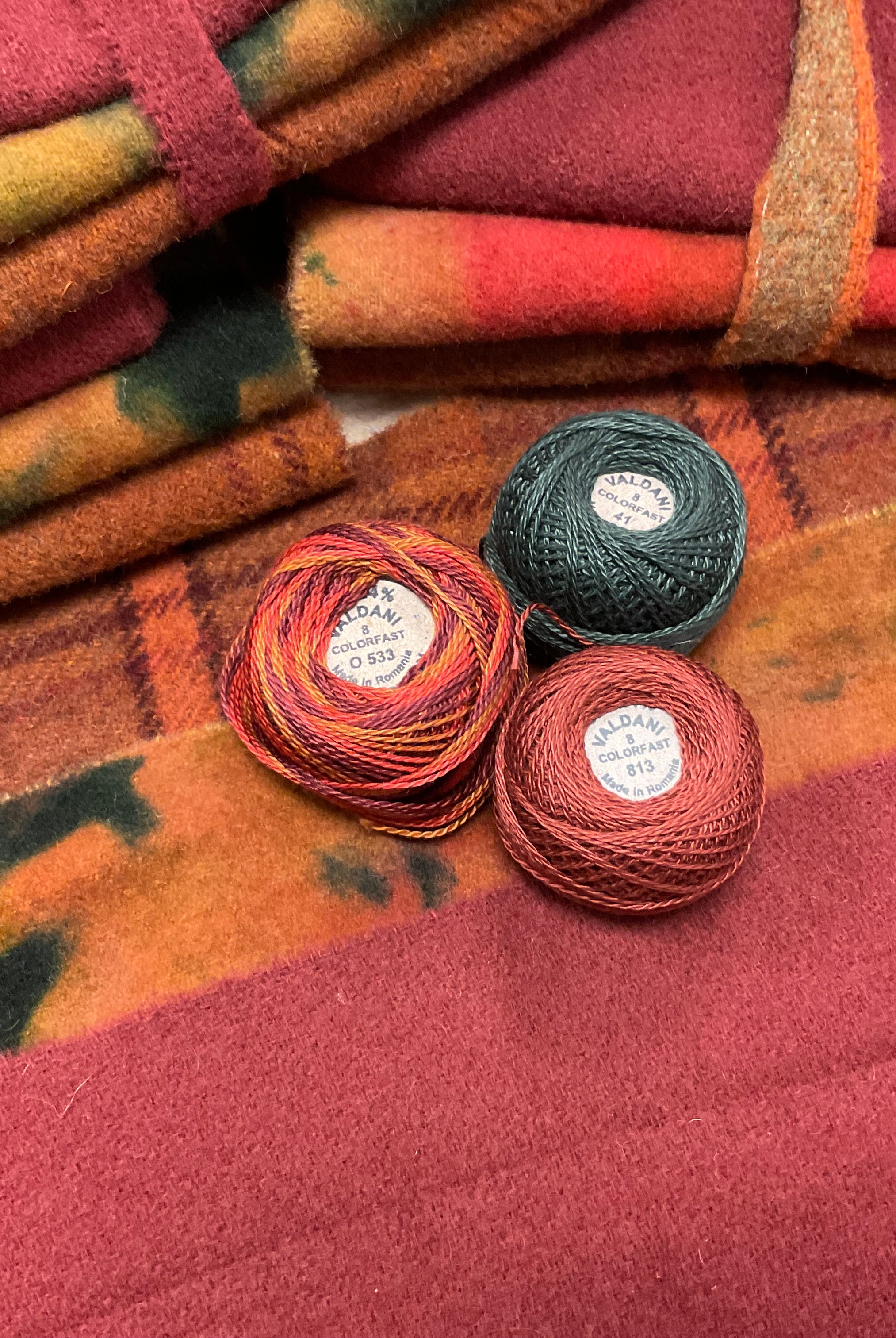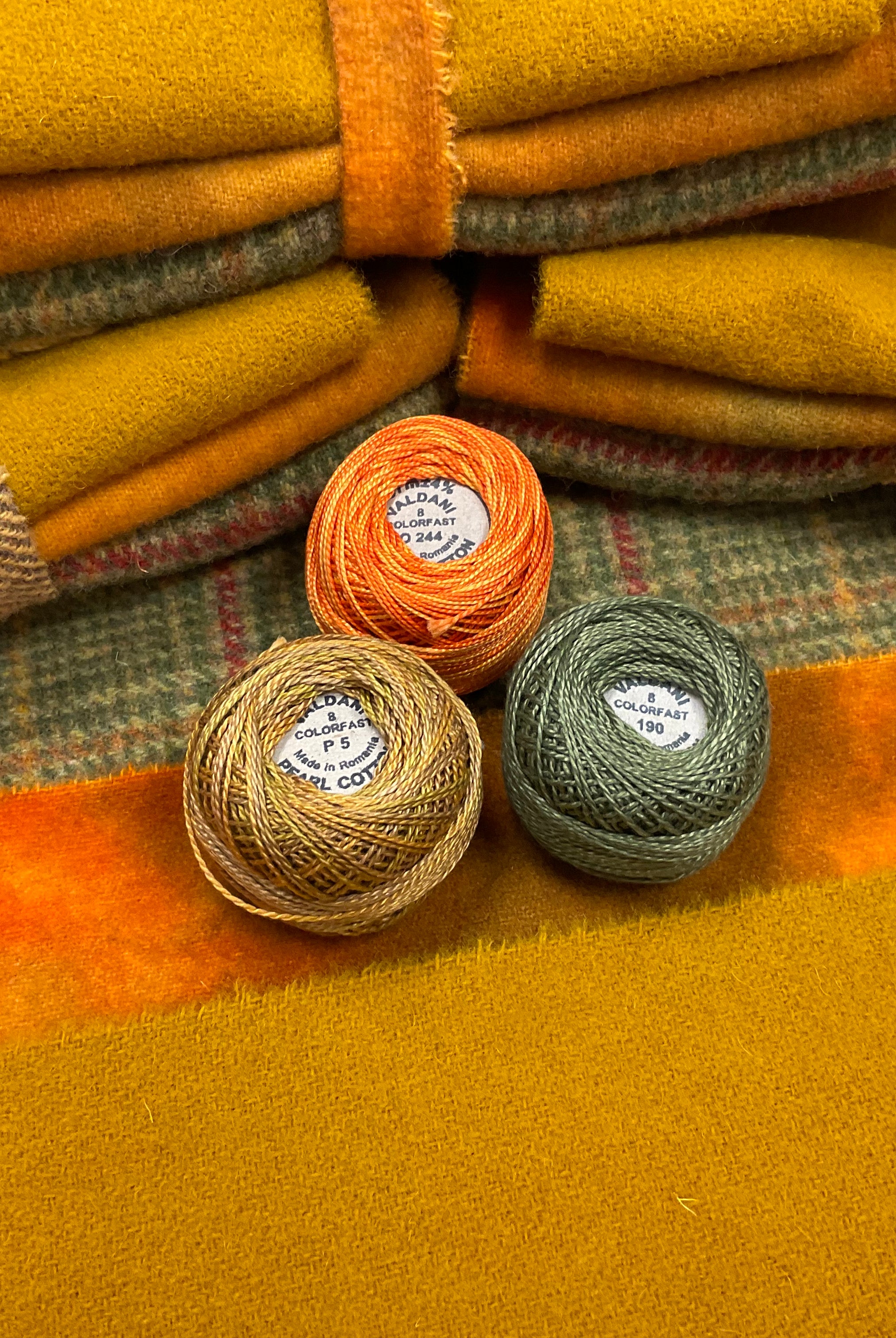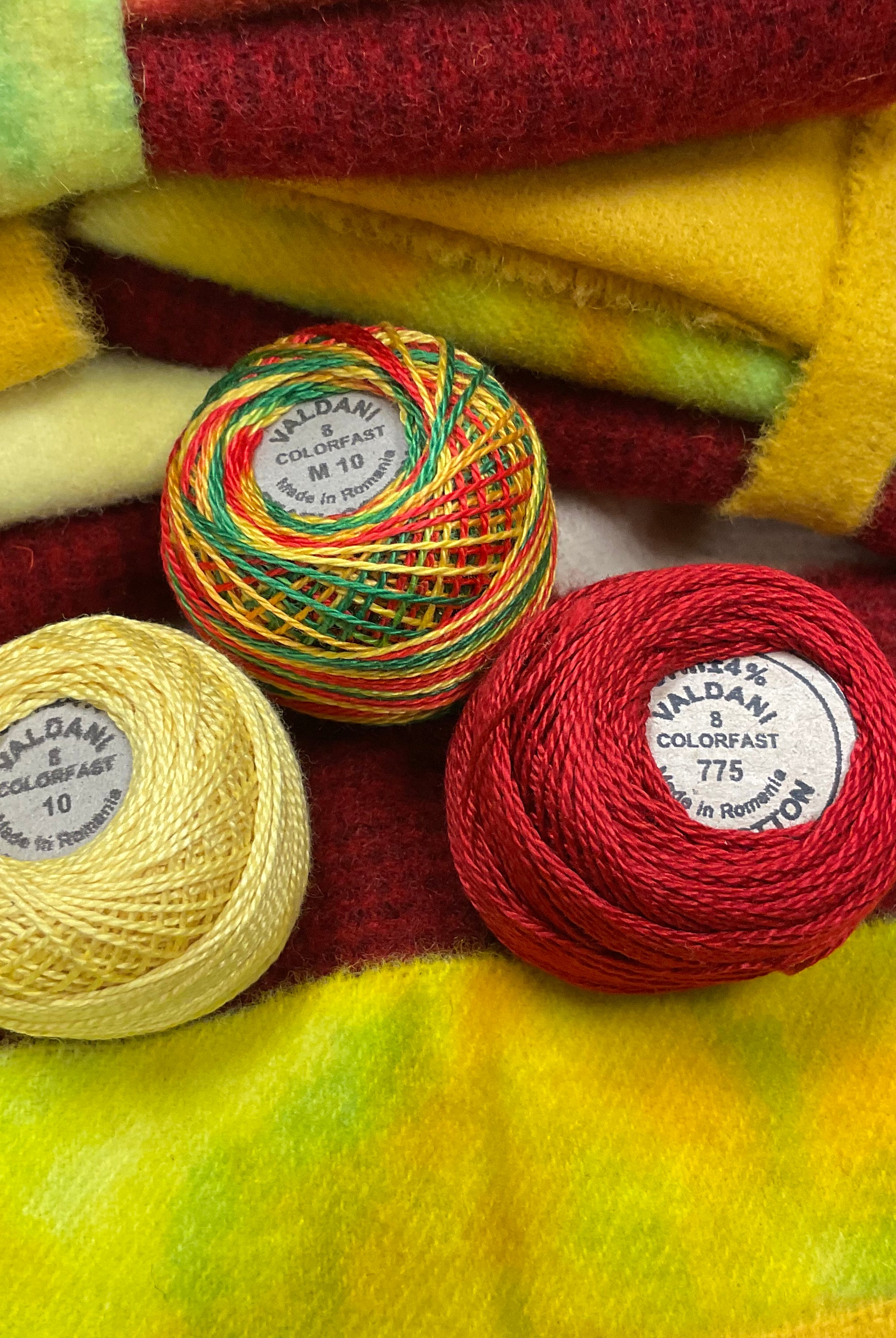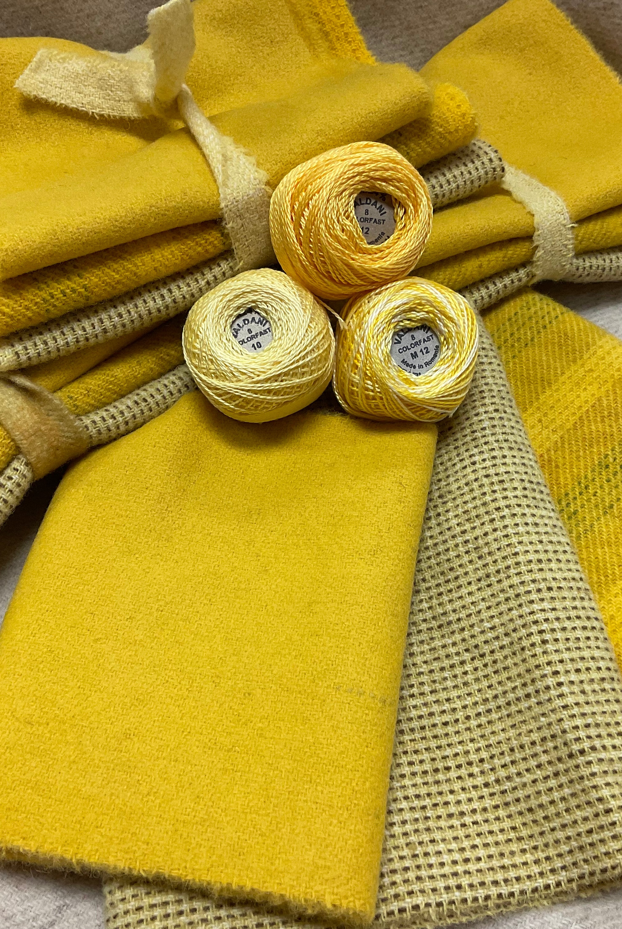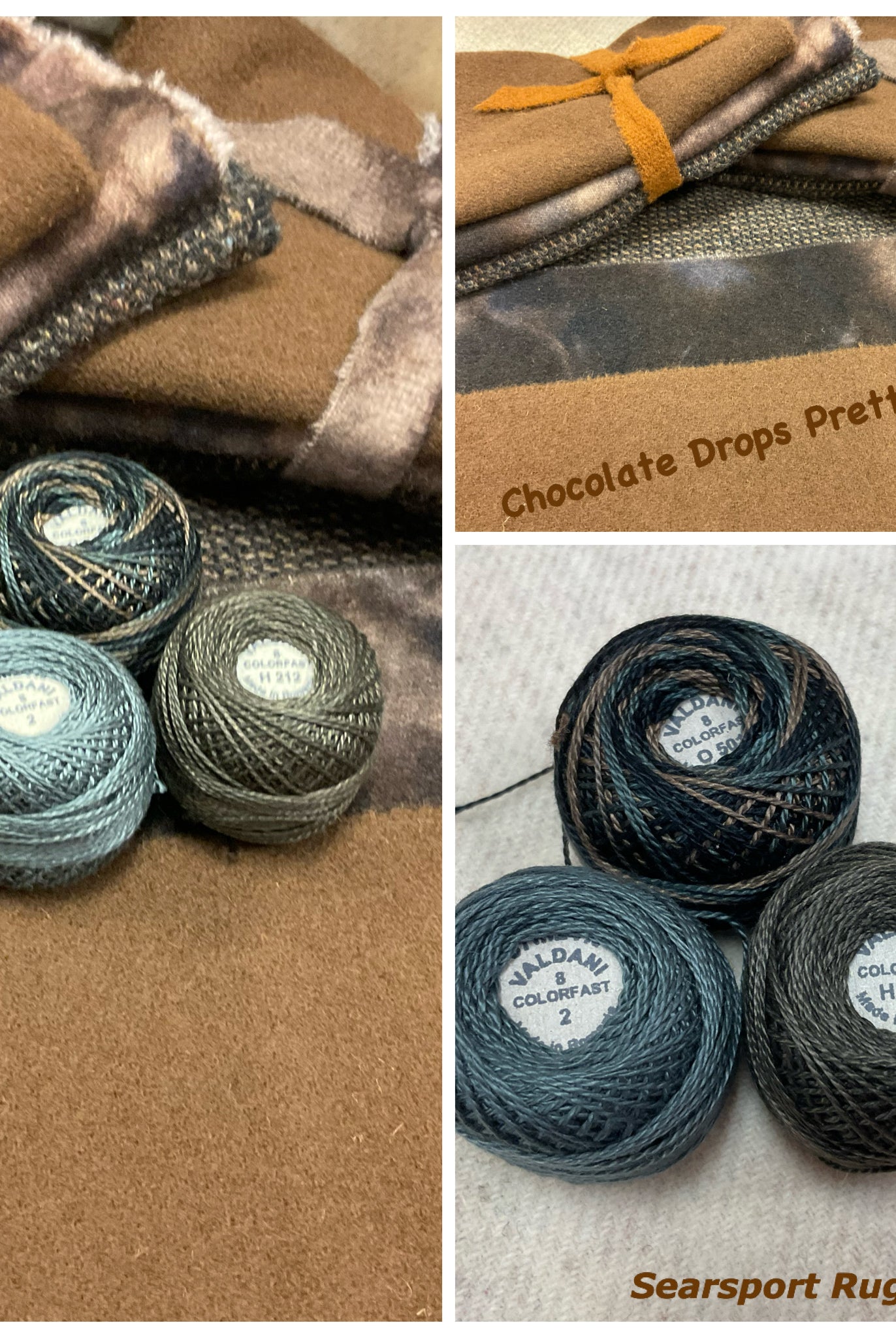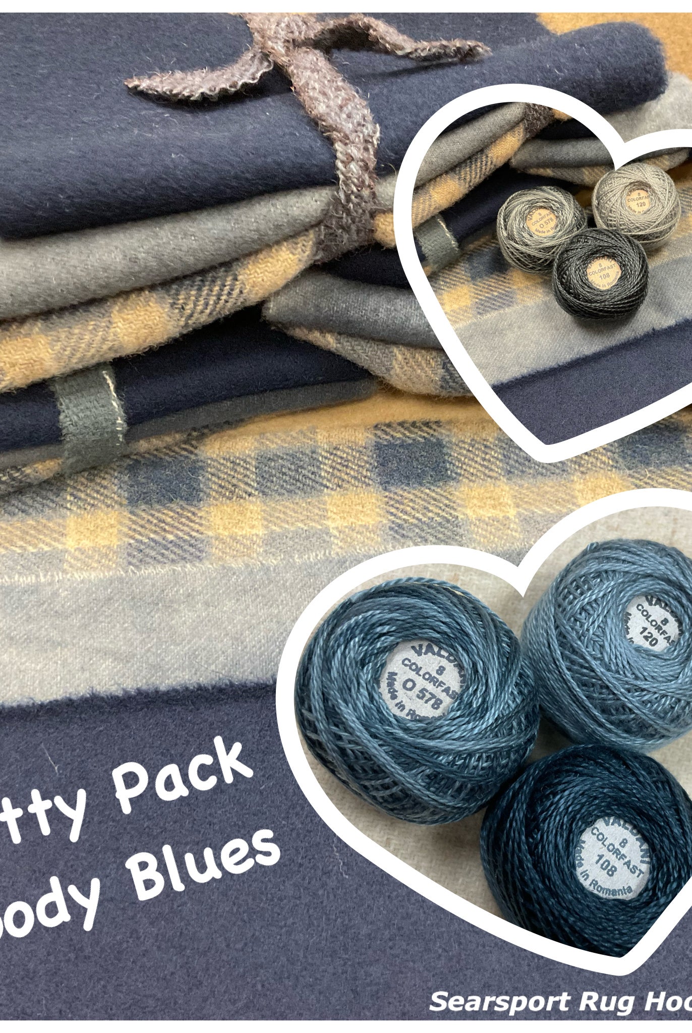 These fun bundles are all washed and ready to work with, they are a fat 1/16 of a washed as is wool 7.5x17, an over dyed wool roughly 7.5x17 and a solid 5.5x17 from the Rebekah Smith wools. We have picked 3 coordinating Vadani threads in #8 to go with your stitching if you like. Threads will be chosen to coordinate with the wools in the bundles.