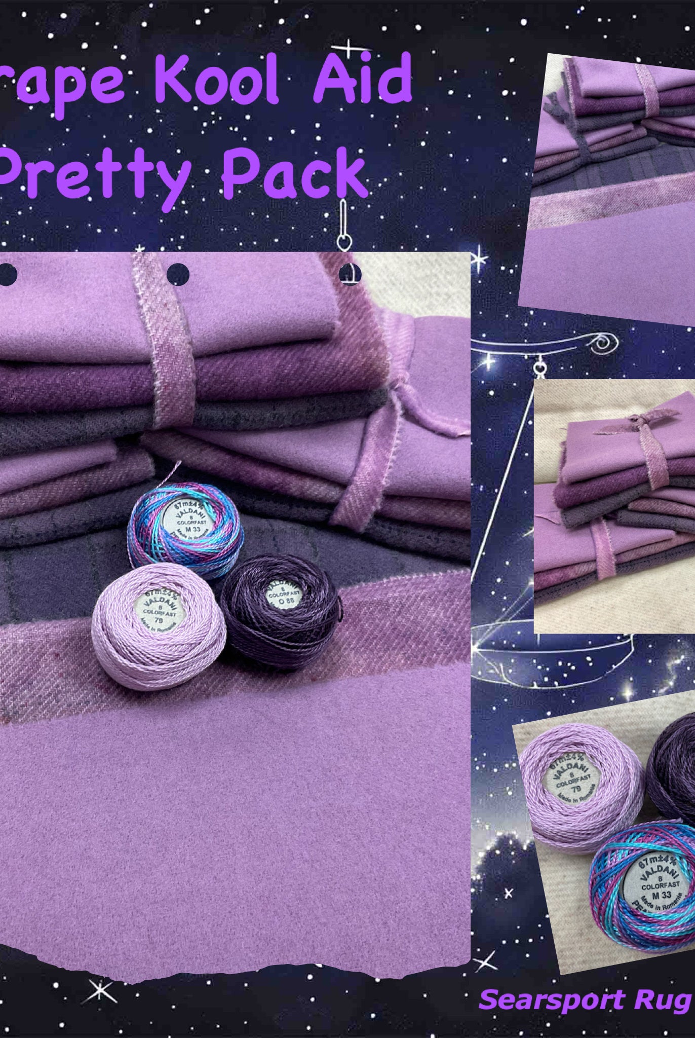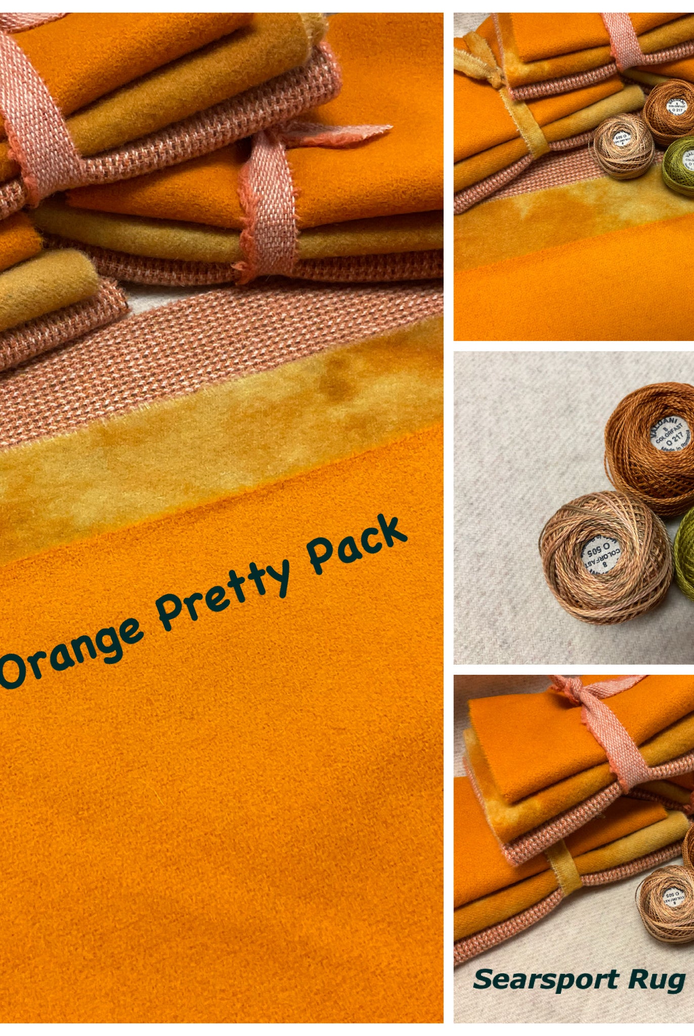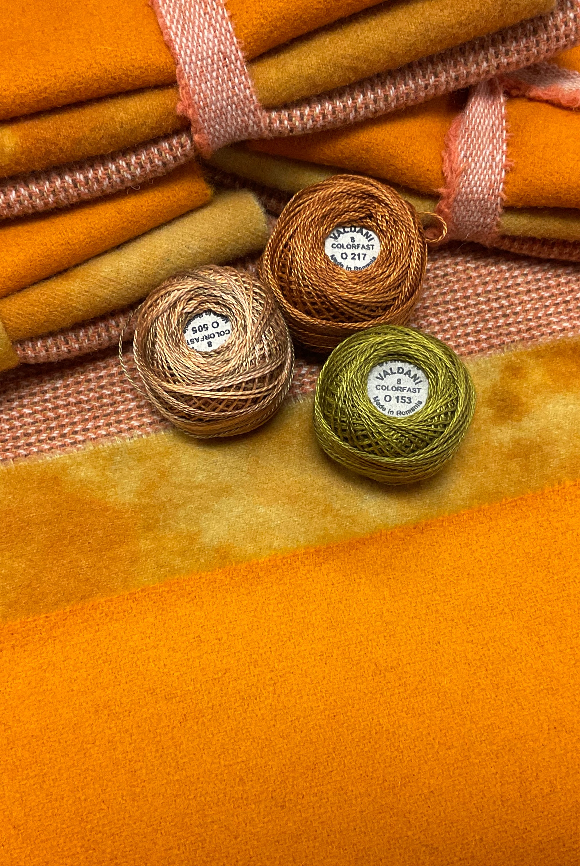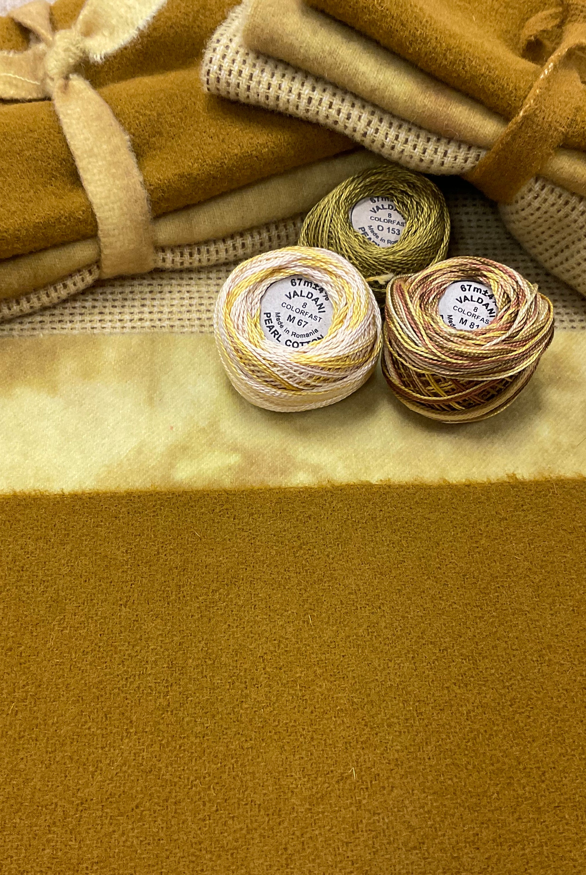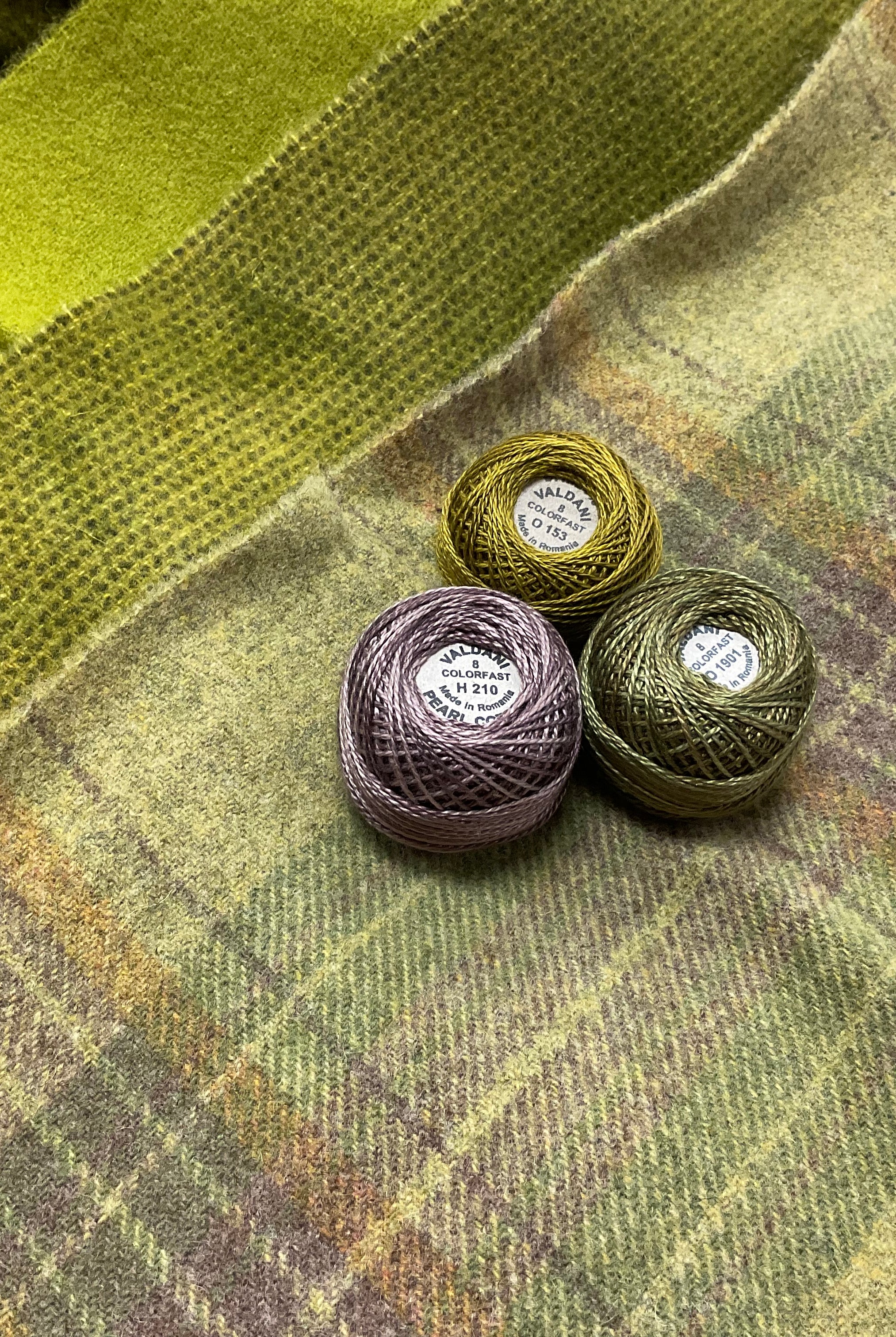These fun bundles are all washed and ready to work with, they are a fat 1/16 of a washed as is wool 7.5x17, an over dyed wool roughly 7.5x17 and a solid 5.5x17 from the Rebekah Smith wools. We have picked 3 coordinating Vadani threads in #8 to go with your stitching if you like. Threads will be chosen to coordinate with the wools in the bundles.