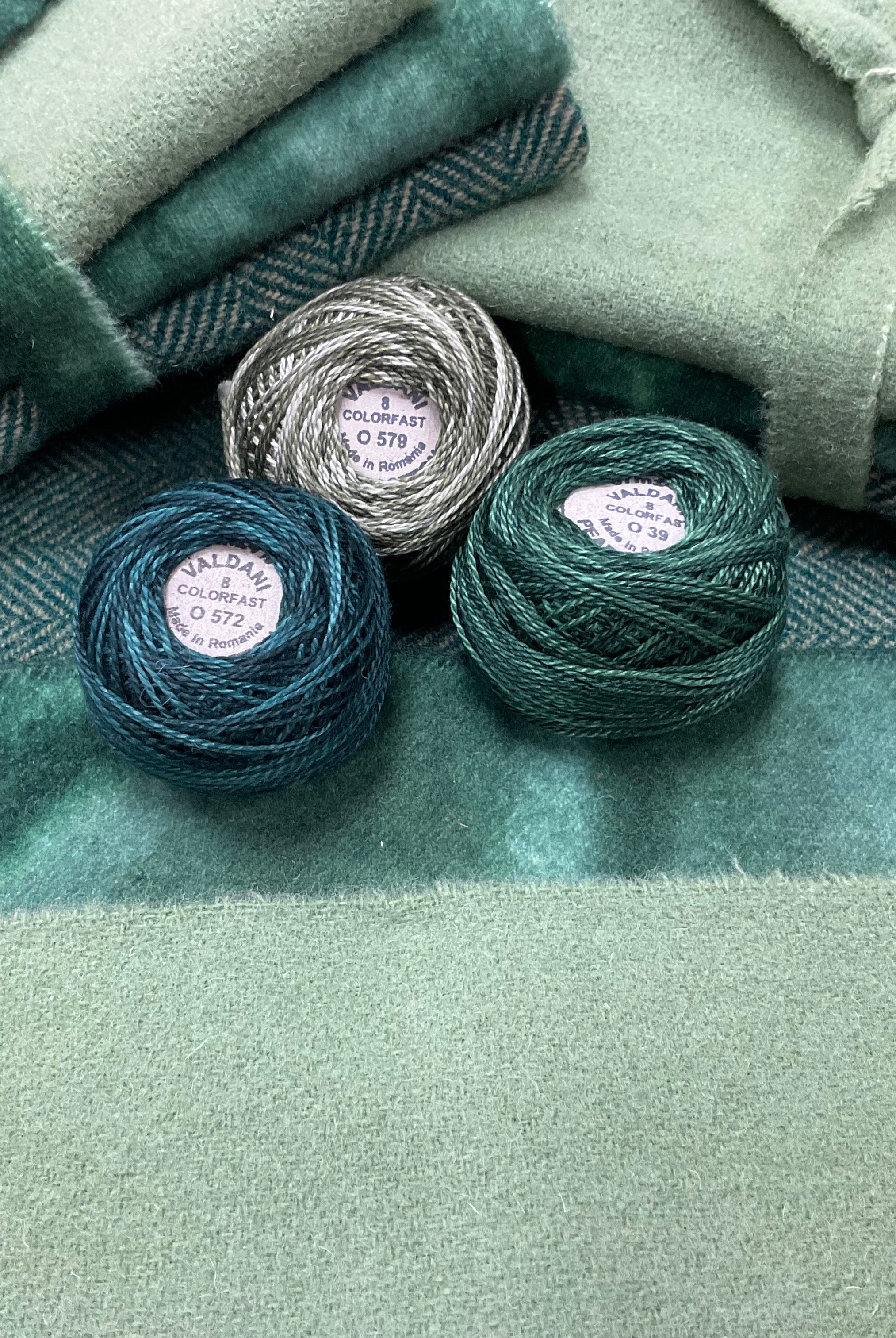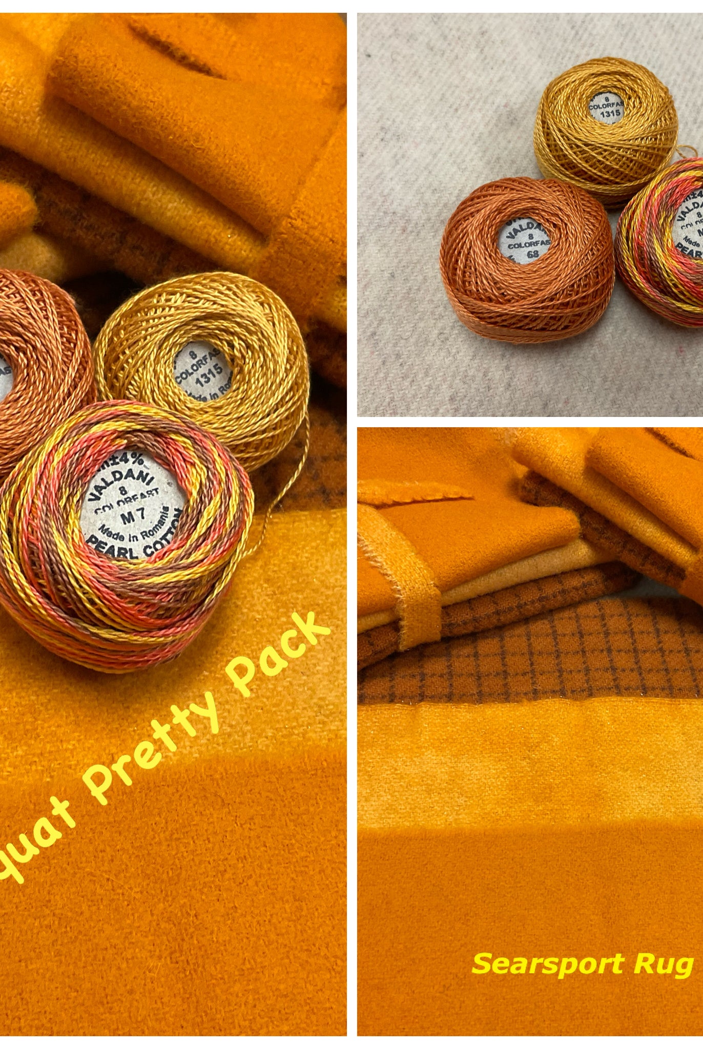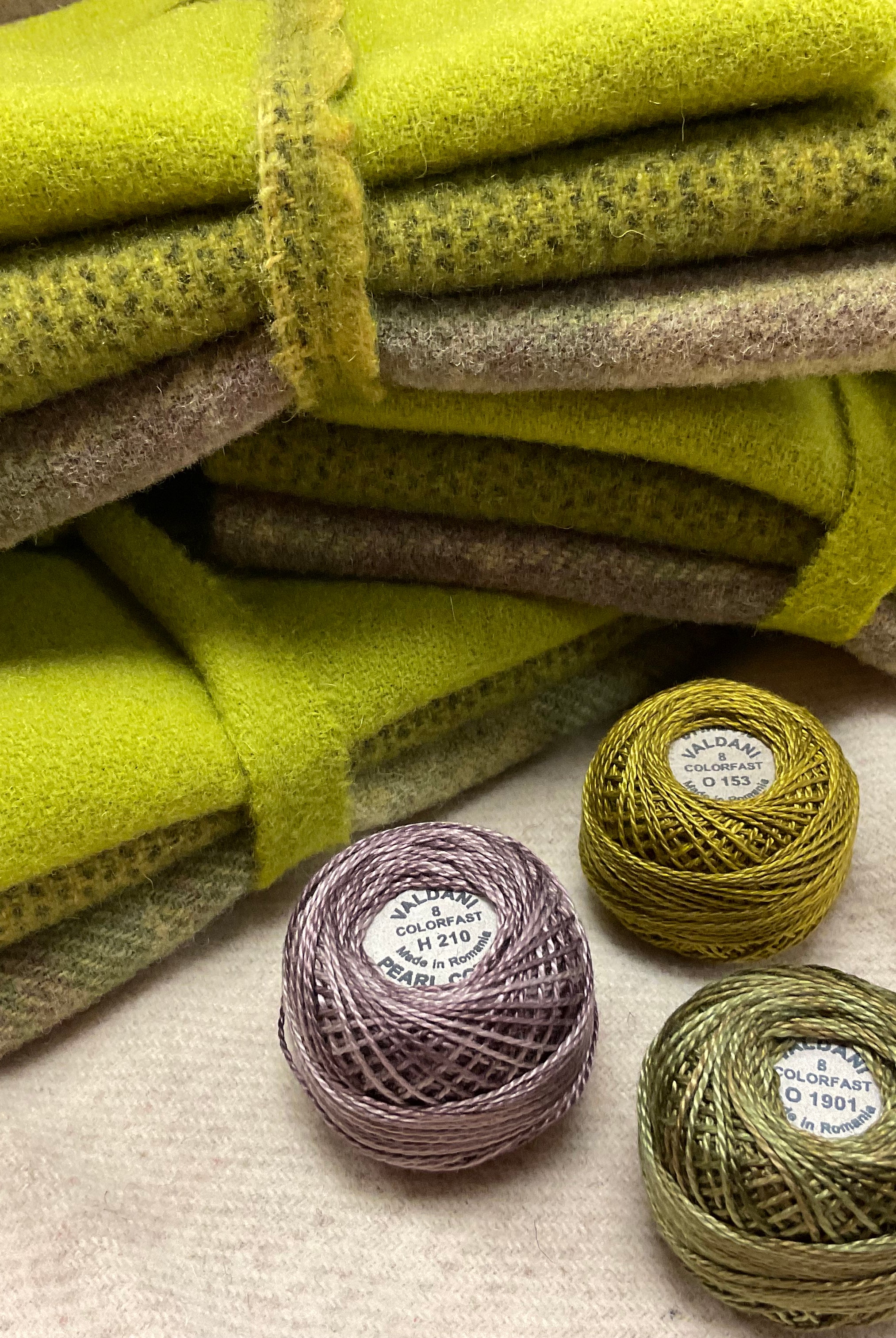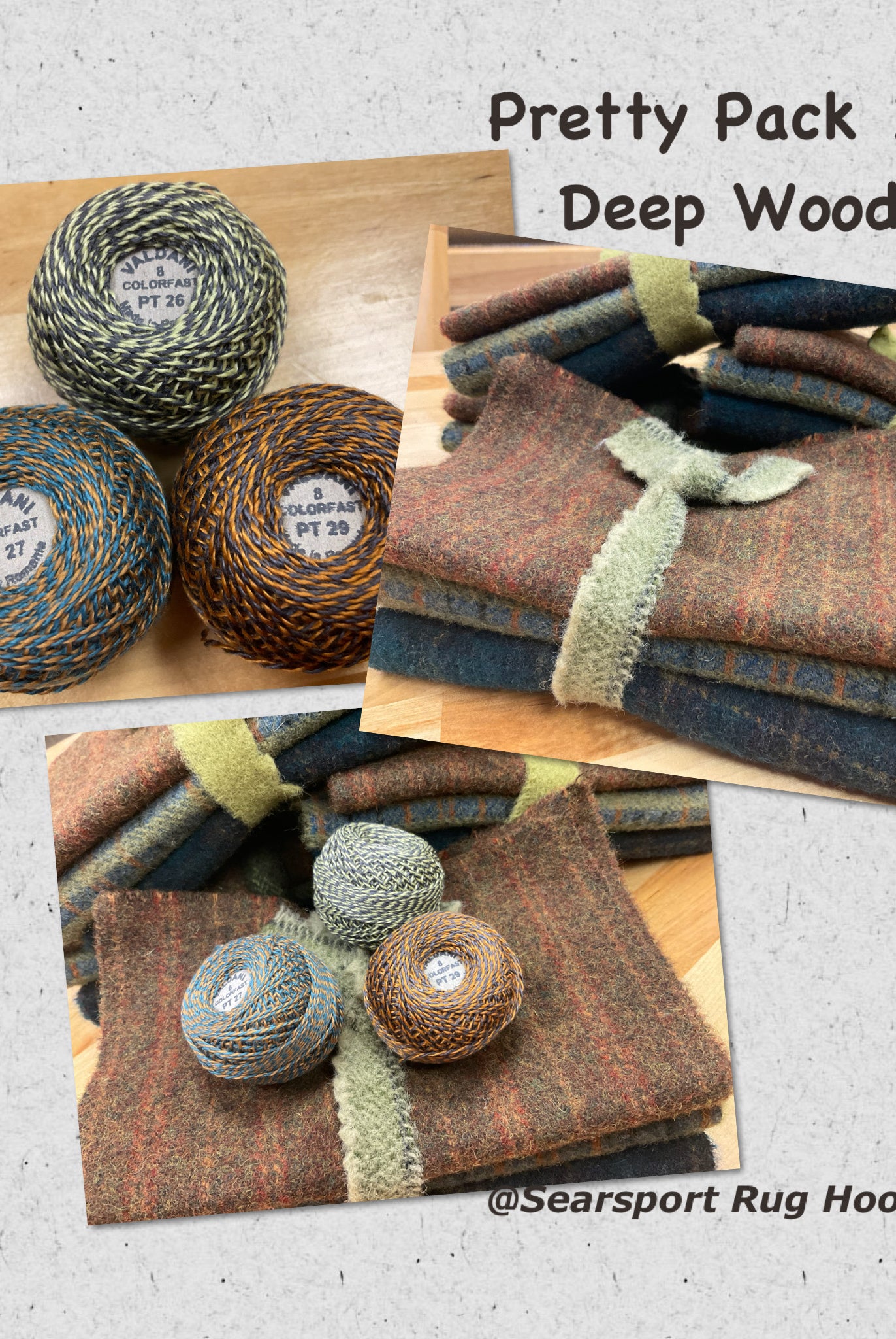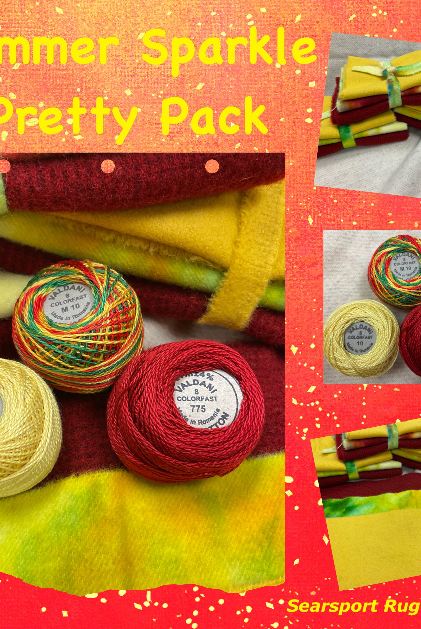 These fun bundles are all washed and ready to work with, they are a fat 1/16 of a washed as is wool 7.5x17, an over dyed wool roughly 7.5x17 and a solid 5.5x17 from the Rebekah Smith wools. We have picked 3 coordinating Vadani threads in #8 to go with your stitching if you like. Threads will be chosen to coordinate with the wools in the bundles.