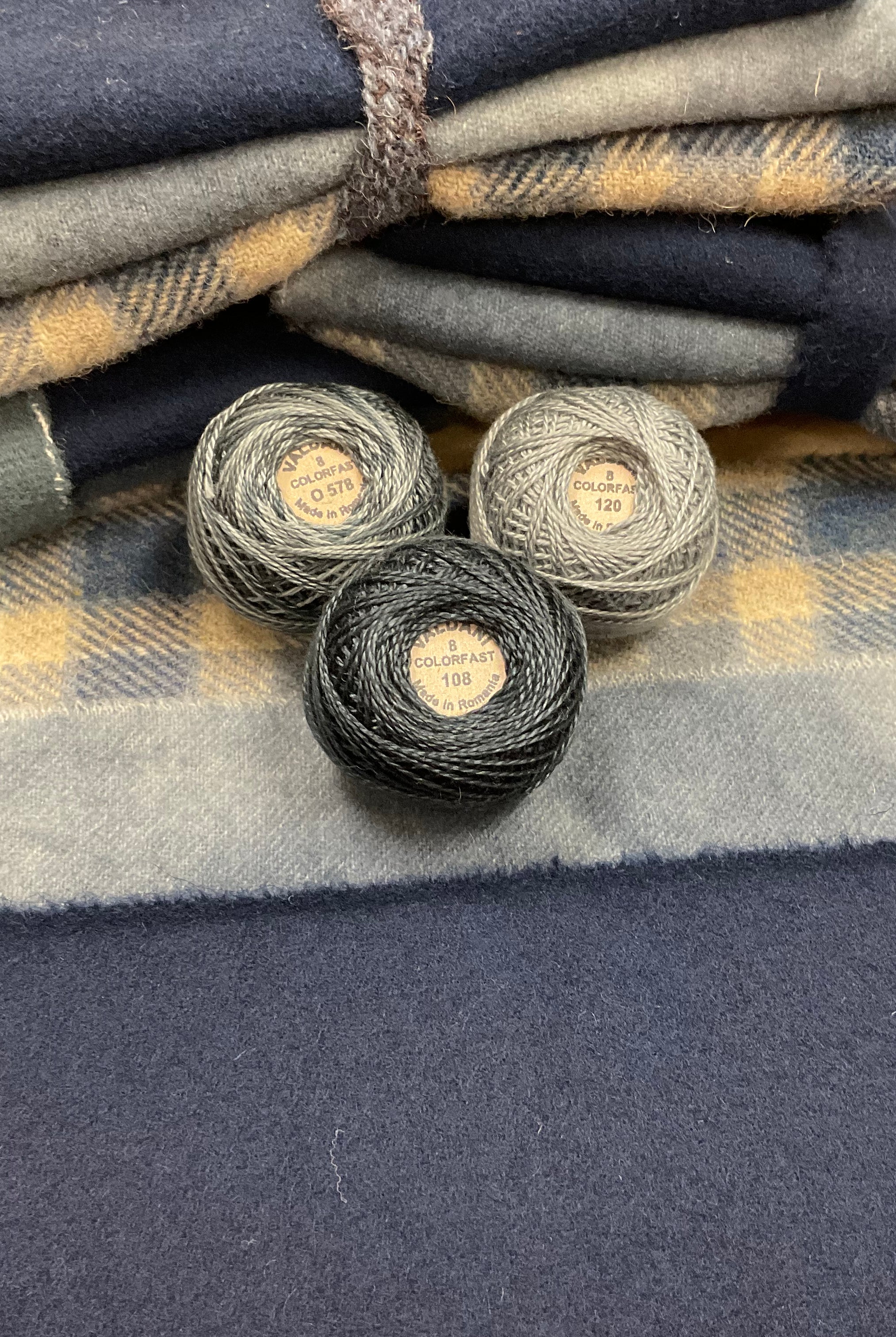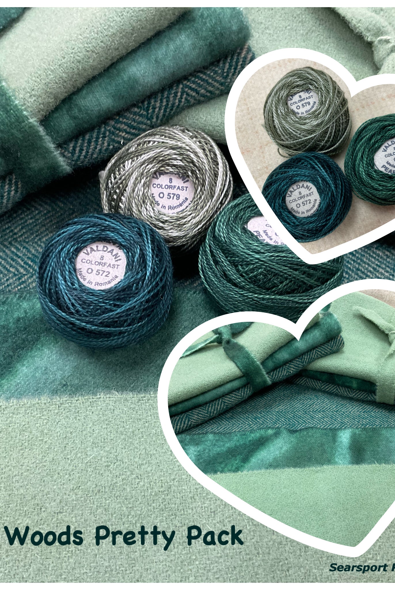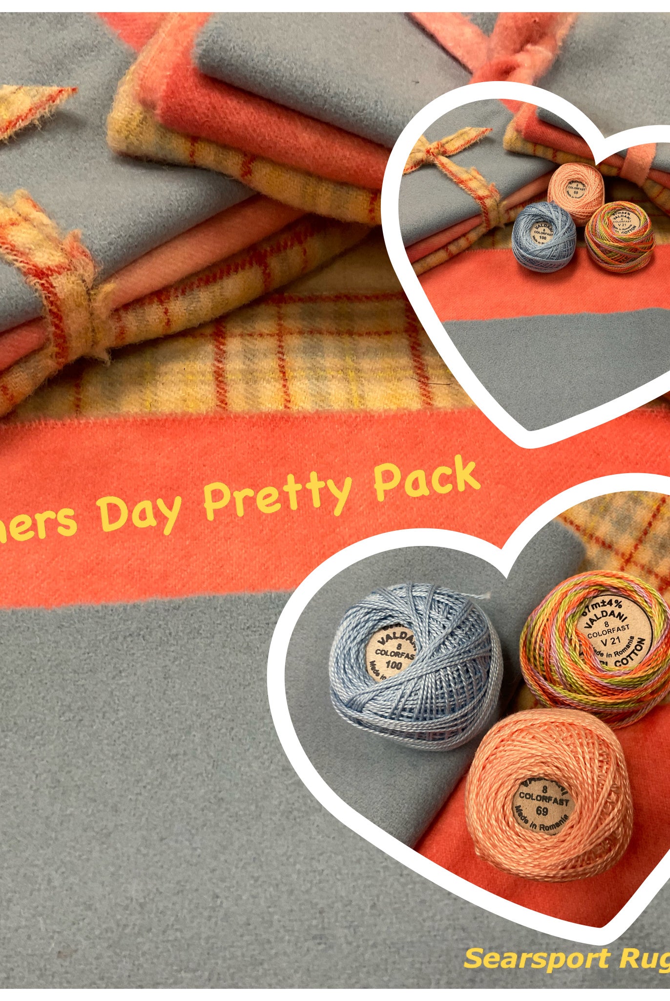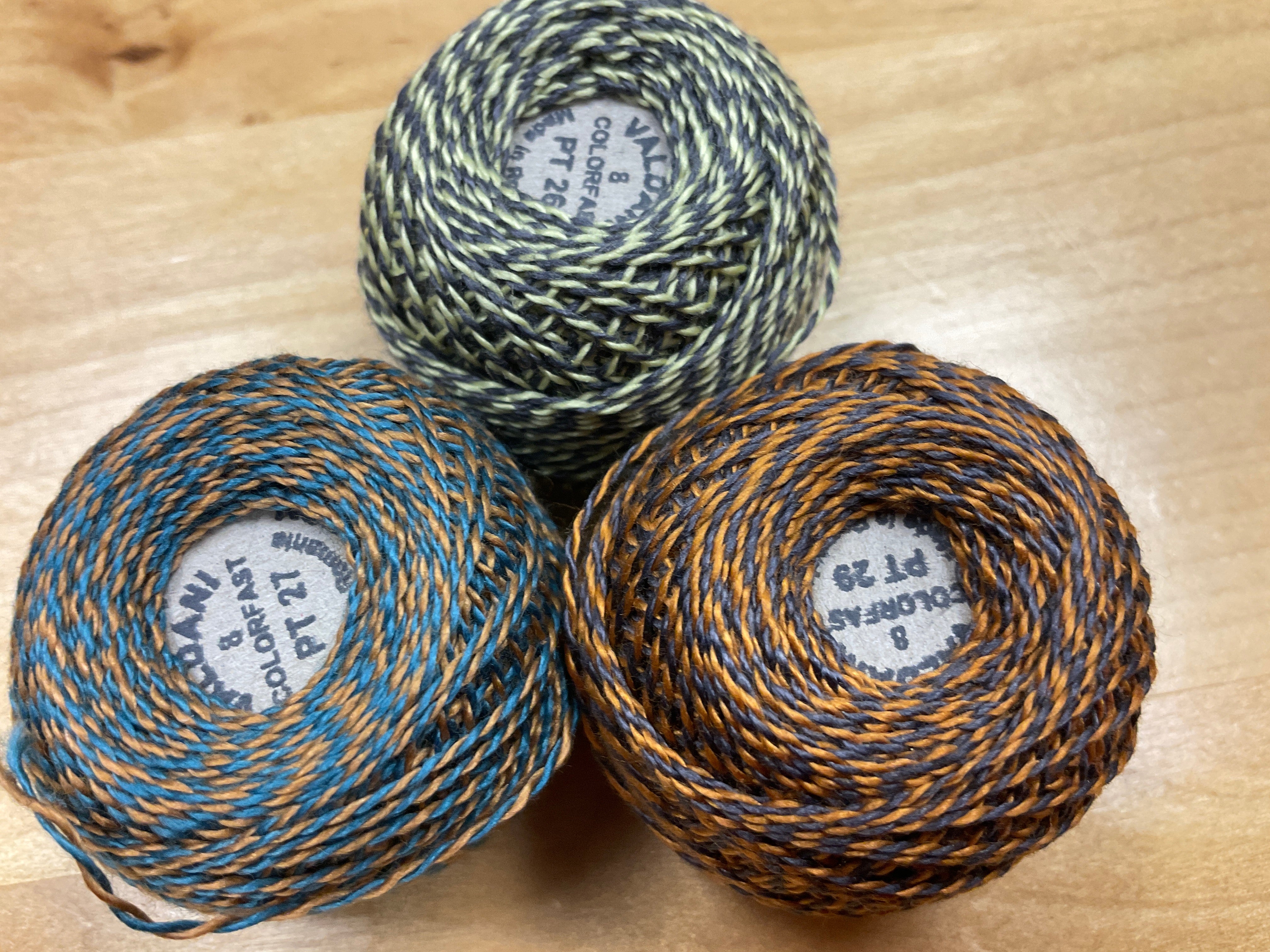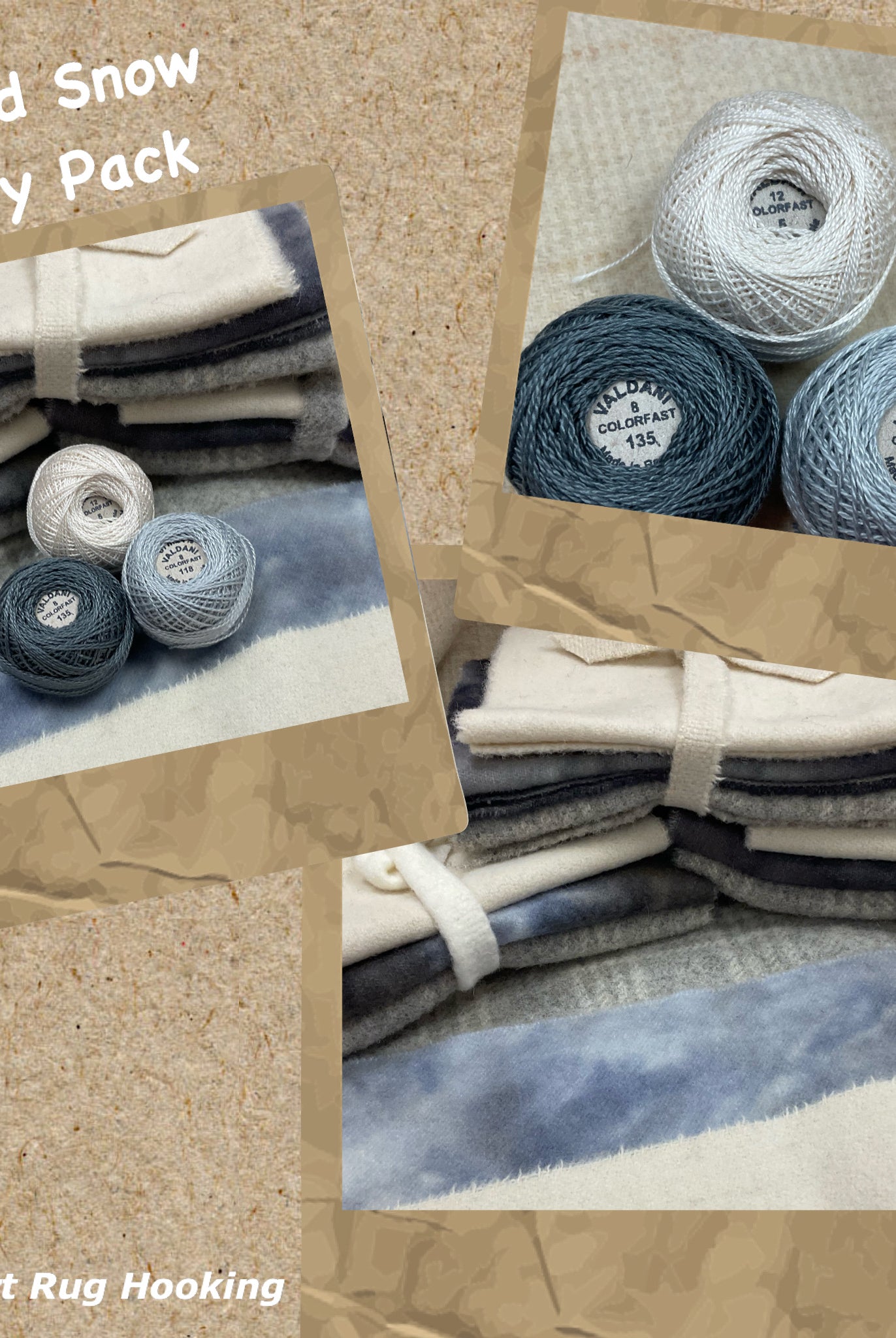 These fun bundles are all washed and ready to work with, they are a fat 1/16 of a washed as is wool 7.5x17, an over dyed wool roughly 7.5x17 and a solid 5.5x17 from the Rebekah Smith wools. We have picked 3 coordinating Vadani threads in #8 to go with your stitching if you like. Threads will be chosen to coordinate with the wools in the bundles.