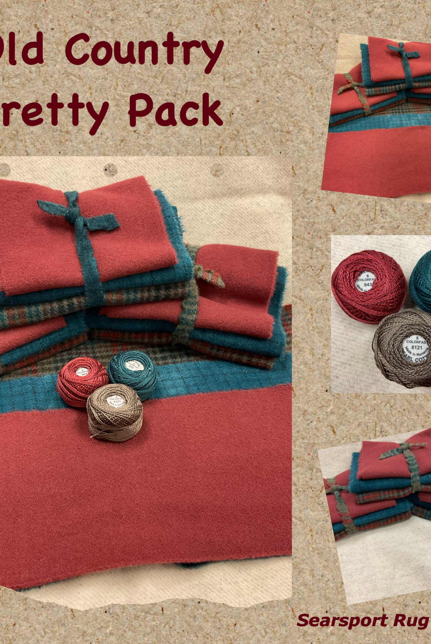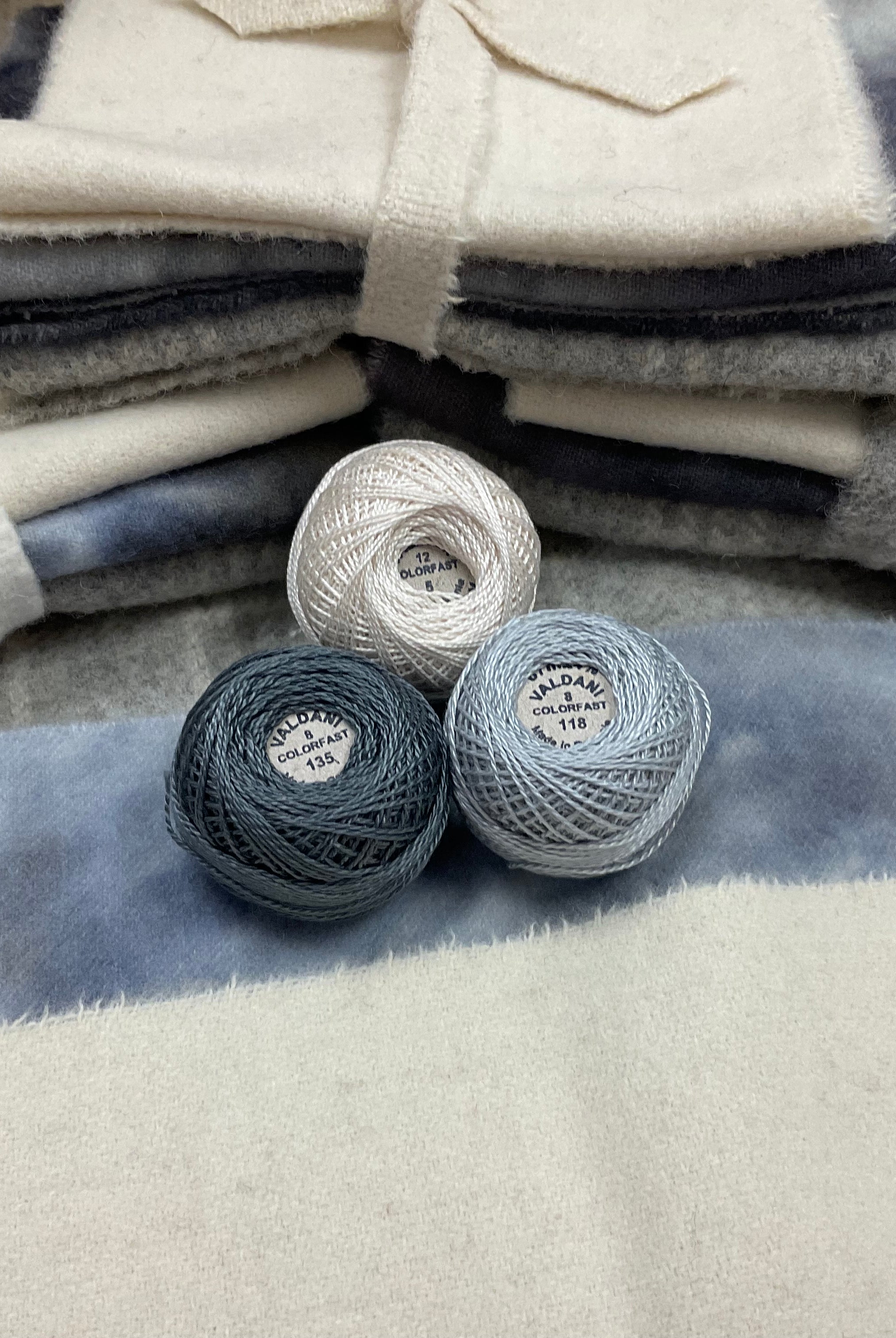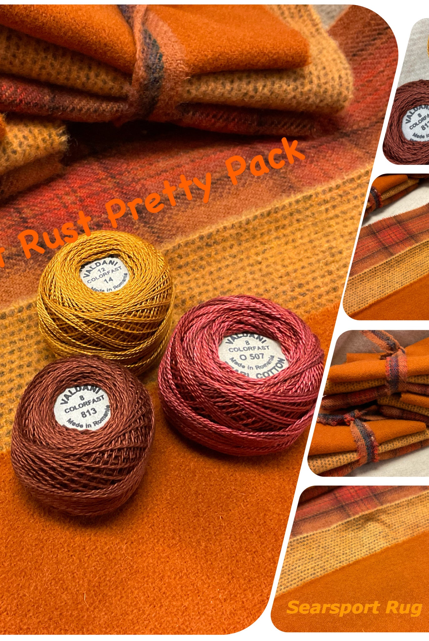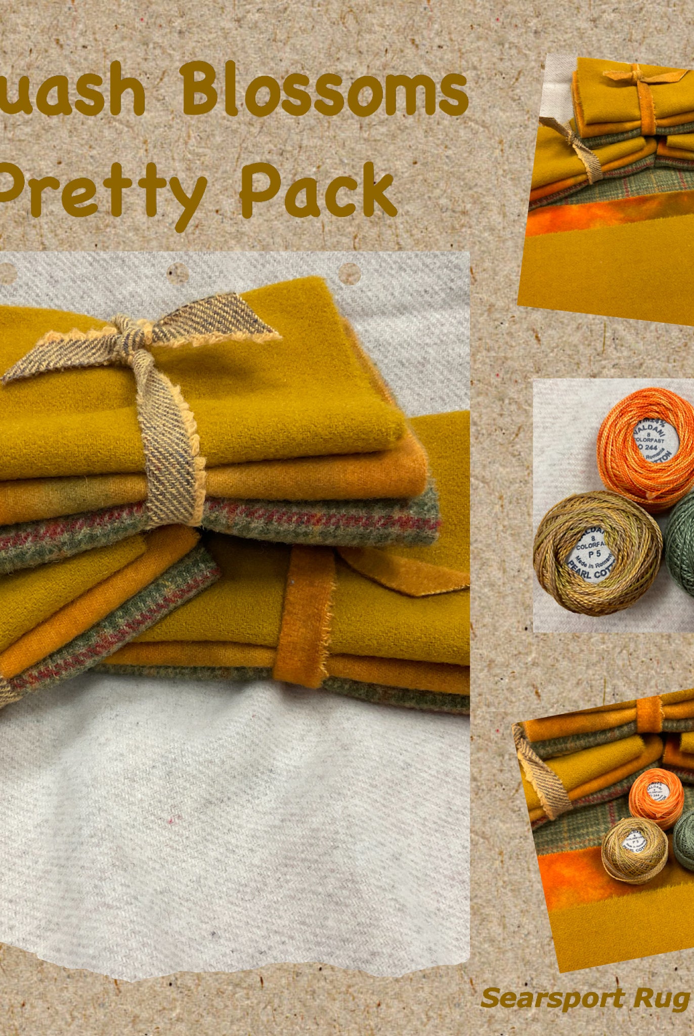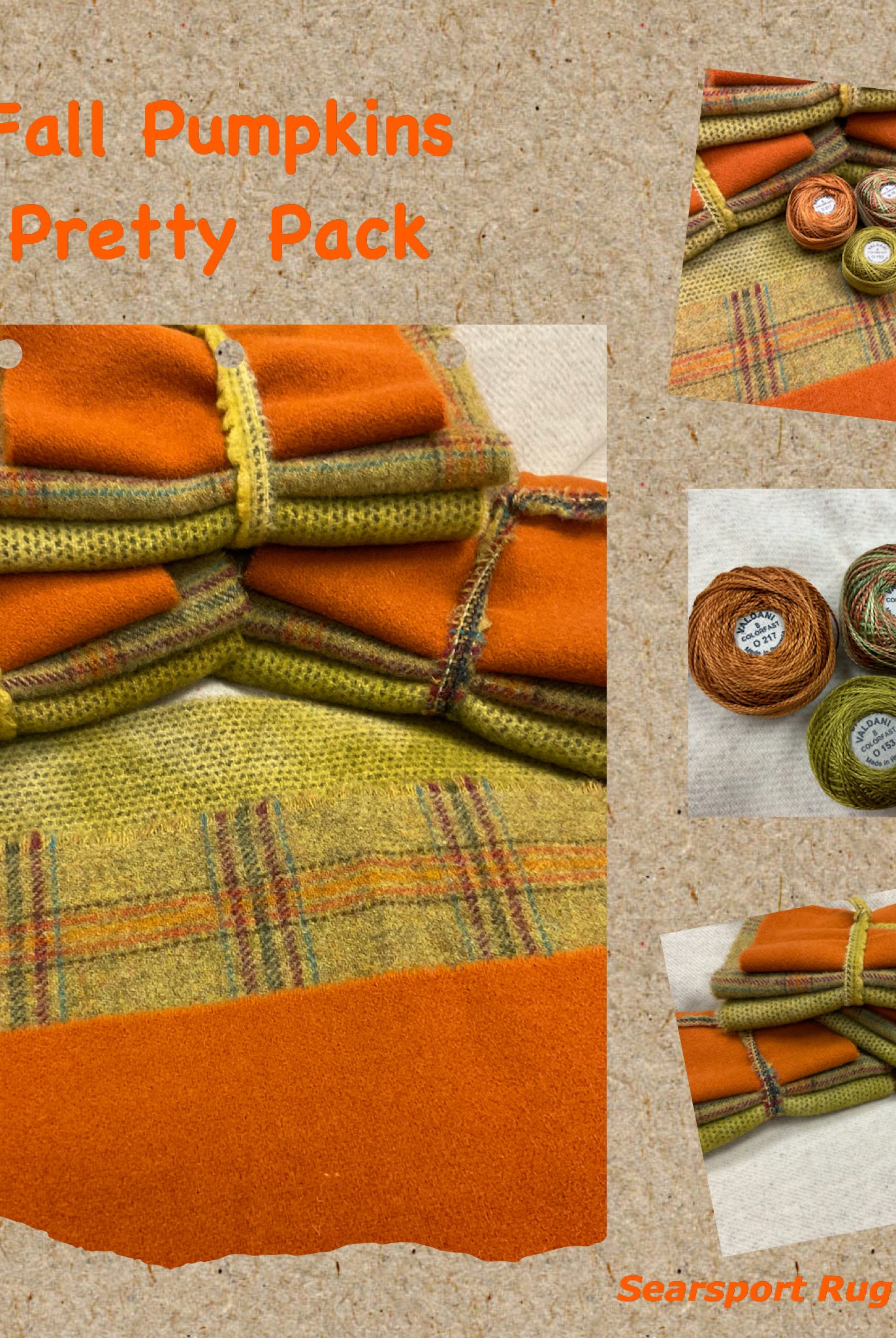 These fun bundles are all washed and ready to work with, they are a fat 1/16 of a washed as is wool 7.5x17, an over dyed wool roughly 7.5x17 and a solid 5.5x17 from the Rebekah Smith wools. We have picked 3 coordinating Vadani threads in #8 to go with your stitching if you like. Threads will be chosen to coordinate with the wools in the bundles.