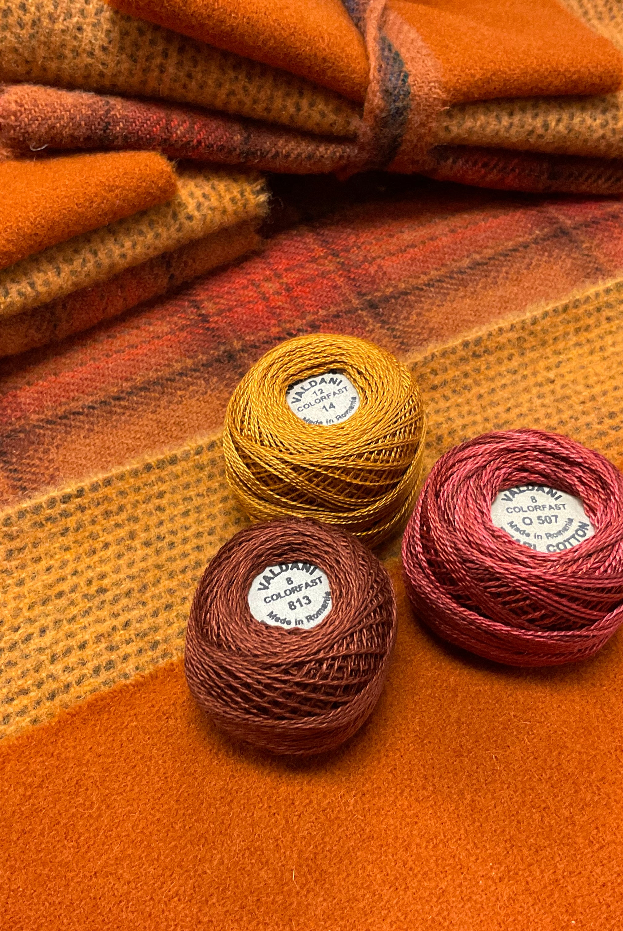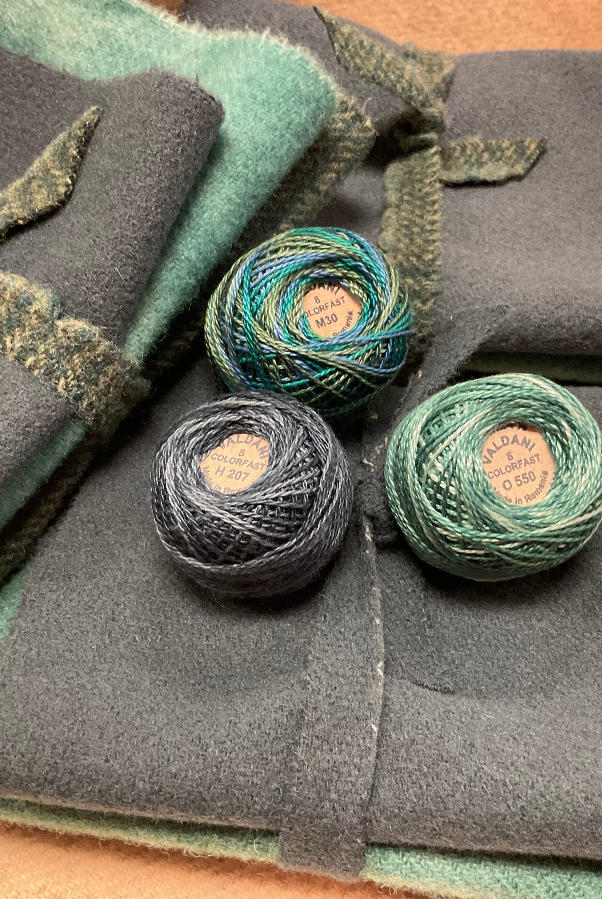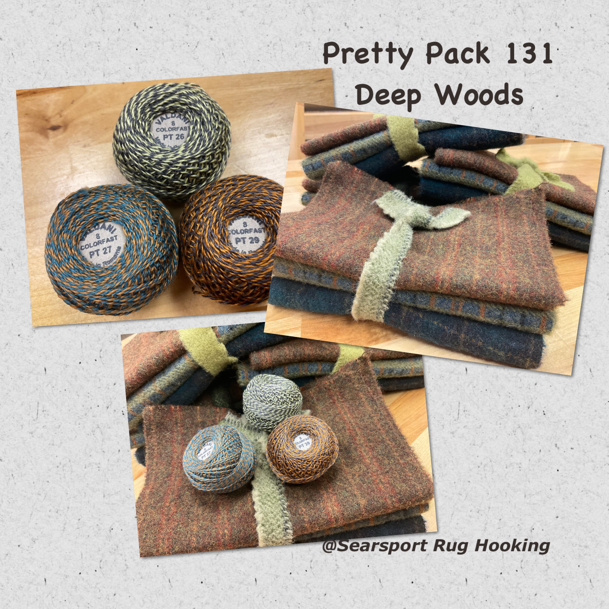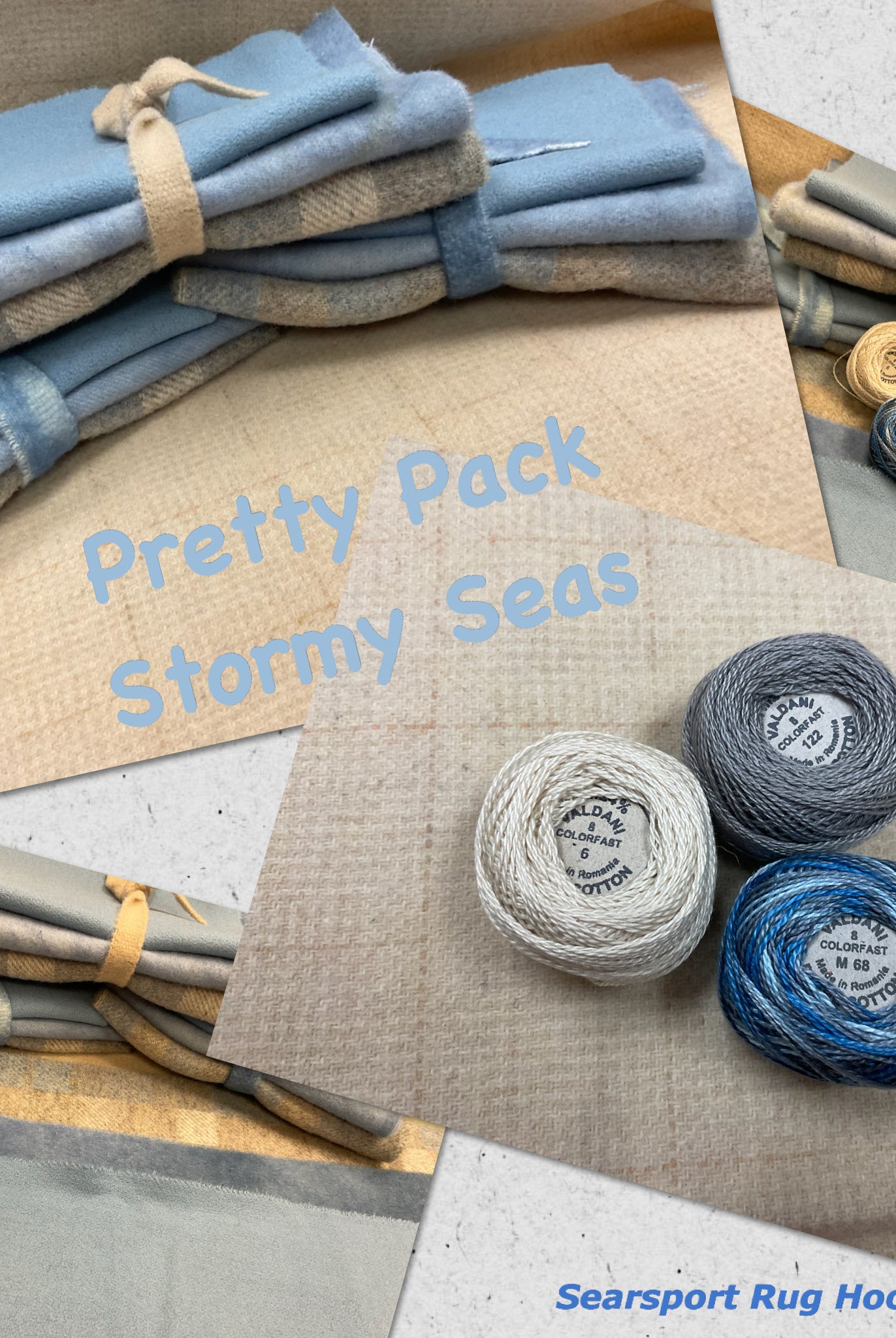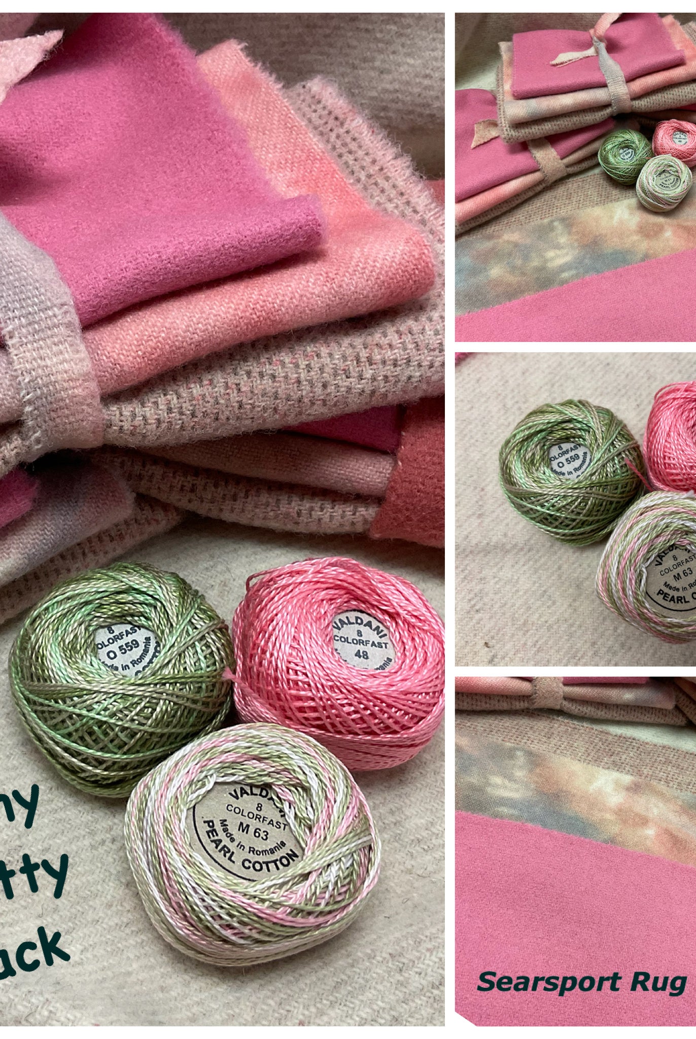 These fun bundles are all washed and ready to work with, they are a fat 1/16 of a washed as is wool 7.5x17, an over dyed wool roughly 7.5x17 and a solid 5.5x17 from the Rebekah Smith wools. We have picked 3 coordinating Vadani threads in #8 to go with your stitching if you like. Threads will be chosen to coordinate with the wools in the bundles.