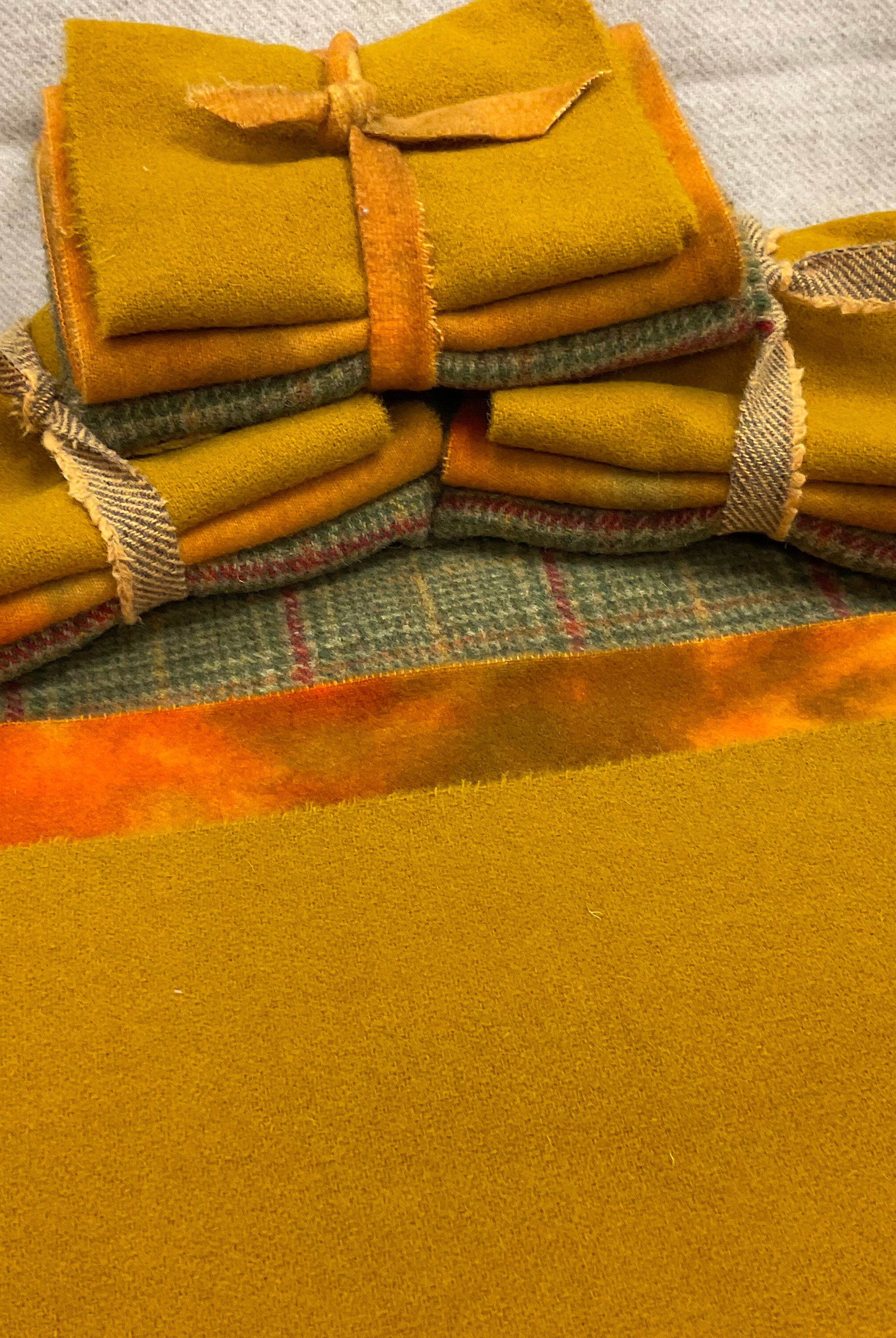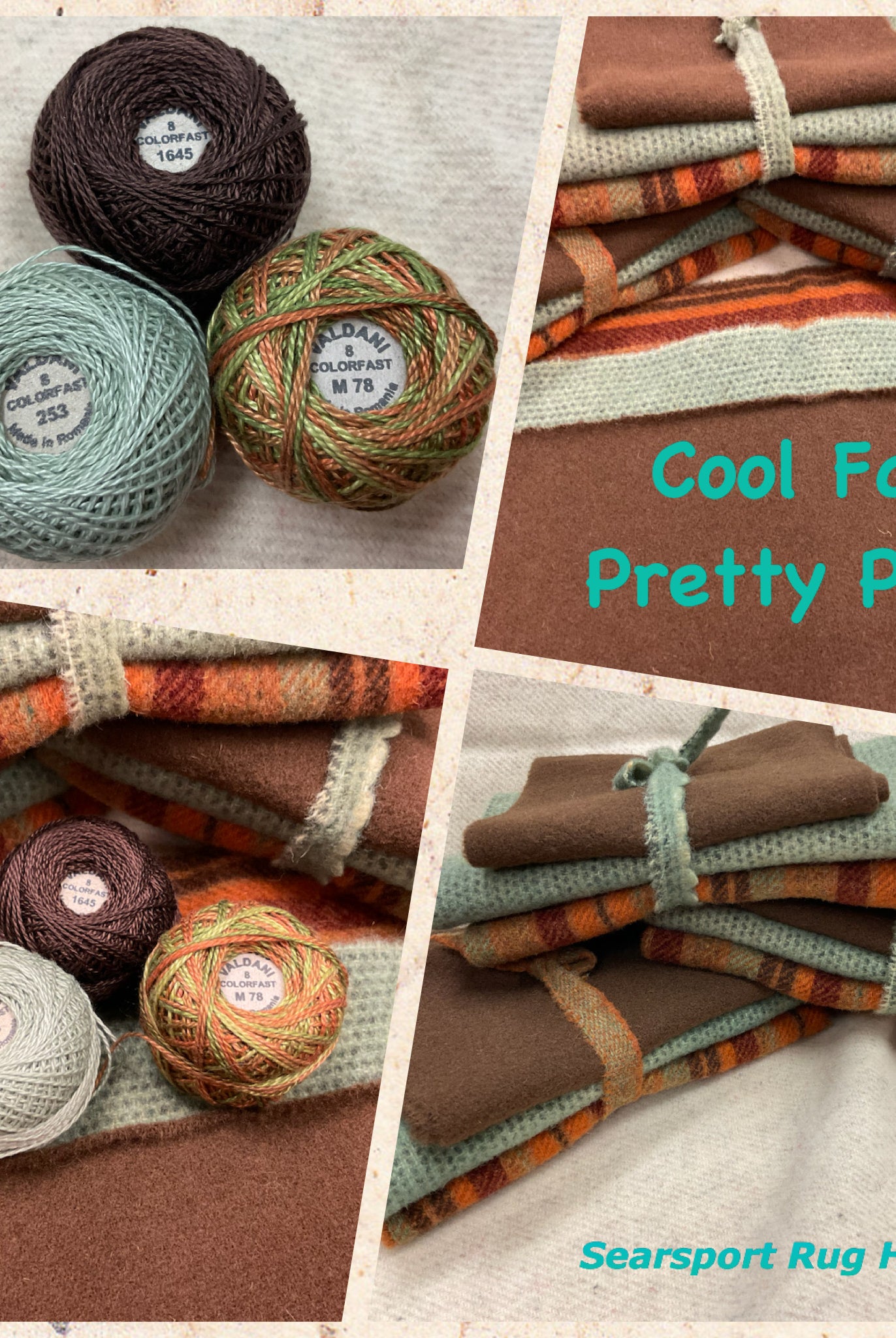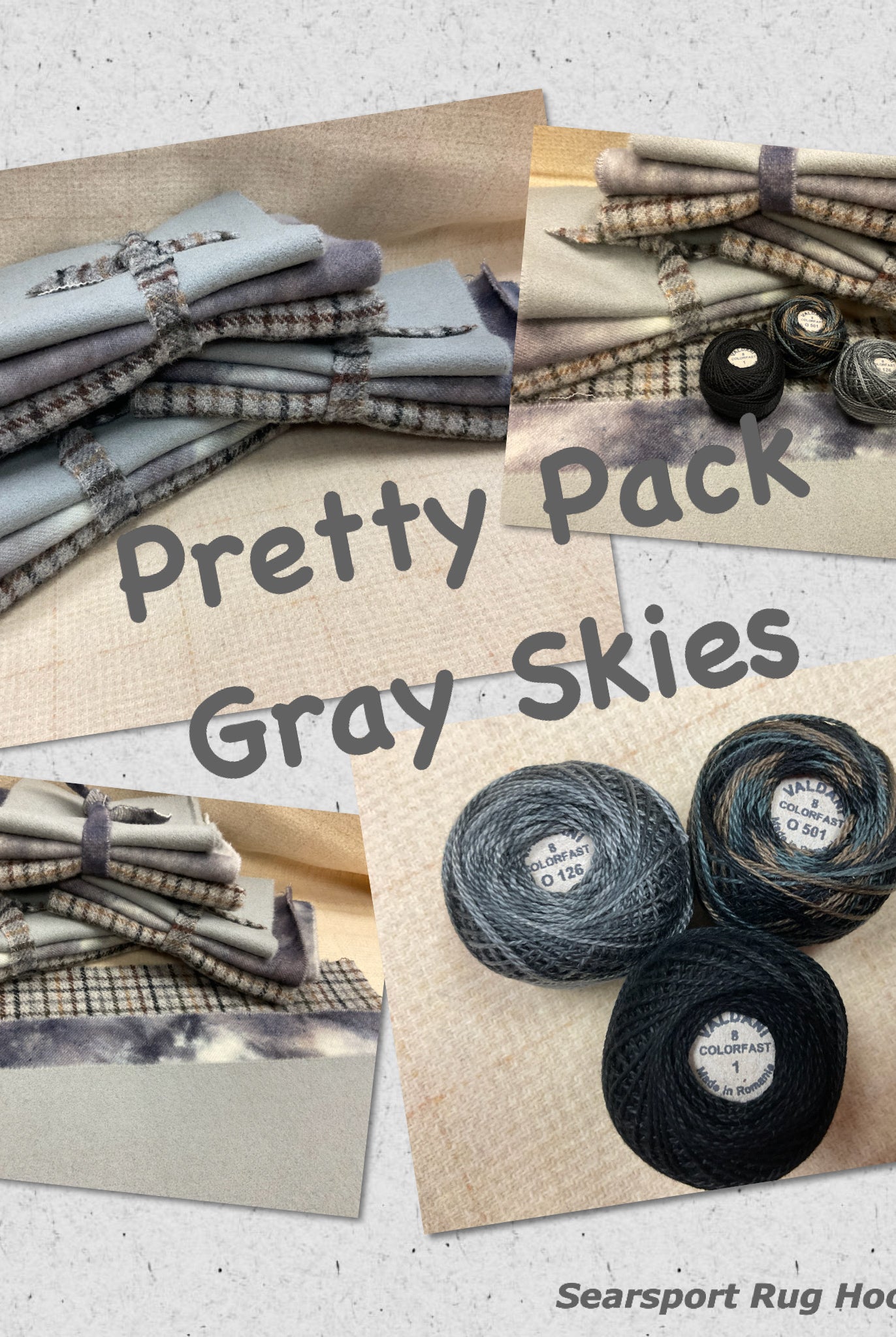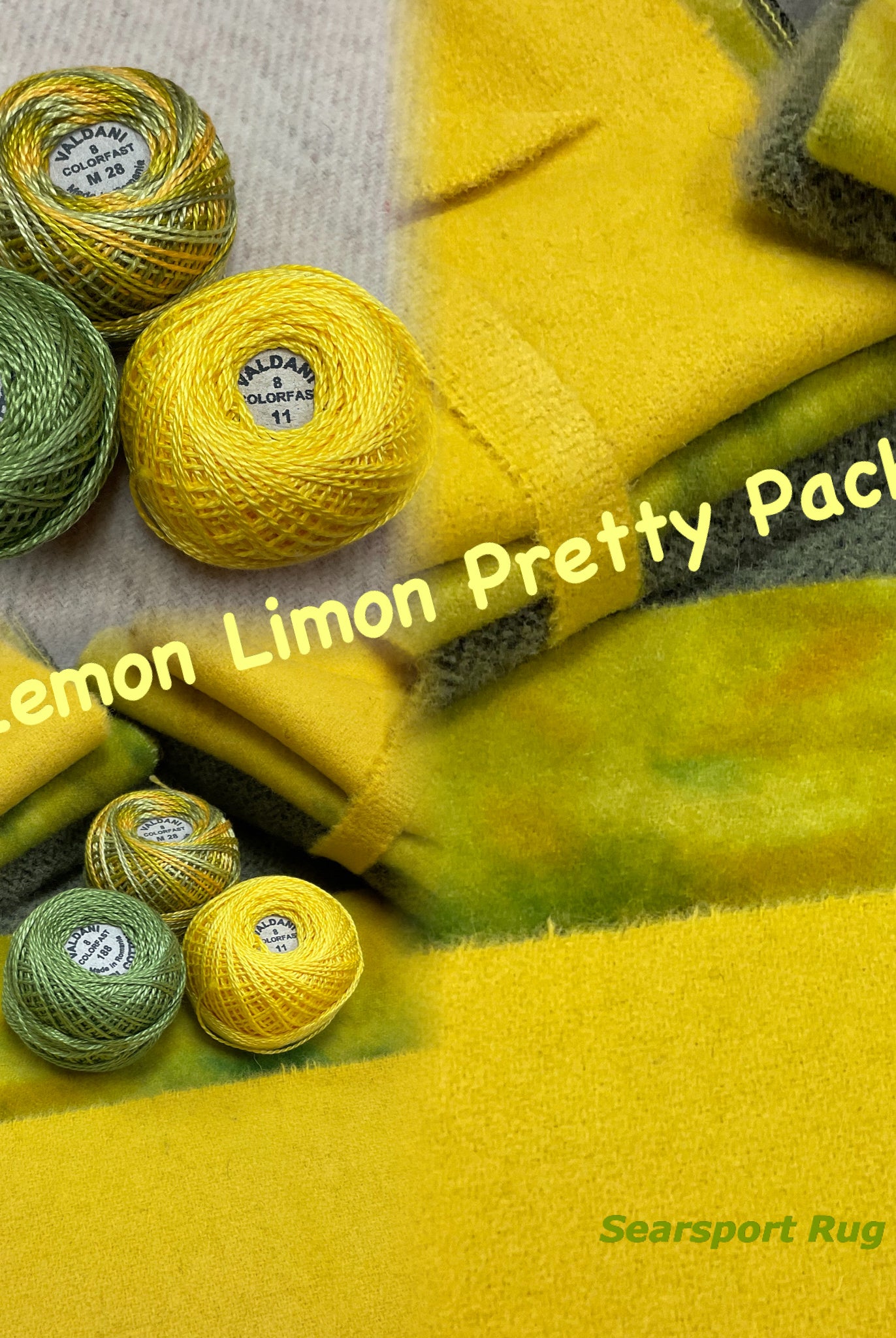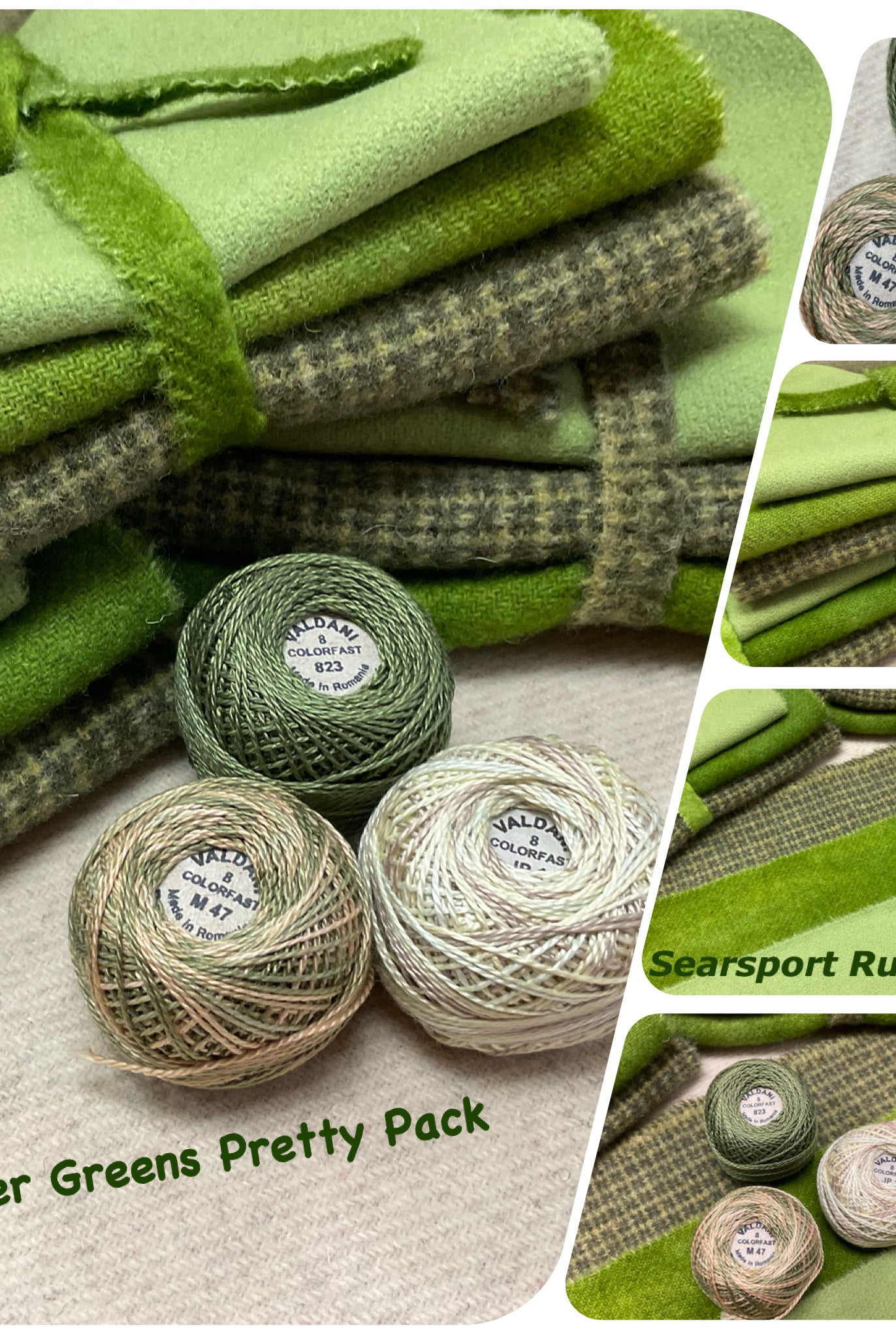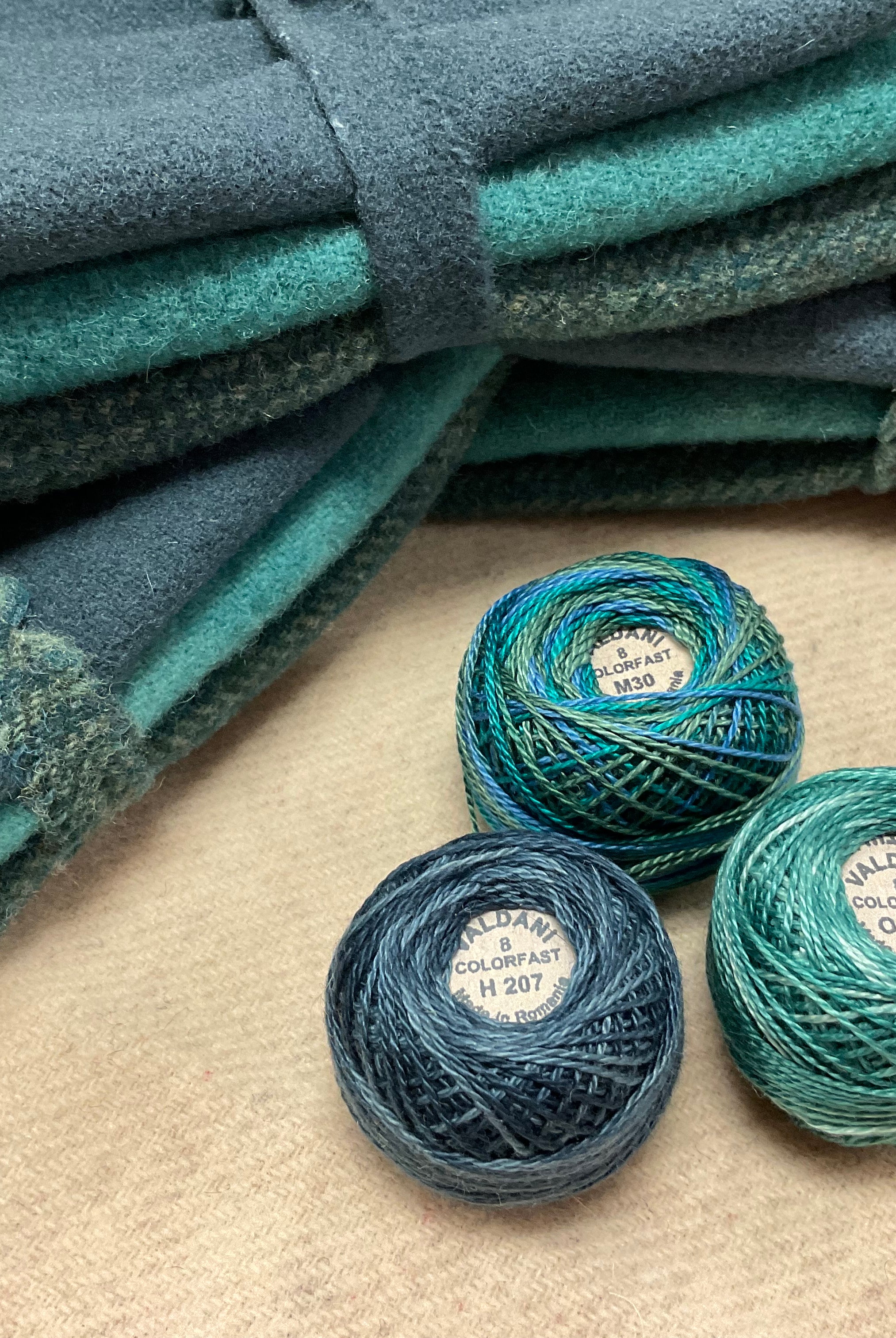 These fun bundles are all washed and ready to work with, they are a fat 1/16 of a washed as is wool 7.5x17, an over dyed wool roughly 7.5x17 and a solid 5.5x17 from the Rebekah Smith wools. We have picked 3 coordinating Vadani threads in #8 to go with your stitching if you like. Threads will be chosen to coordinate with the wools in the bundles.
