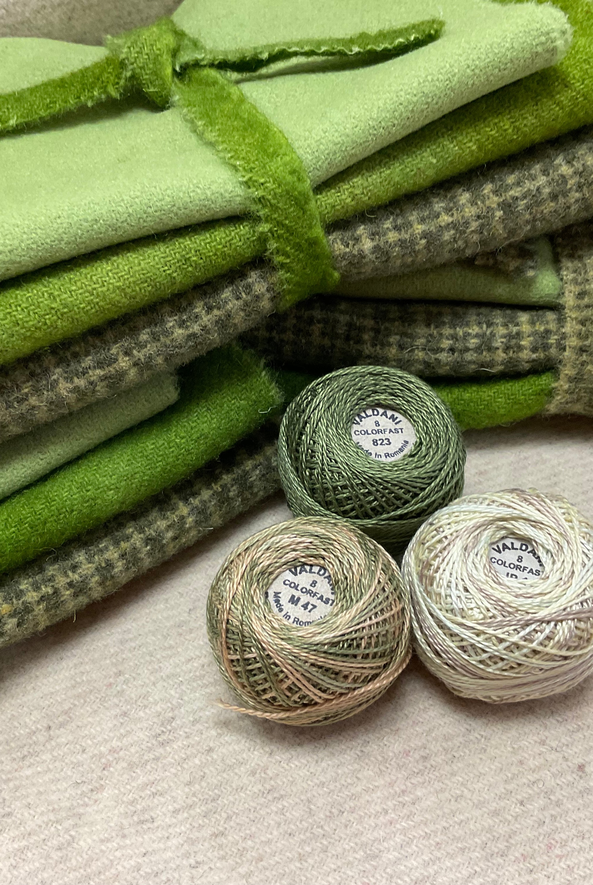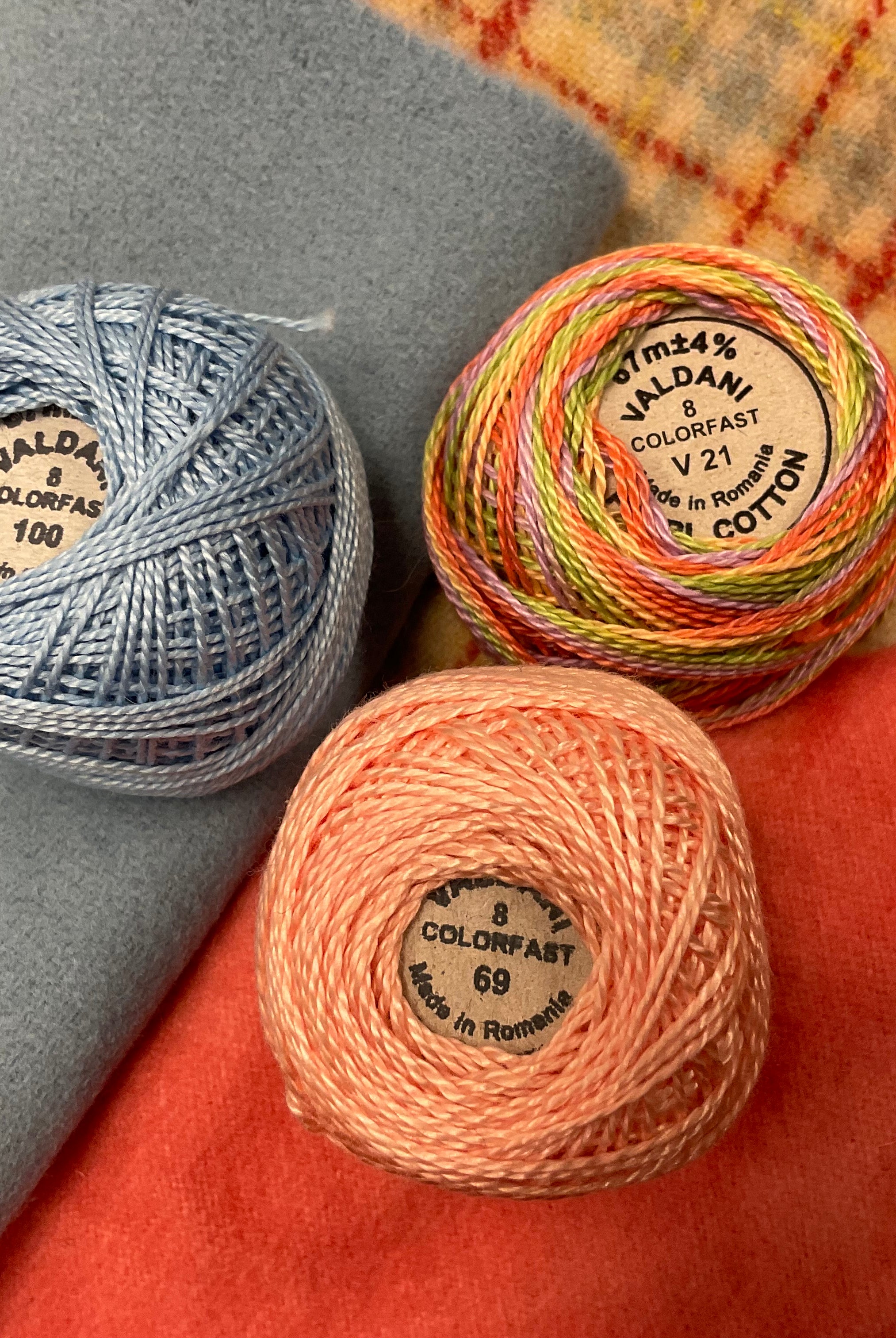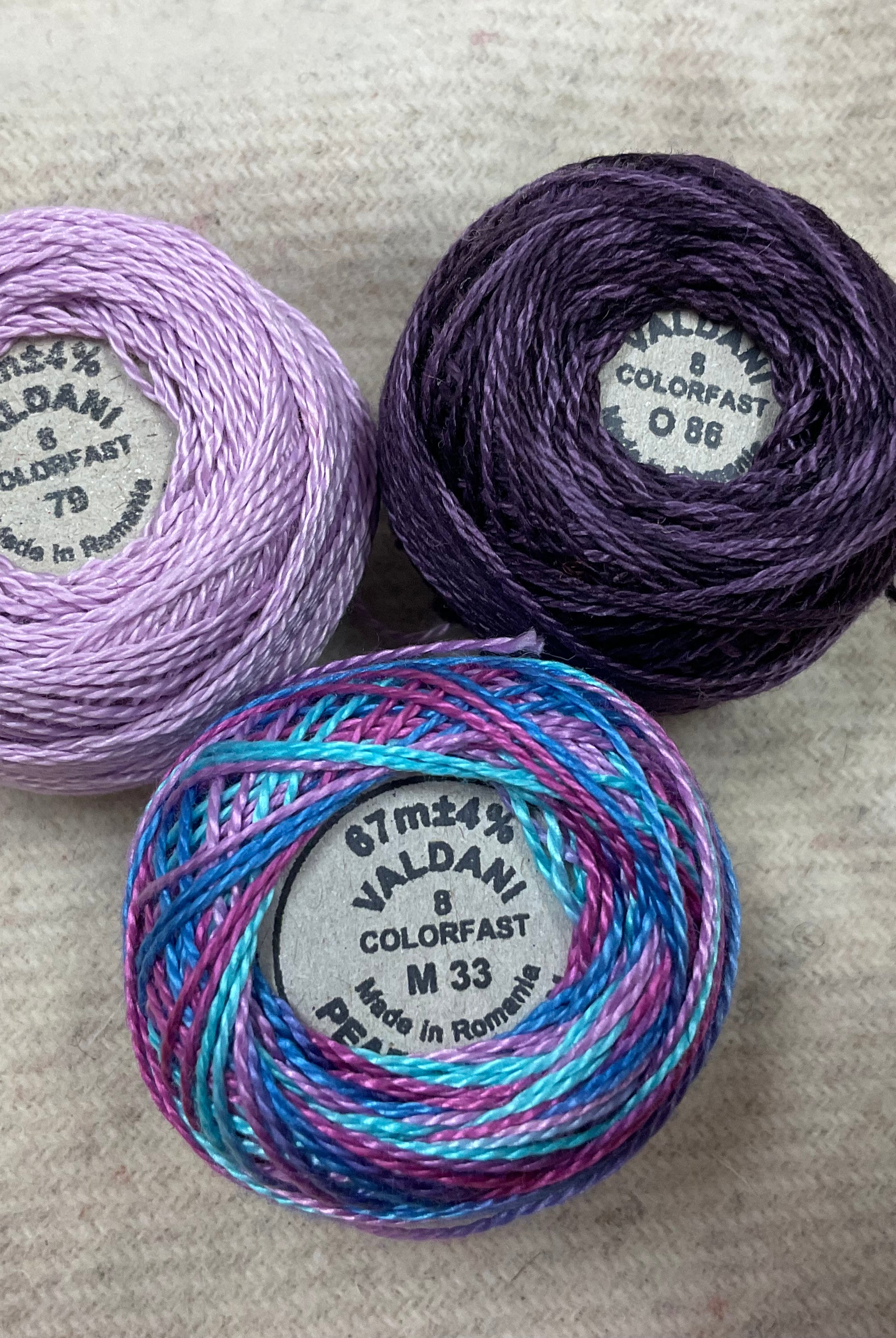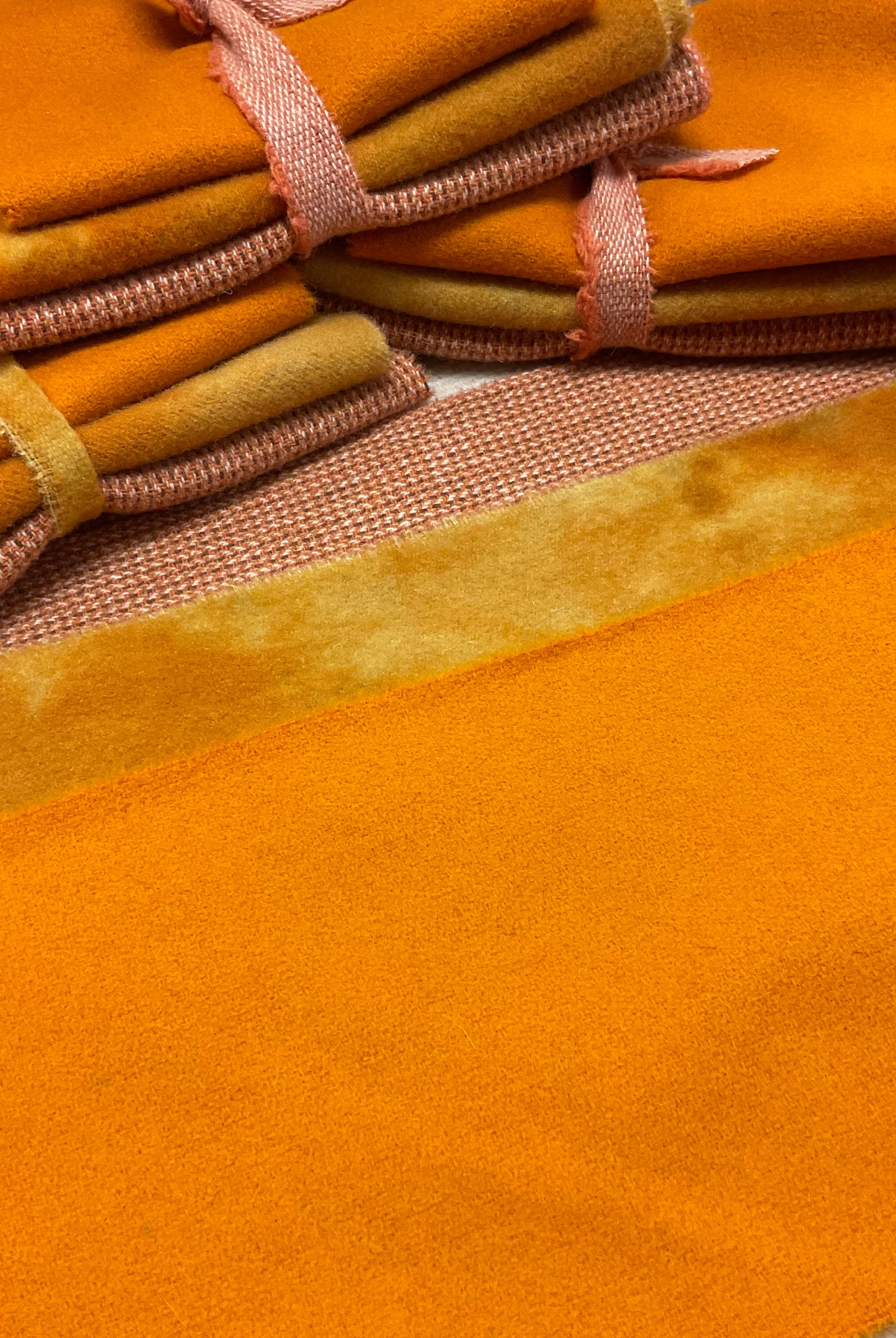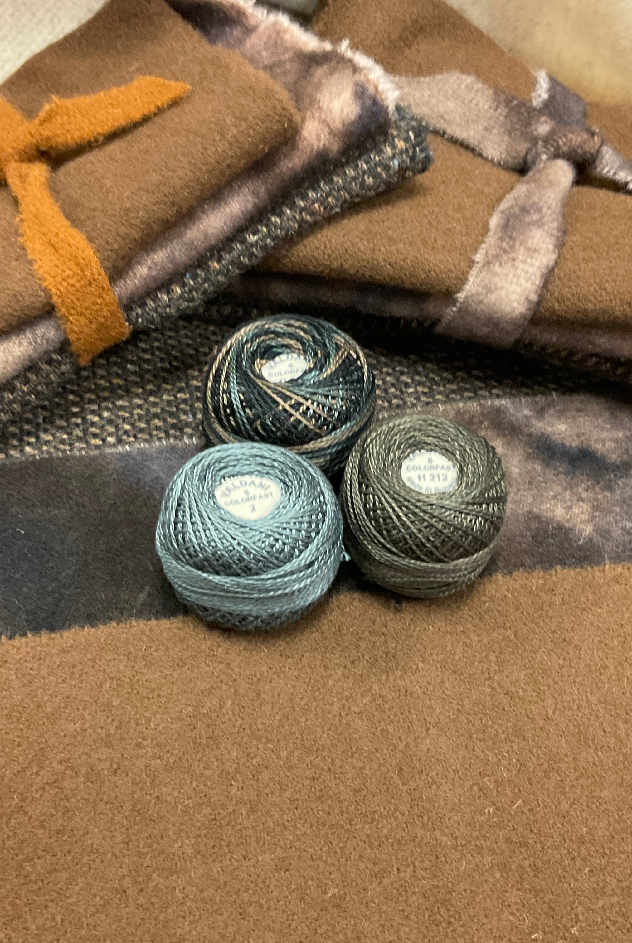 These fun bundles are all washed and ready to work with, they are a fat 1/16 of a washed as is wool 7.5x17, an over dyed wool roughly 7.5x17 and a solid 5.5x17 from the Rebekah Smith wools. We have picked 3 coordinating Vadani threads in #8 to go with your stitching if you like. Threads will be chosen to coordinate with the wools in the bundles.