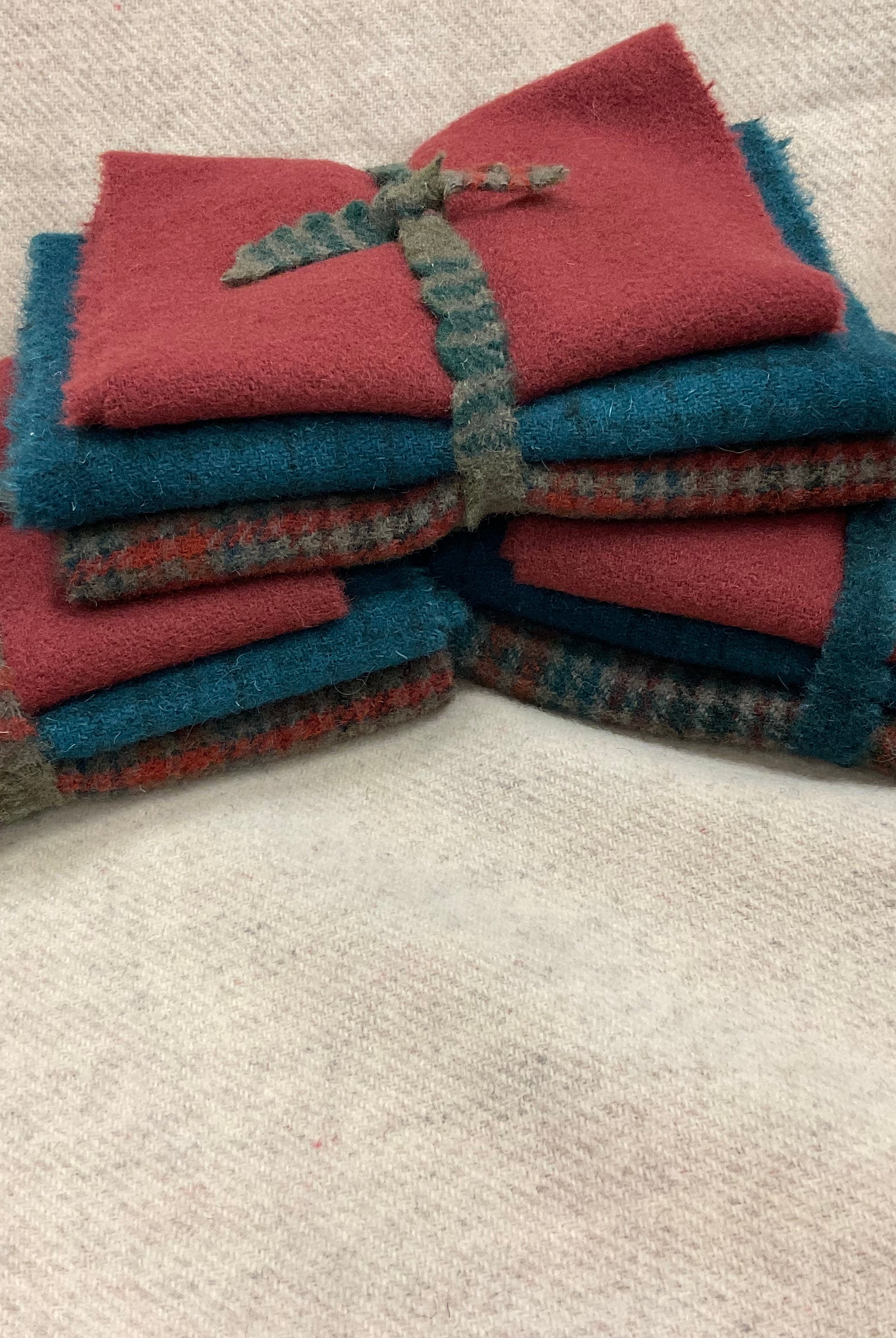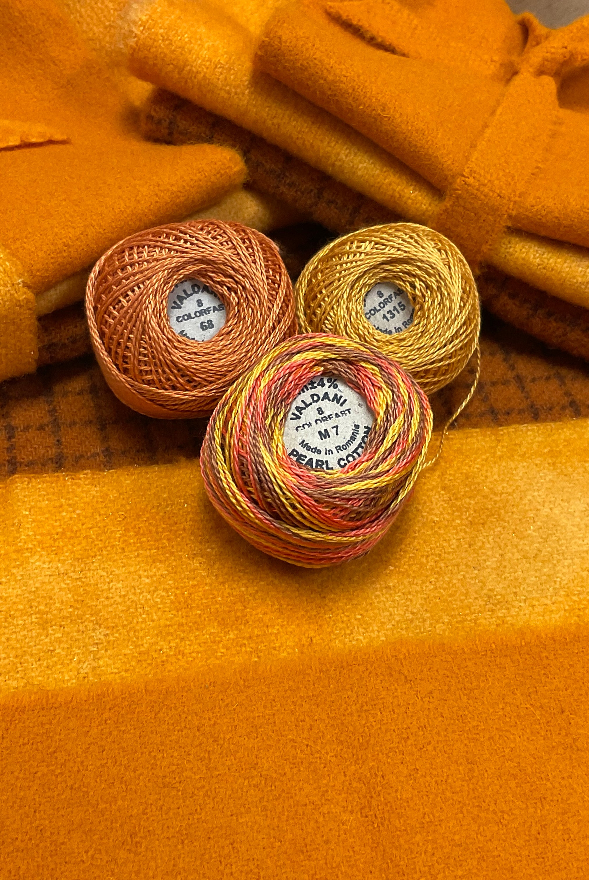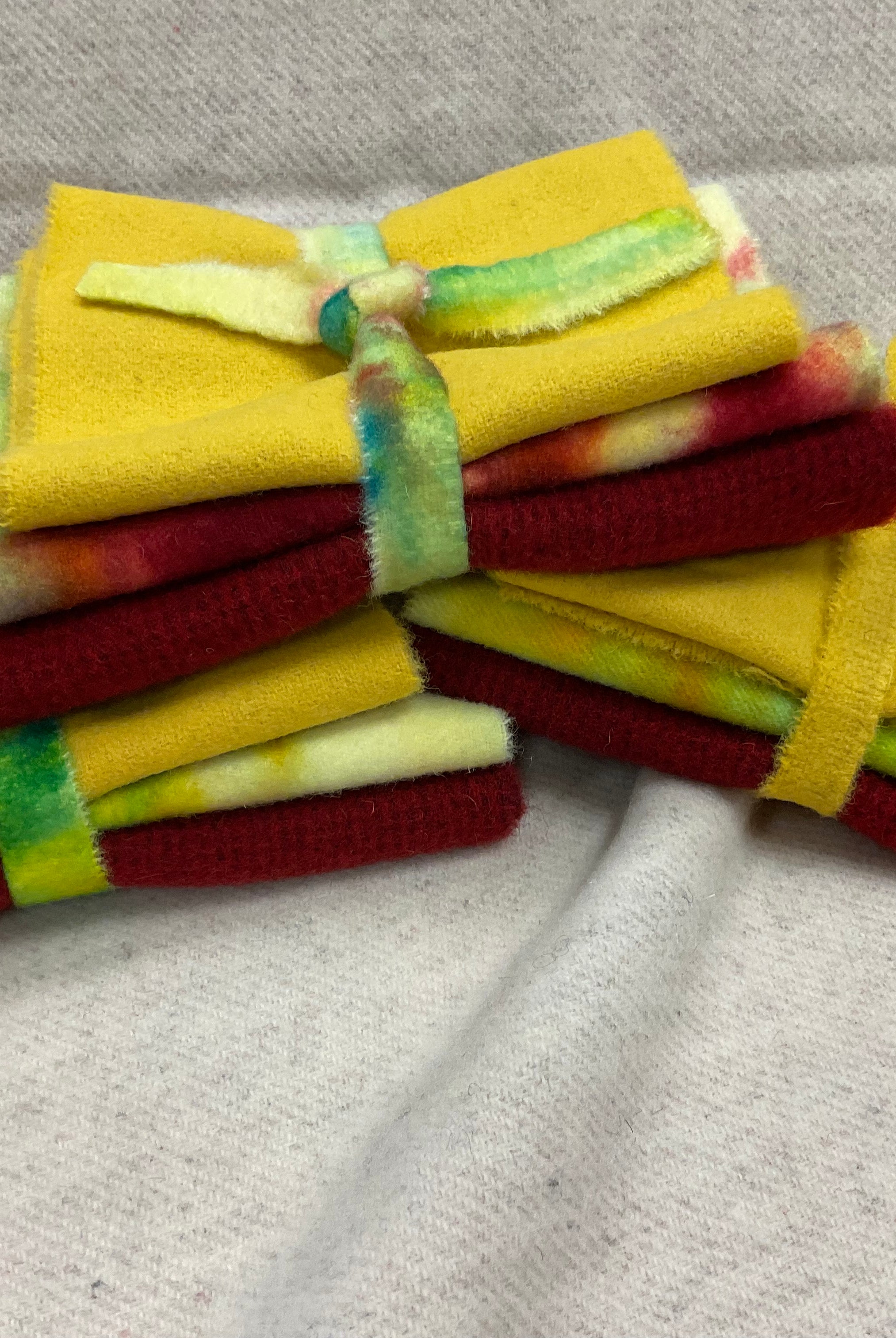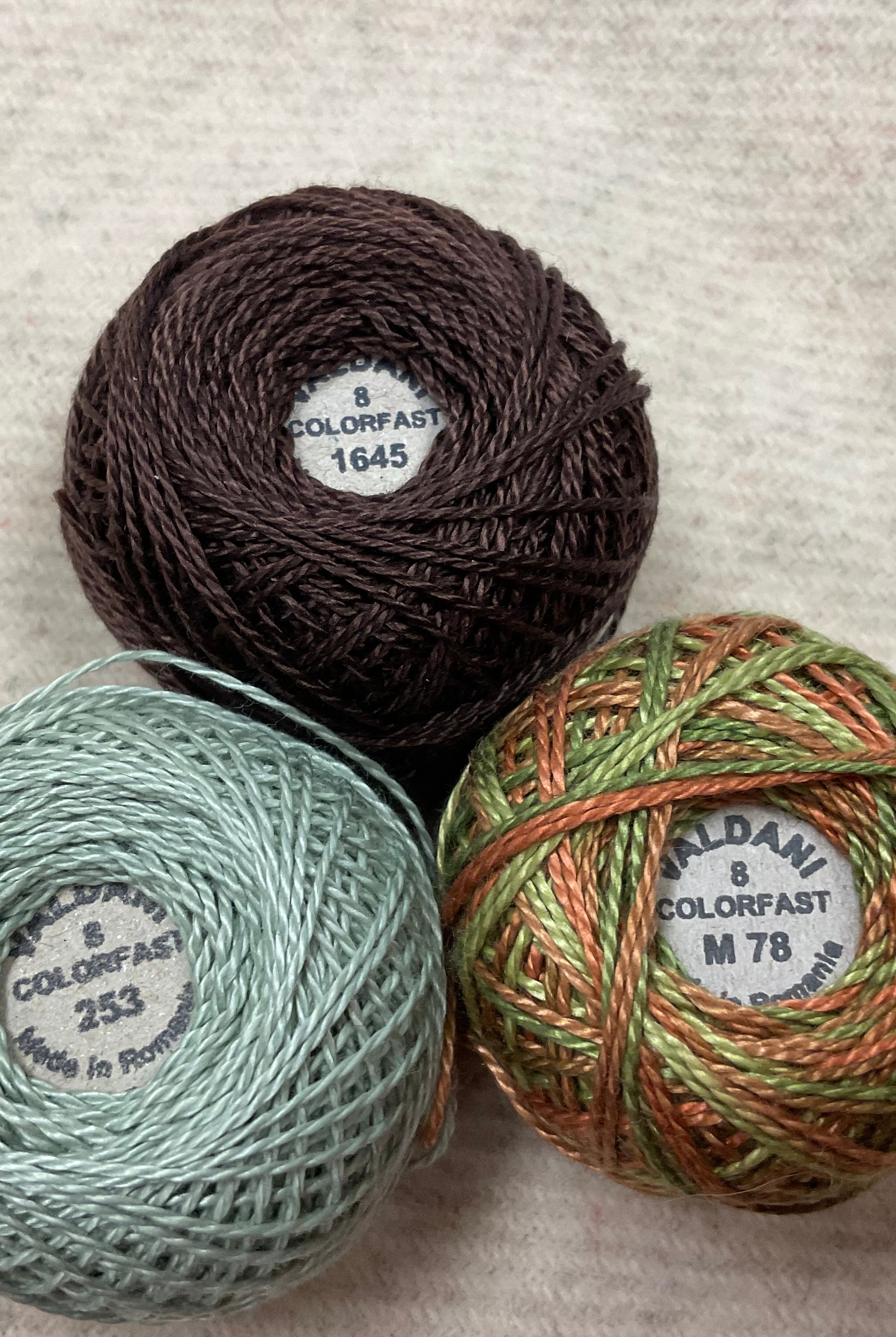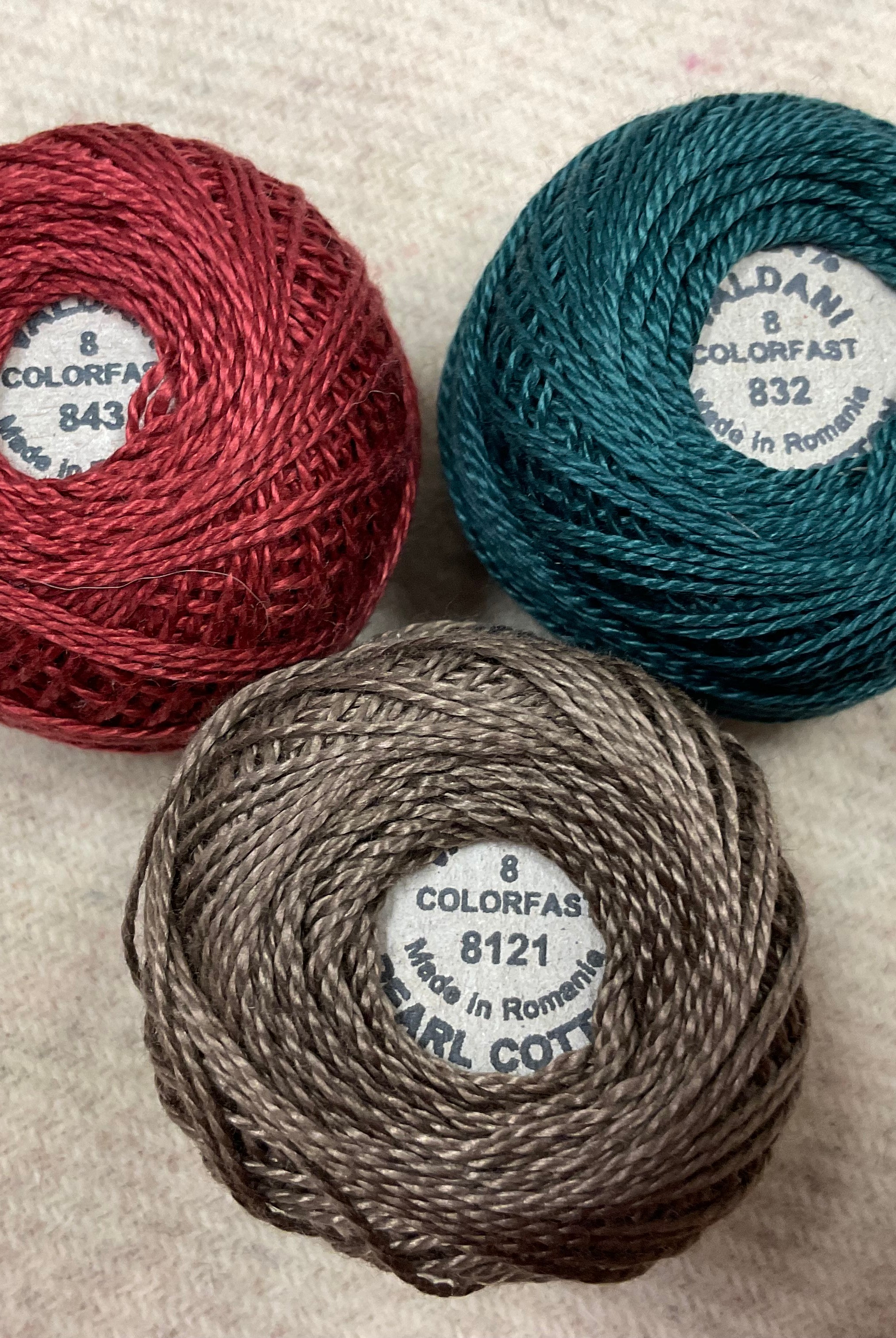 These fun bundles are all washed and ready to work with, they are a fat 1/16 of a washed as is wool 7.5x17, an over dyed wool roughly 7.5x17 and a solid 5.5x17 from the Rebekah Smith wools. We have picked 3 coordinating Vadani threads in #8 to go with your stitching if you like. Threads will be chosen to coordinate with the wools in the bundles.