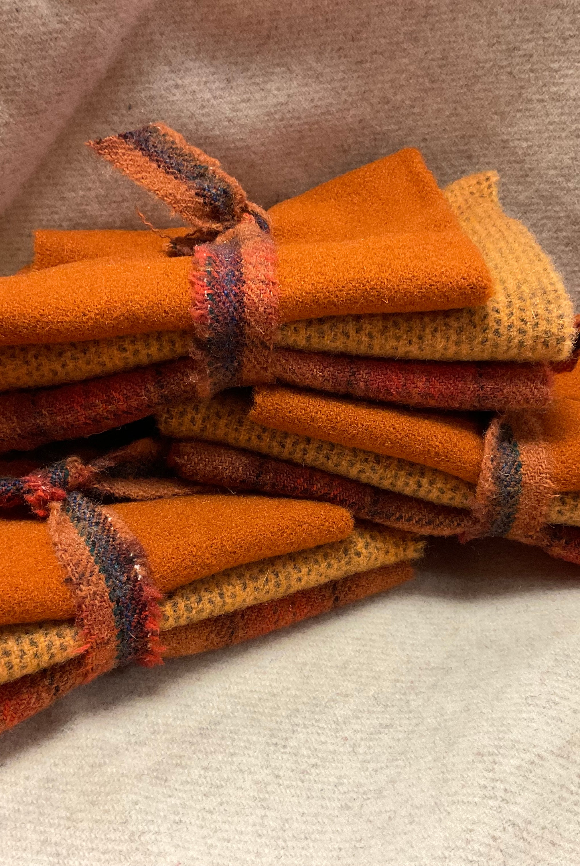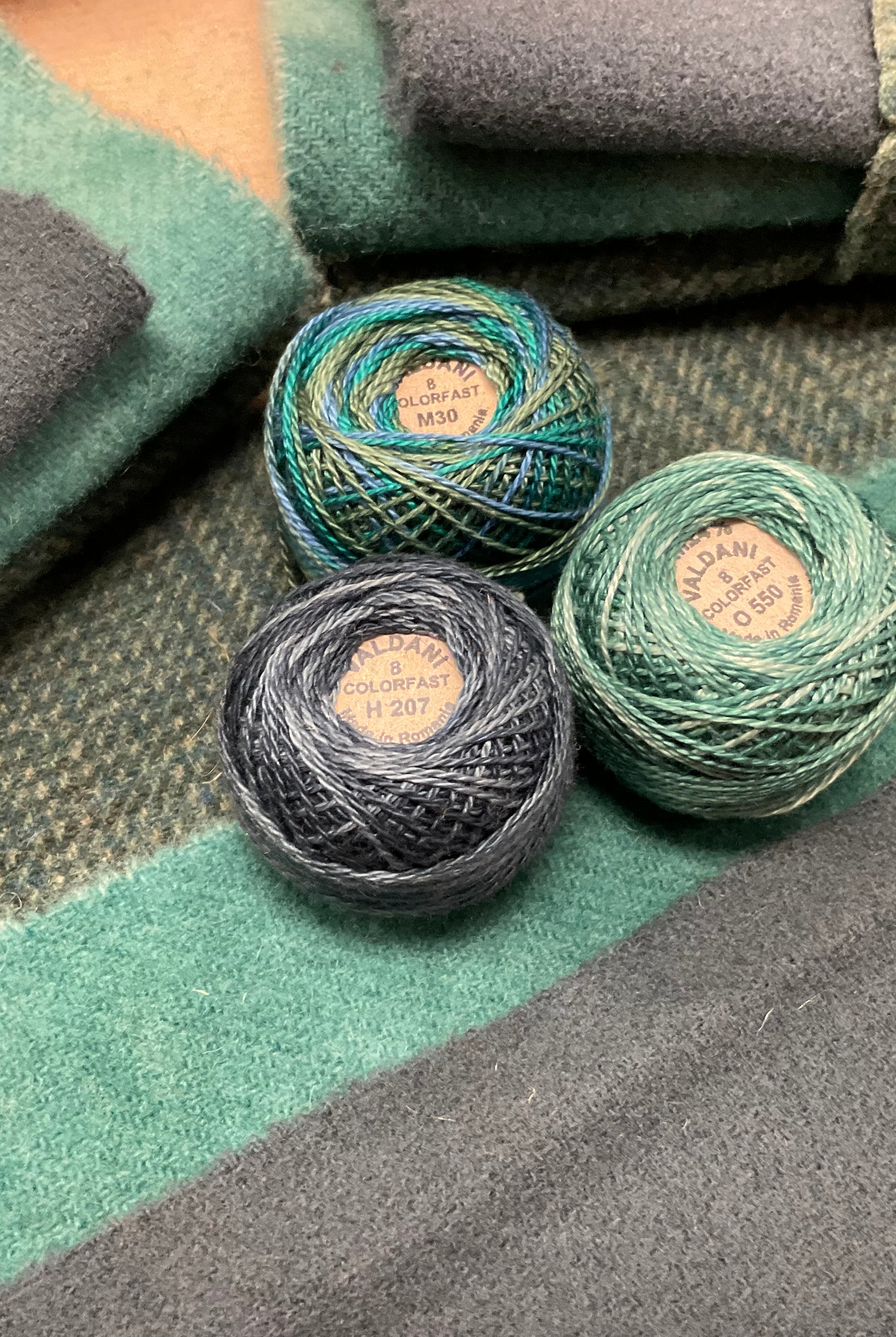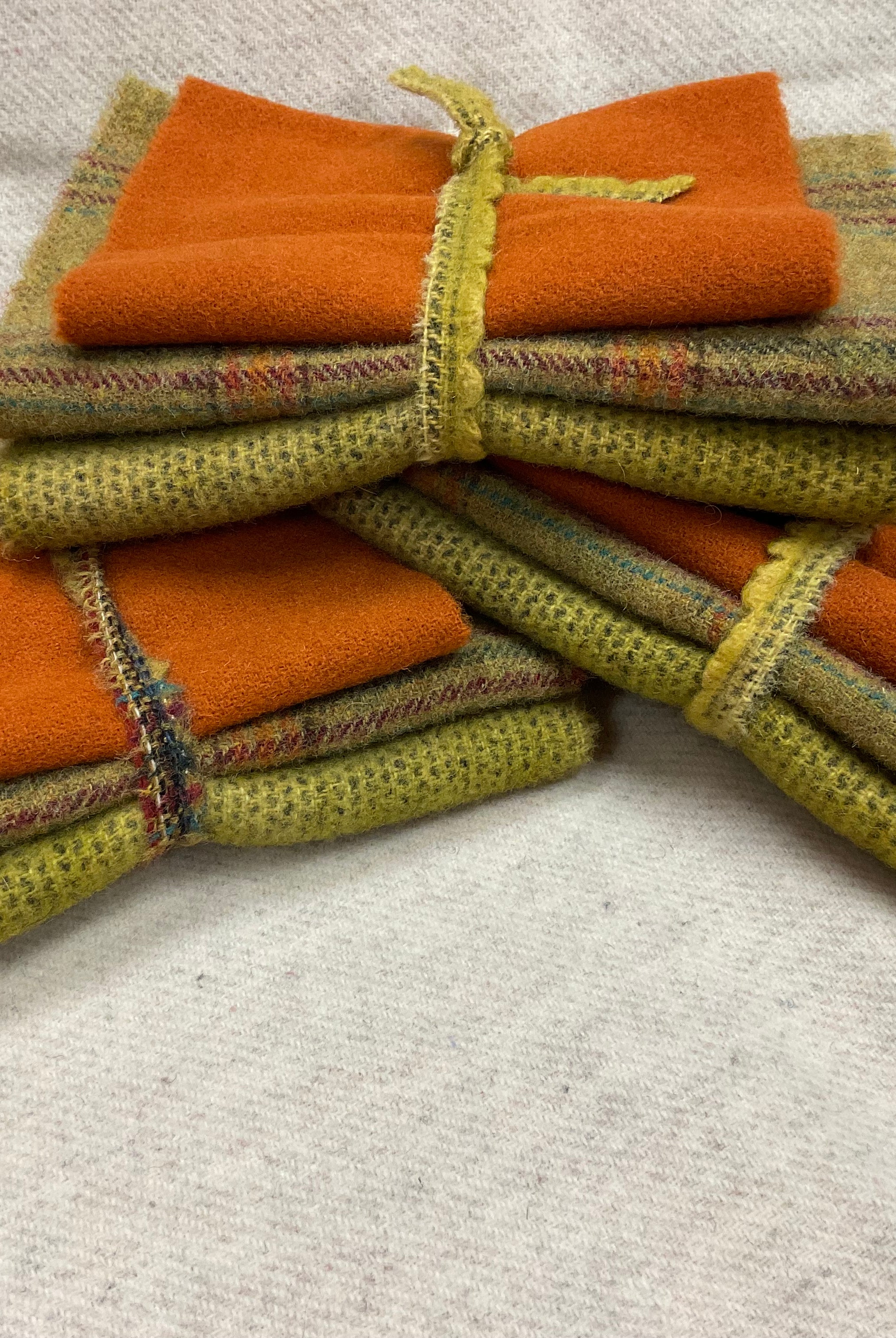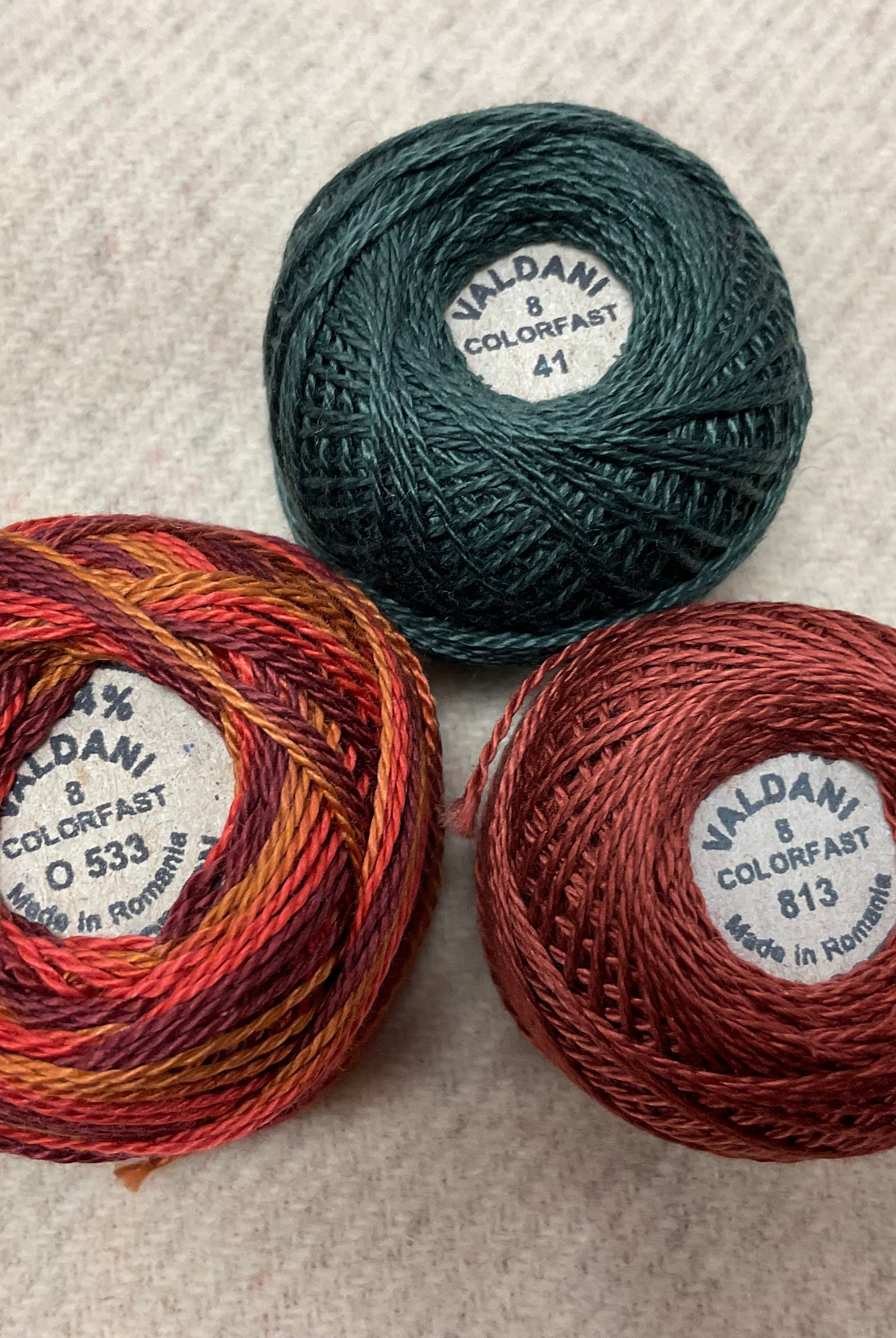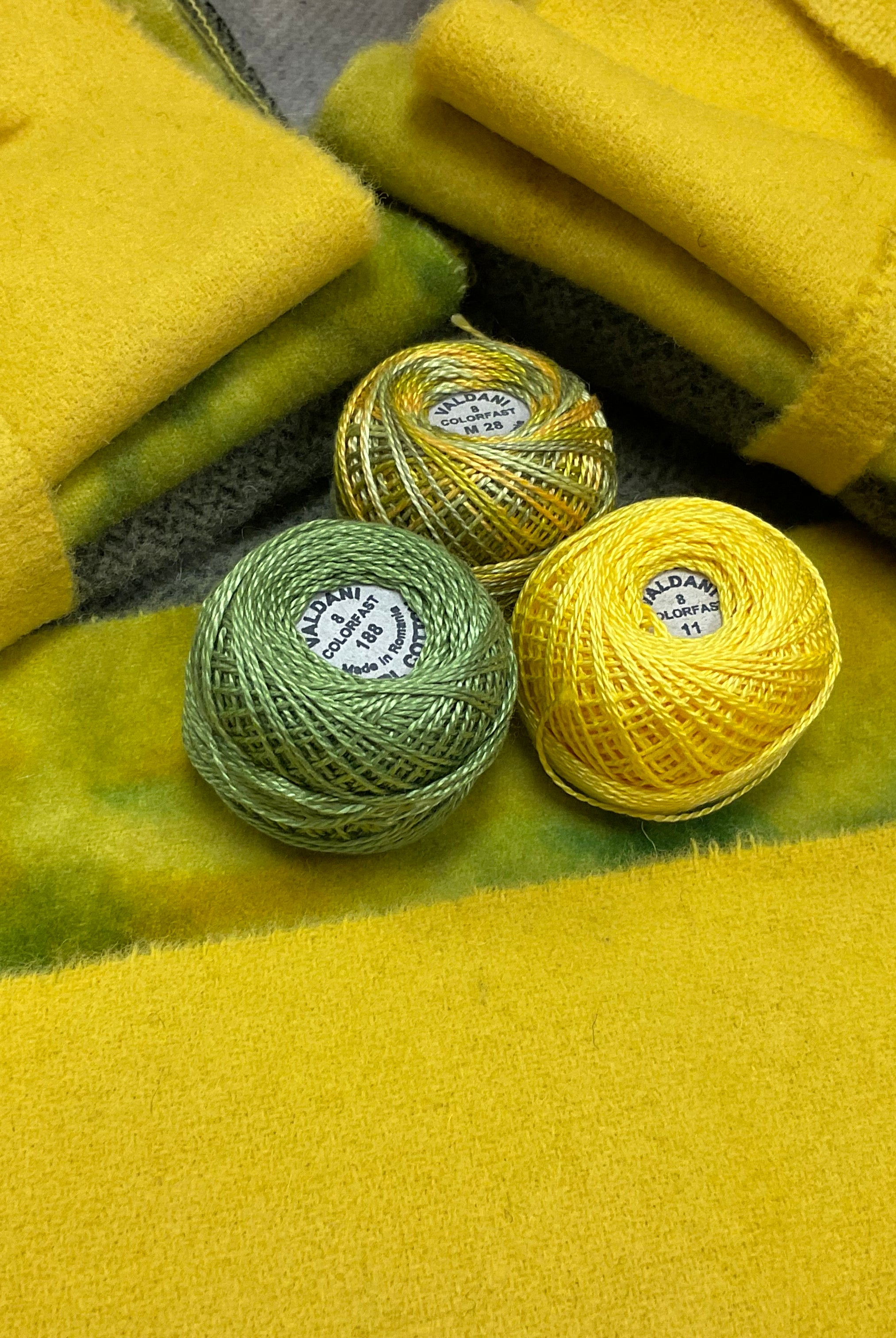 These fun bundles are all washed and ready to work with, they are a fat 1/16 of a washed as is wool 7.5x17, an over dyed wool roughly 7.5x17 and a solid 5.5x17 from the Rebekah Smith wools. We have picked 3 coordinating Vadani threads in #8 to go with your stitching if you like. Threads will be chosen to coordinate with the wools in the bundles.