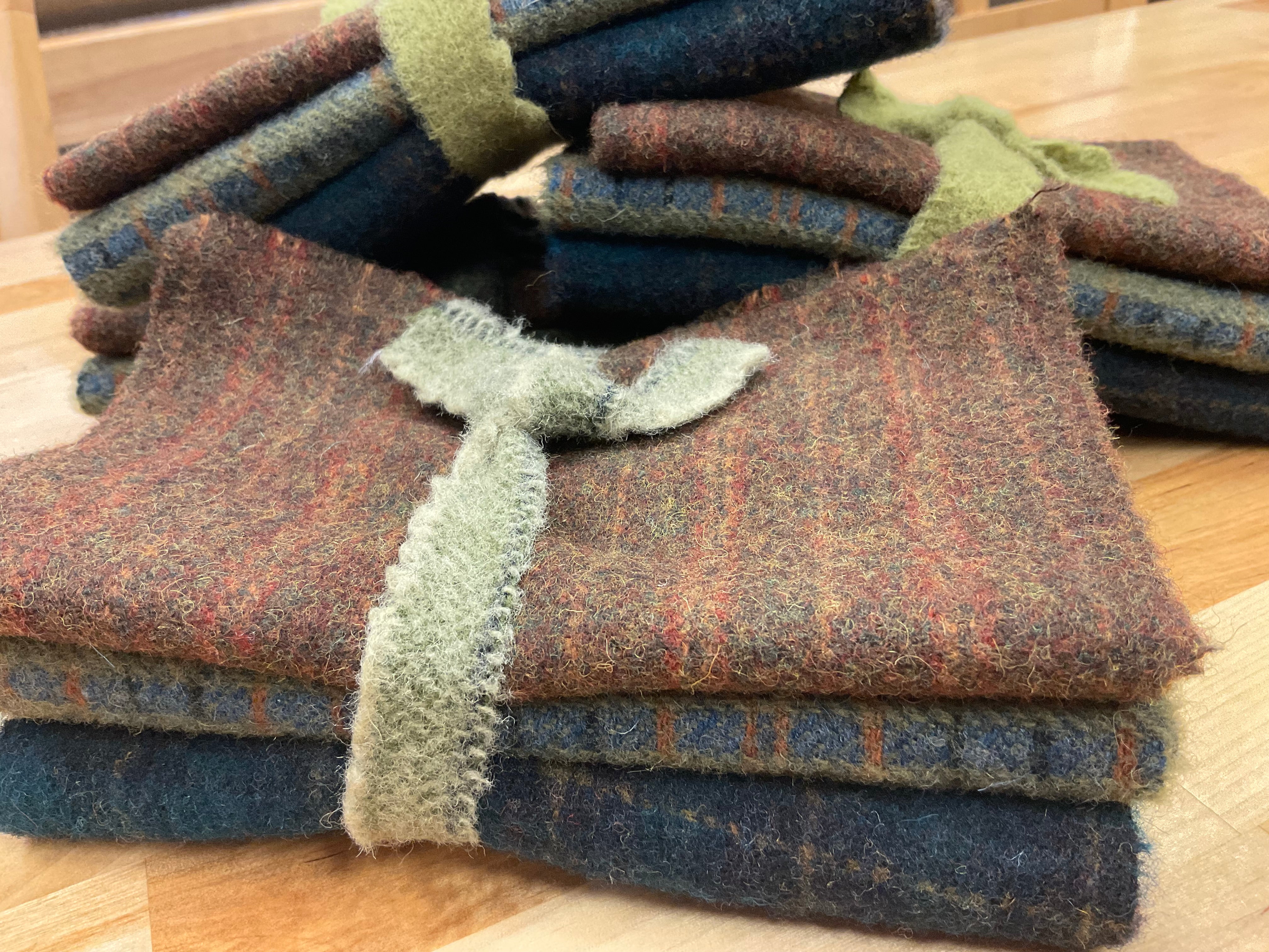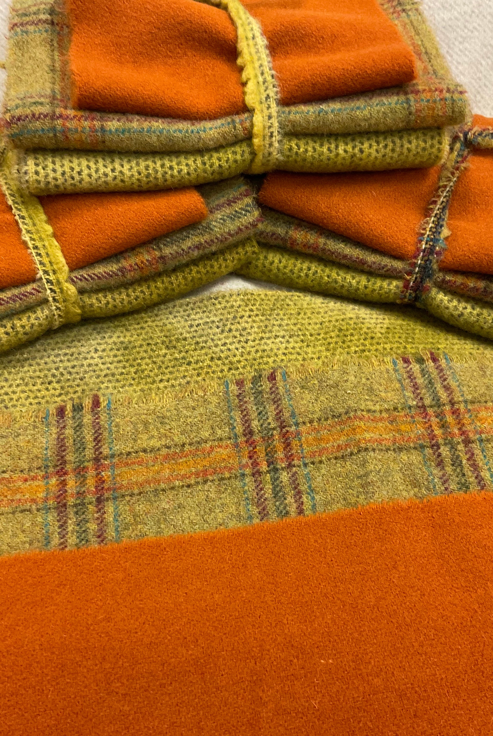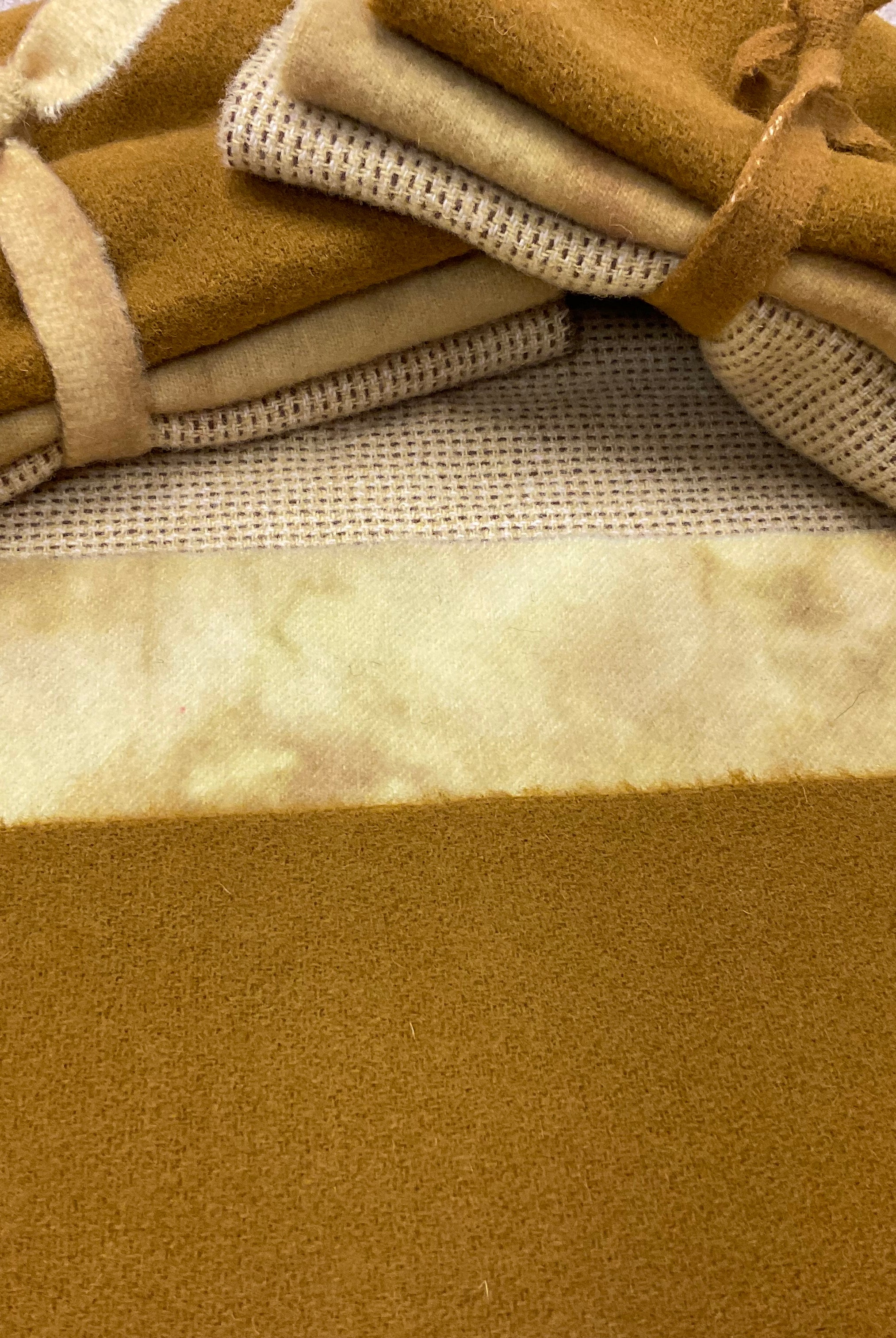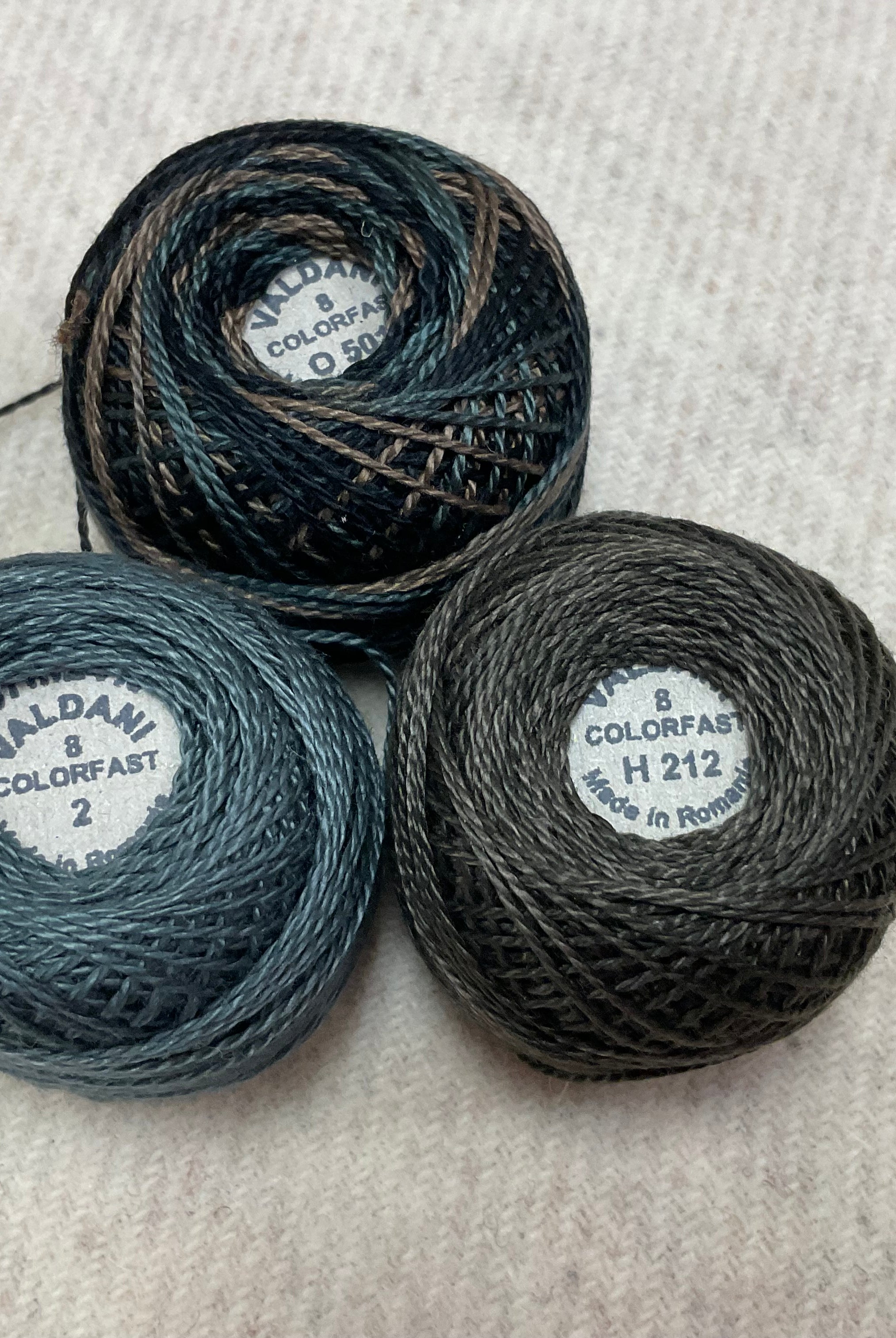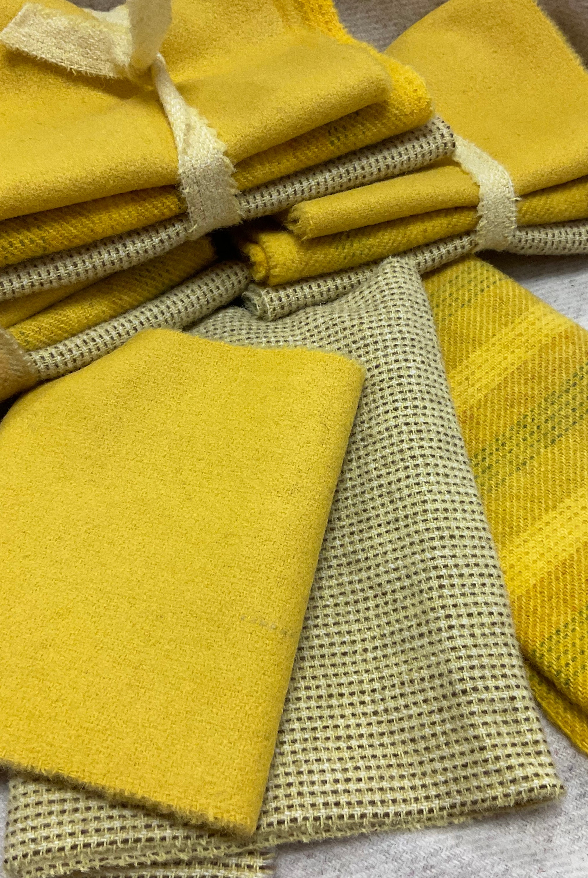 These fun bundles are all washed and ready to work with, they are a fat 1/16 of a washed as is wool 7.5x17, an over dyed wool roughly 7.5x17 and a solid 5.5x17 from the Rebekah Smith wools. We have picked 3 coordinating Vadani threads in #8 to go with your stitching if you like. Threads will be chosen to coordinate with the wools in the bundles.