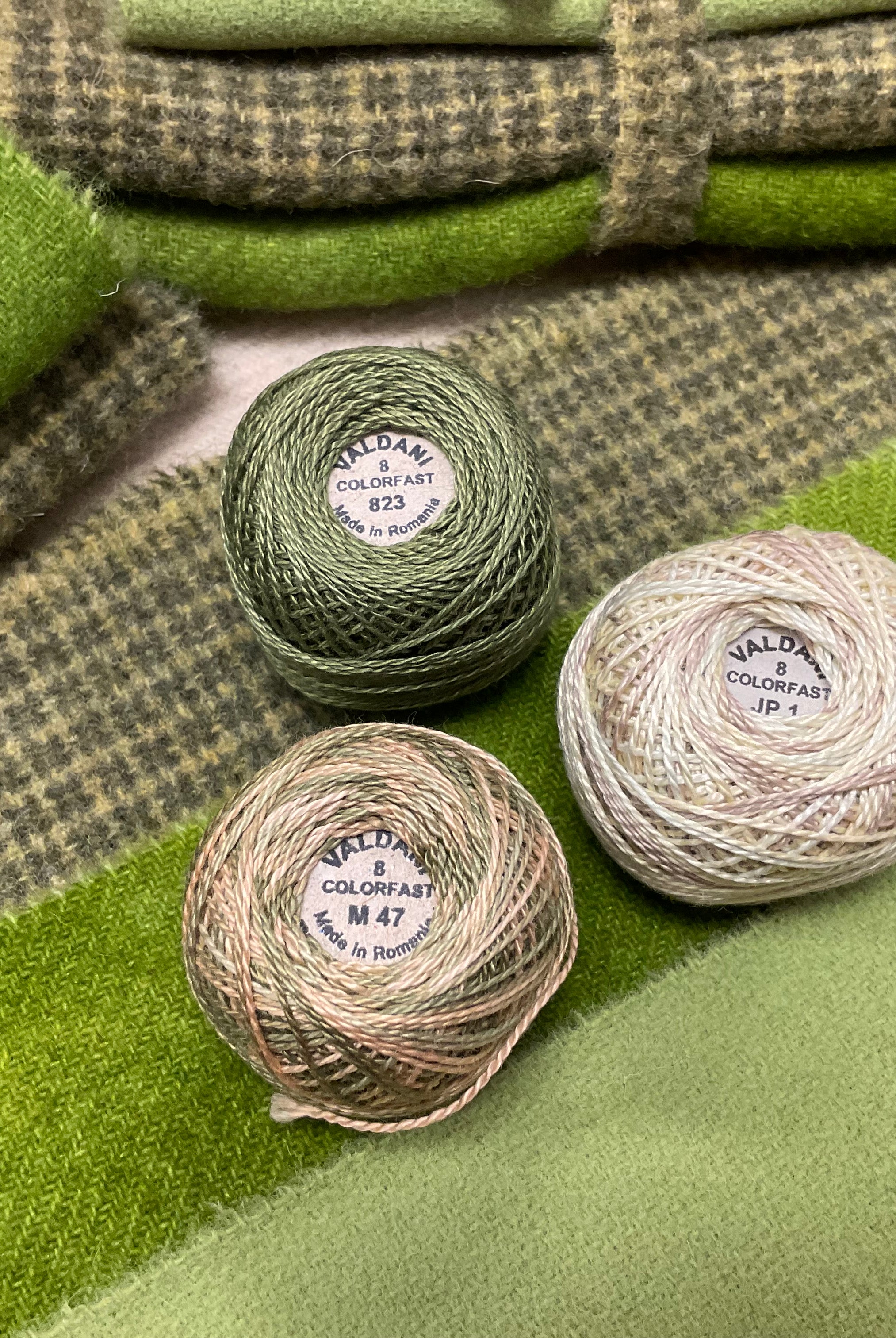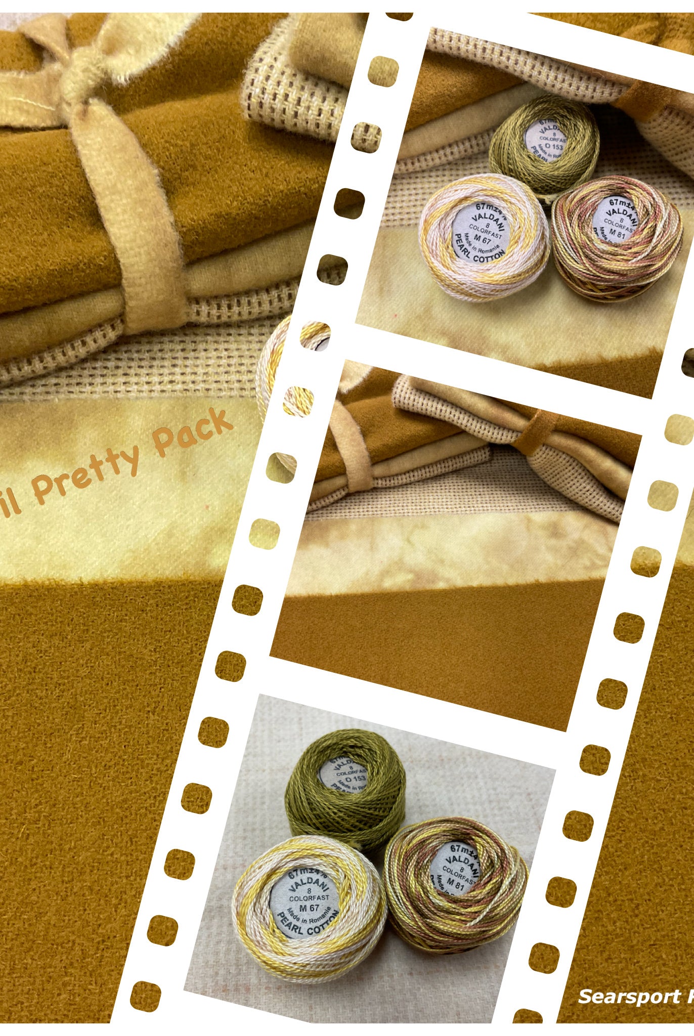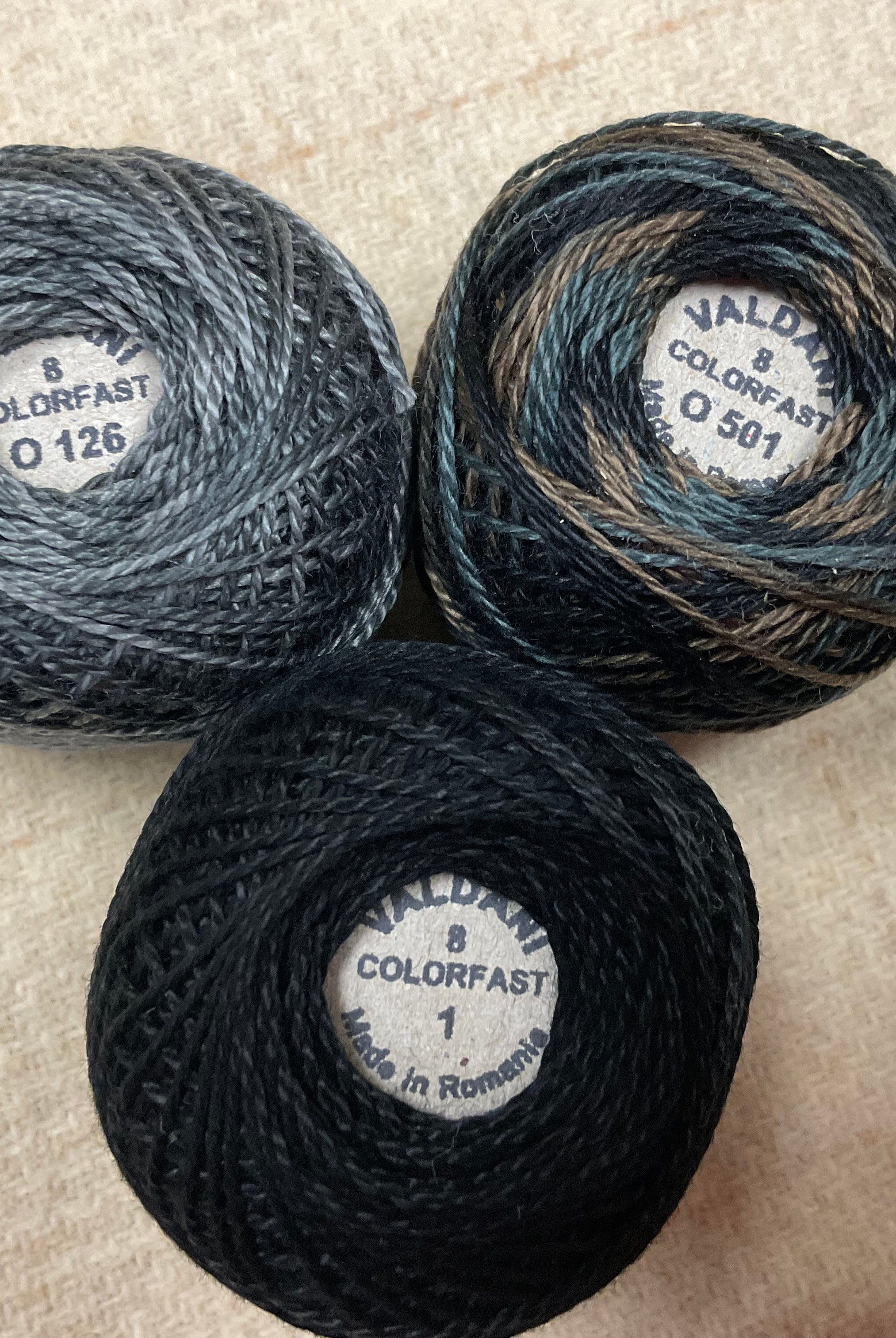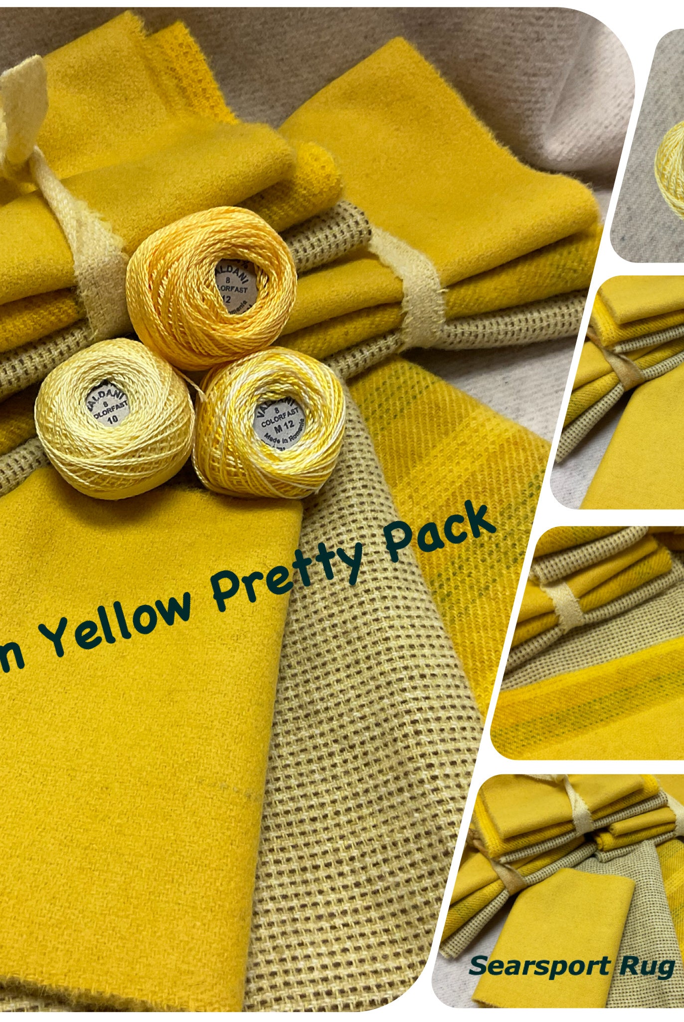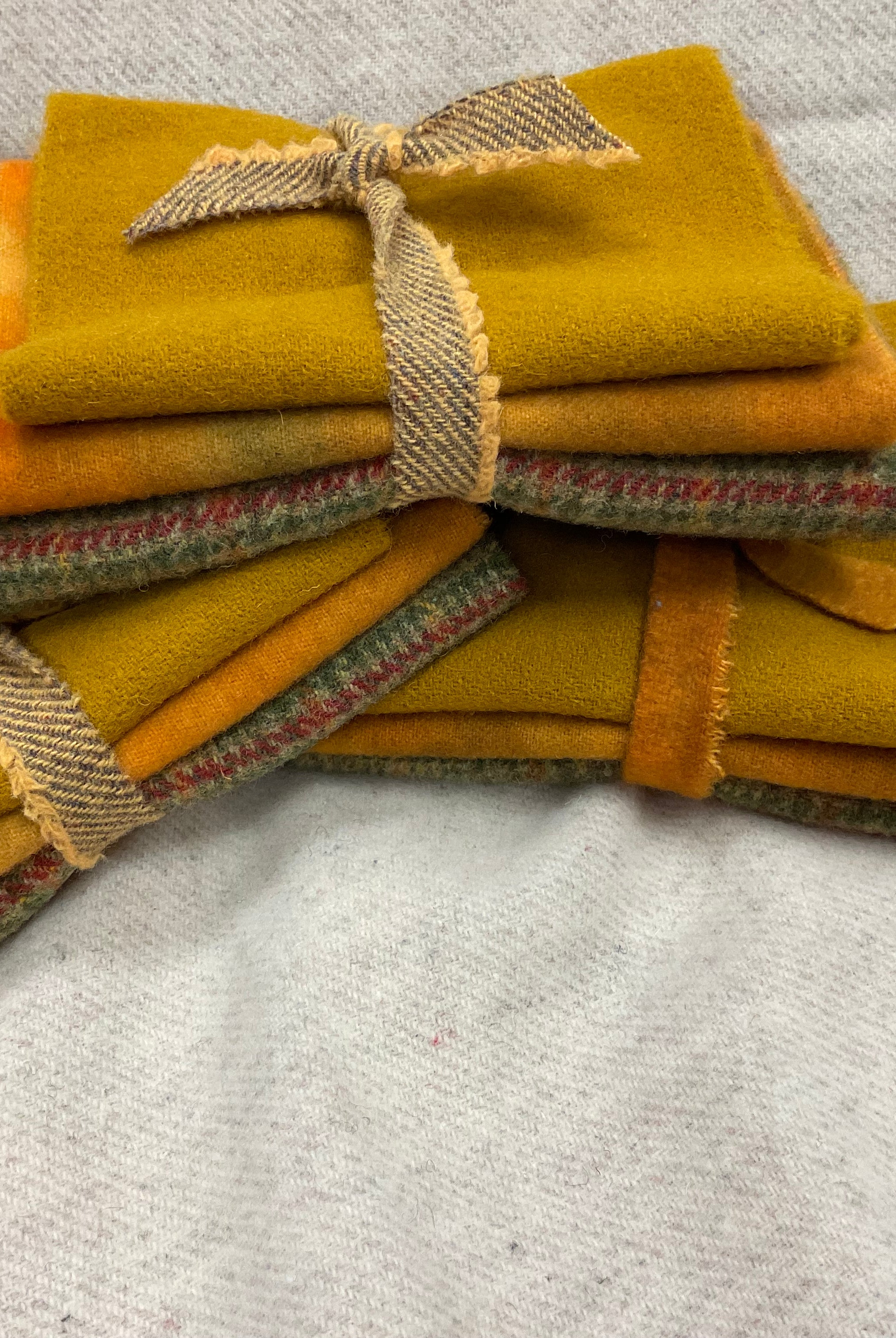 These fun bundles are all washed and ready to work with, they are a fat 1/16 of a washed as is wool 7.5x17, an over dyed wool roughly 7.5x17 and a solid 5.5x17 from the Rebekah Smith wools. We have picked 3 coordinating Vadani threads in #8 to go with your stitching if you like. Threads will be chosen to coordinate with the wools in the bundles.